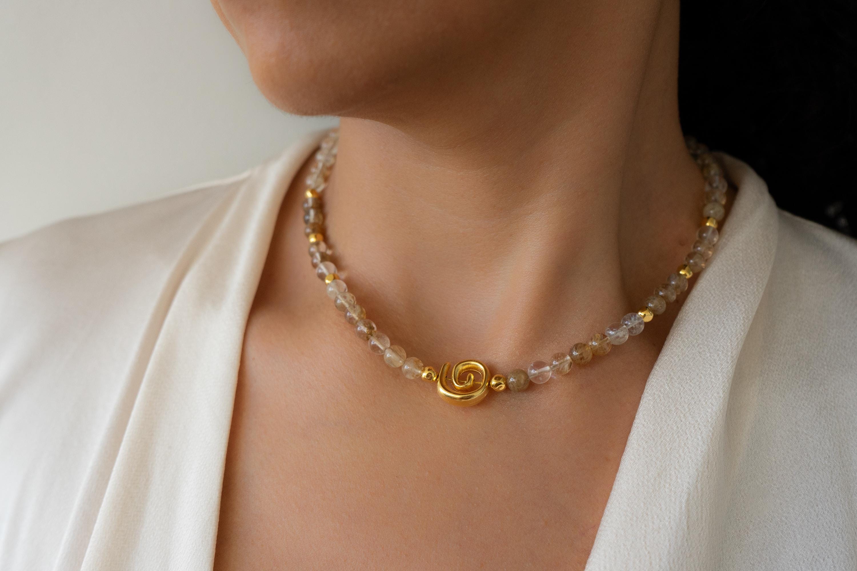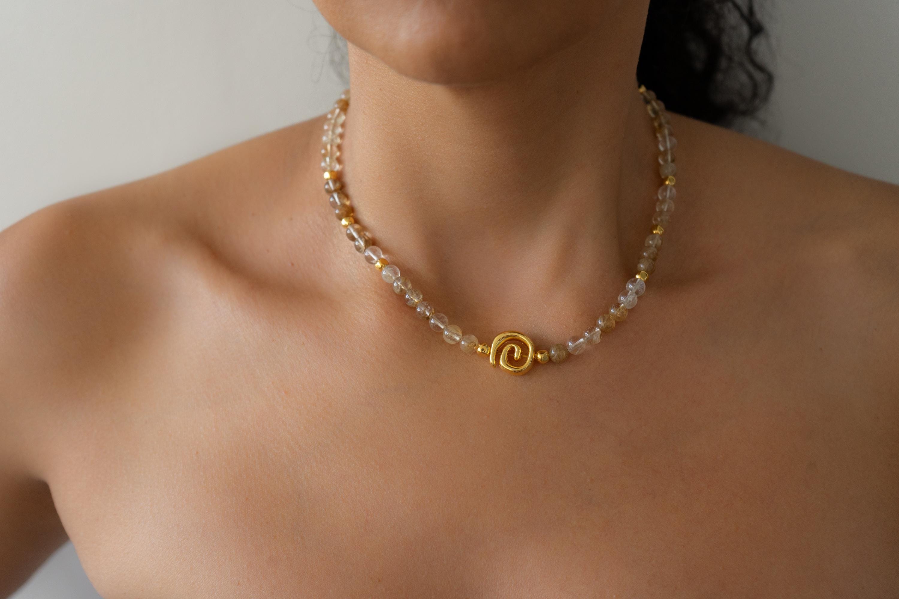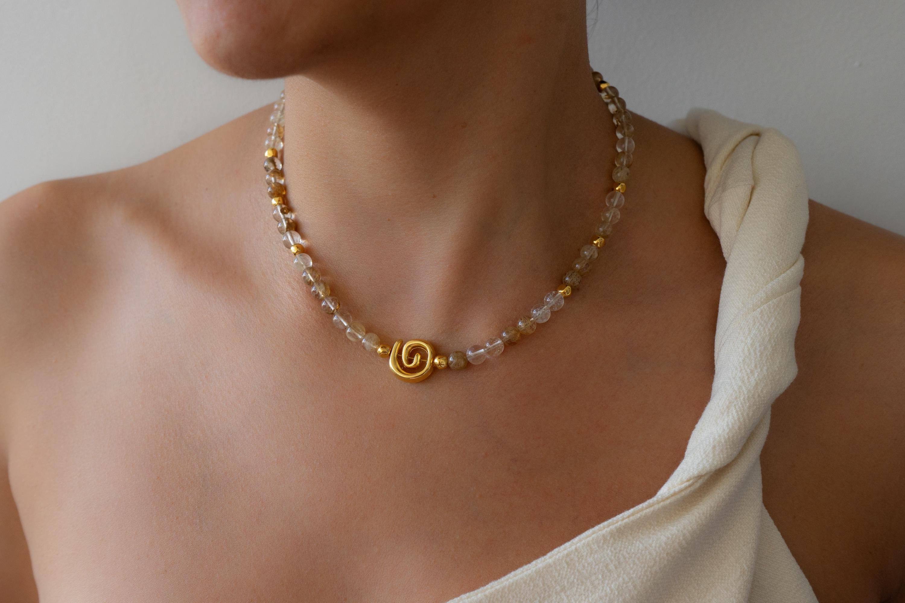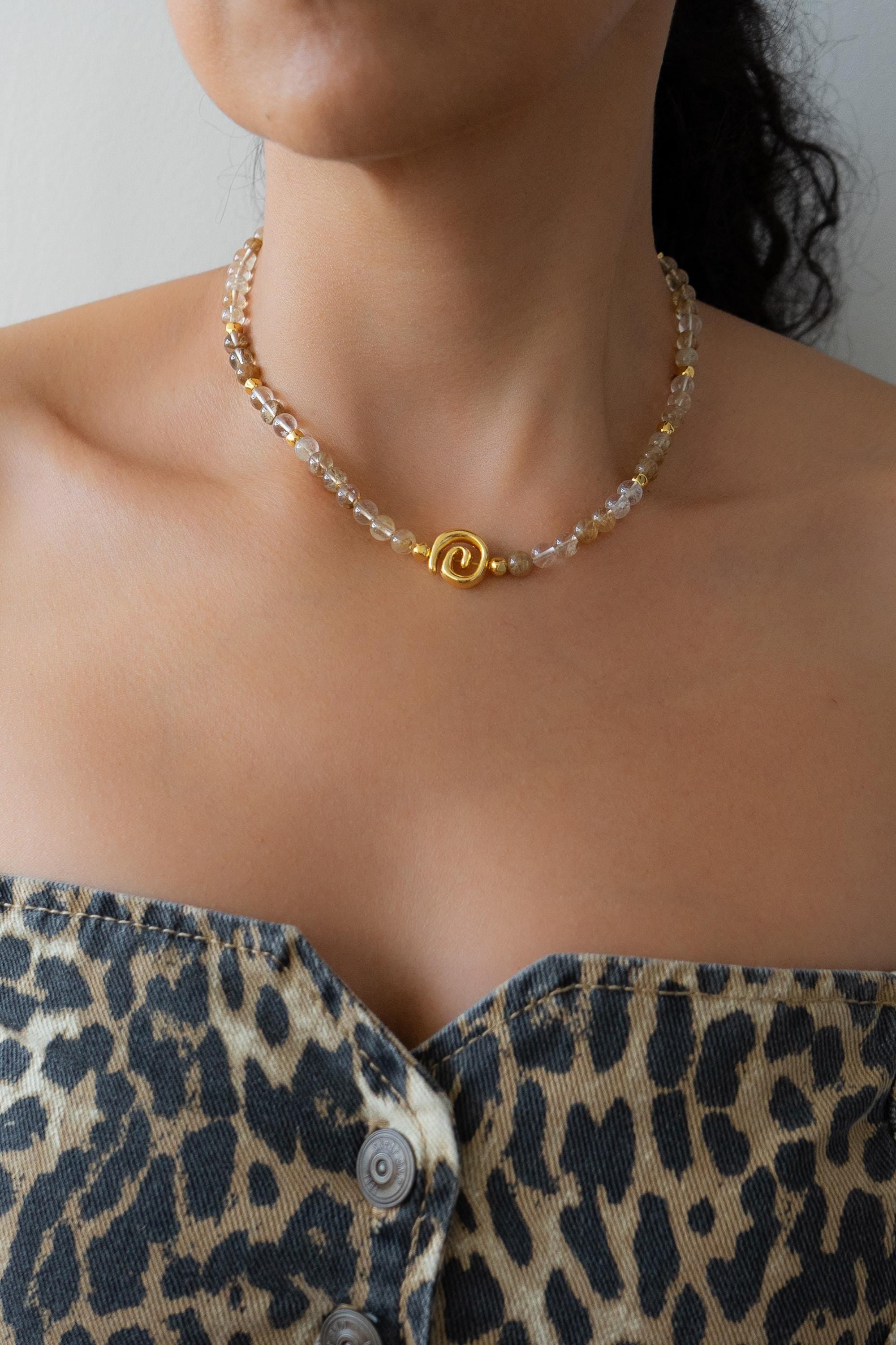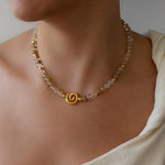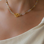 A softly structured beaded necklace designed with camel-toned watermelon glass beads and a sculptural gold plated coil slider. The rounded beads bring warmth and texture, while the spiral element adds a subtle statement without overpowering the design.