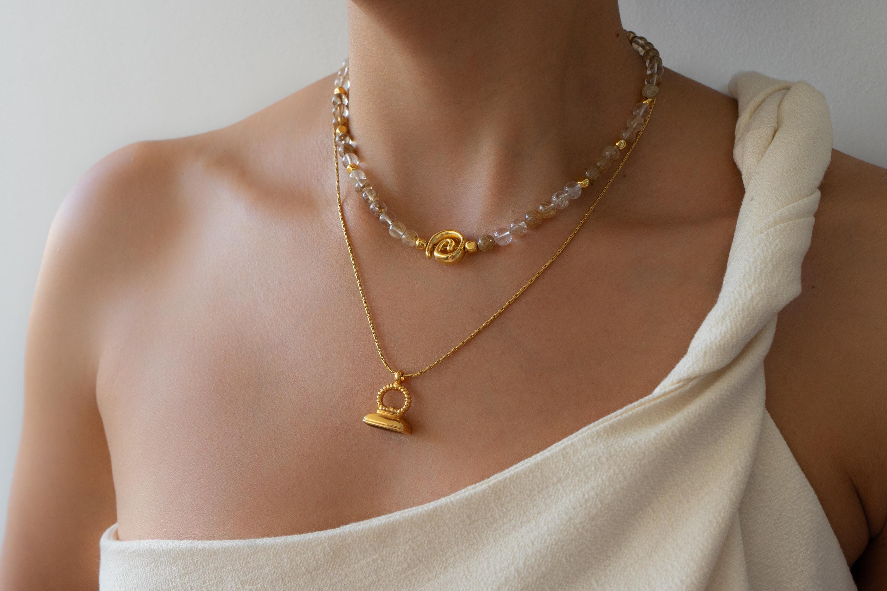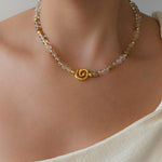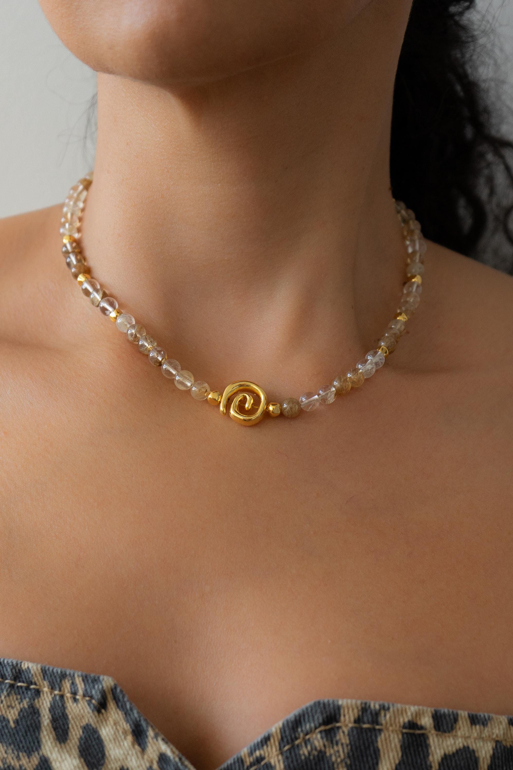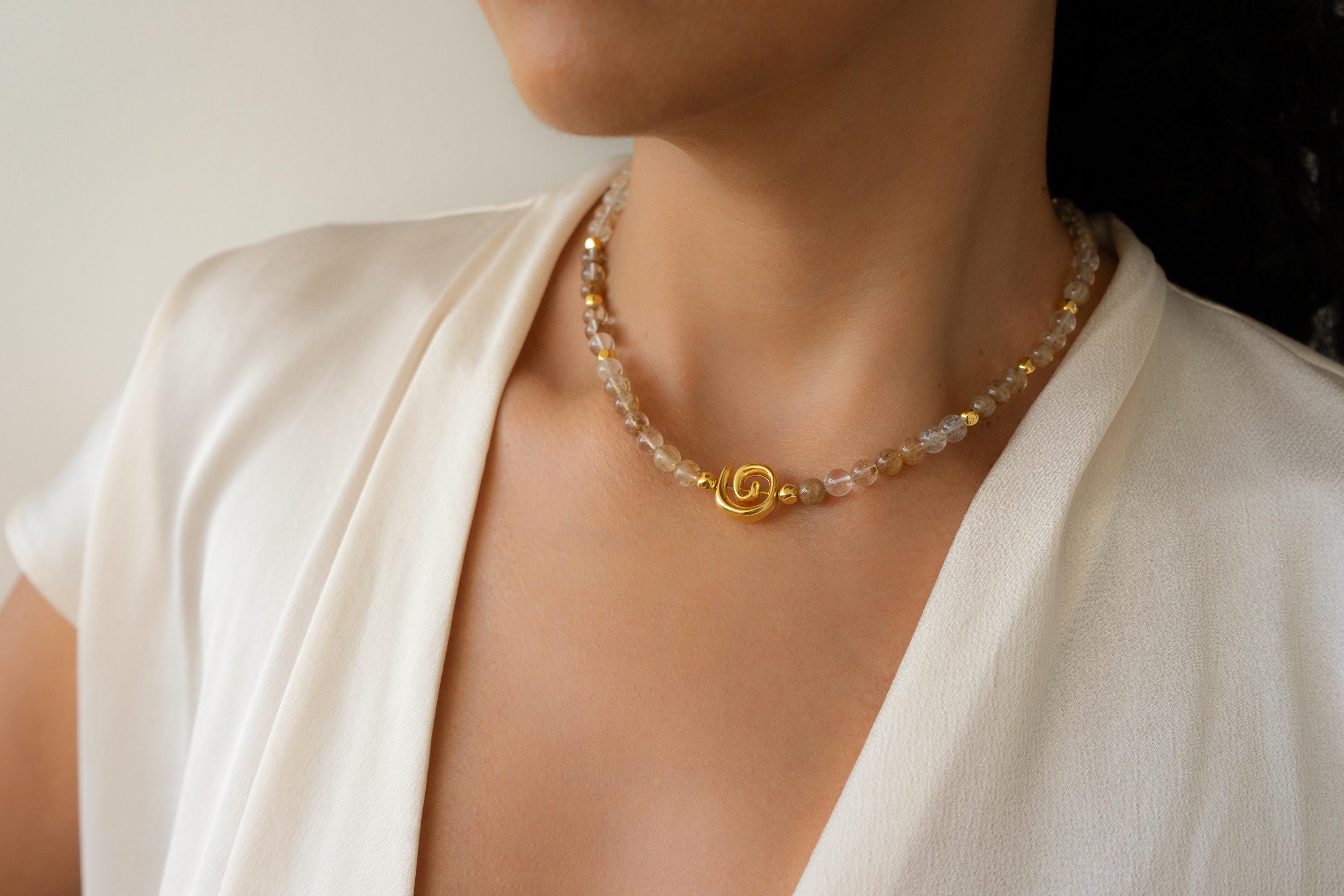 A softly structured beaded necklace designed with camel-toned watermelon glass beads and a sculptural gold plated coil slider. The rounded beads bring warmth and texture, while the spiral element adds a subtle statement without overpowering the design.