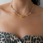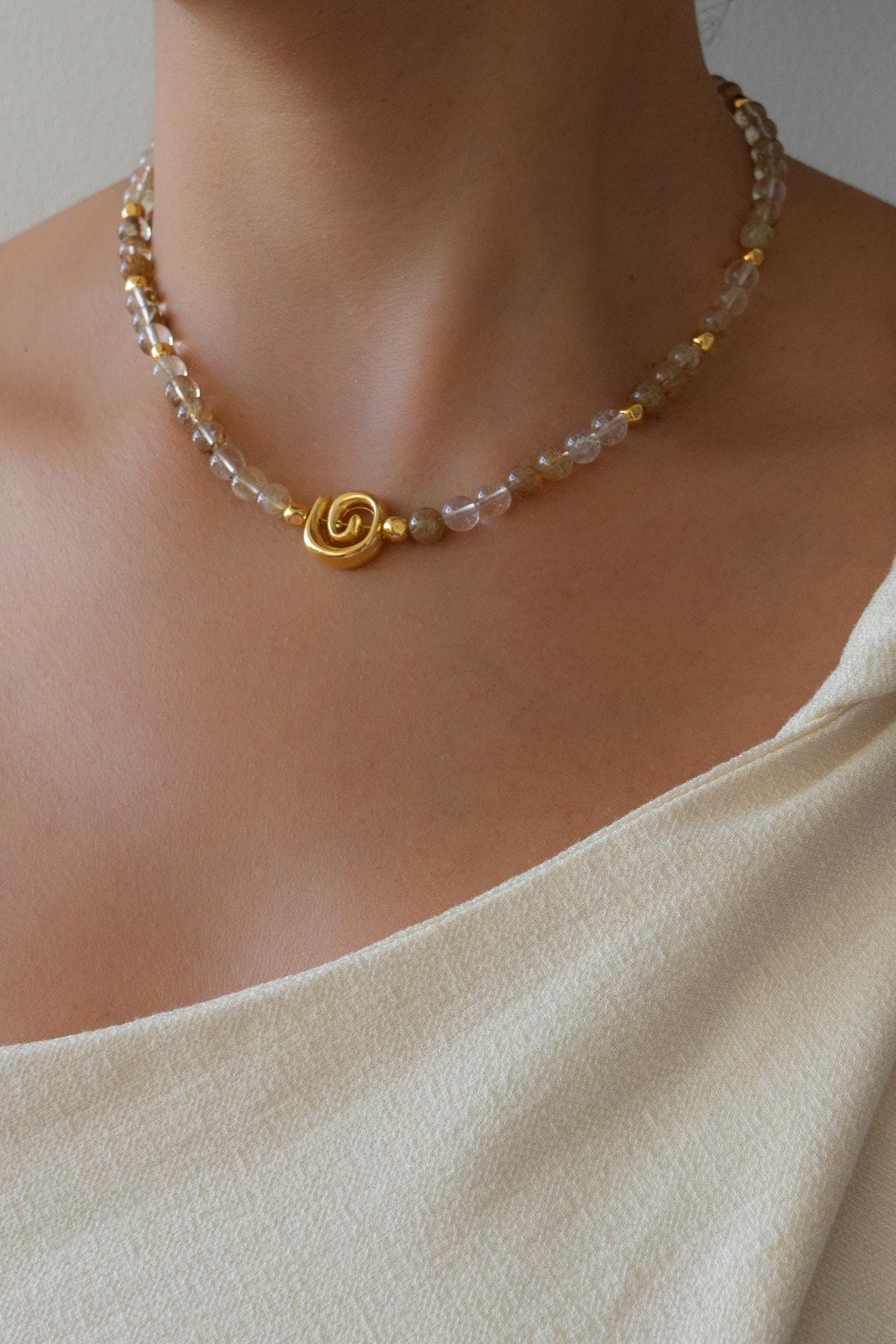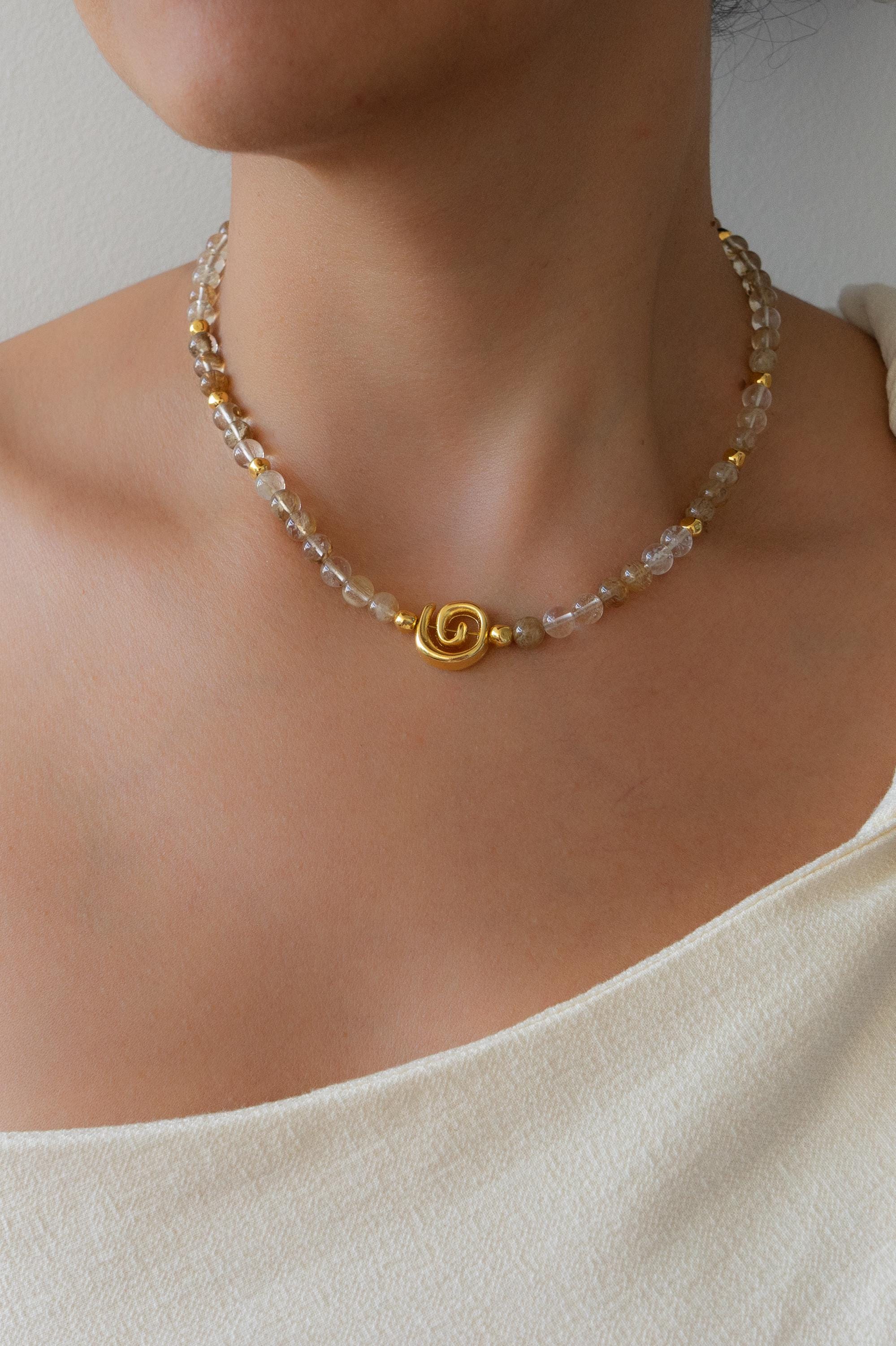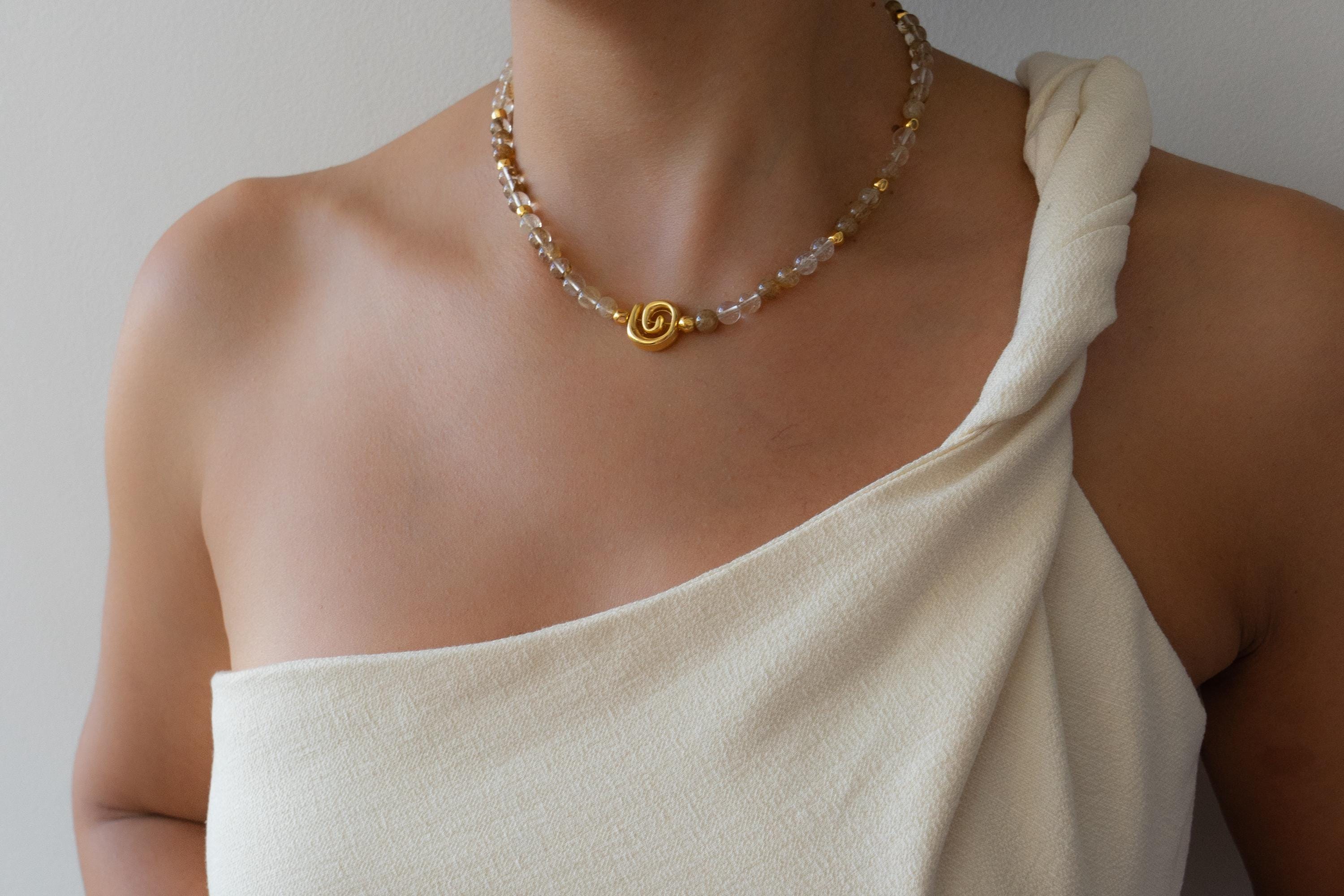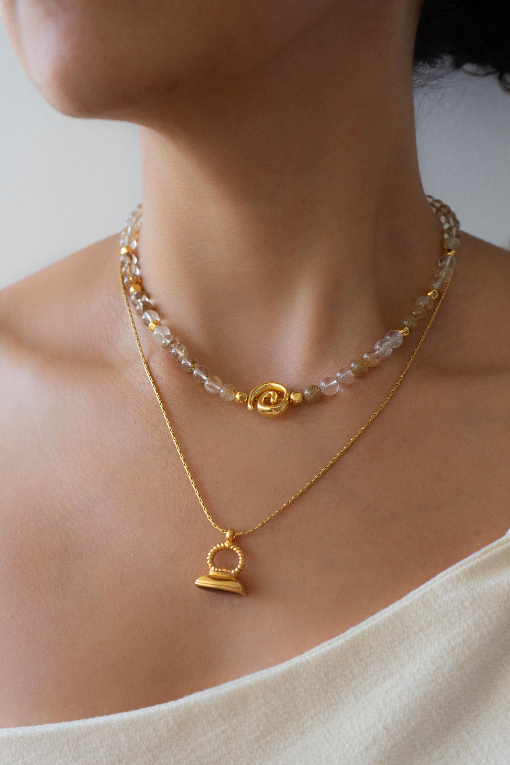 A softly structured beaded necklace designed with camel-toned watermelon glass beads and a sculptural gold plated coil slider. The rounded beads bring warmth and texture, while the spiral element adds a subtle statement without overpowering the design.