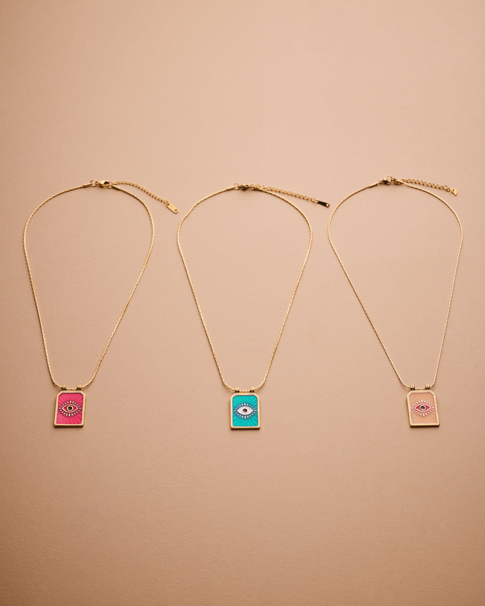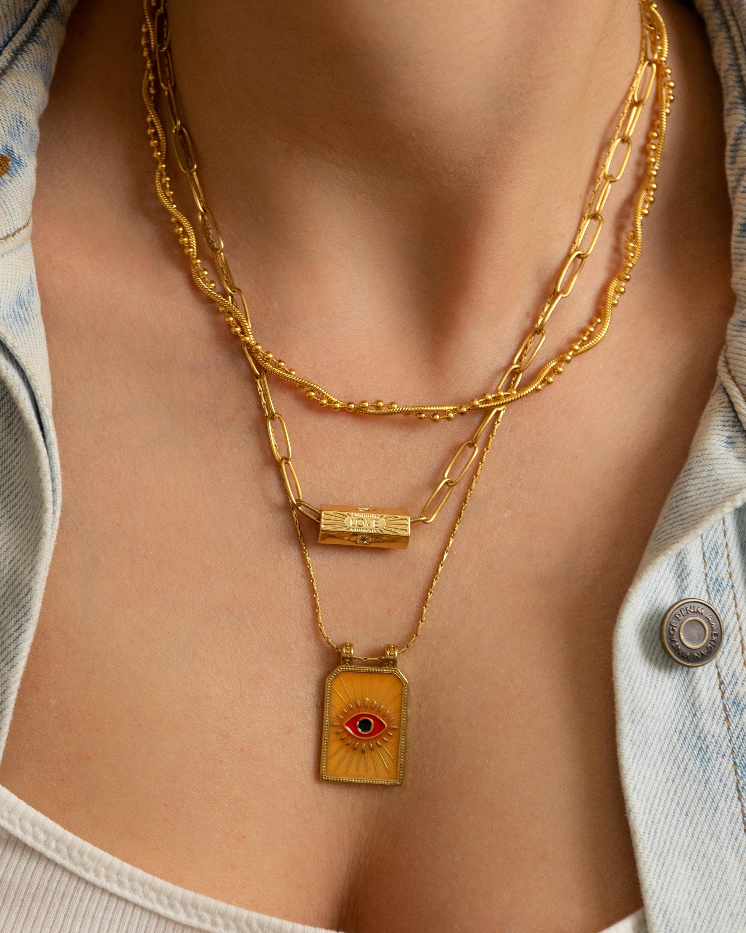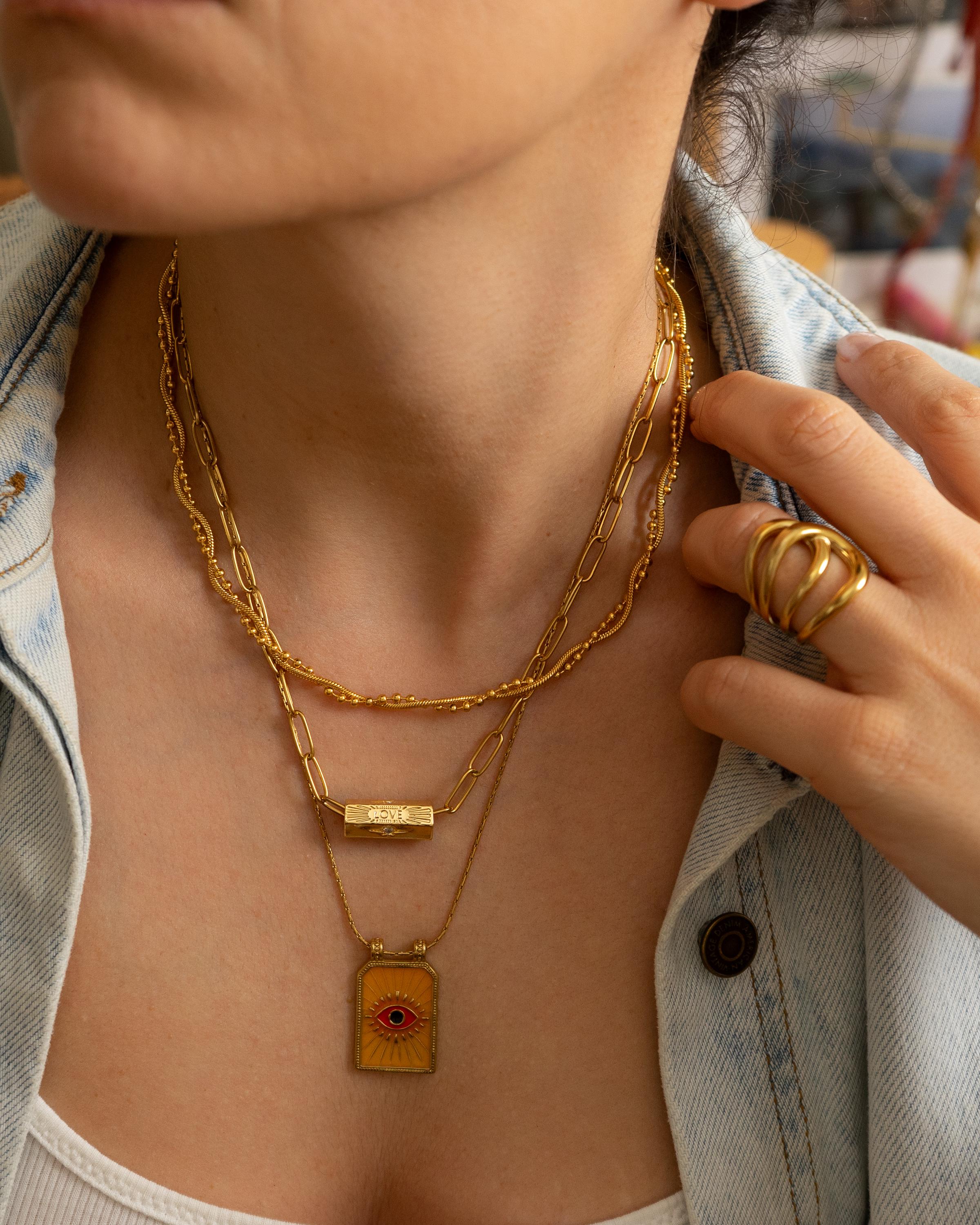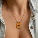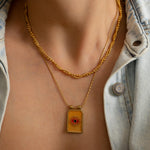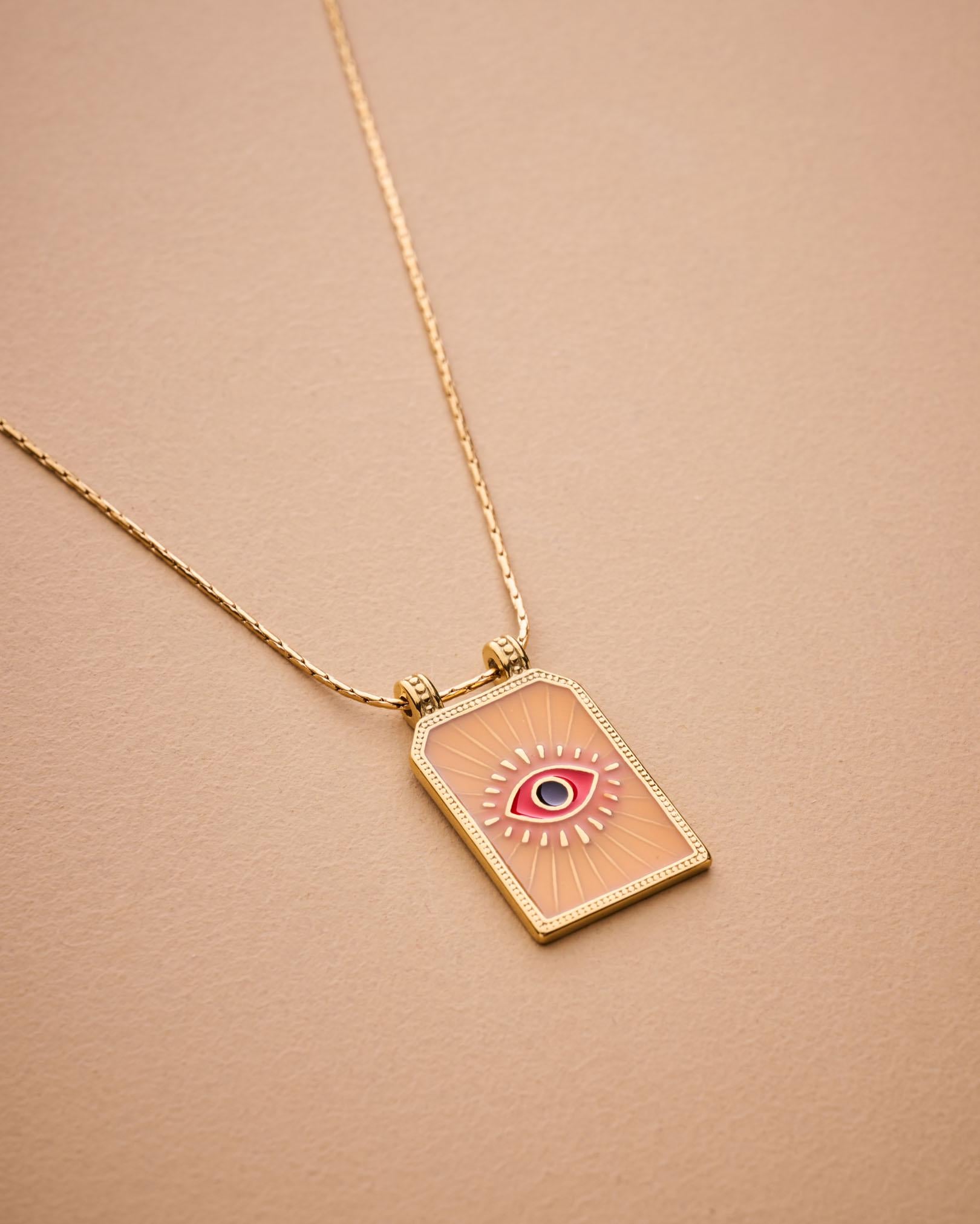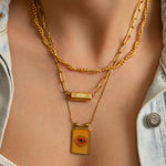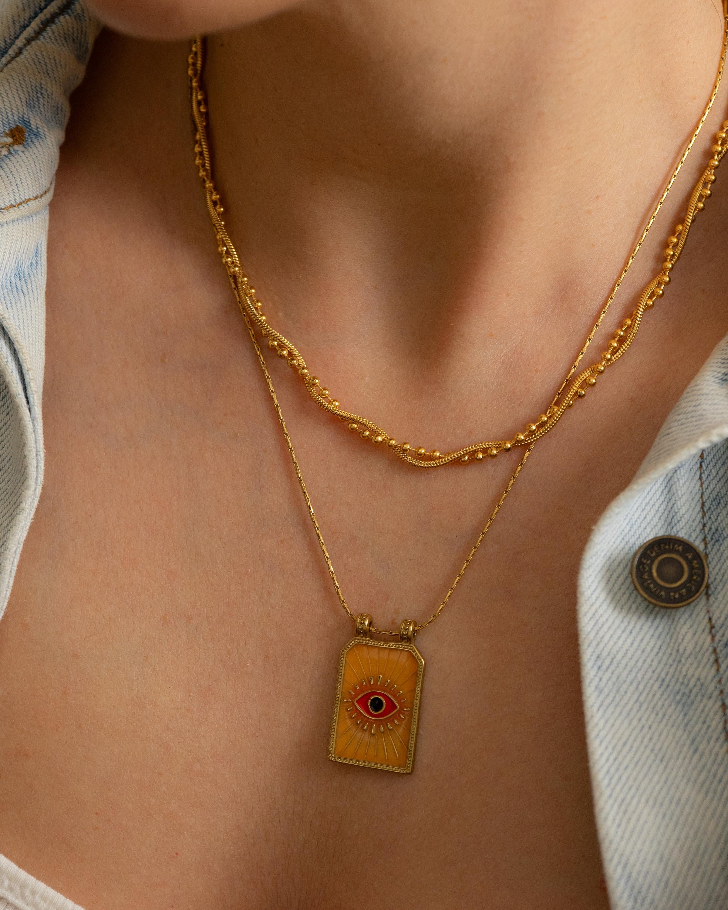 Crafted with care from stainless steel, this necklace is waterproof, tarnish-resistant, and extremely durable, making it ideal for everyday wear. The gold-plated pendant hangs from a twisted rope chain, perfect for layering or wearing solo. Whether you're dressing up a simple tee or adding a mystical touch to your look, this necklace brings light, color, and symbolism to your collection.