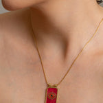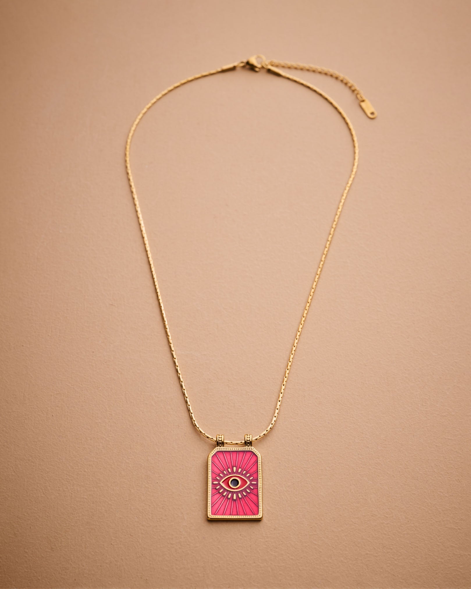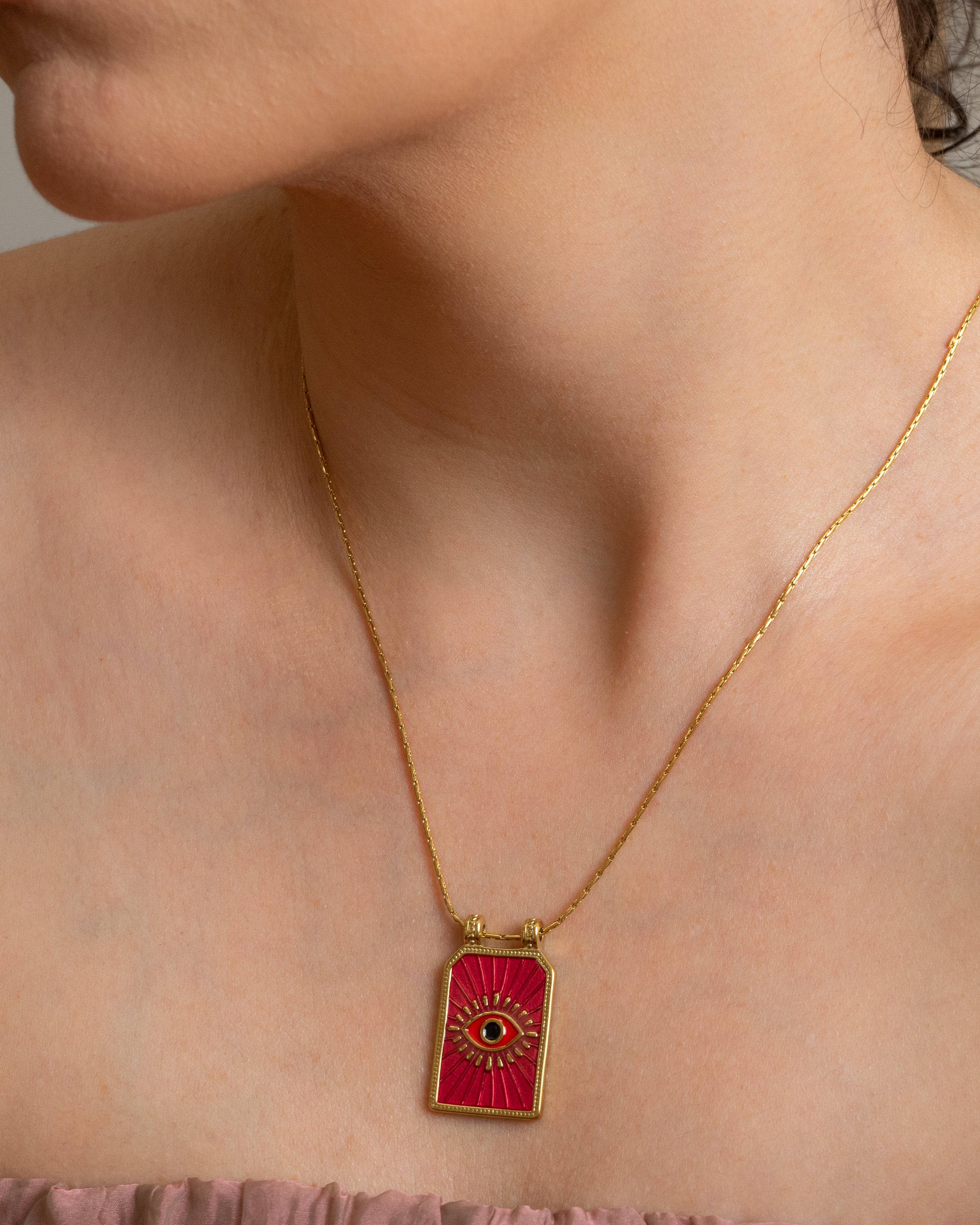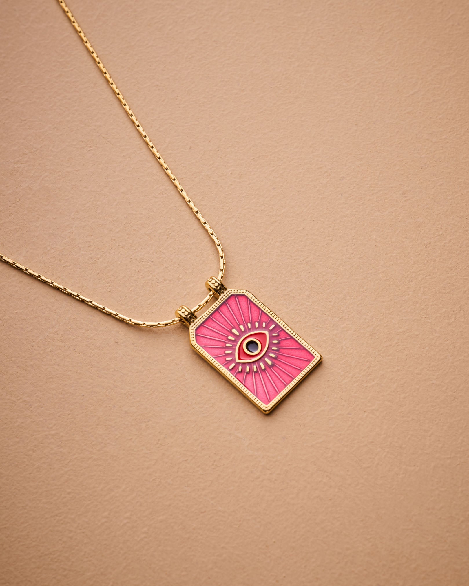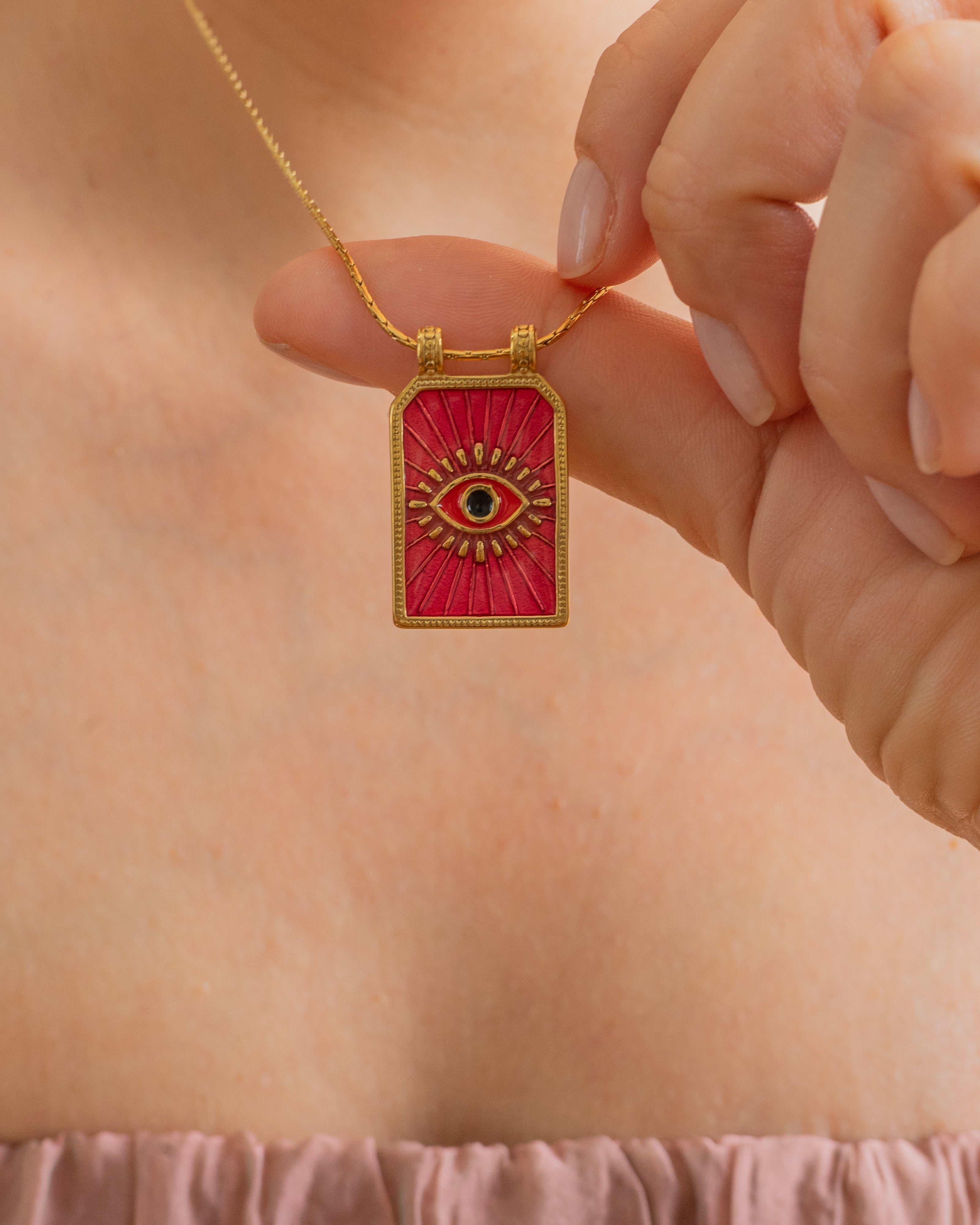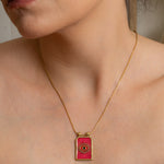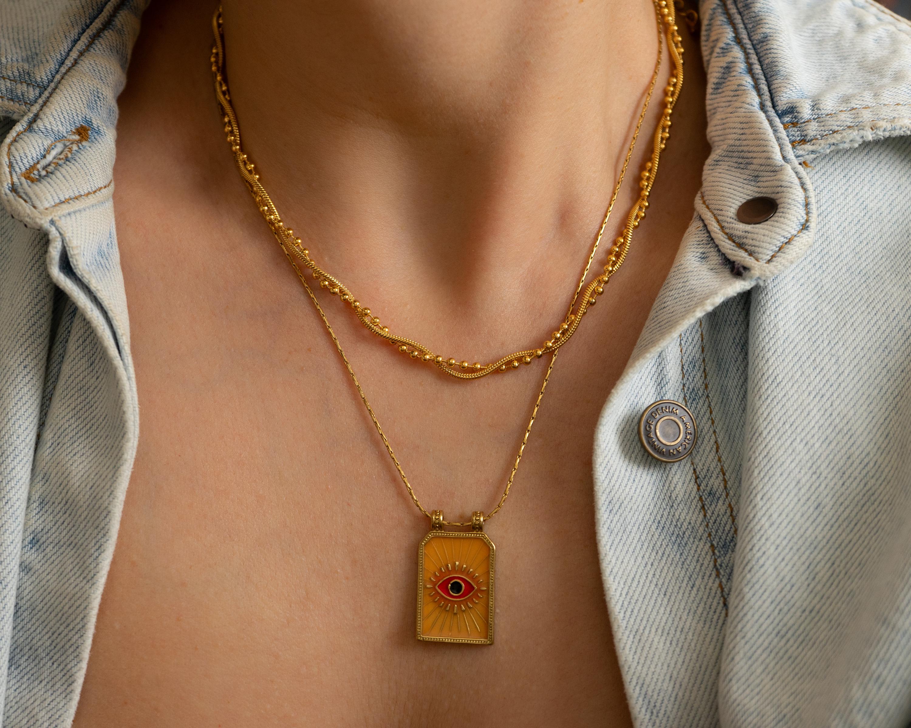 Make a bold and meaningful statement with our handcrafted Gold Evil Eye Necklace, designed to offer both protection and elevated style. This striking pendant features a radiant sunburst pattern surrounding a vivid red enamel evil eye—an ancient symbol believed to ward off negativity and attract positive energy.