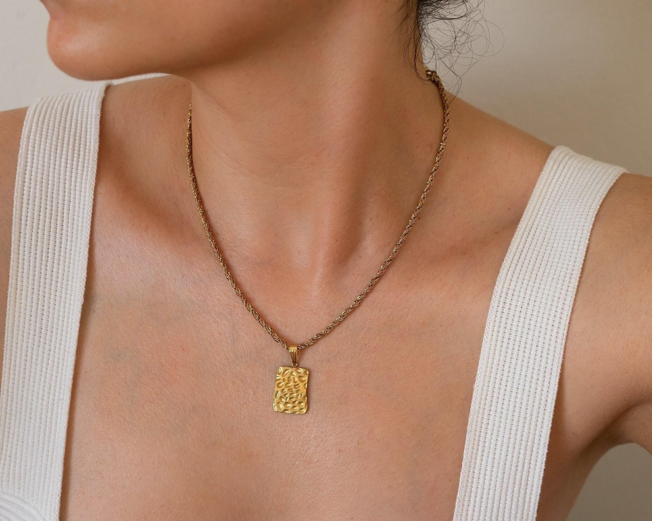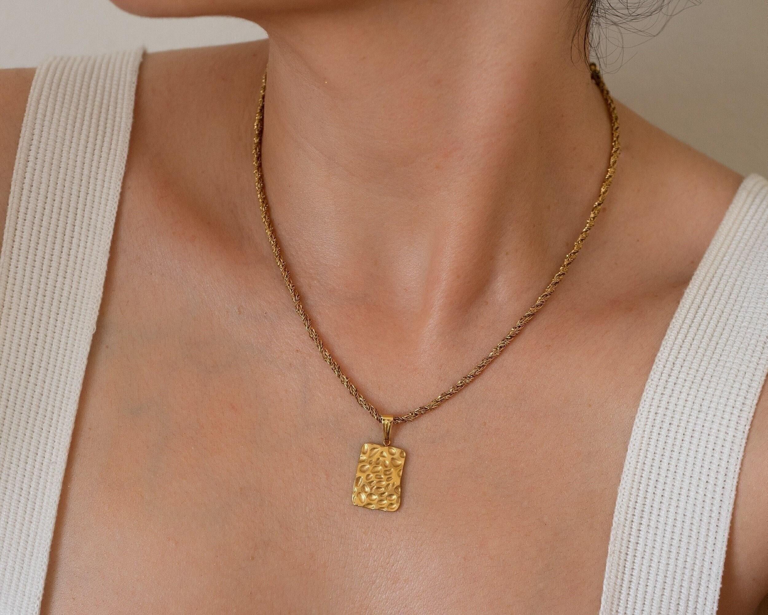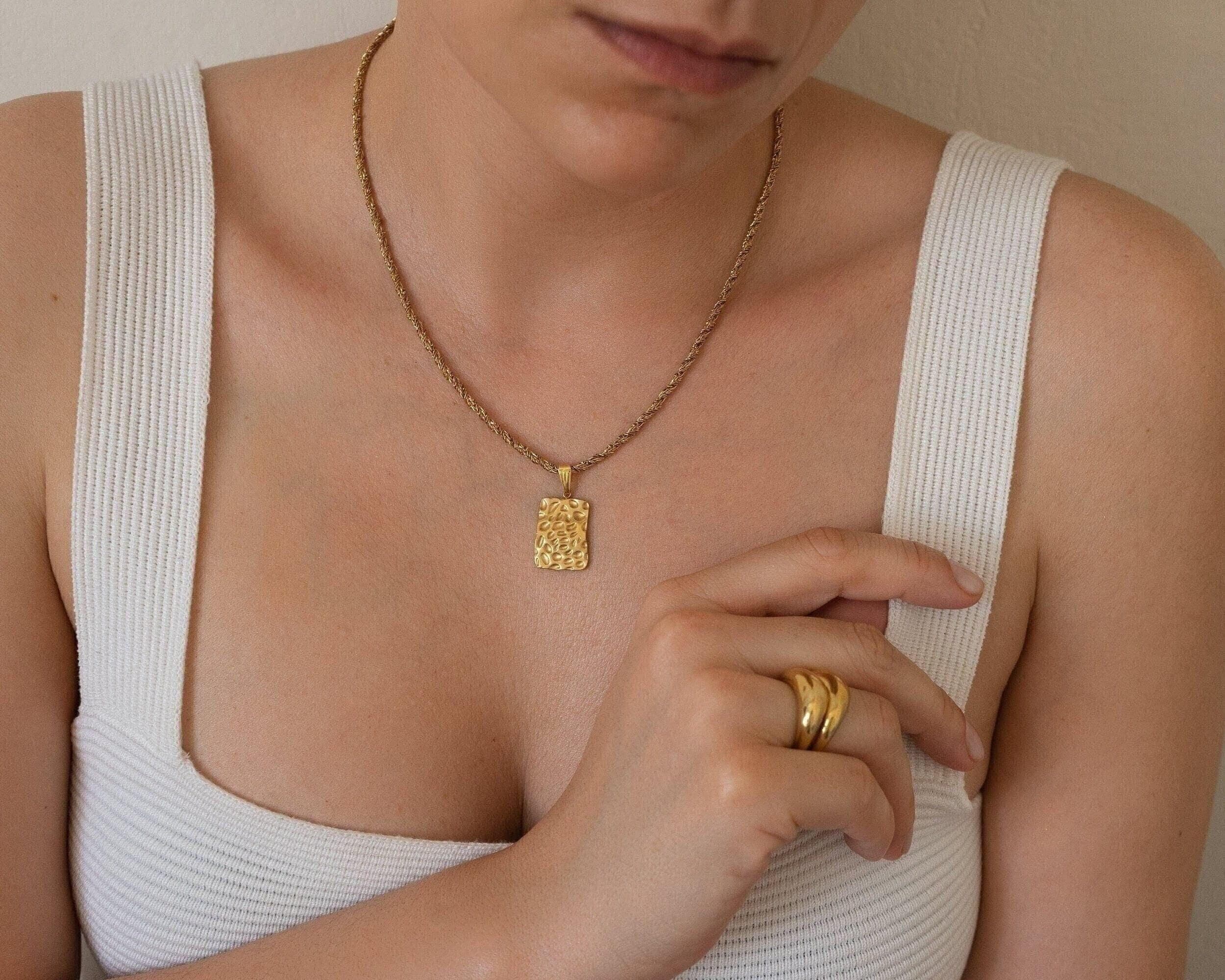 Gold Rectangle Hammered Pendant Necklace