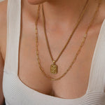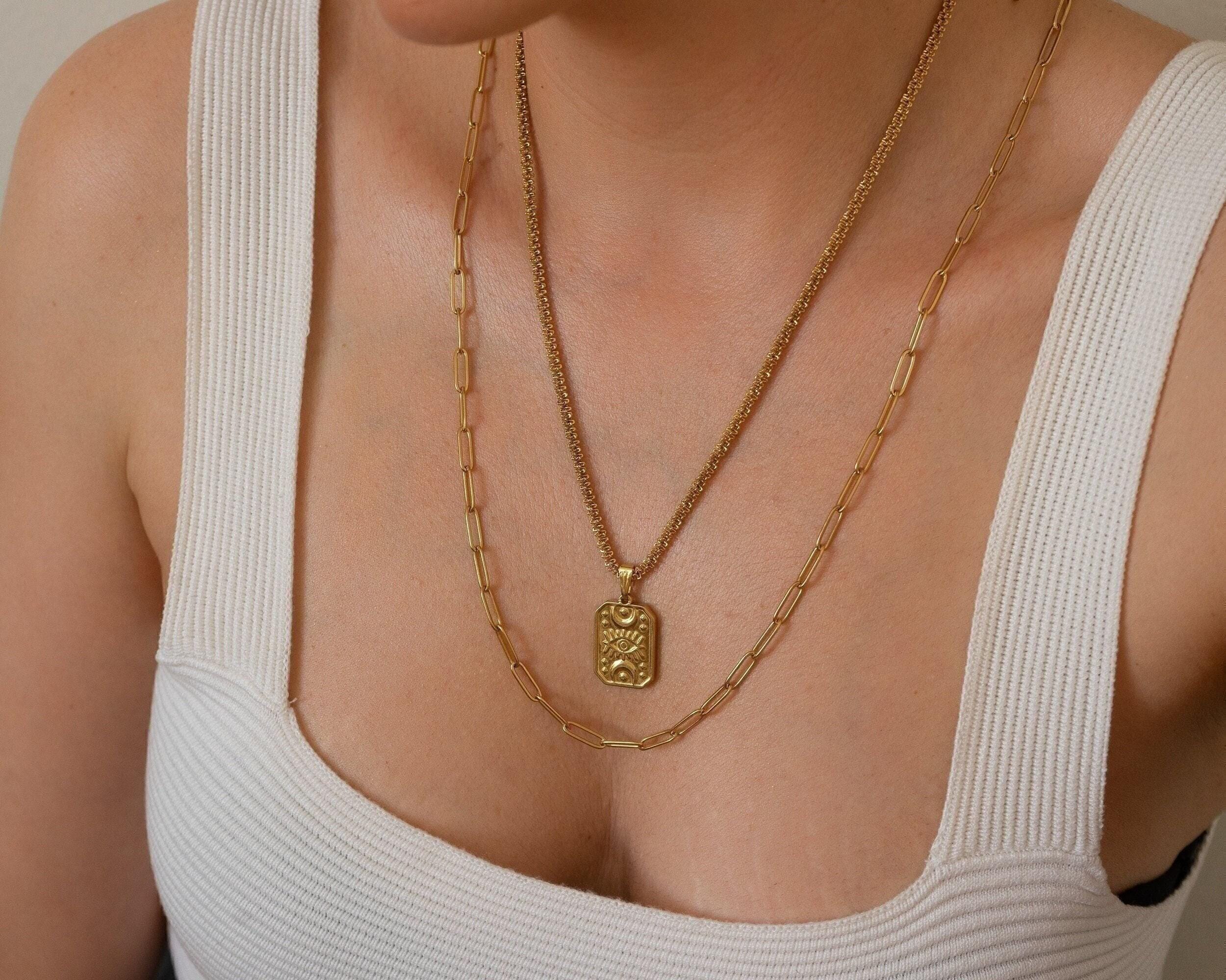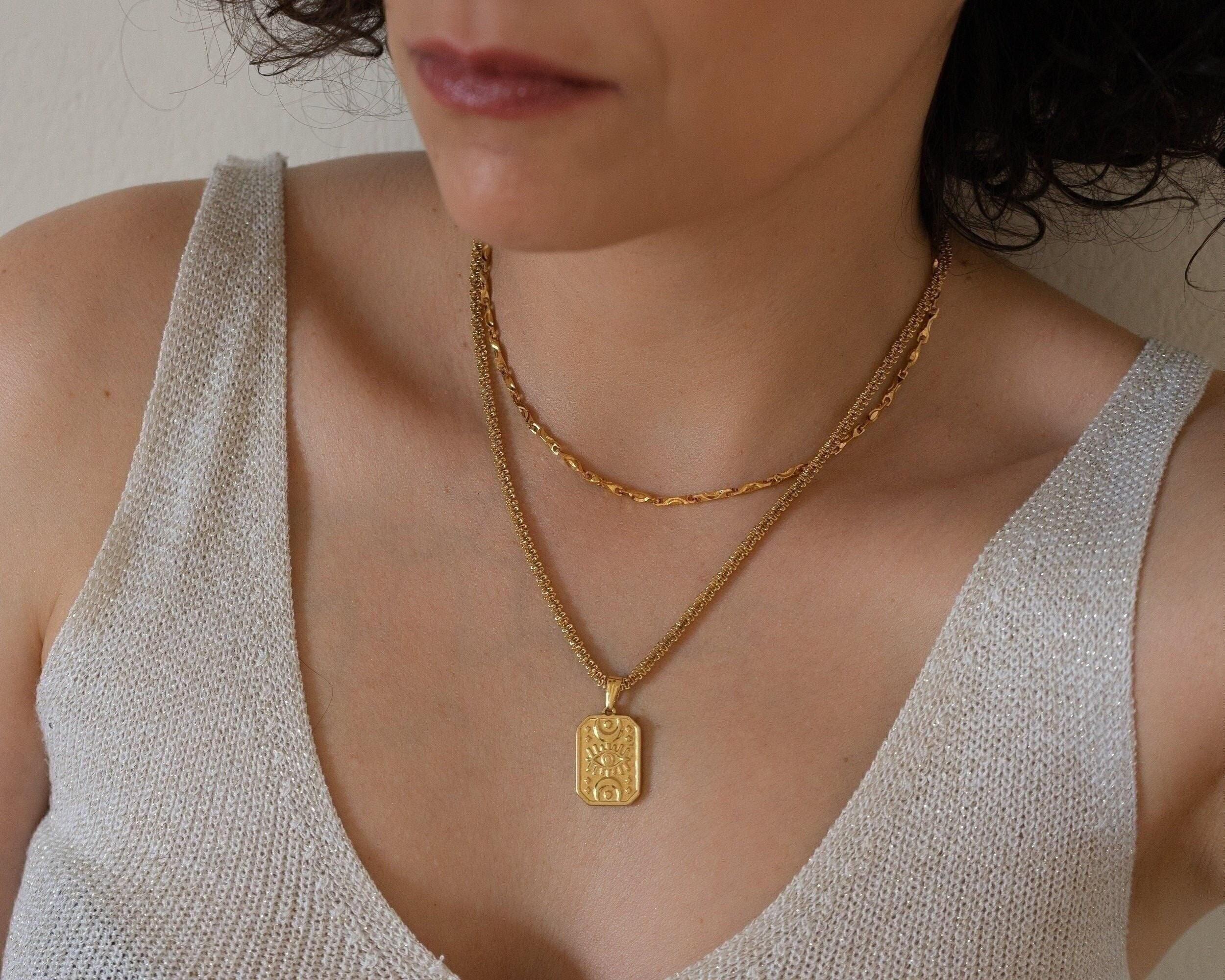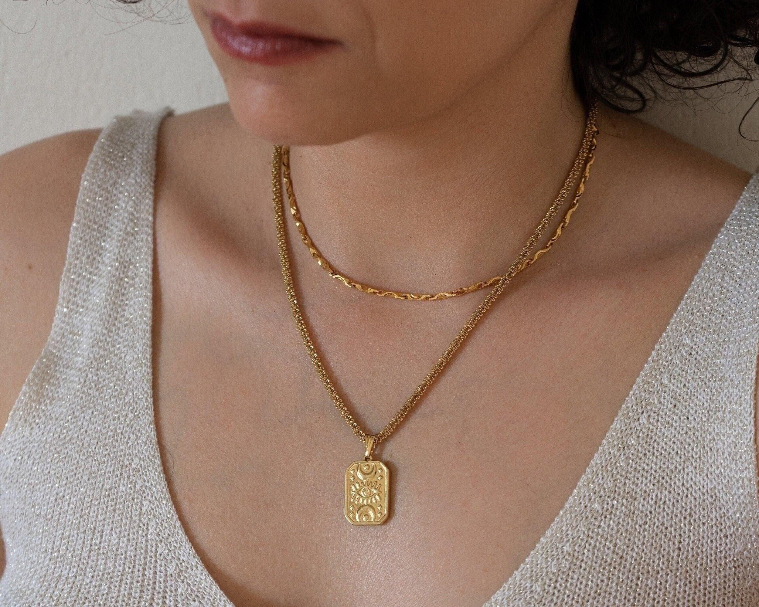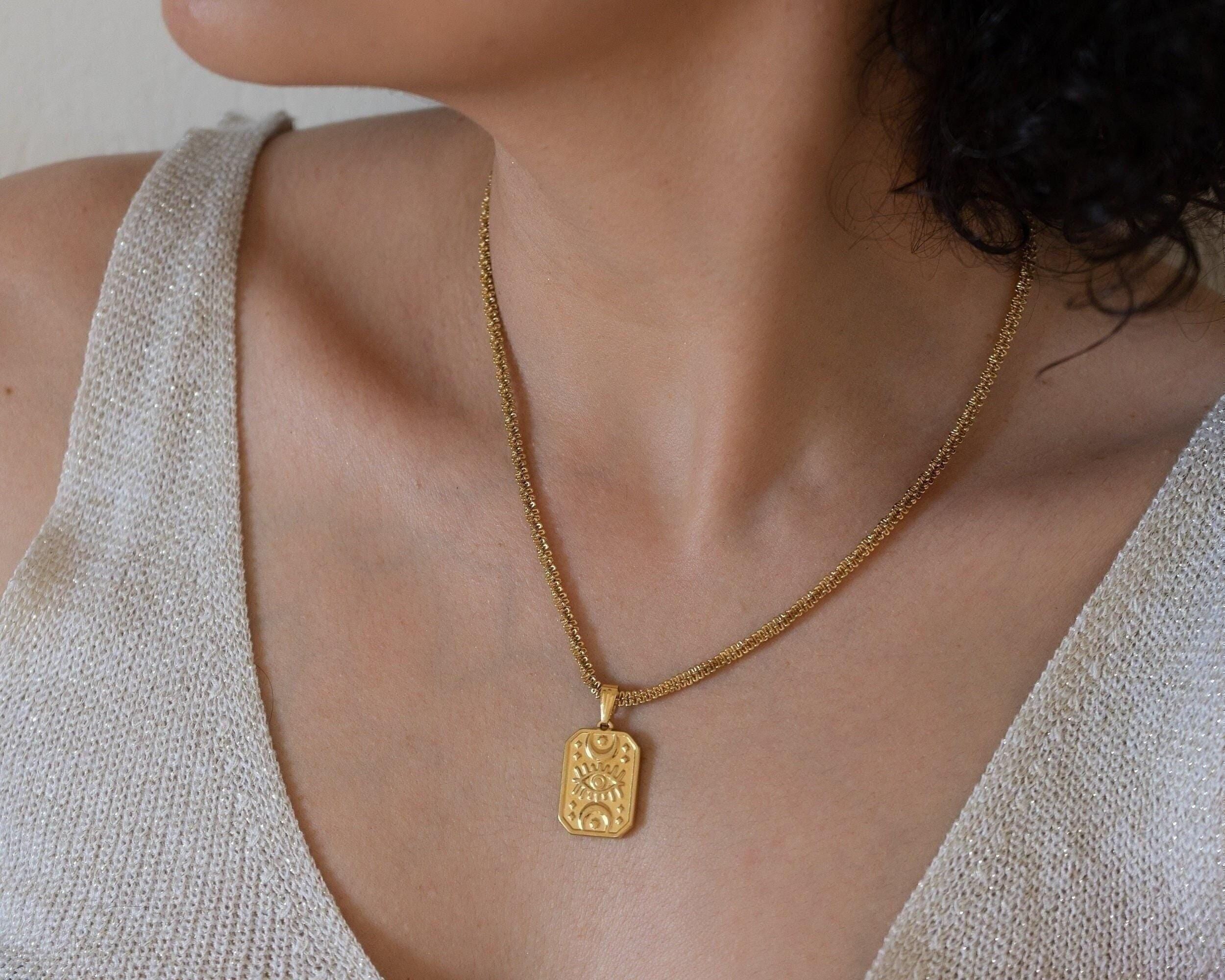 Discover a captivating gold pendant featuring a beautifully engraved Evil Eye and Moon, suspended from a durable stainless steel popcorn chain. This versatile piece can be worn on its own for a subtle touch or layered with other necklaces for a bold statement.</p><br><p>Crafted from high-quality materials, this pendant remains stunning over time, resisting tarnish and water damage. Embrace the latest fashion trend of multi-layered necklaces, which showcase chains and links of varying sizes for an effortlessly chic look. The combination of thick and thin chains, along with beads, offers a refined and modern aesthetic that enhances any outfit, making it a valuable addition to your jewelry collection.