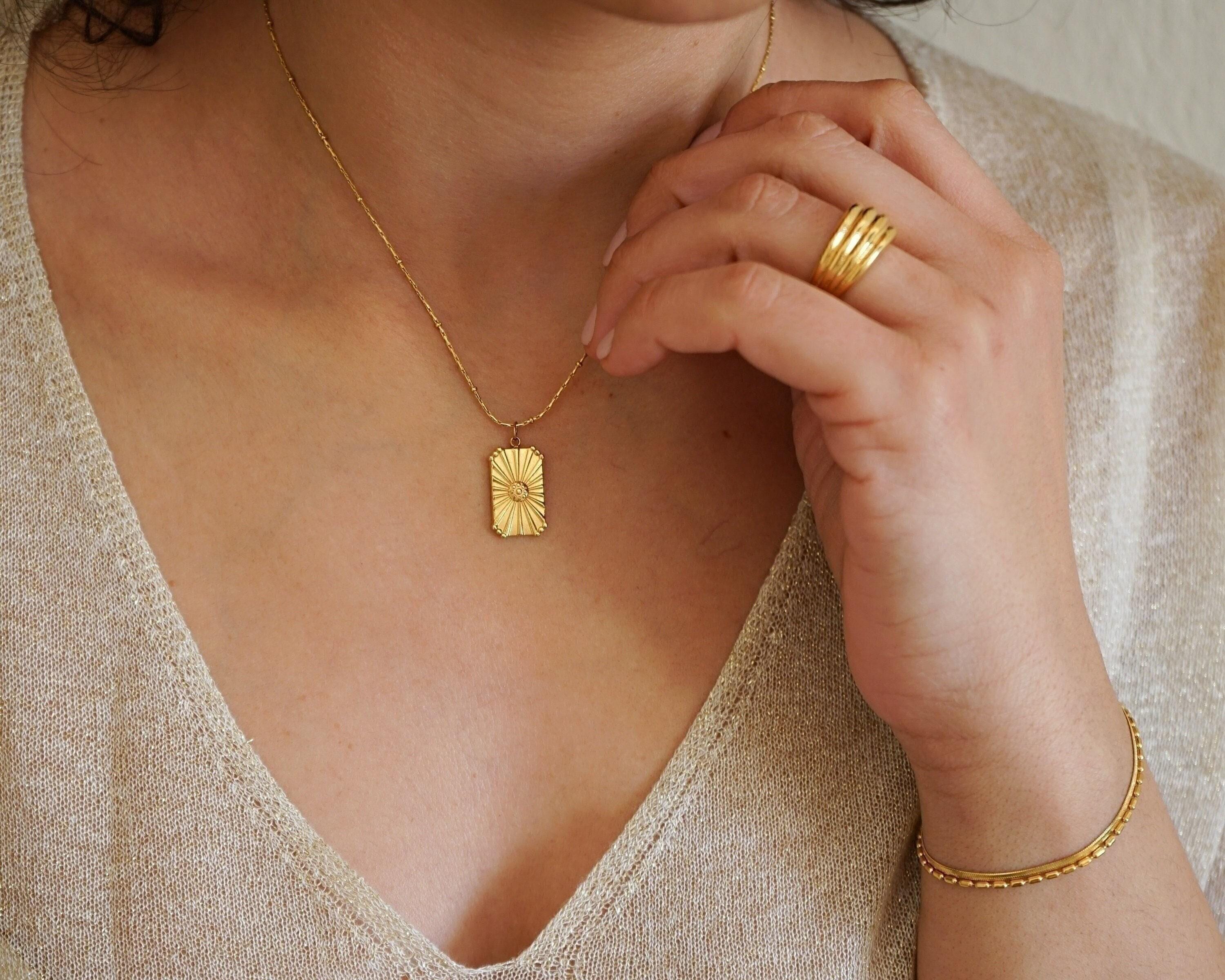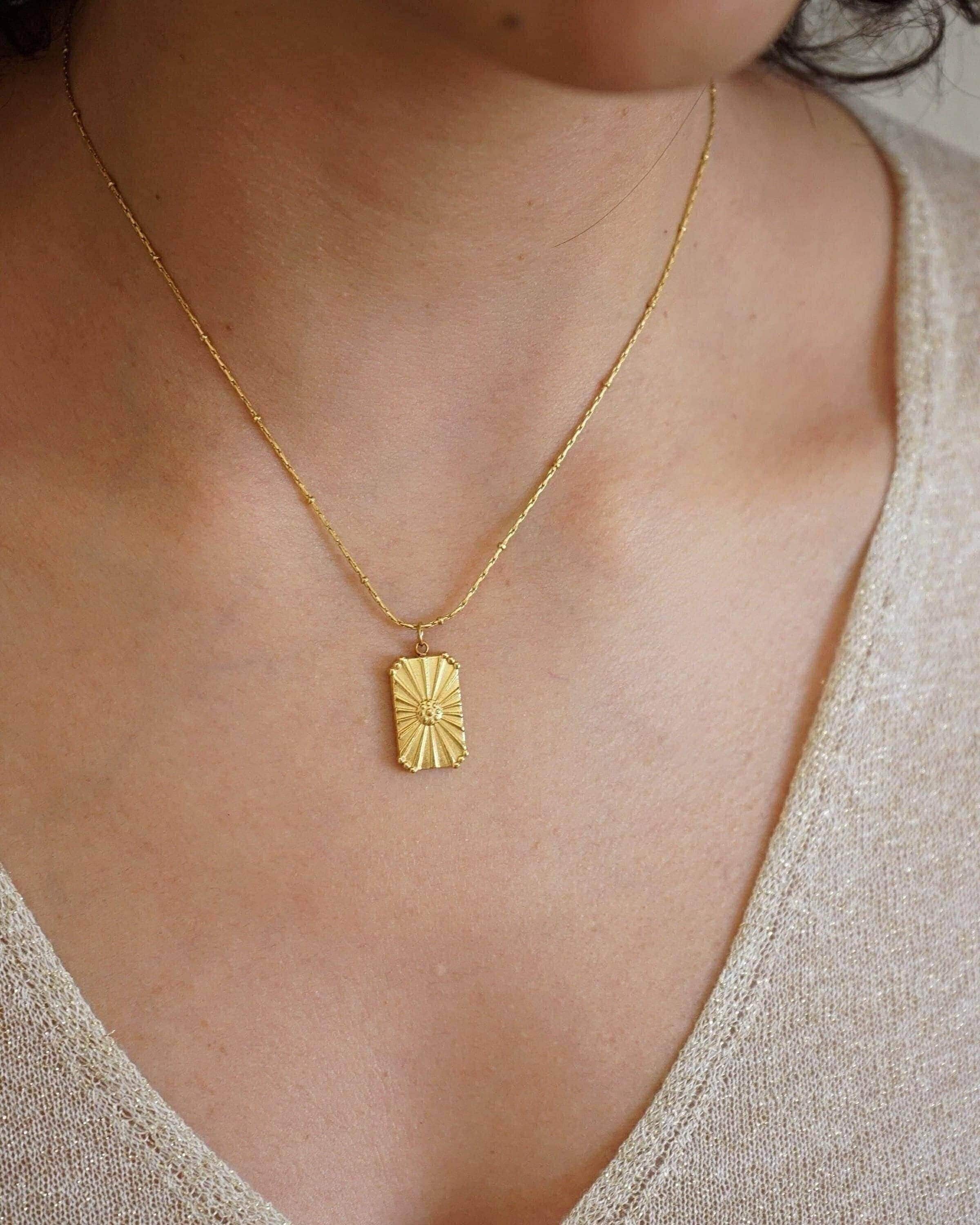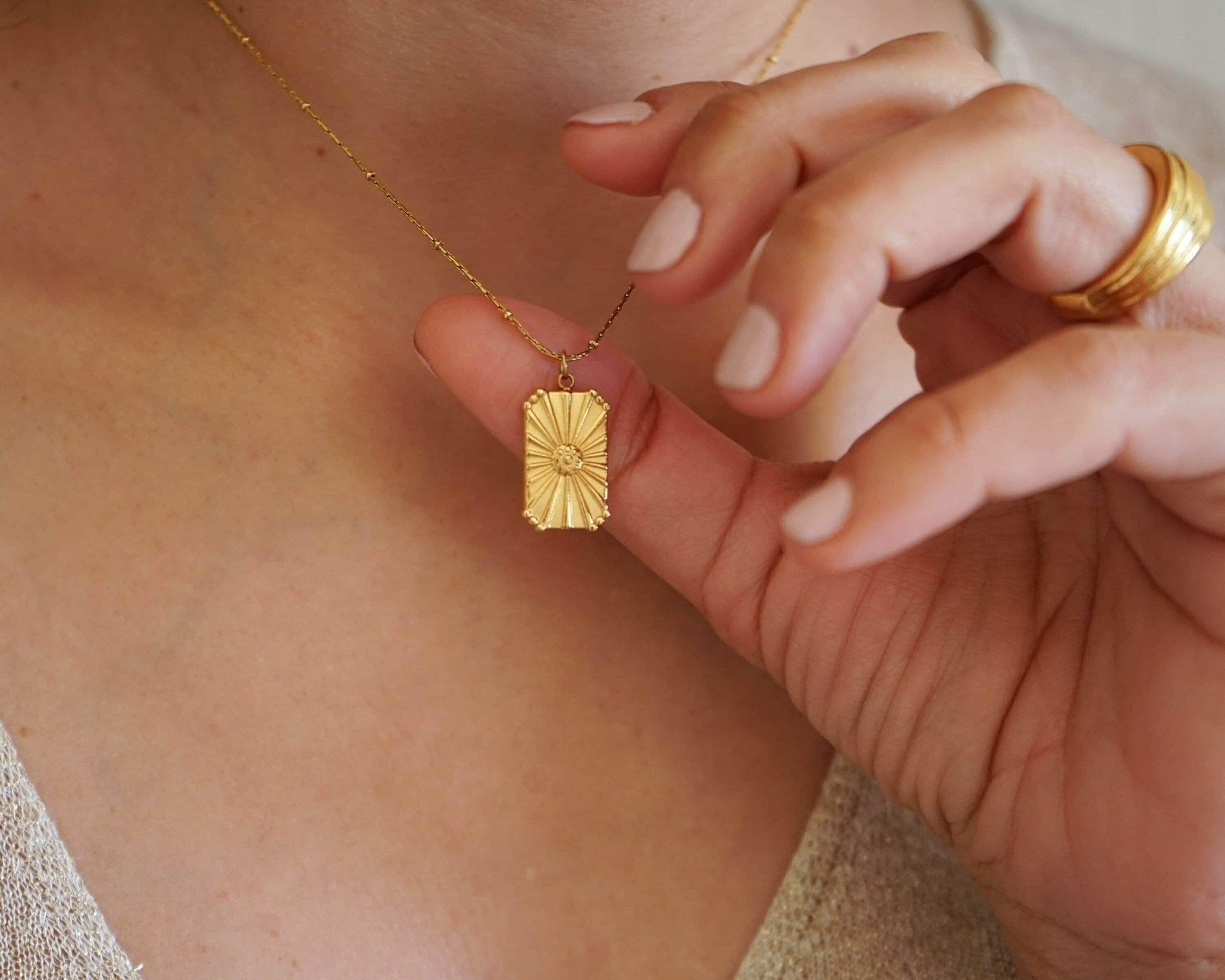 It's a unique gold pendant with an embossed flower at the center on a stainless steel beaded snake chain. These materials remain beautiful and do not wear off. They are tarnish-free and waterproof. The biggest trend in the fashion world right now dictates multi-layer necklaces. Chains and links of all sizes are a big trend on the runway and on the street this season. Styling that mingles thick and thin chains and beads creates a refined, modern look. Invest in a statement piece that can take you through the seasons and complement every outfit.