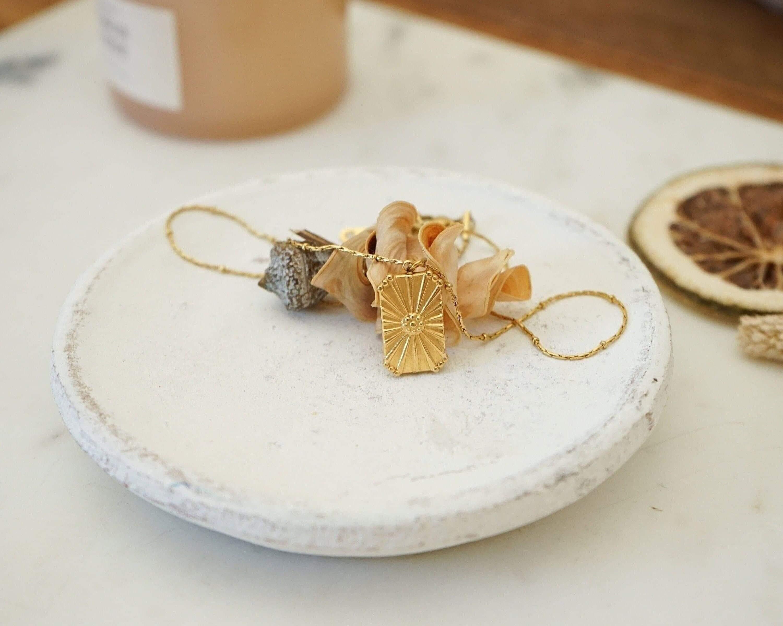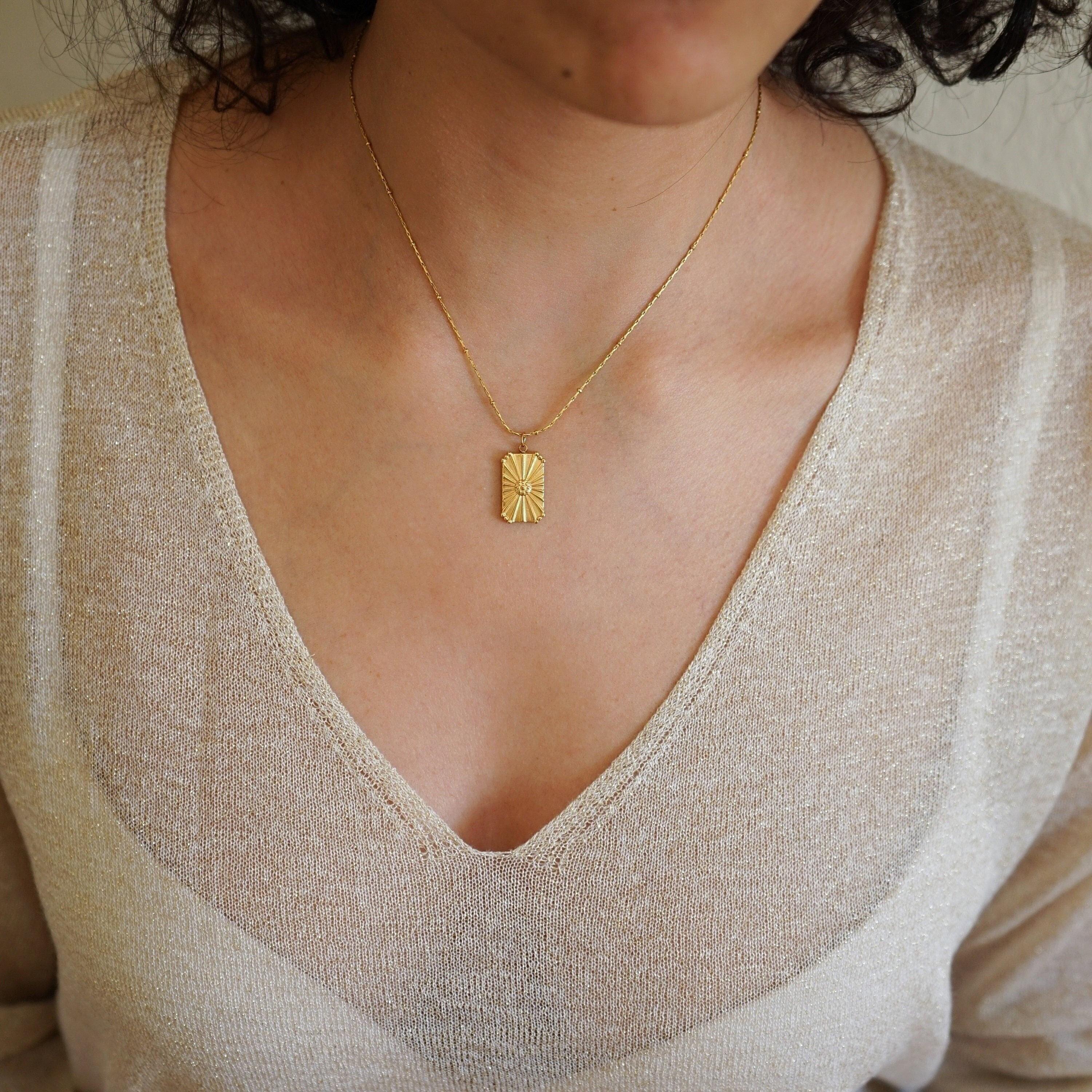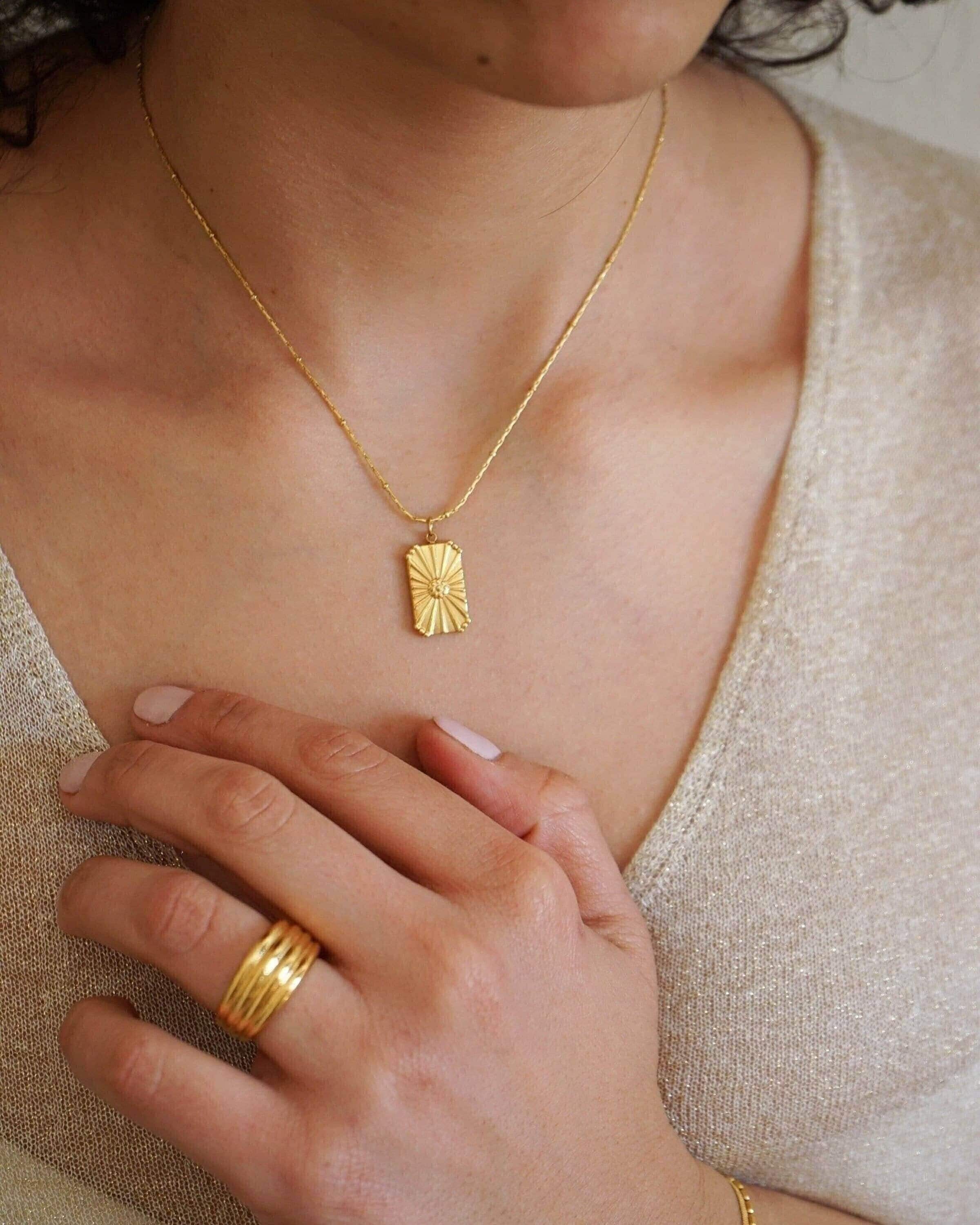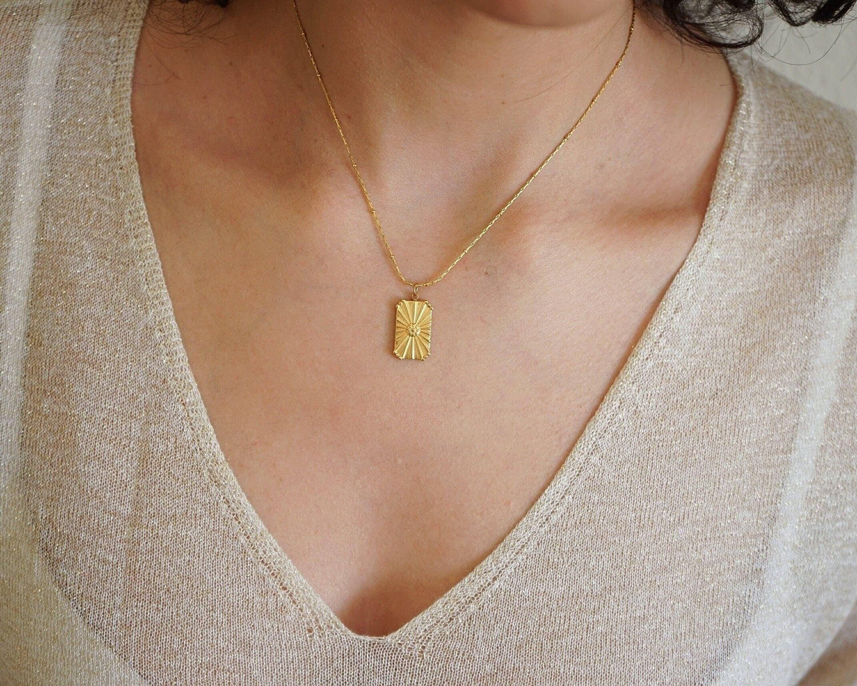 It's a unique gold pendant with an embossed flower at the center on a stainless steel beaded snake chain. These materials remain beautiful and do not wear off. They are tarnish-free and waterproof. The biggest trend in the fashion world right now dictates multi-layer necklaces. Chains and links of all sizes are a big trend on the runway and on the street this season. Styling that mingles thick and thin chains and beads creates a refined, modern look. Invest in a statement piece that can take you through the seasons and complement every outfit.