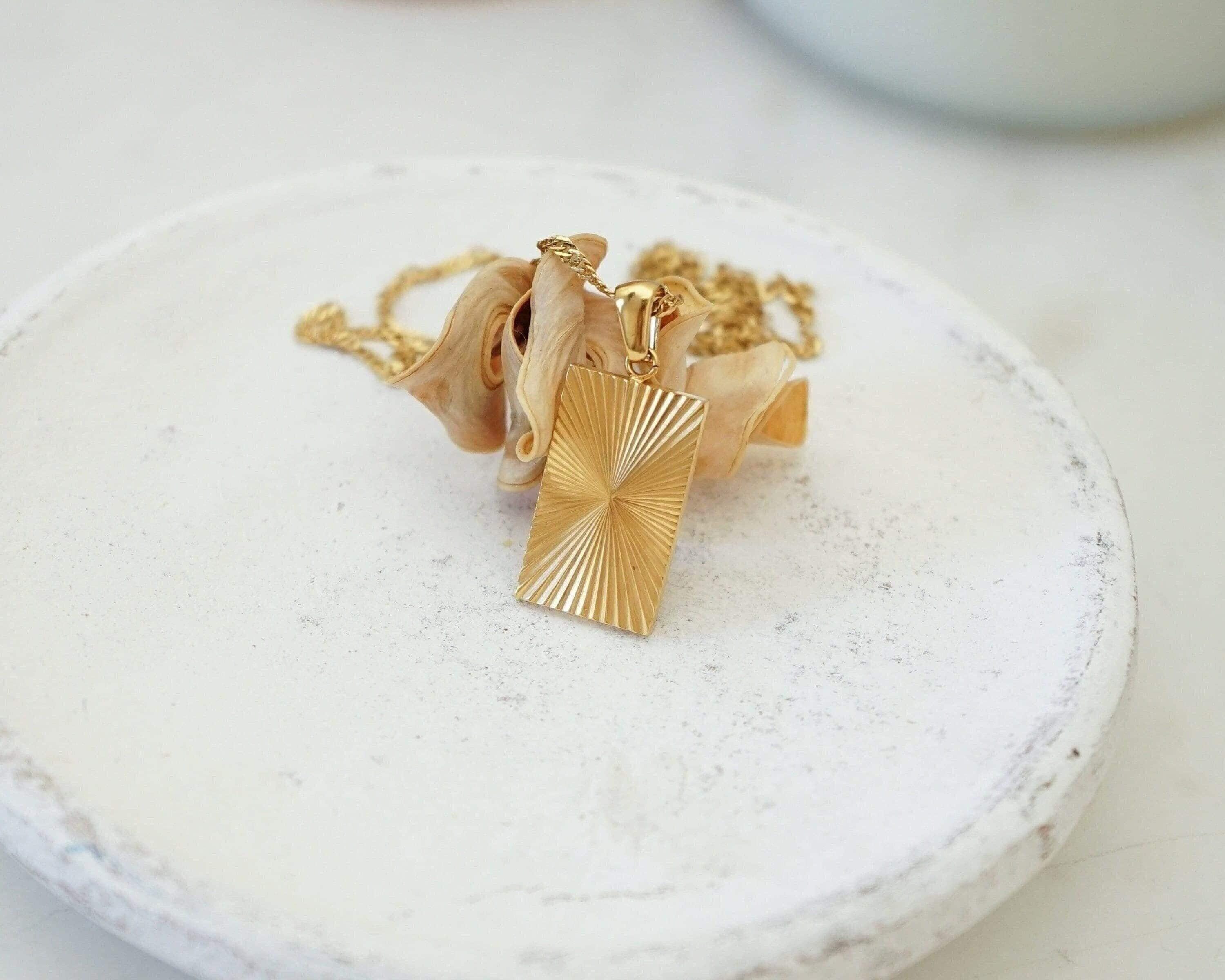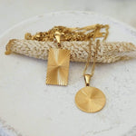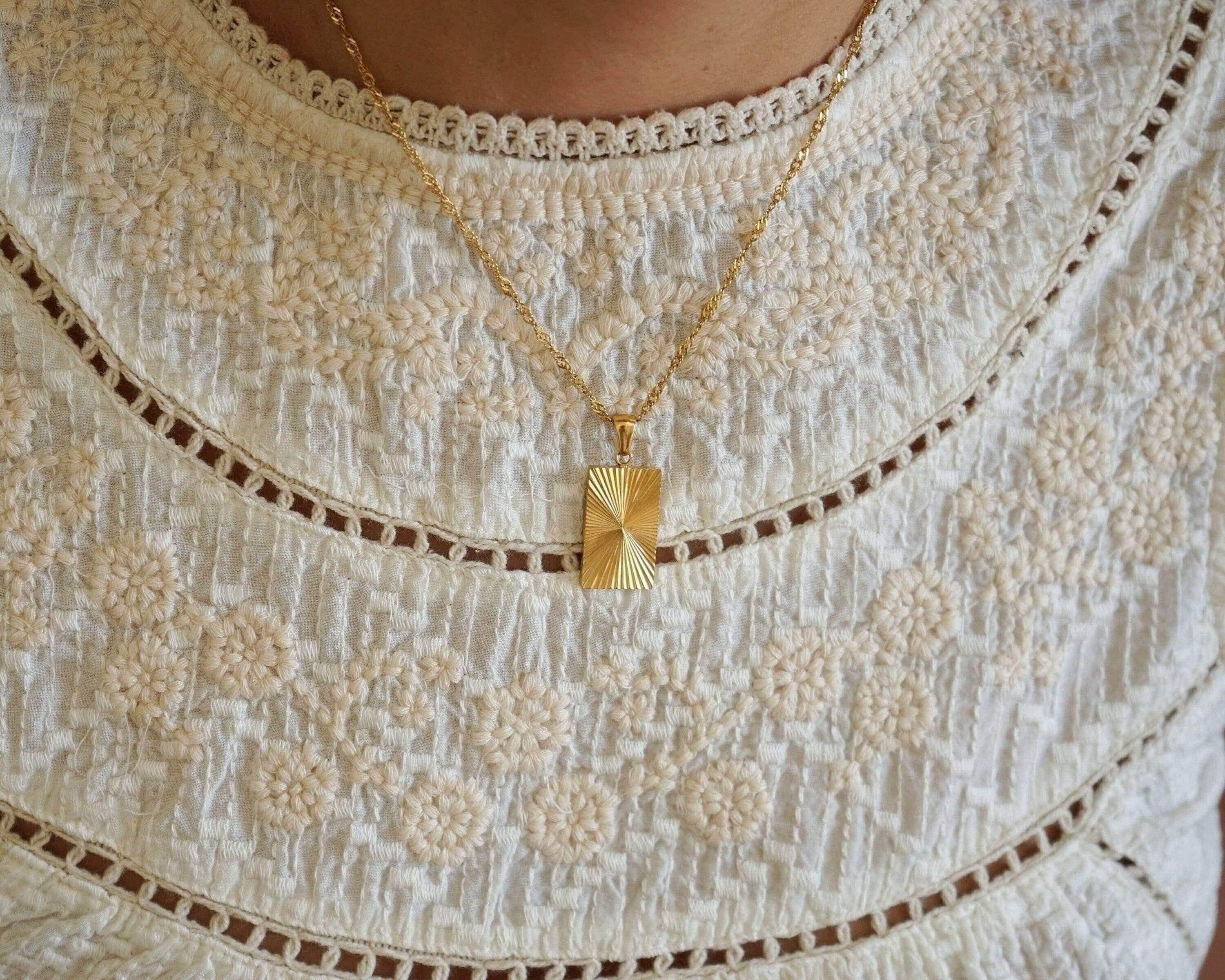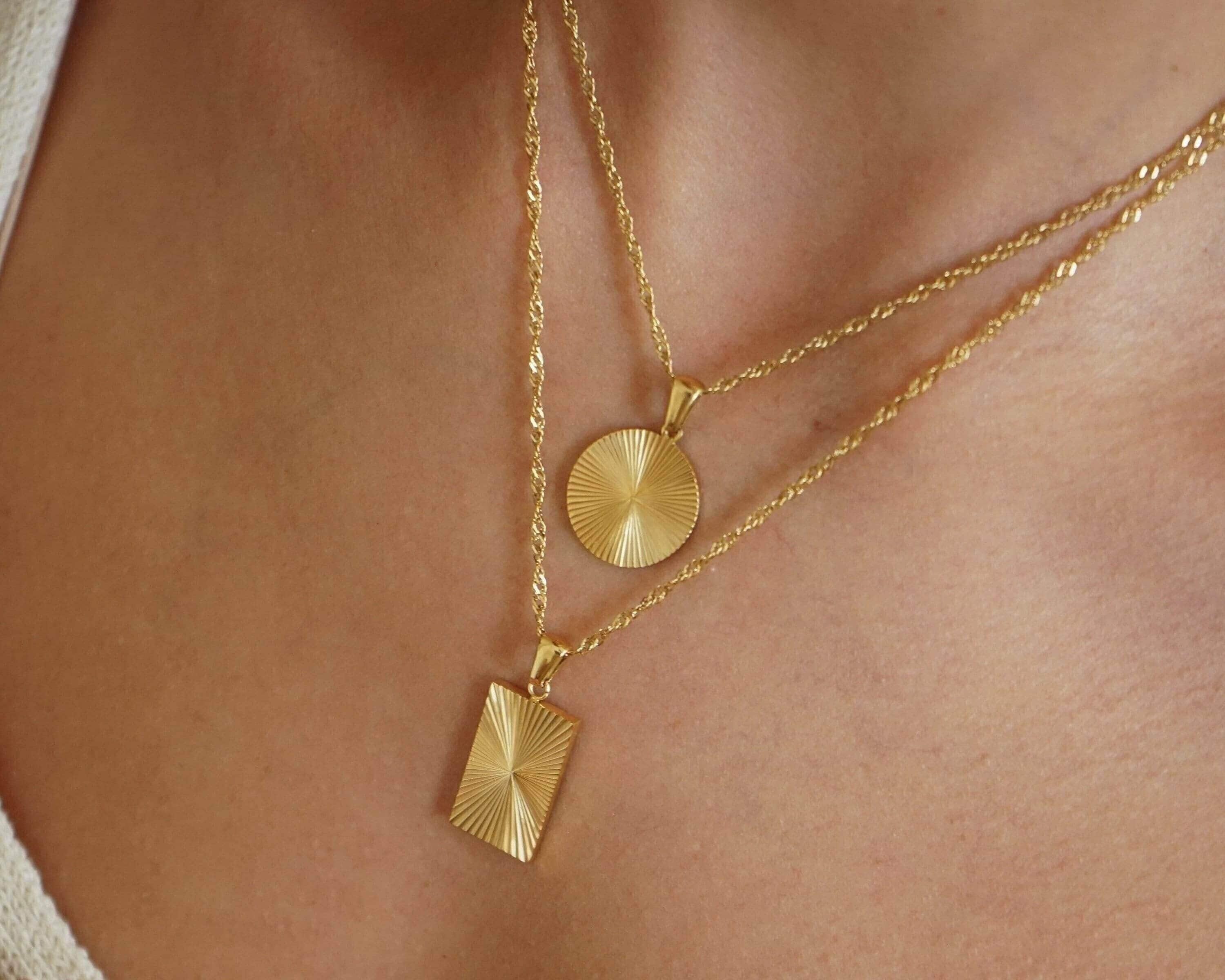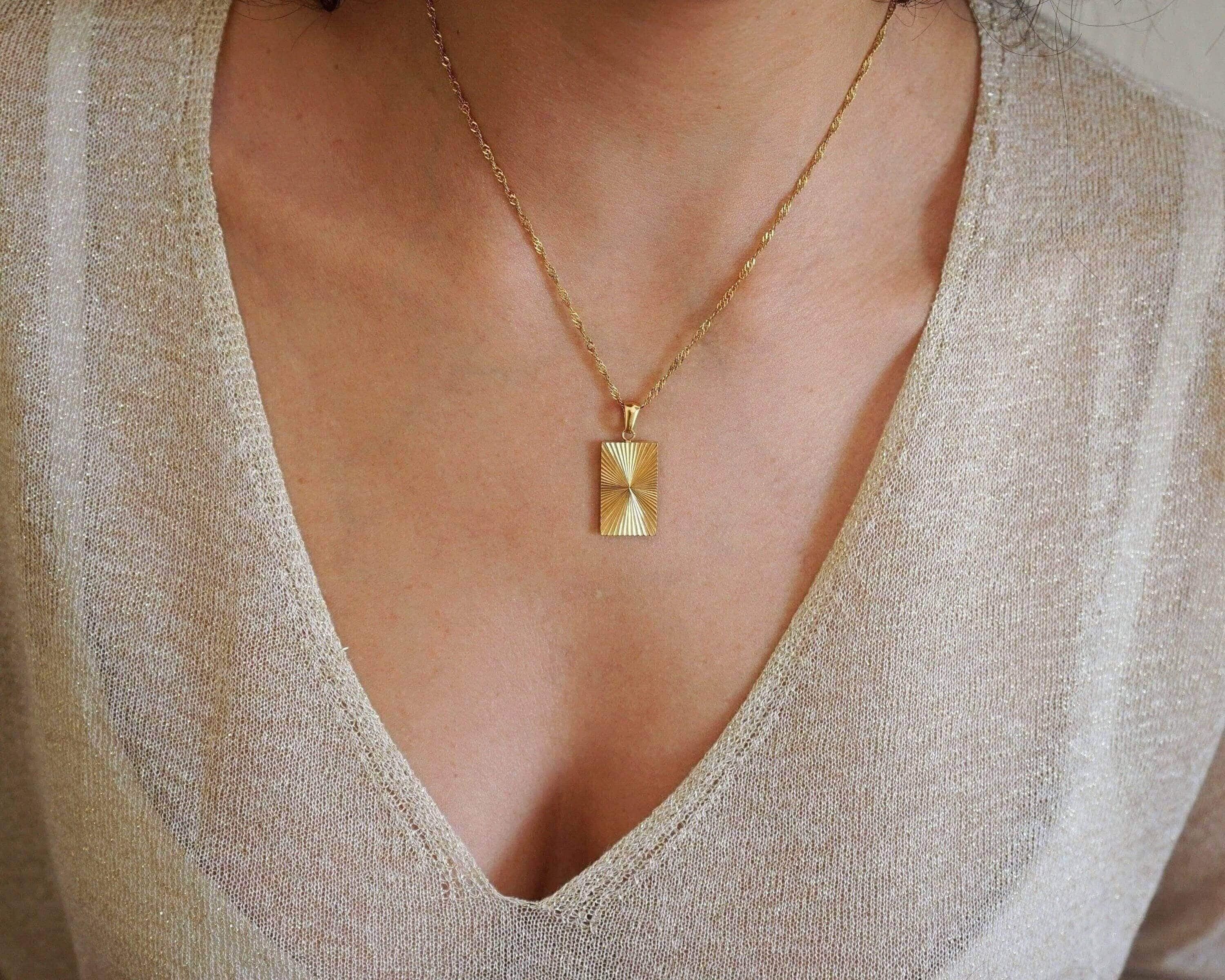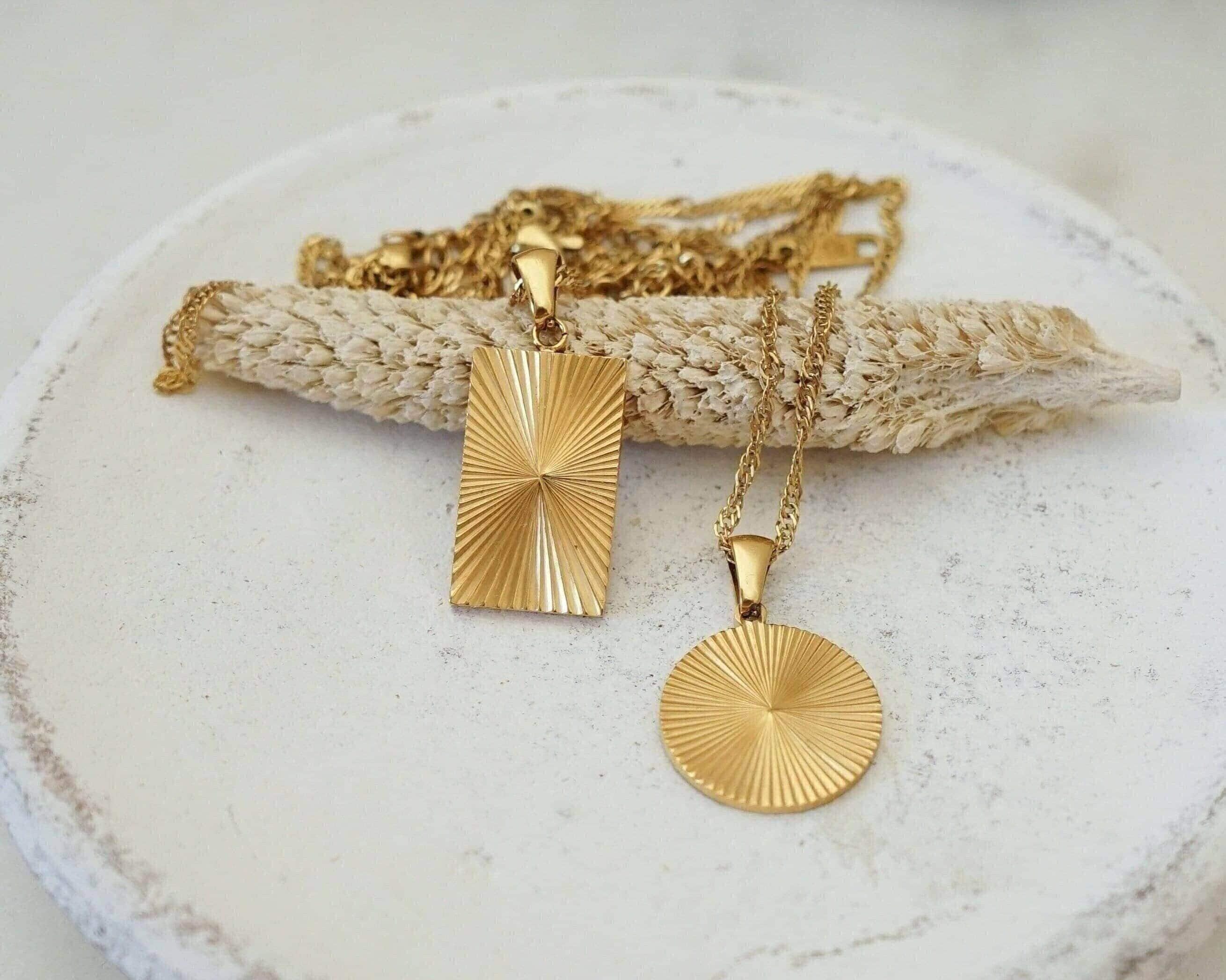 Discover a stunning gold pendant featuring intricately embossed sun rays, available in two distinct styles: a classic rectangle and a charming round design. Each pendant is elegantly suspended on a durable stainless steel chain that combines both beauty and resilience. Crafted from high-quality materials, this necklace is designed to withstand the test of time, remaining tarnish-free and waterproof for everyday wear.