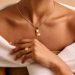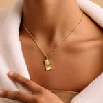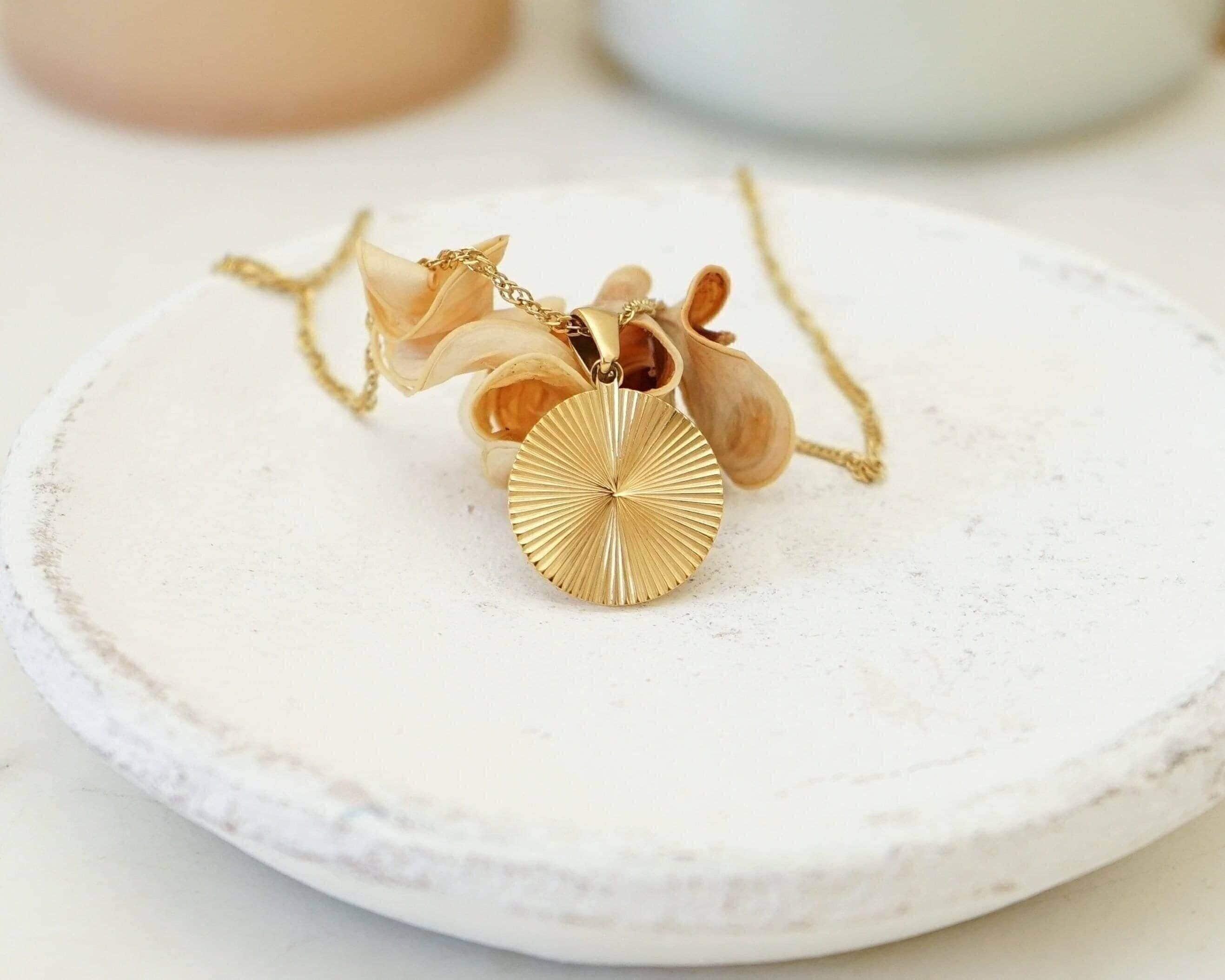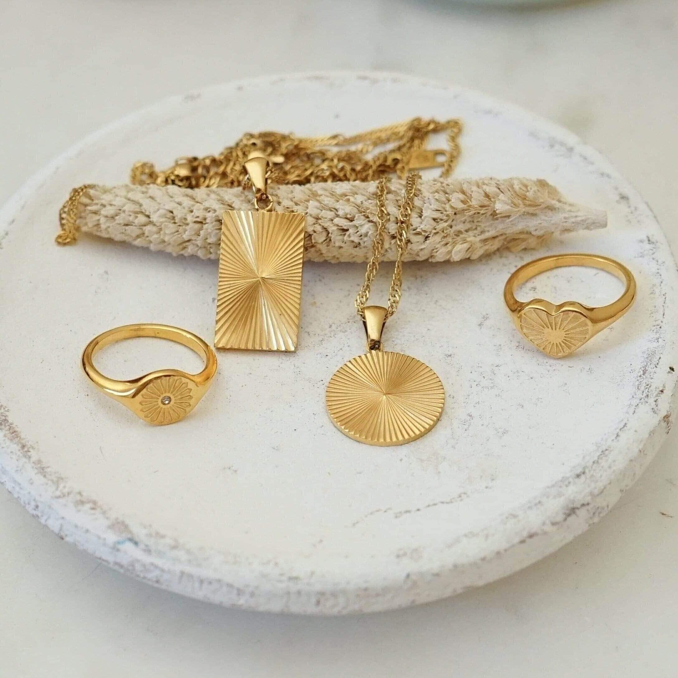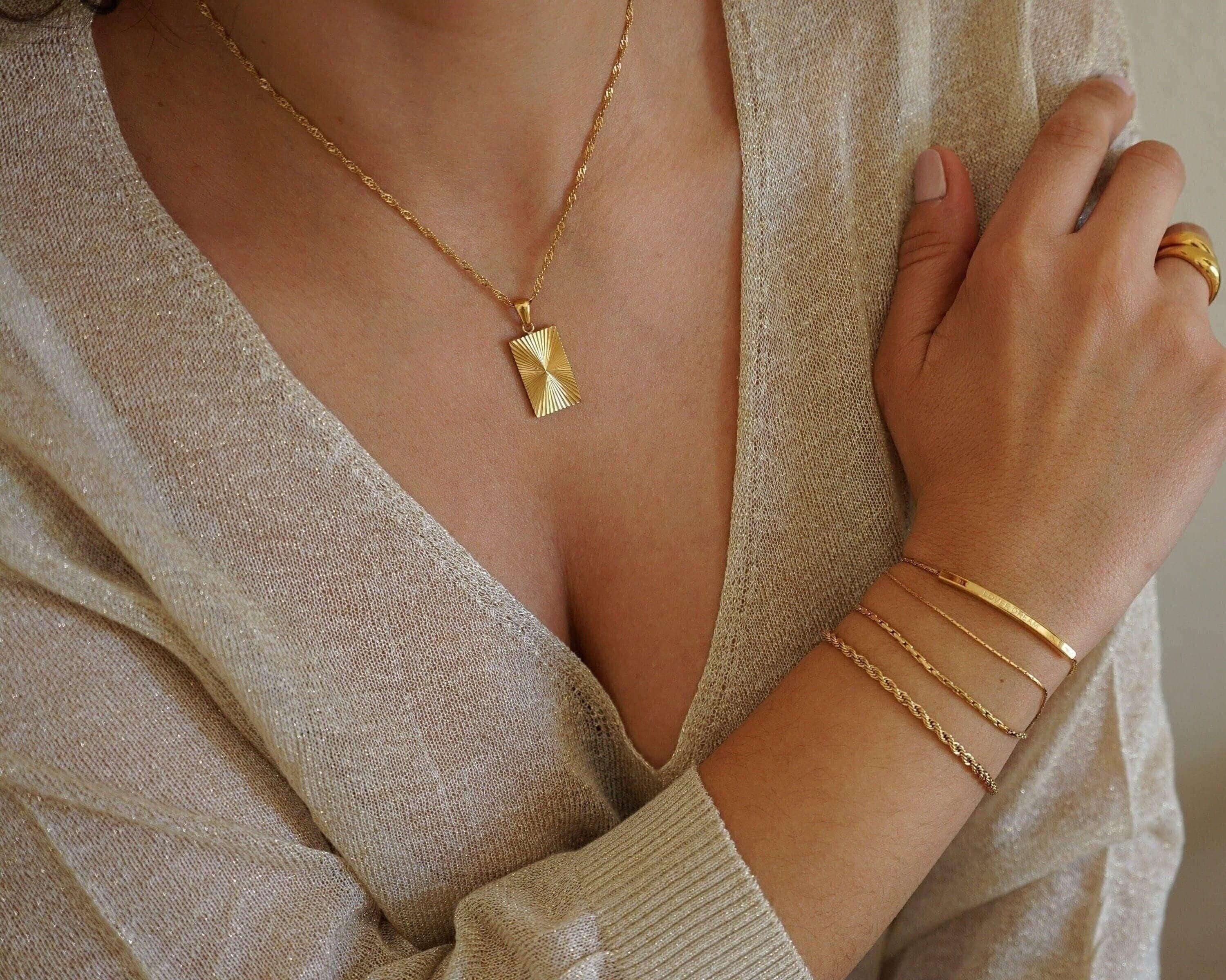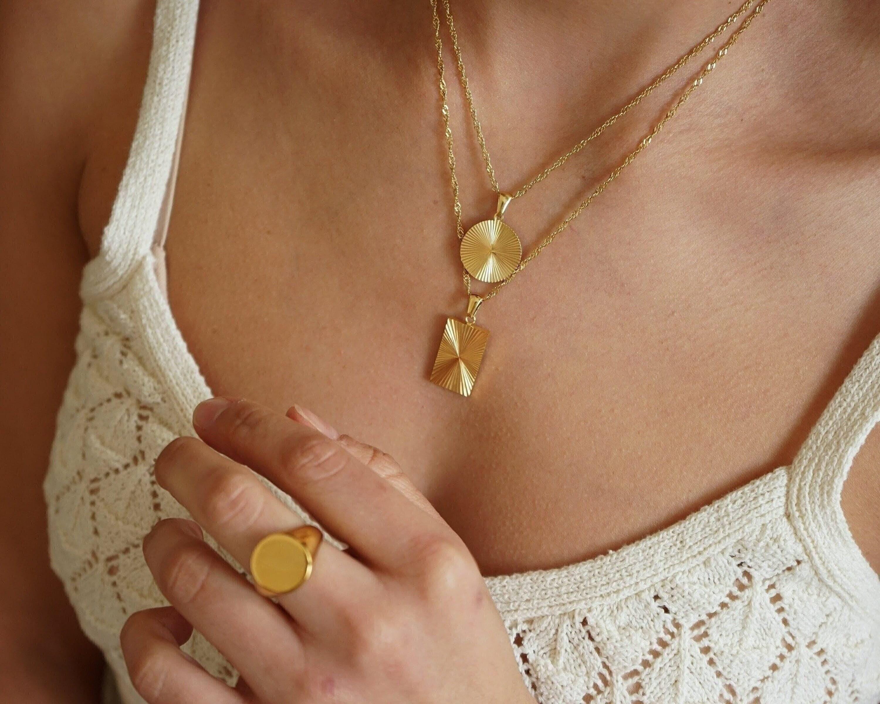Discover a stunning gold pendant featuring intricately embossed sun rays, available in two distinct styles: a classic rectangle and a charming round design. Each pendant is elegantly suspended on a durable stainless steel chain that combines both beauty and resilience. Crafted from high-quality materials, this necklace is designed to withstand the test of time, remaining tarnish-free and waterproof for everyday wear.