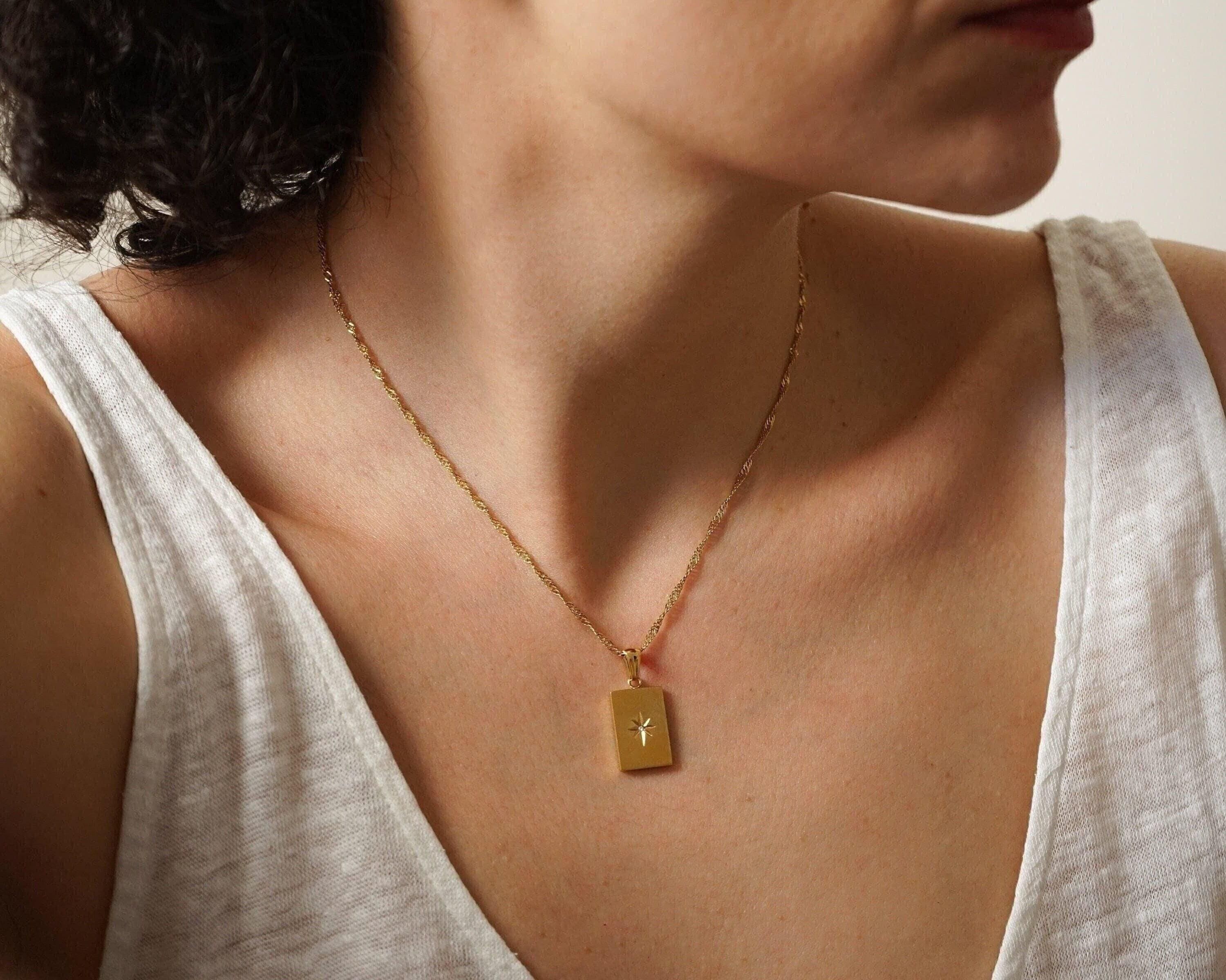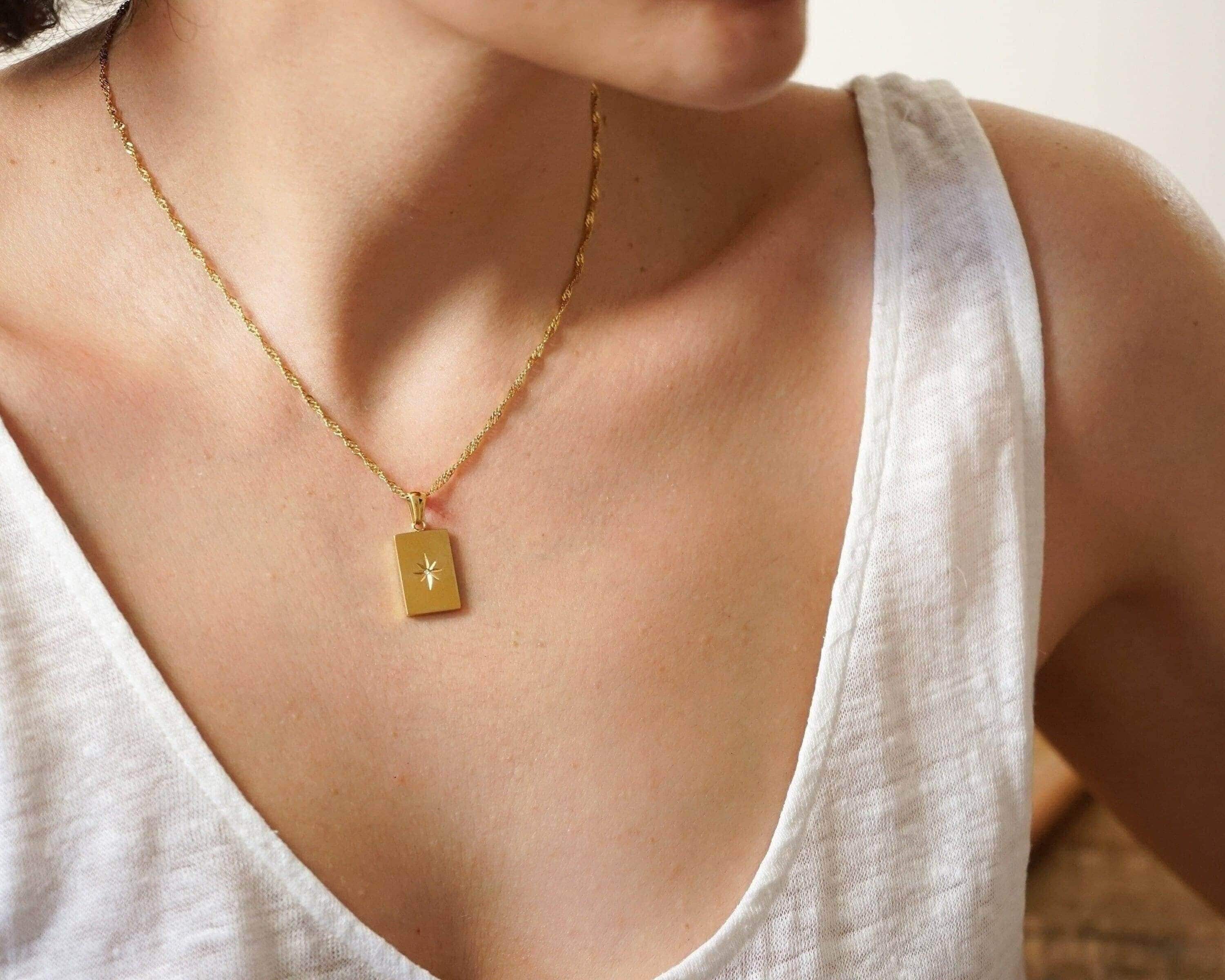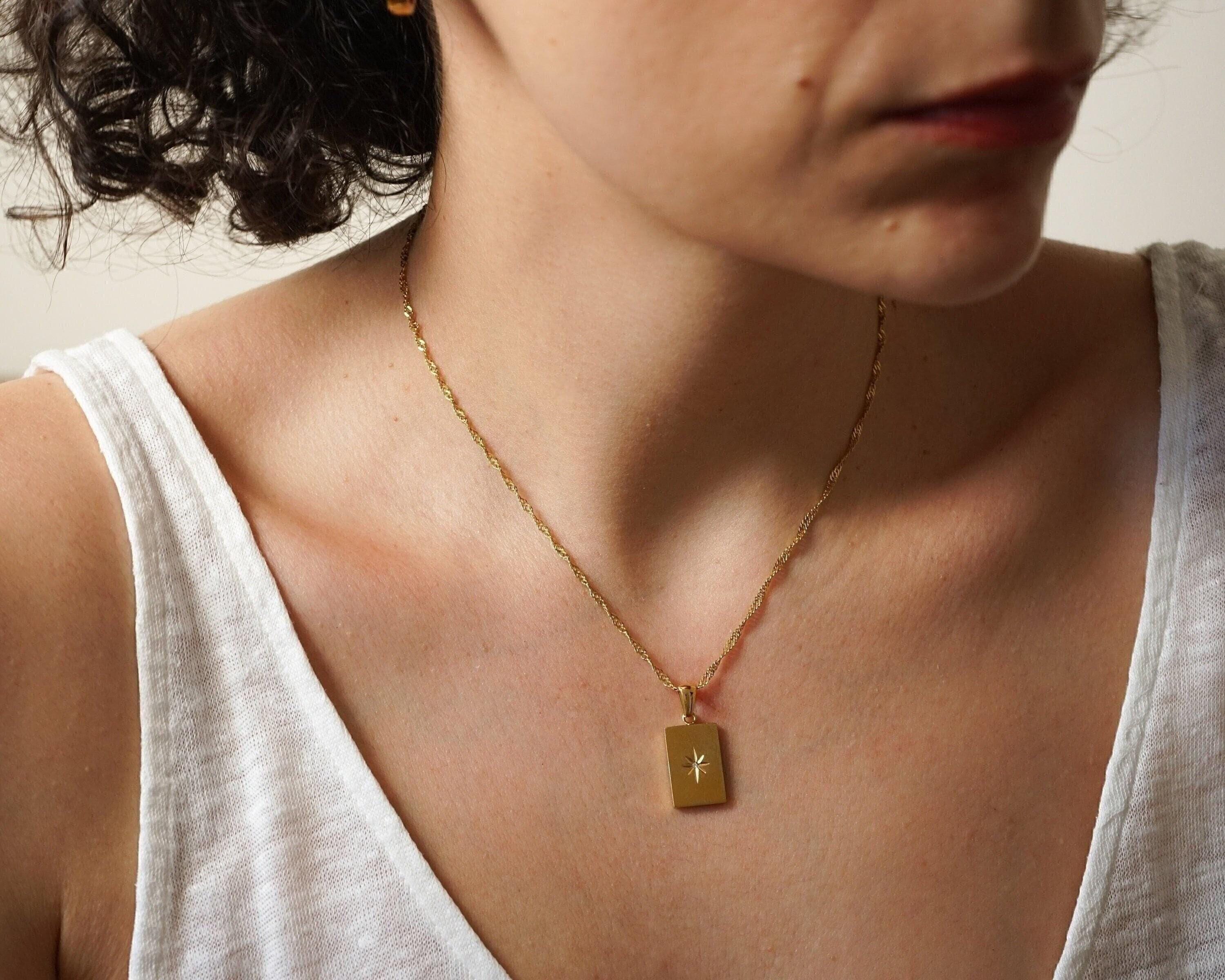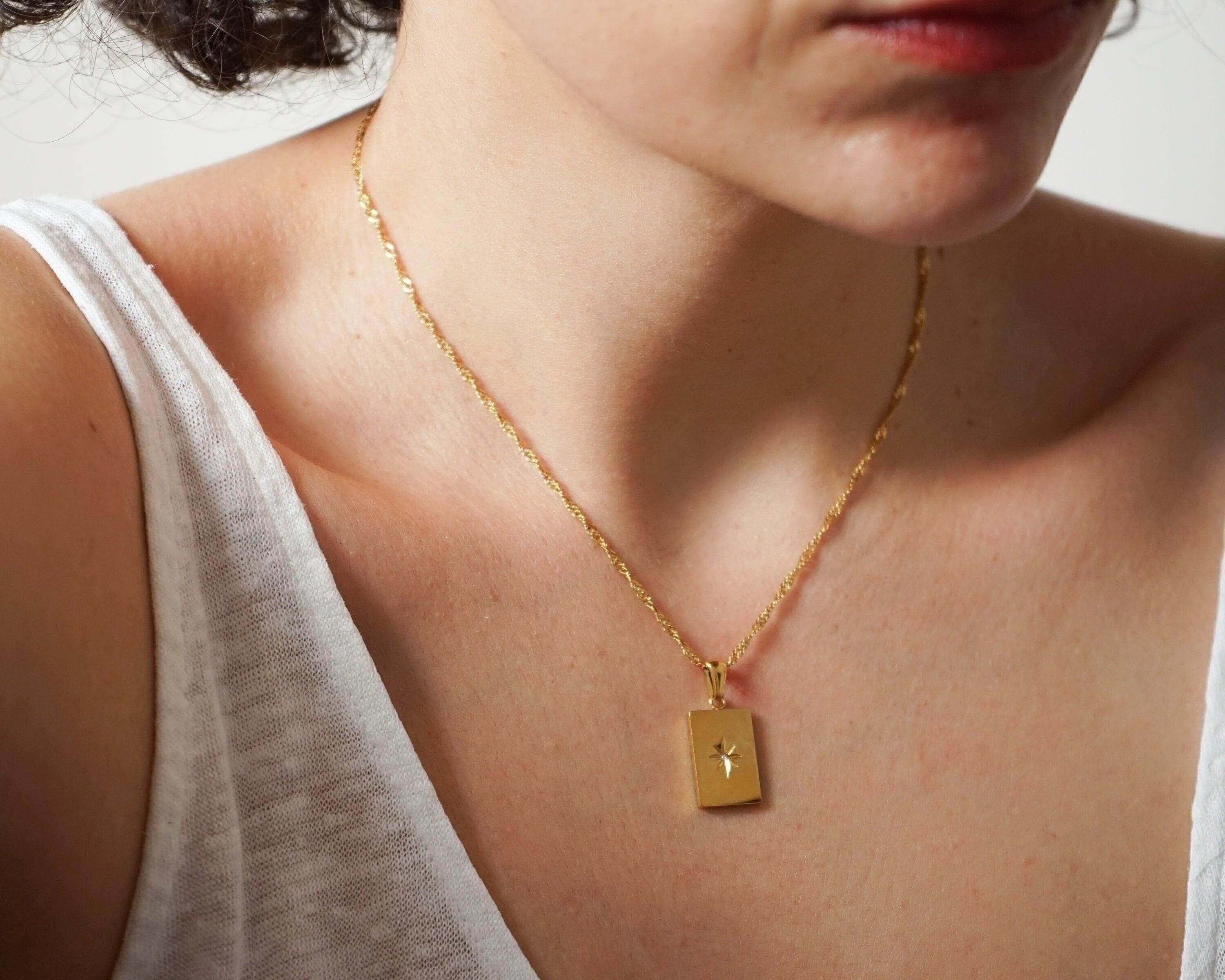 Υποδεχτείτε το νέο σας αγαπημένο αξεσουάρ! Αυτό το πανέμορφο χρυσό ορθογώνιο κολιέ διαθέτει έναν όμορφα χαραγμένο ήλιο, με μια λαμπερή πέτρα CZ ακριβώς στο κέντρο του. Θα λατρέψετε τον τρόπο που λαμπυρίζει στο φως! Κρεμασμένο από μια στιβαρή αλυσίδα από ανοξείδωτο ατσάλι, αυτό το κομμάτι έχει σχεδιαστεί για να παραμένει εκπληκτικό, ανεξάρτητα από το πού σας οδηγεί η μέρα σας—δεν θαμπώνει και είναι αδιάβροχο, ώστε να μπορείτε να το φοράτε με αυτοπεποίθηση κάθε μέρα.