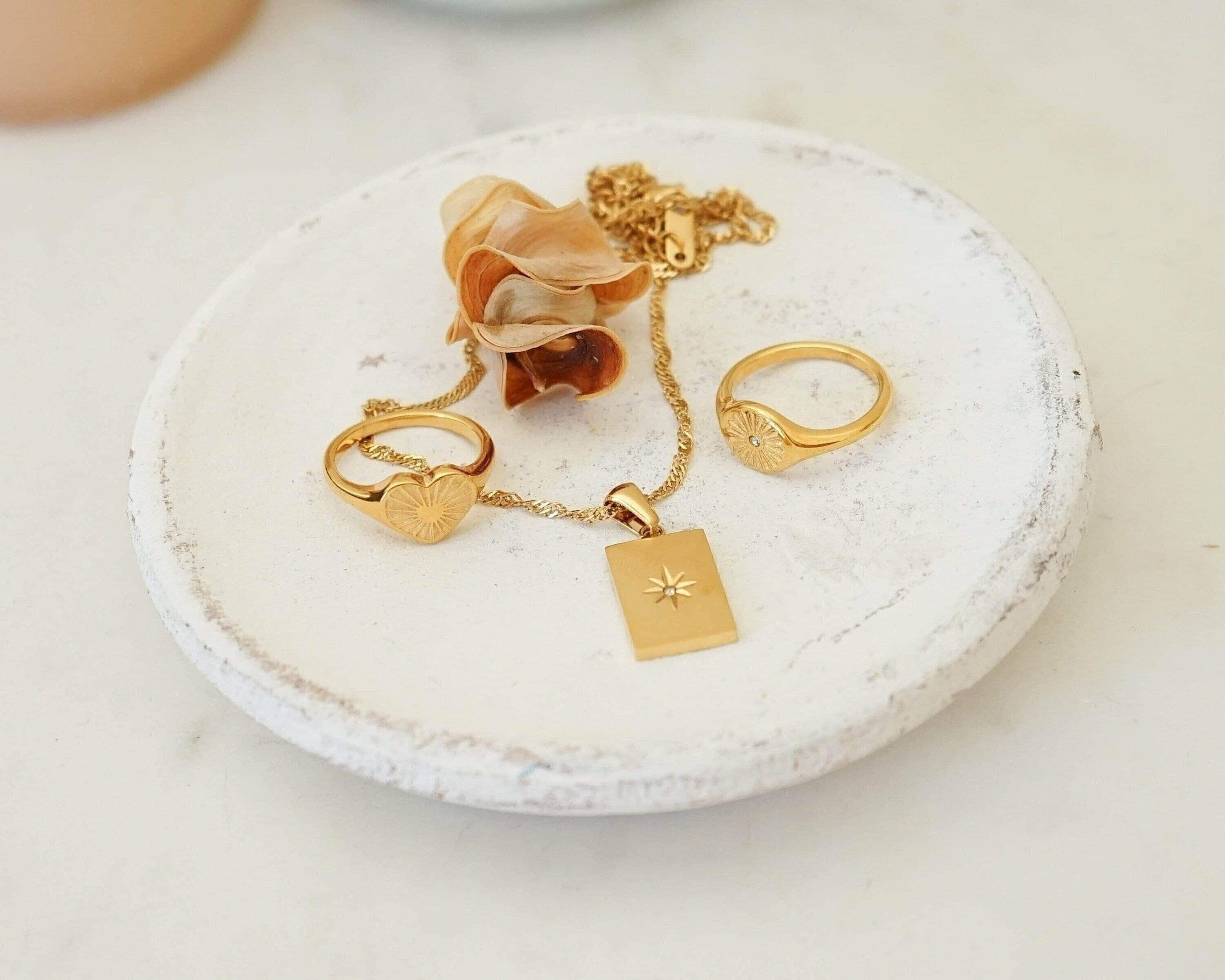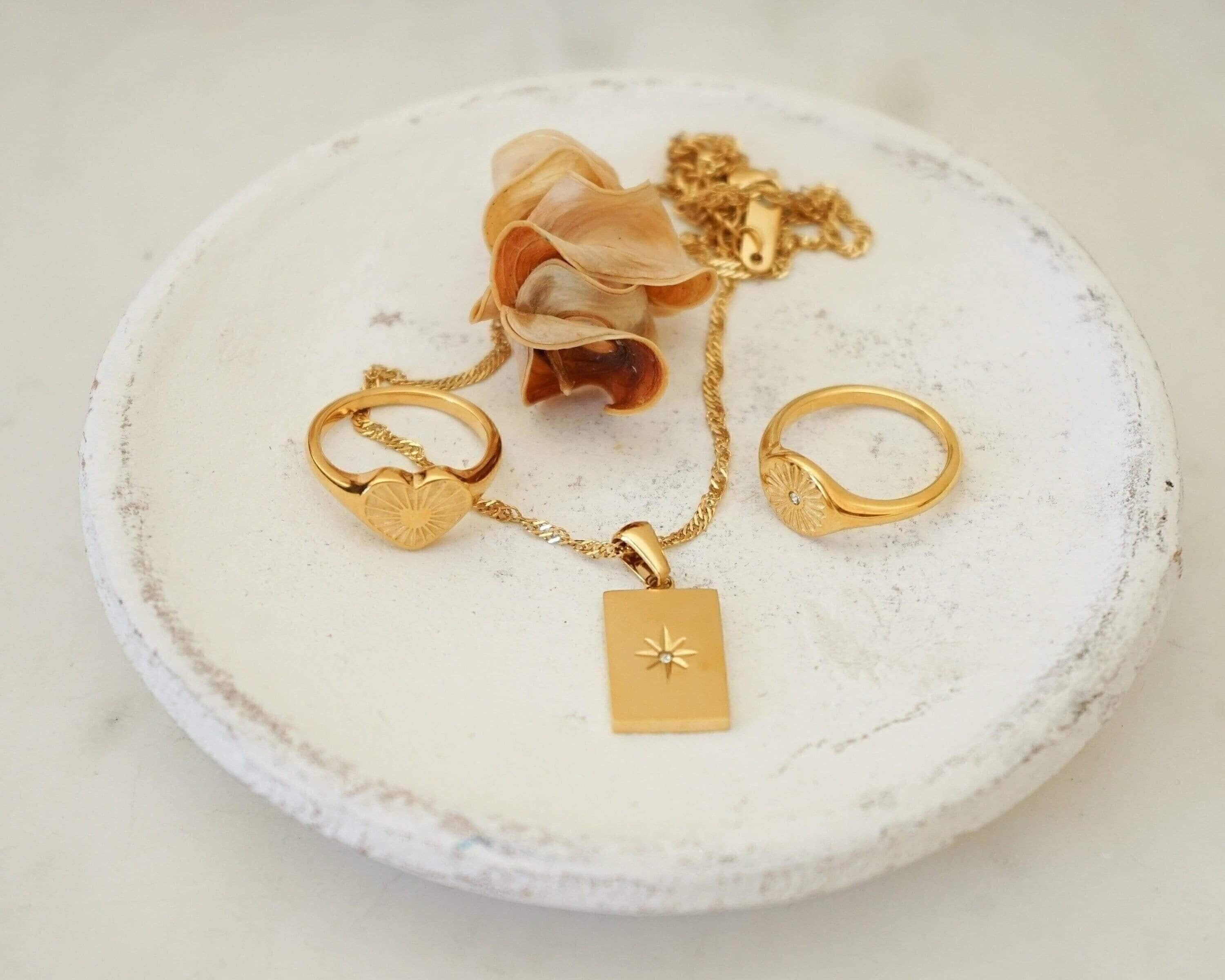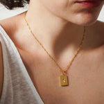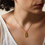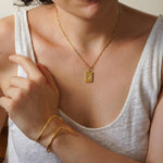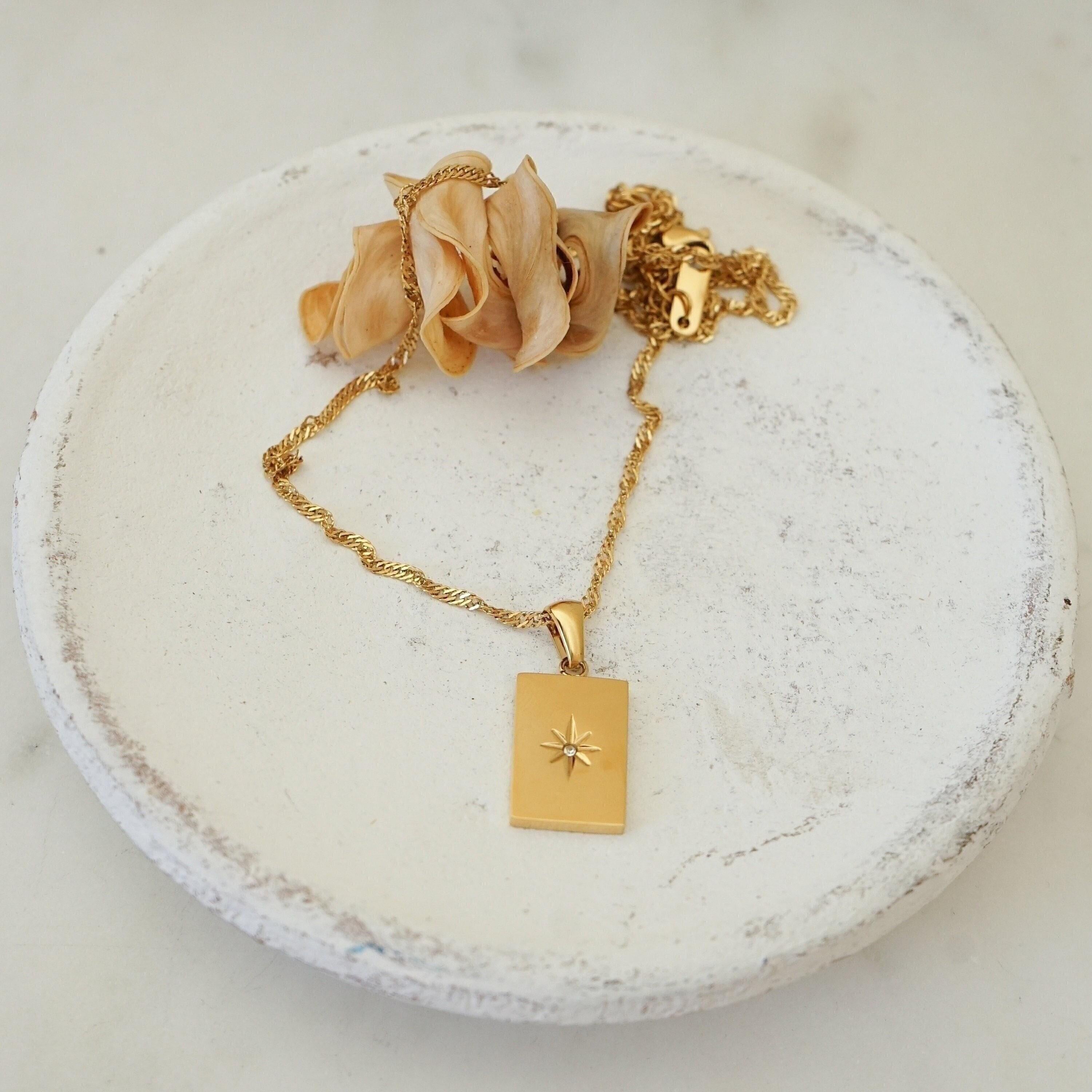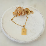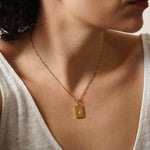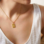 Υποδεχτείτε το νέο σας αγαπημένο αξεσουάρ! Αυτό το πανέμορφο χρυσό ορθογώνιο κολιέ διαθέτει έναν όμορφα χαραγμένο ήλιο, με μια λαμπερή πέτρα CZ ακριβώς στο κέντρο του. Θα λατρέψετε τον τρόπο που λαμπυρίζει στο φως! Κρεμασμένο από μια στιβαρή αλυσίδα από ανοξείδωτο ατσάλι, αυτό το κομμάτι έχει σχεδιαστεί για να παραμένει εκπληκτικό, ανεξάρτητα από το πού σας οδηγεί η μέρα σας—δεν θαμπώνει και είναι αδιάβροχο, ώστε να μπορείτε να το φοράτε με αυτοπεποίθηση κάθε μέρα.