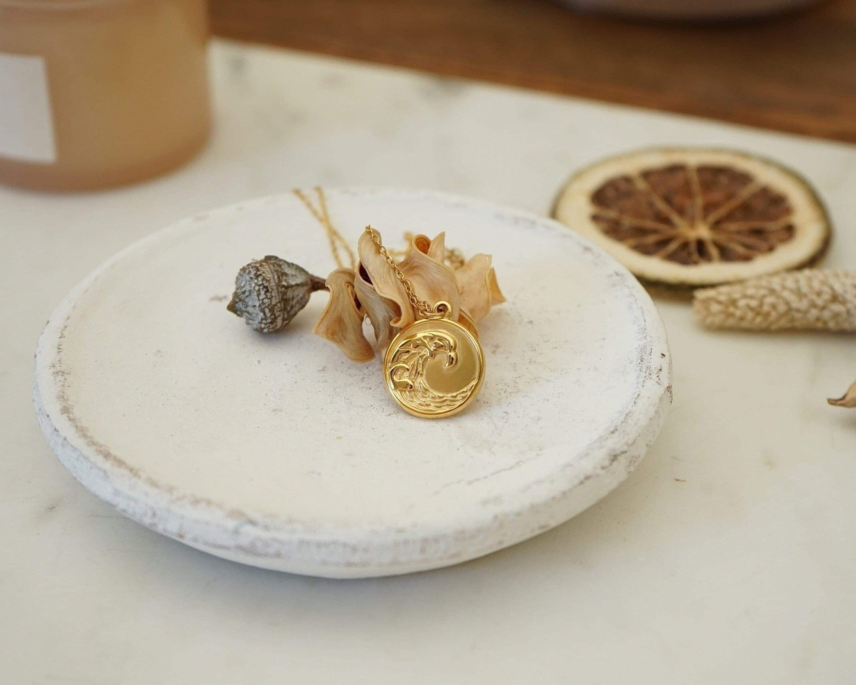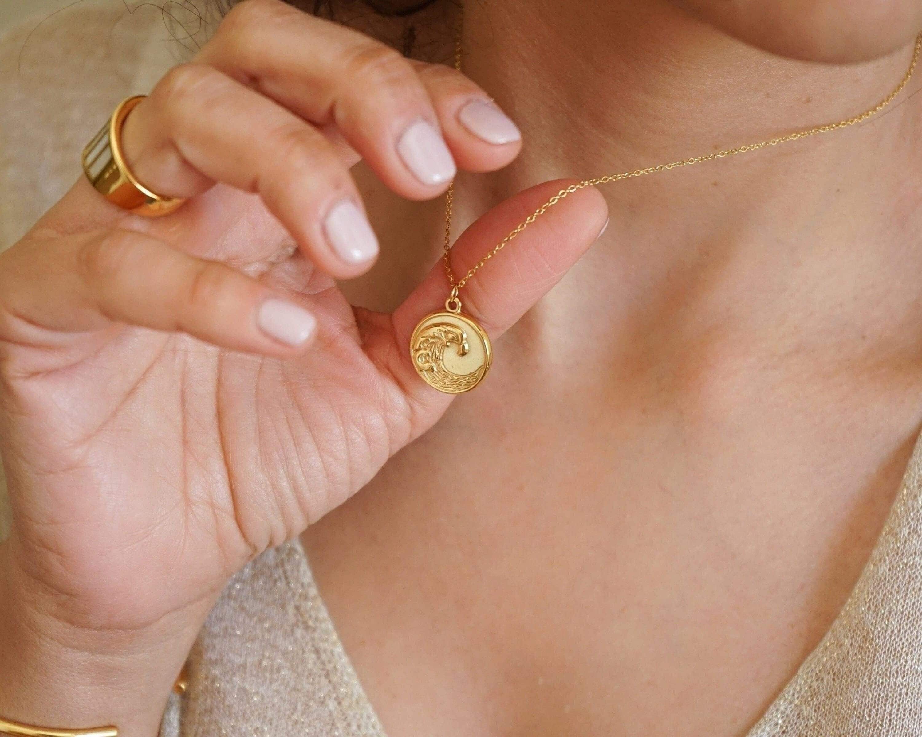 Introducing a beautifully crafted gold pendant necklace featuring a unique embossed wave design at its center, drawing inspiration from the traditional Ukiyo-E art style. The pendant is elegantly suspended from a durable stainless steel chain, ensuring that it maintains its luster over time. Crafted from high-quality materials, this necklace is tarnish-free and waterproof, making it perfect for everyday wear.