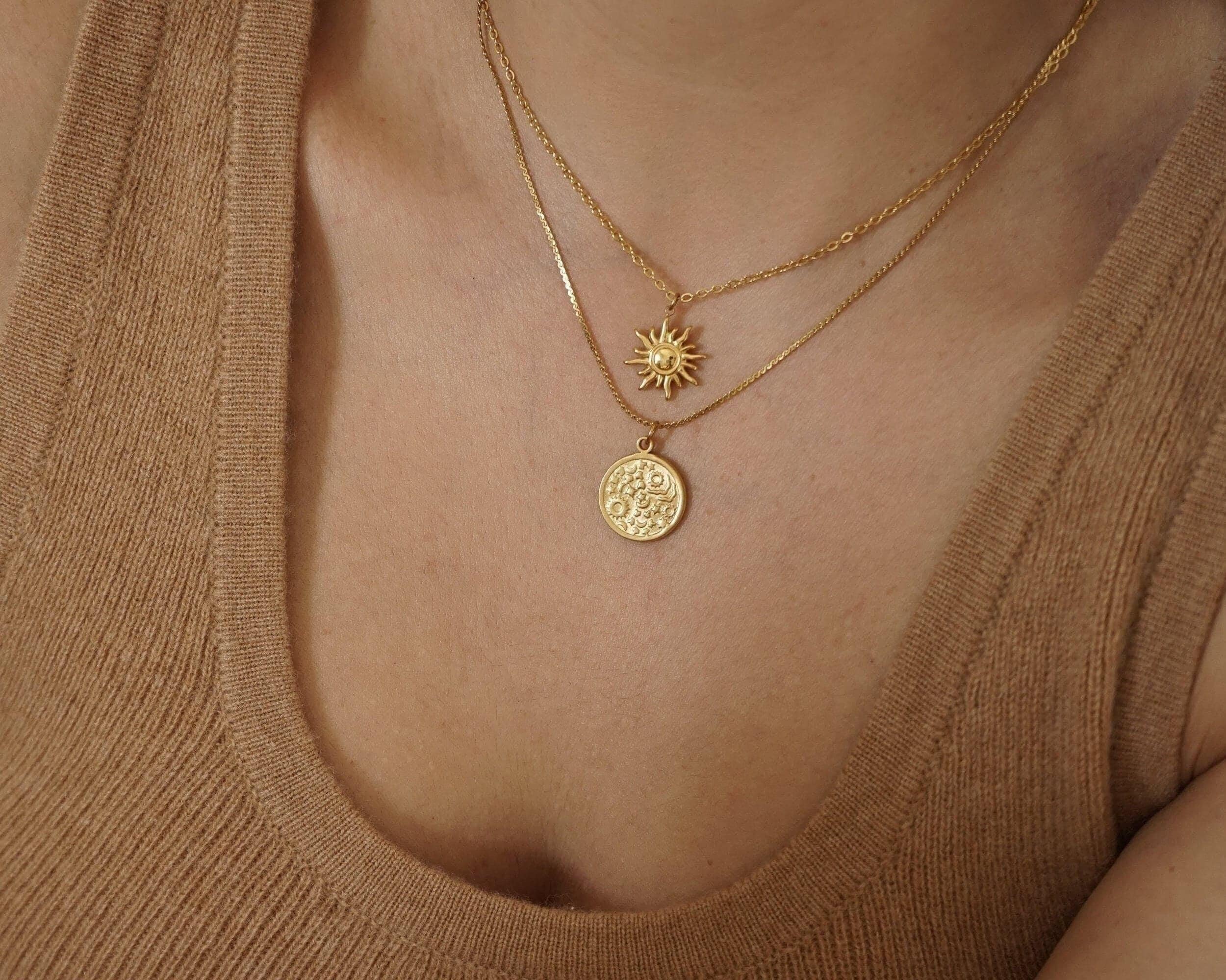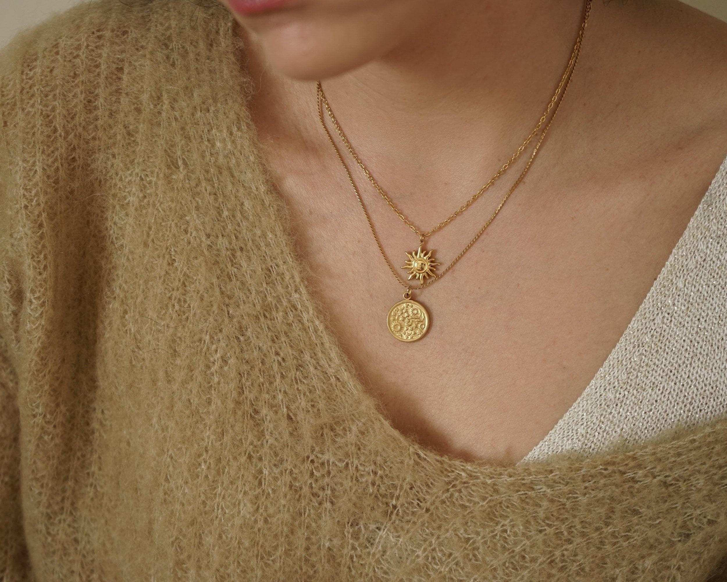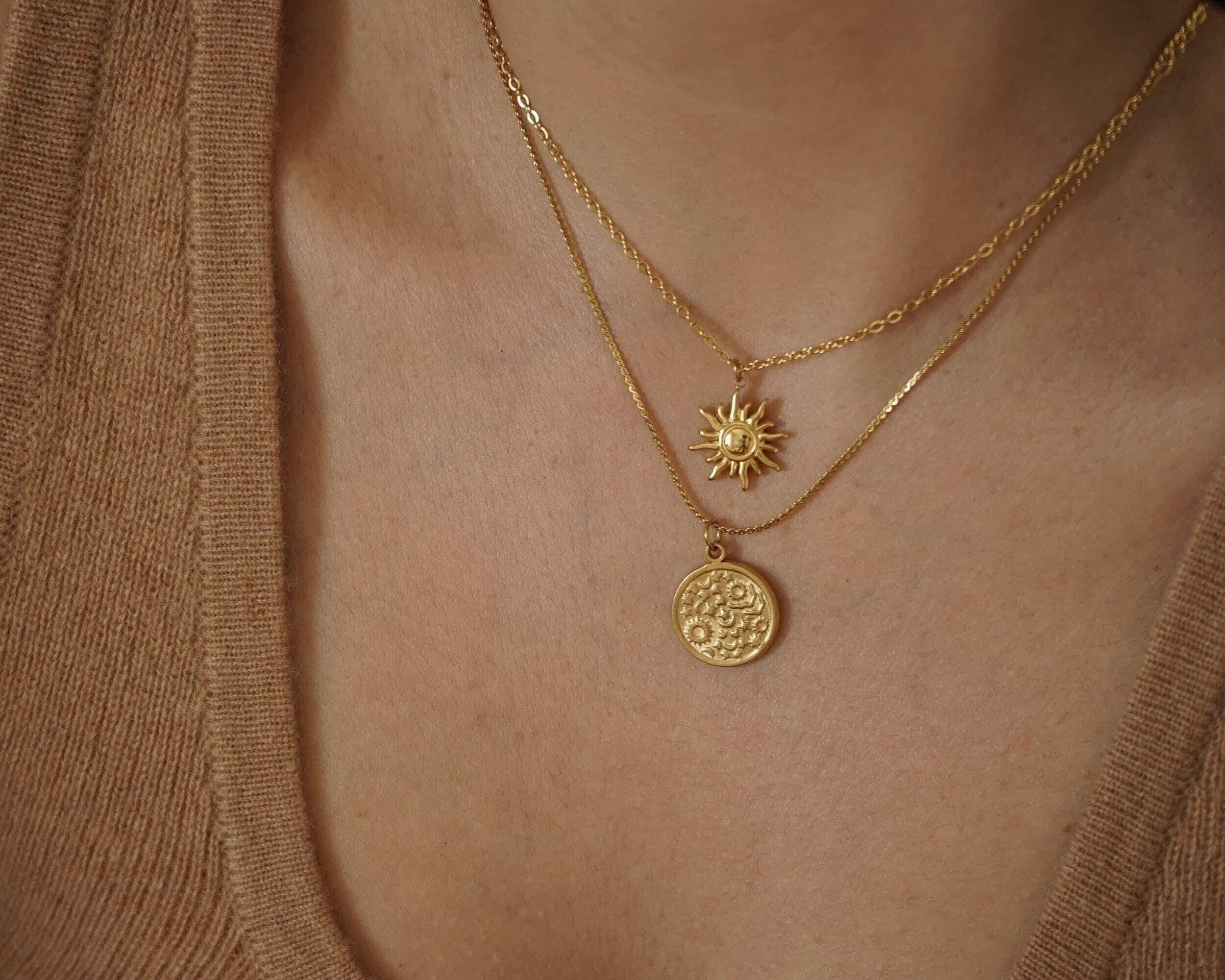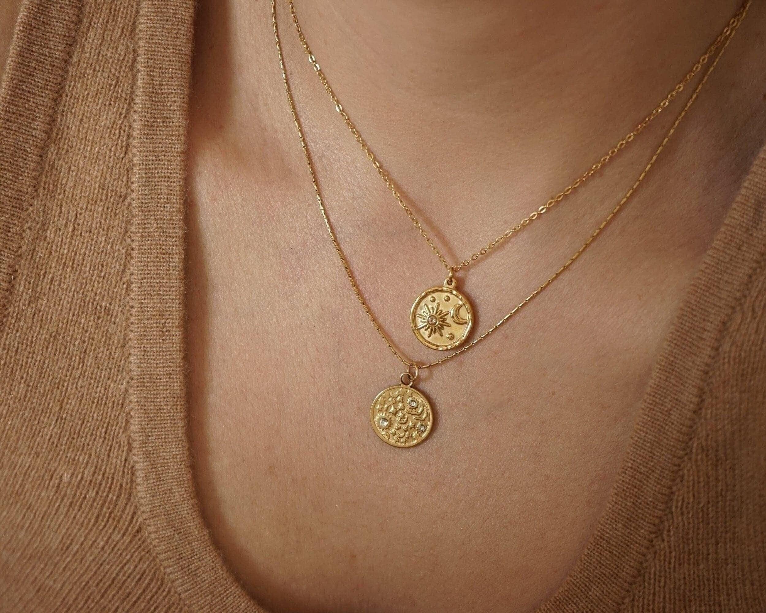 It's a unique gold stainless steel engraved SKY round pendant, with or without crystals. These materials remain beautiful and do not wear off. They are tarnish-free and waterproof. The biggest trend in the fashion world right now dictates multi-layer necklaces. Chains and links of all sizes are a big trend on the runway and on the street for this season. Styling that mingles thick and thin chains and beads creates a refined modern look. Invest in a statement piece that can take you through the seasons and complement every outfit.