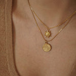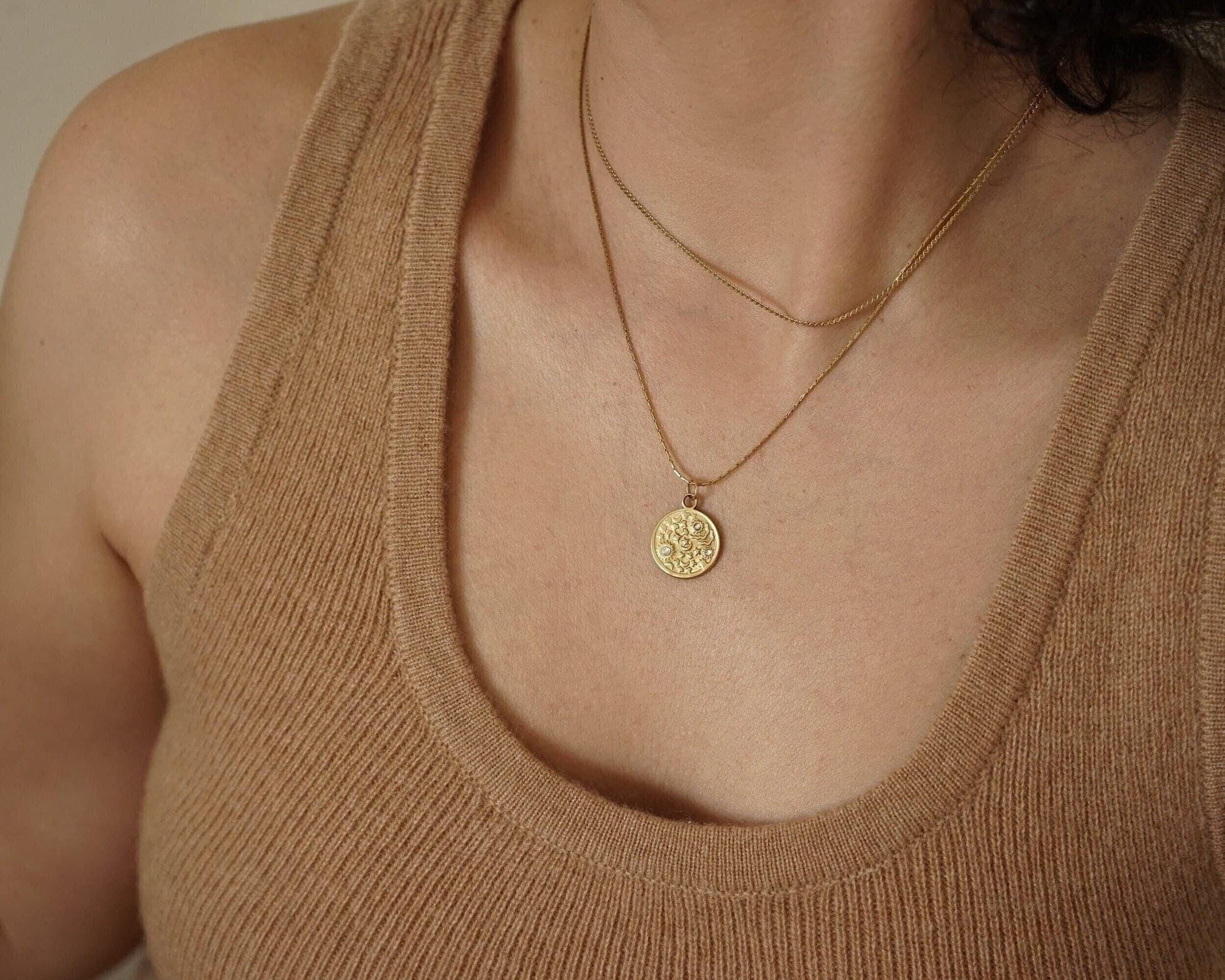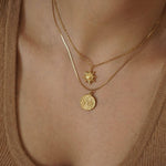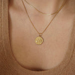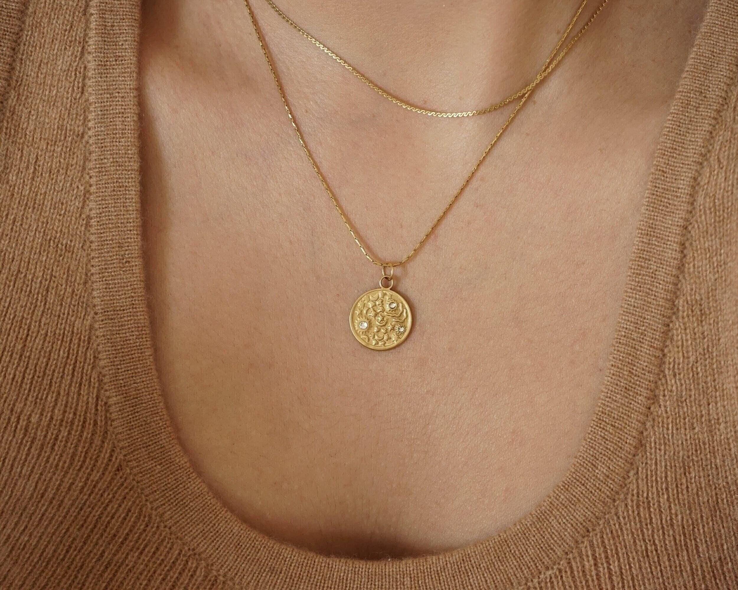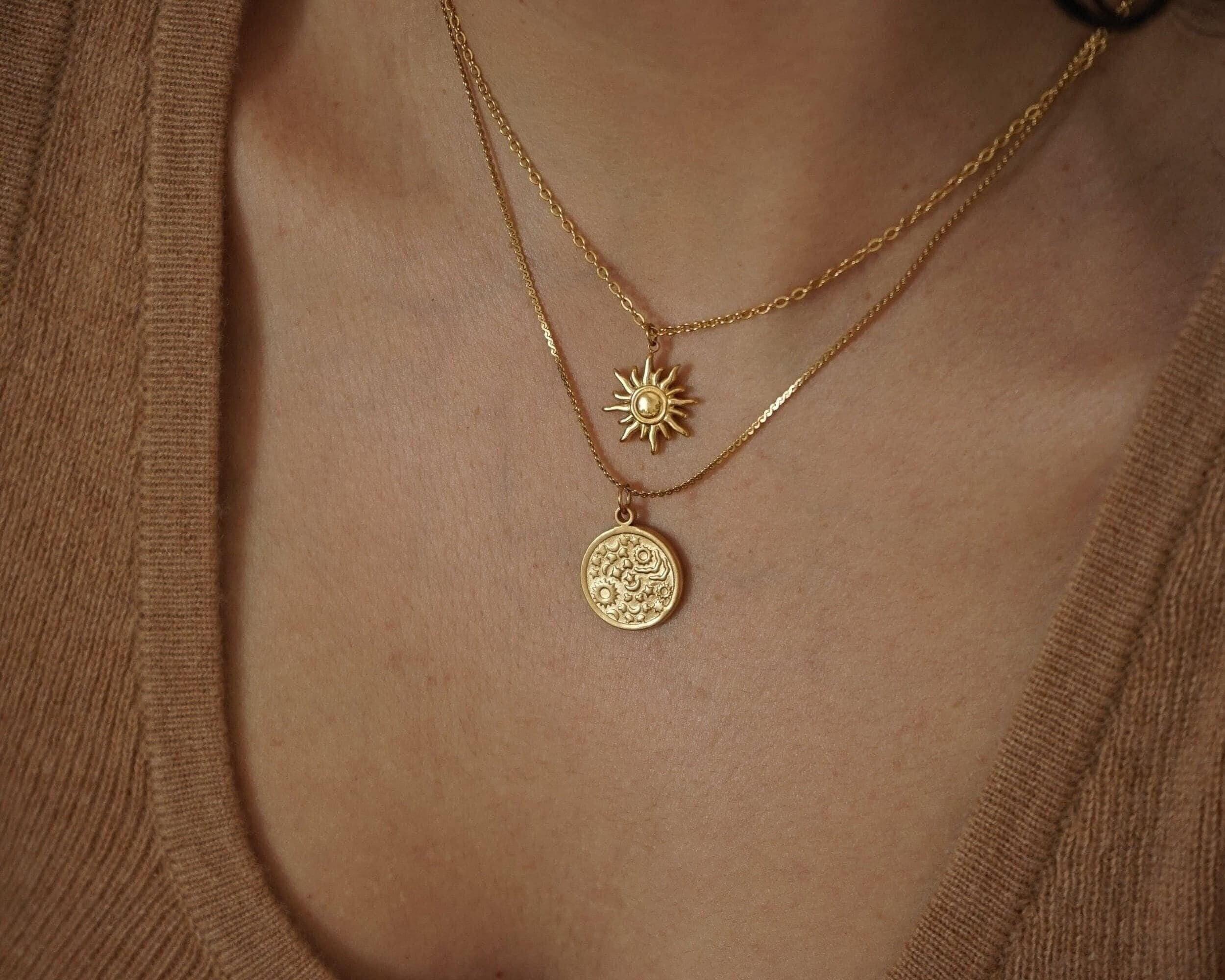 It's a unique gold stainless steel engraved SKY round pendant, with or without crystals. These materials remain beautiful and do not wear off. They are tarnish-free and waterproof. The biggest trend in the fashion world right now dictates multi-layer necklaces. Chains and links of all sizes are a big trend on the runway and on the street for this season. Styling that mingles thick and thin chains and beads creates a refined modern look. Invest in a statement piece that can take you through the seasons and complement every outfit.