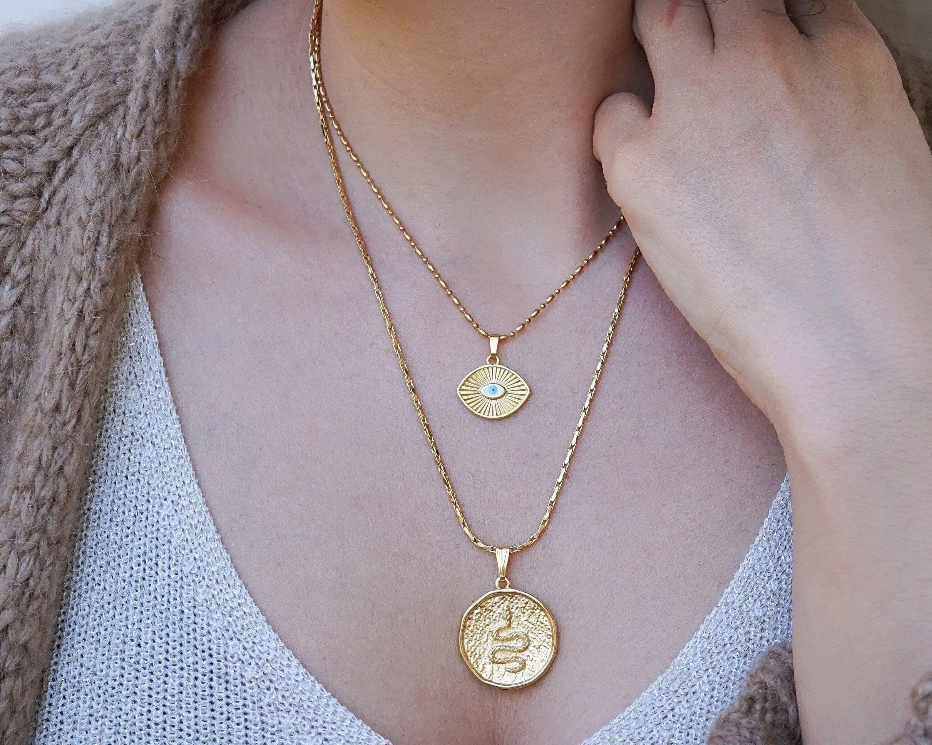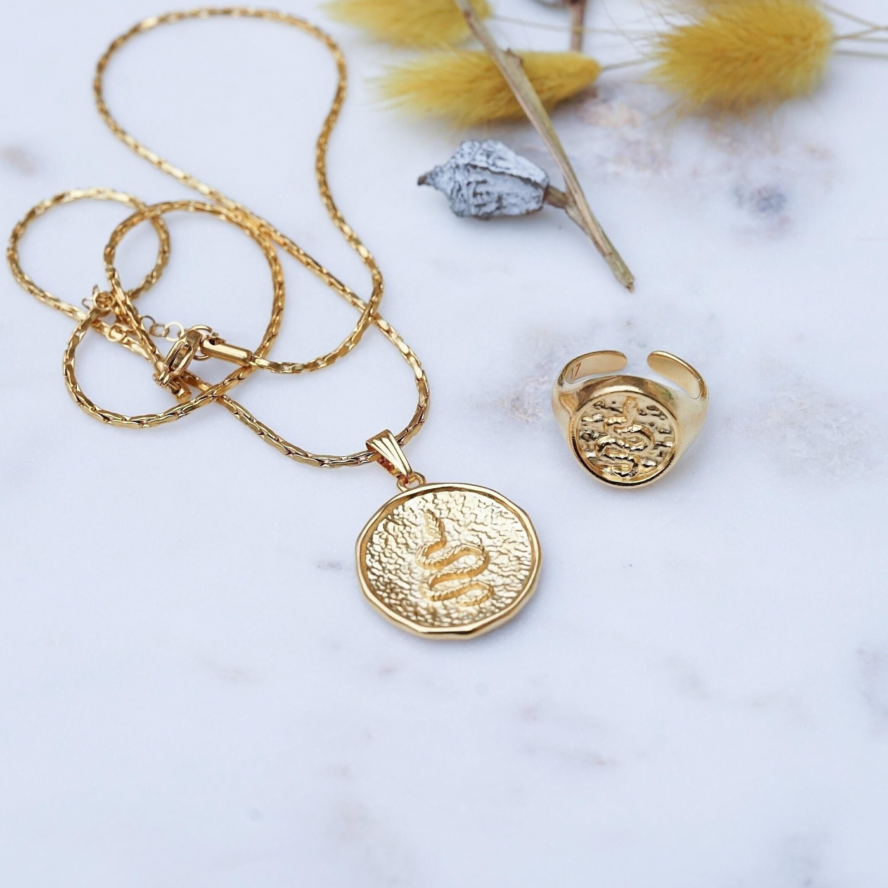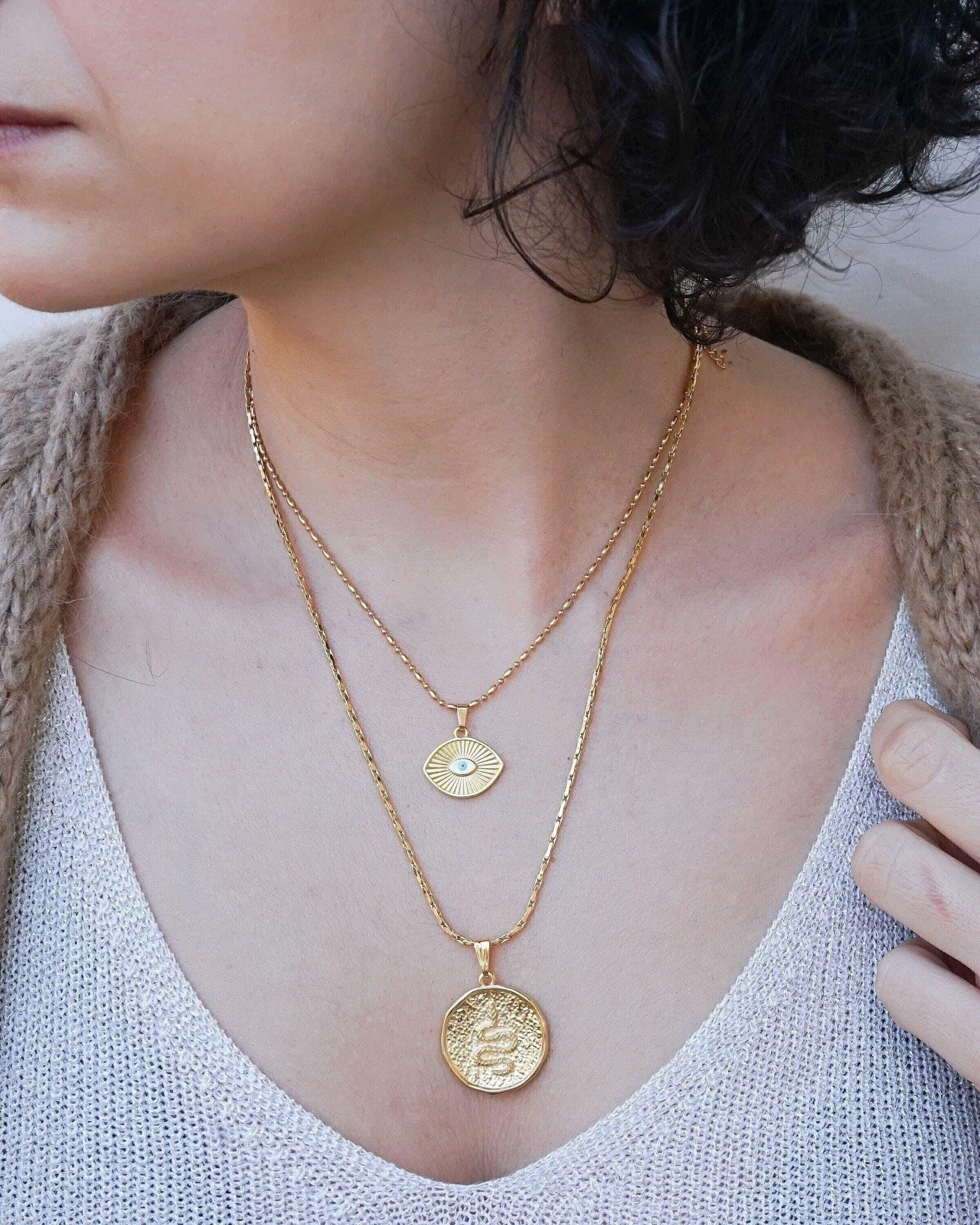 Discover the elegant snake pendant that has become a staple in boho fashion. This unique pendant features a 24K gold-plated zamak design of a snake in relief, gracefully paired with a durable Cobra stainless steel chain. Enhanced by its symbolic meanings, snakes represent rebirth, transformation, immortality, and healing concepts revered in Ancient Greece and Egypt. Notably, the Greek god Asclepius is often depicted wielding a serpent-entwined rod, adding to the allure of this piece.