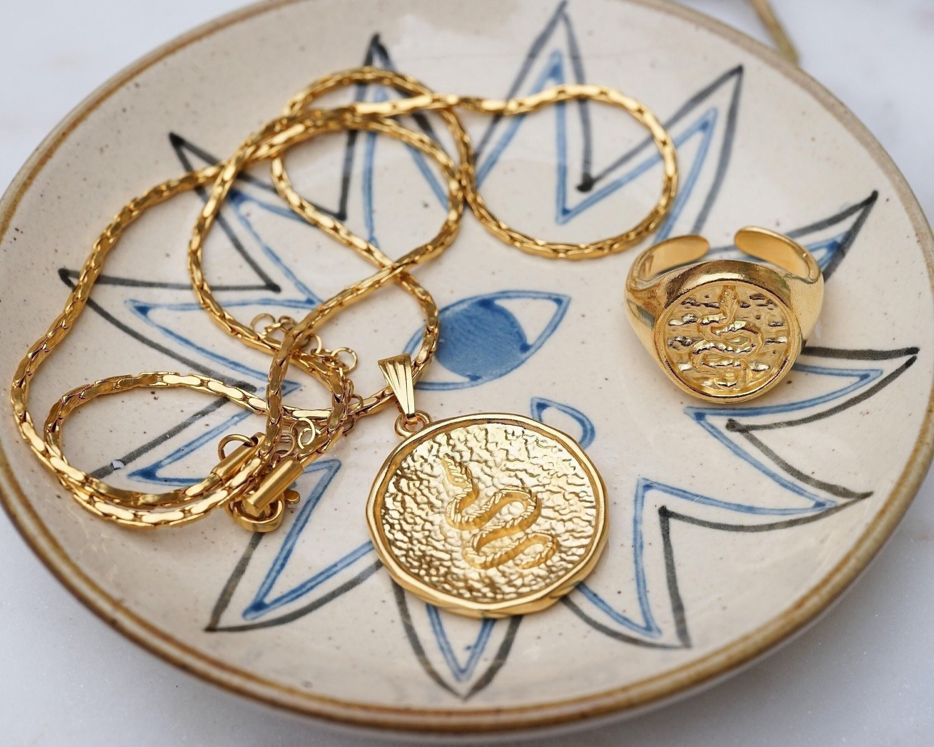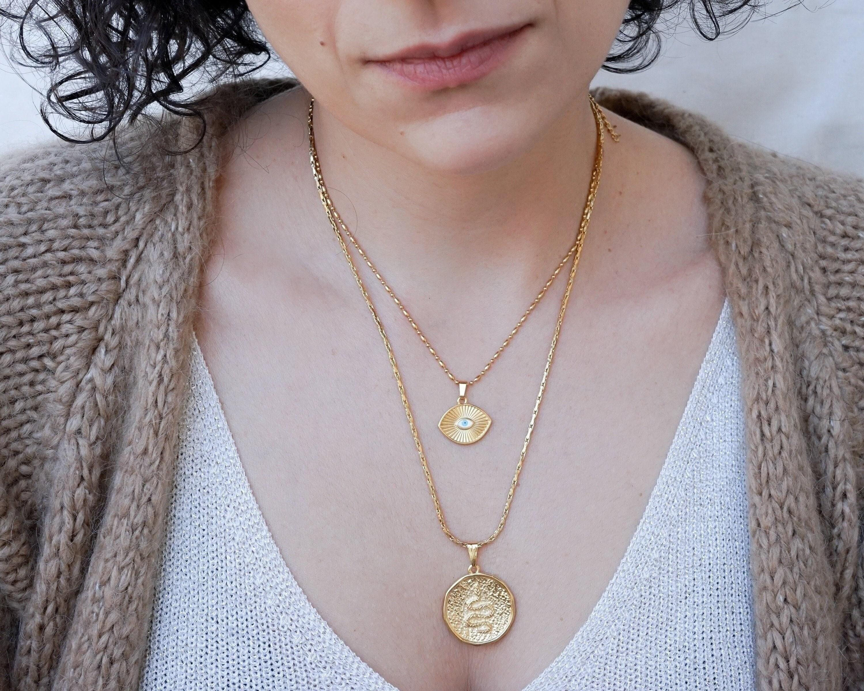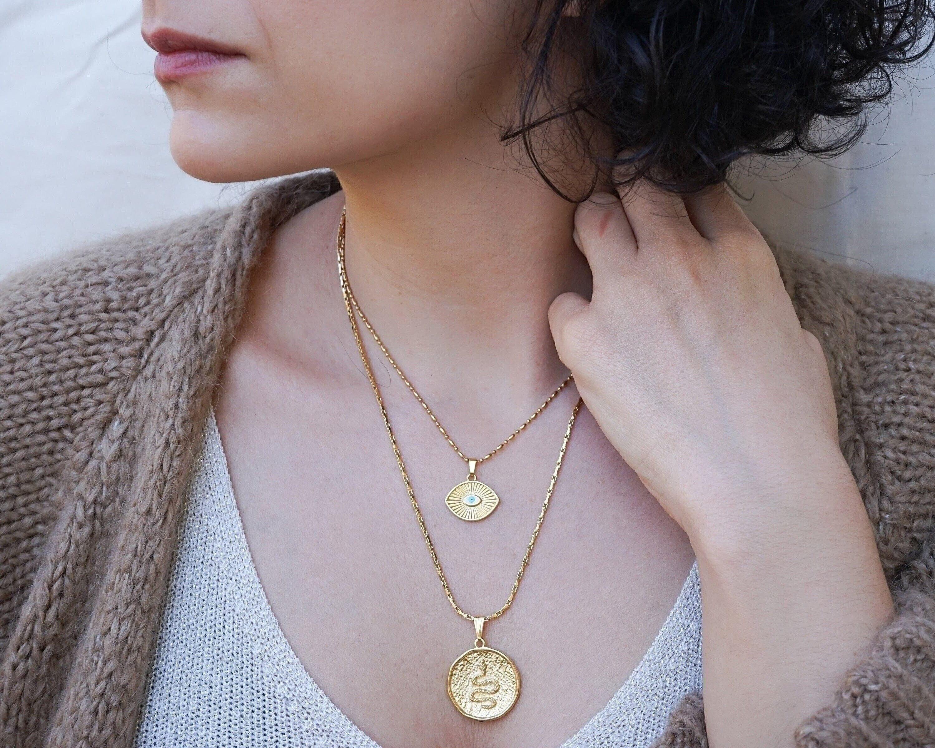 Discover the elegant snake pendant that has become a staple in boho fashion. This unique pendant features a 24K gold-plated zamak design of a snake in relief, gracefully paired with a durable Cobra stainless steel chain. Enhanced by its symbolic meanings, snakes represent rebirth, transformation, immortality, and healing concepts revered in Ancient Greece and Egypt. Notably, the Greek god Asclepius is often depicted wielding a serpent-entwined rod, adding to the allure of this piece.