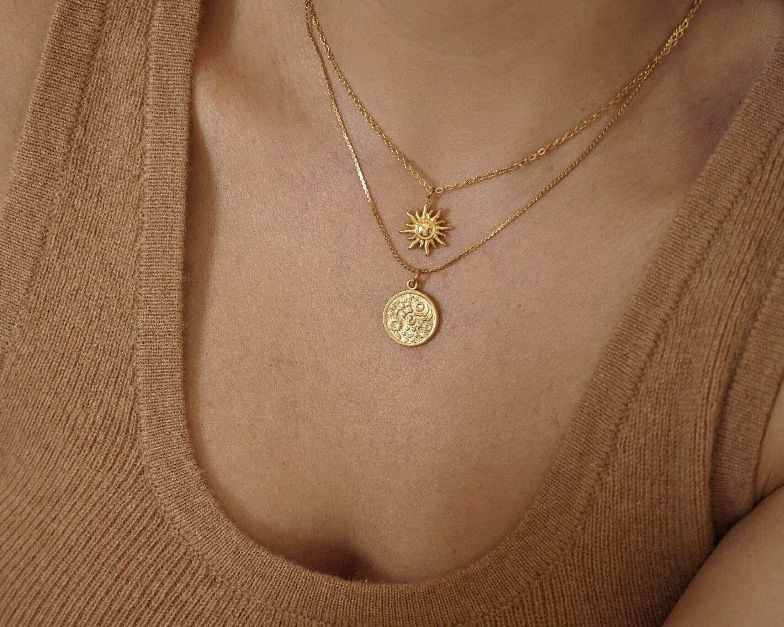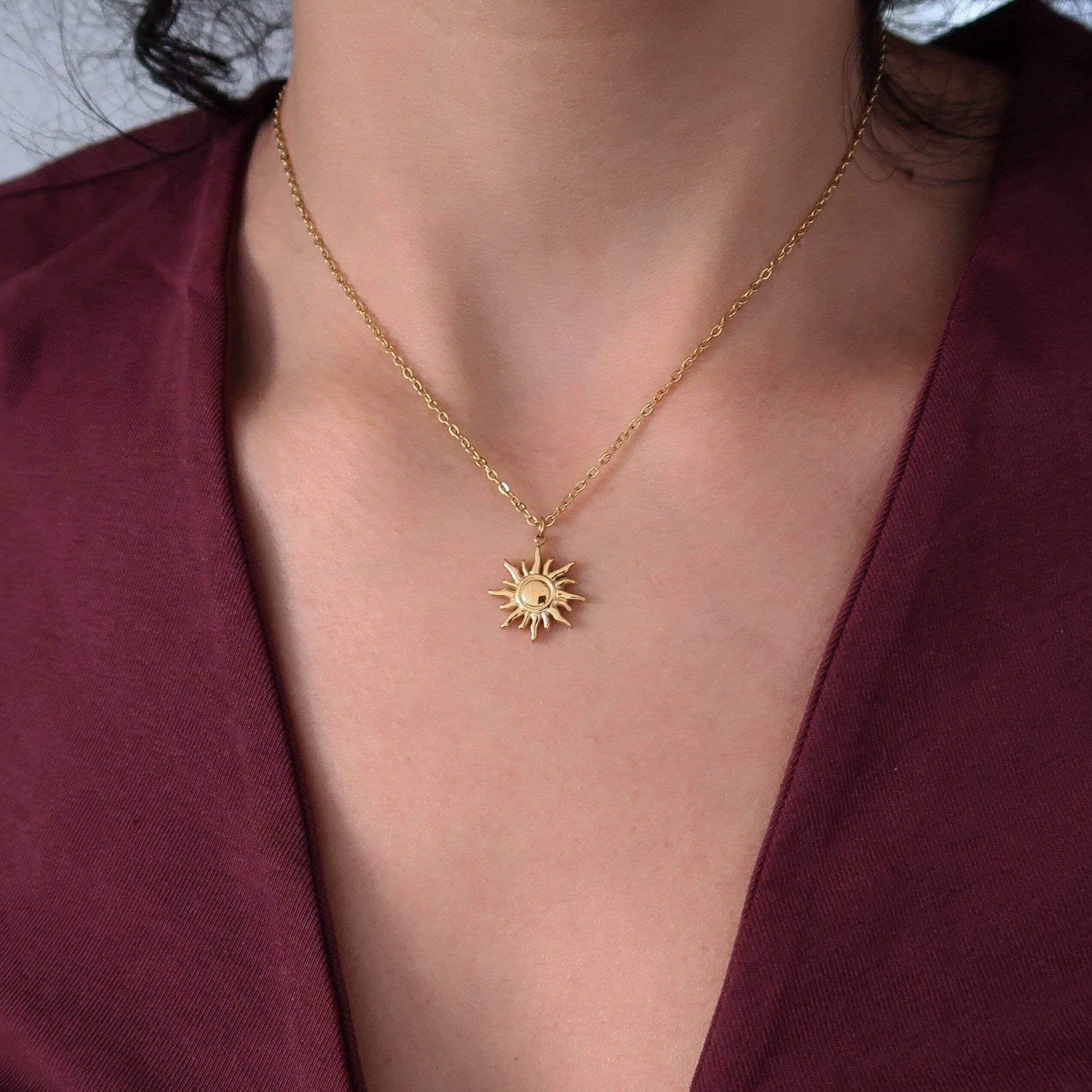 Discover a striking gold-coloured stainless steel sun pendant elegantly suspended from a durable stainless steel chain. Crafted from quality materials, this necklace is designed to maintain its beauty and resist wear, proving both tarnish-free and waterproof for everyday wear.