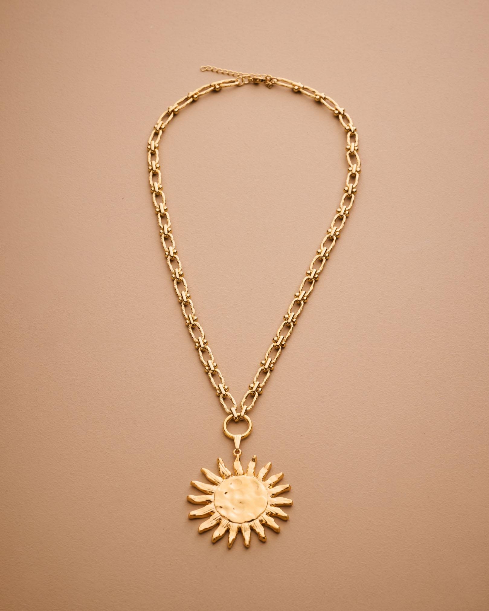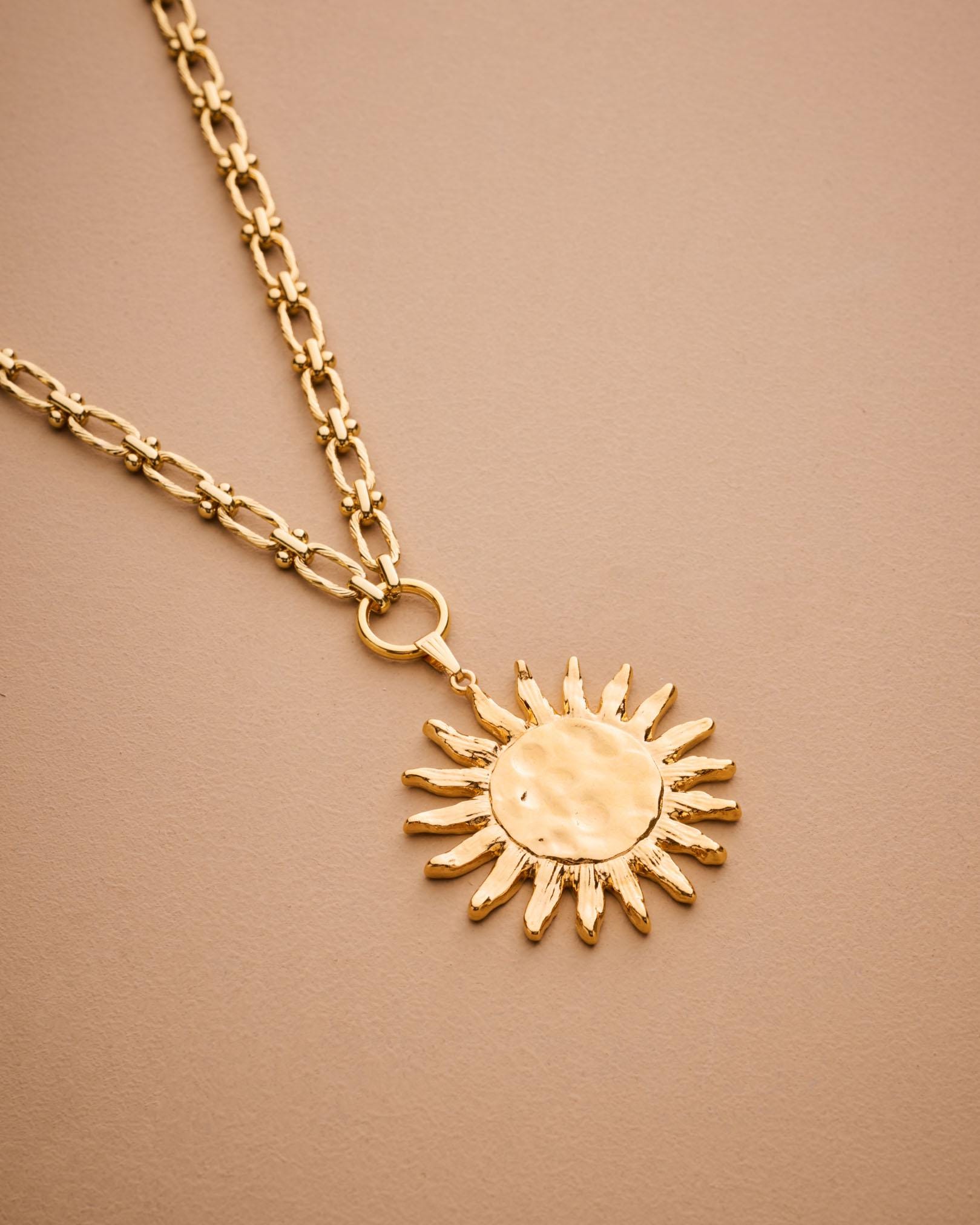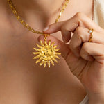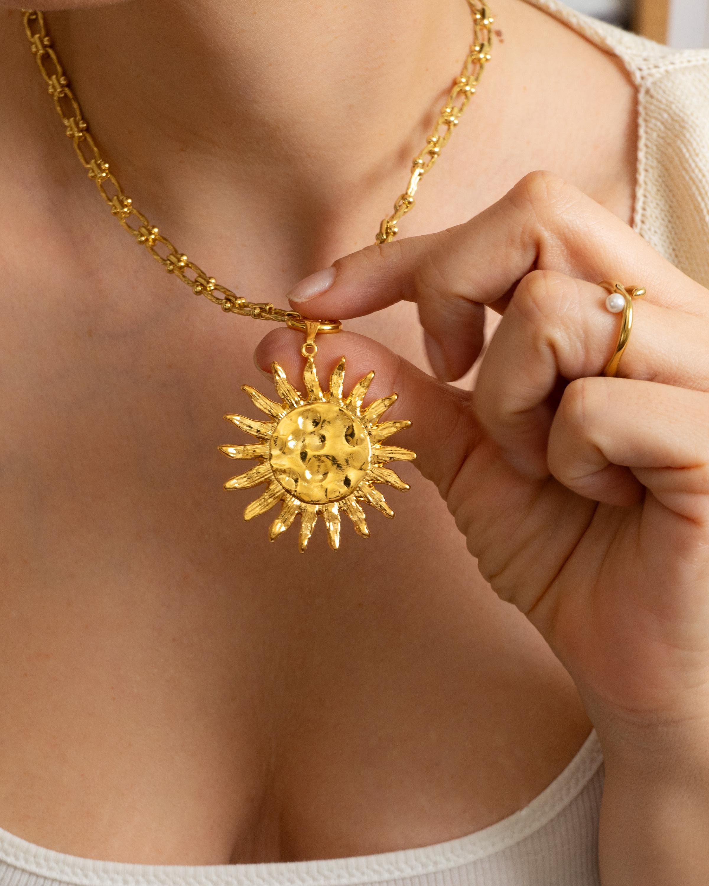 Shine brighter than ever with our Gold Sun Necklace, a bold statement piece that captures the power and warmth of the sun. Featuring a large, hammered sunburst pendant, this necklace is designed to radiate confidence, joy, and individuality.