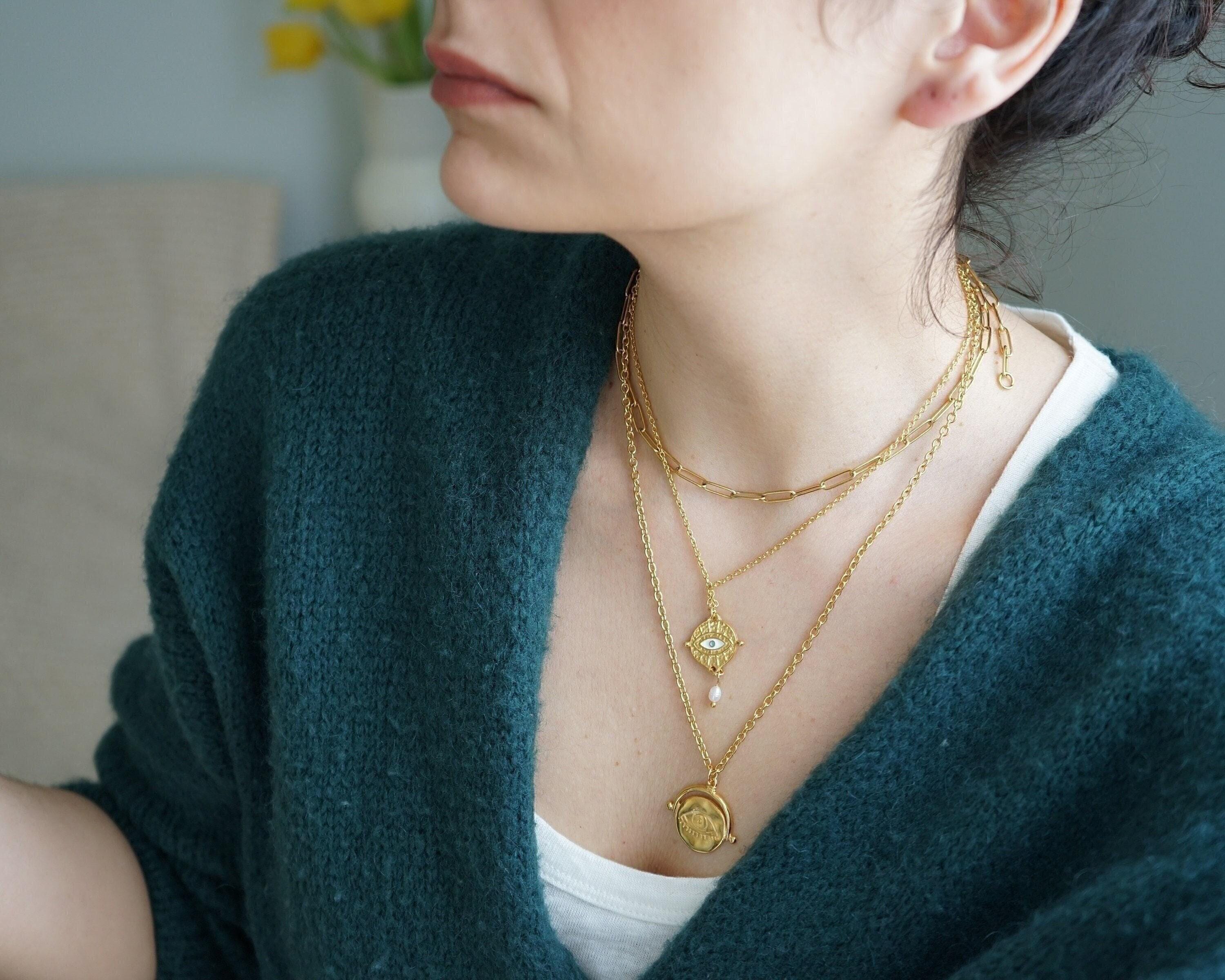 A unique vintage, ancient design enamel Evil Eye necklace in a stainless steel chain. A beautiful, meaningful necklace that you can wear everyday or save for a special occasion. This necklace looks great on its own or your can layer it with your favourite necklaces.It’s special and perfect for a fresh and modern look. These materials remain beautiful and do not wear off.