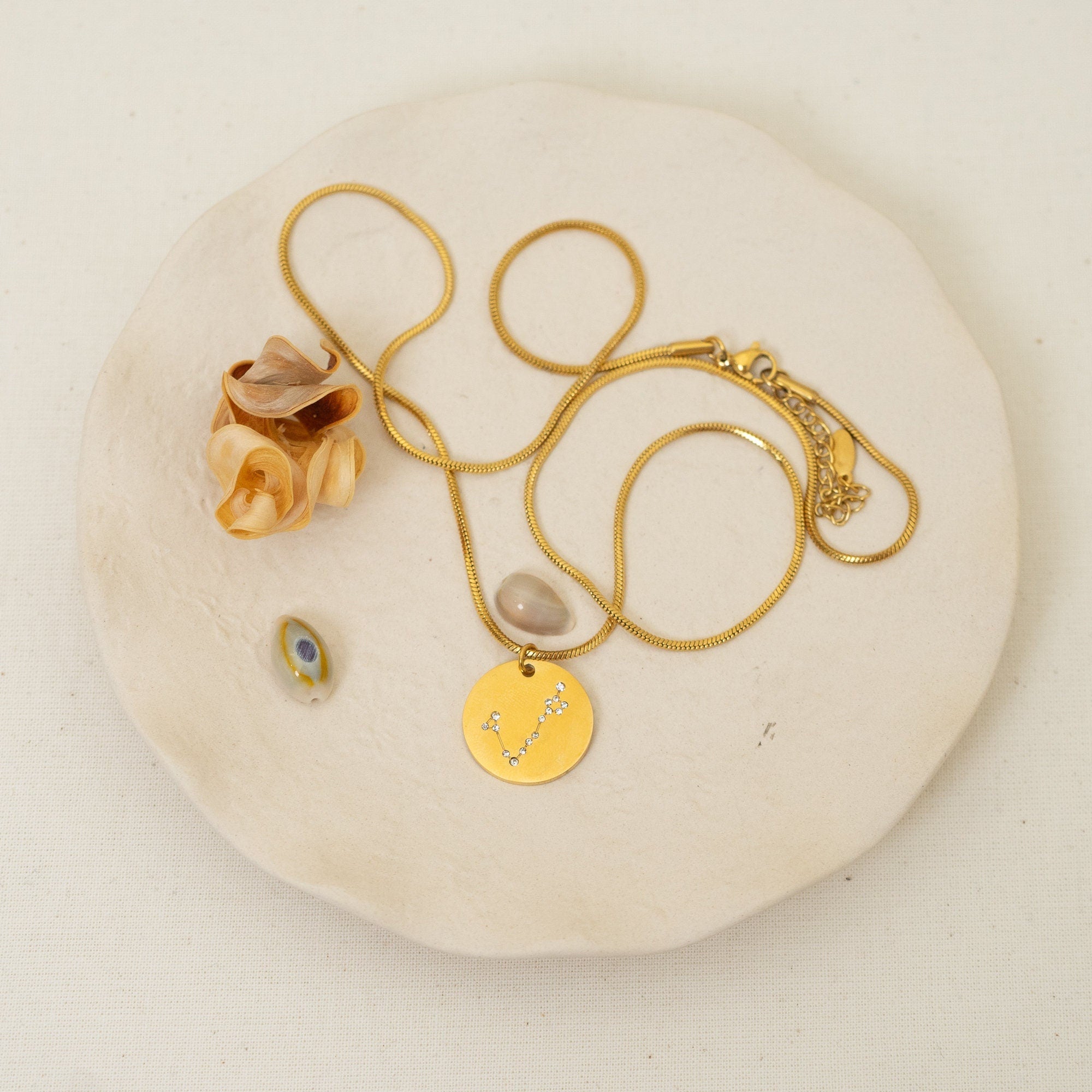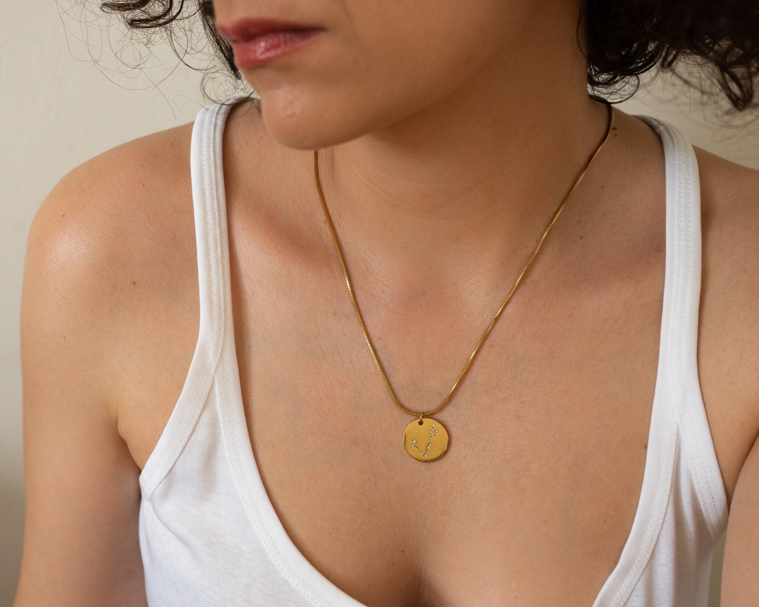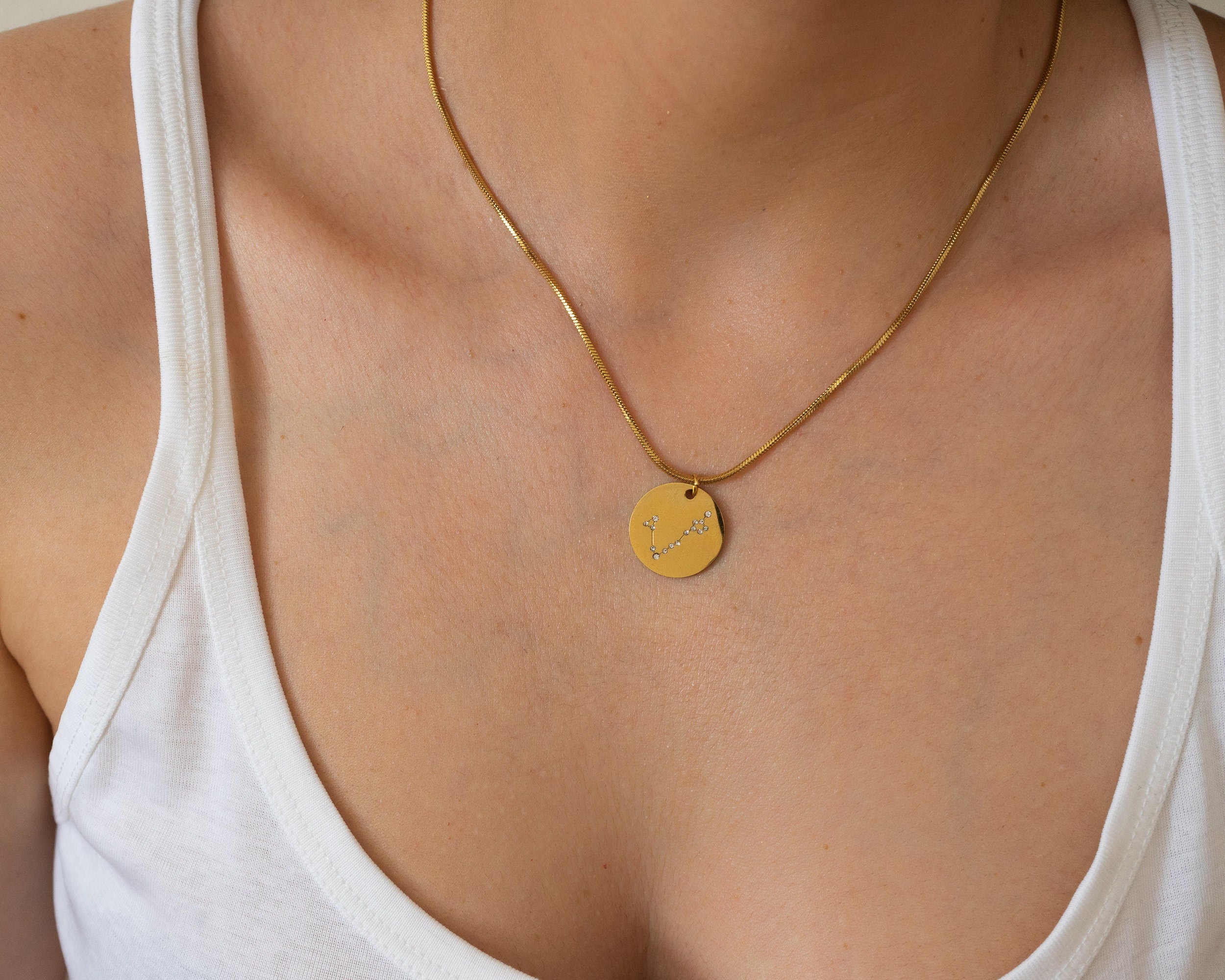 Discover a distinct necklace featuring a captivating pendant adorned with rhinestones that elegantly represents your zodiac constellation. The pendant hangs gracefully from a durable stainless steel snake chain, available in two versatile lengths for your preference. Crafted from high-quality materials, this piece is designed to maintain its beauty over time without fading.