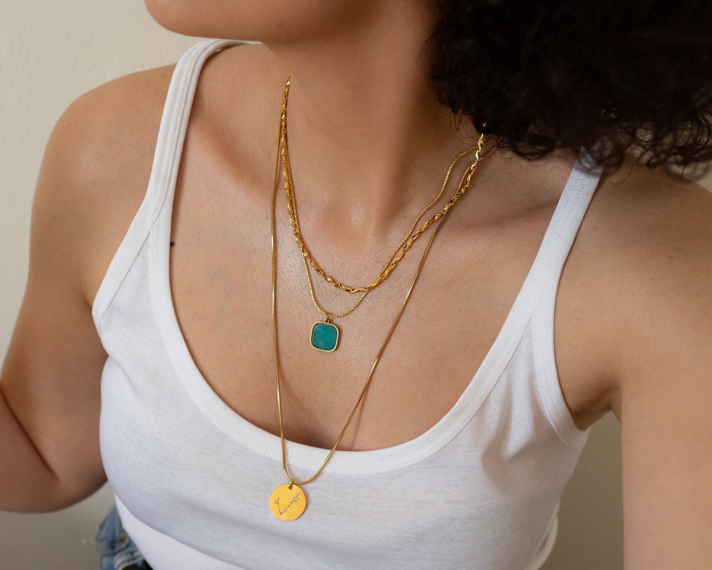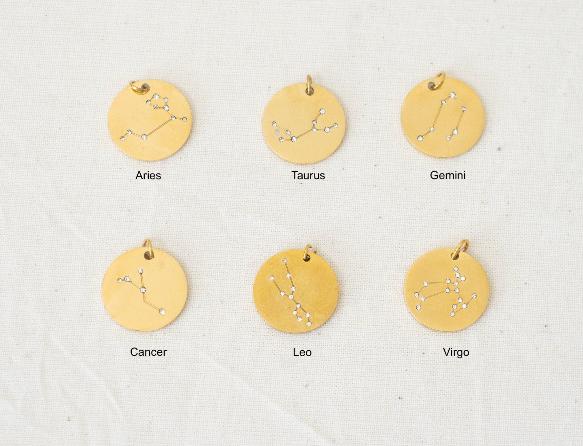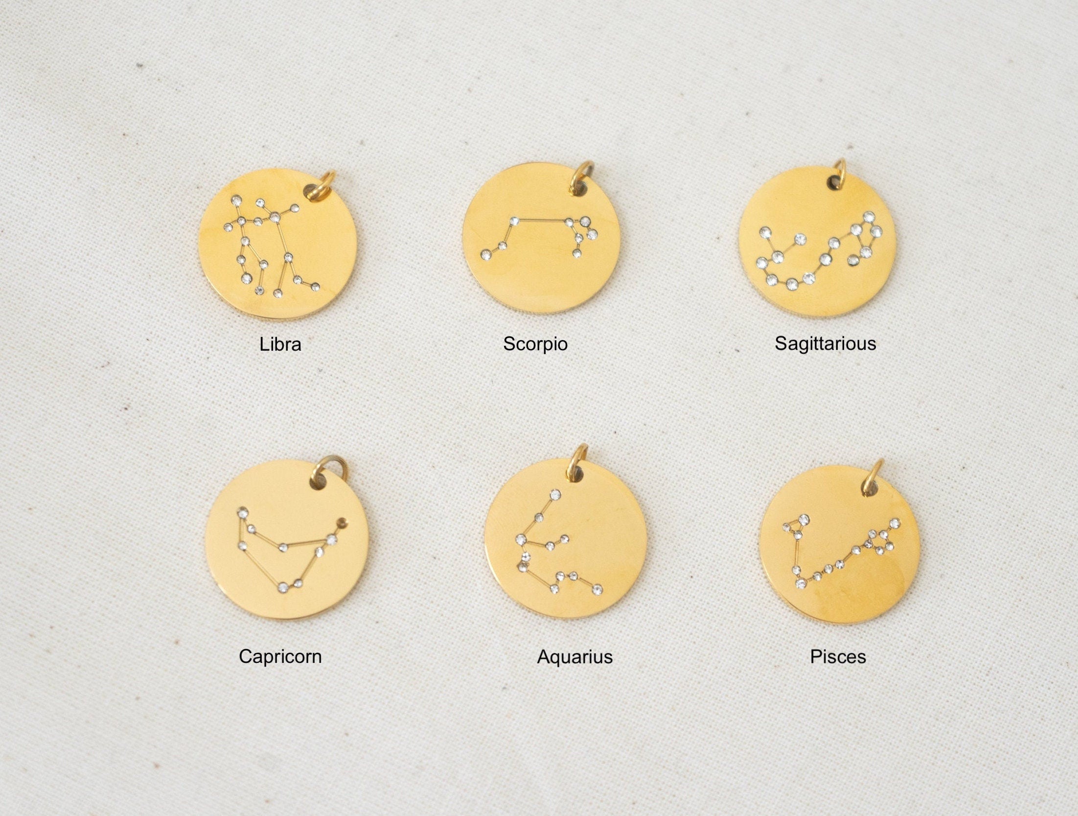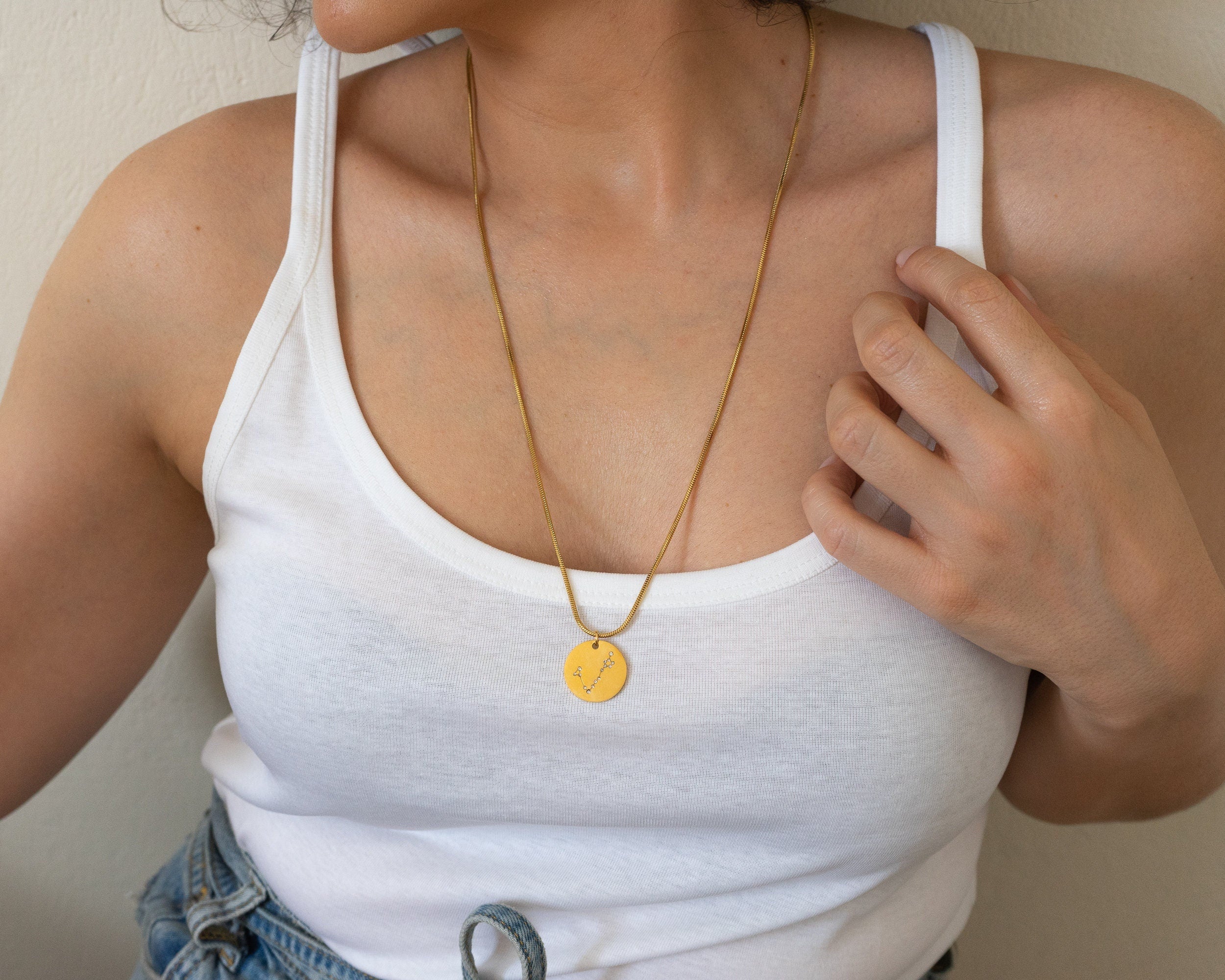Discover a distinct necklace featuring a captivating pendant adorned with rhinestones that elegantly represents your zodiac constellation. The pendant hangs gracefully from a durable stainless steel snake chain, available in two versatile lengths for your preference. Crafted from high-quality materials, this piece is designed to maintain its beauty over time without fading.
