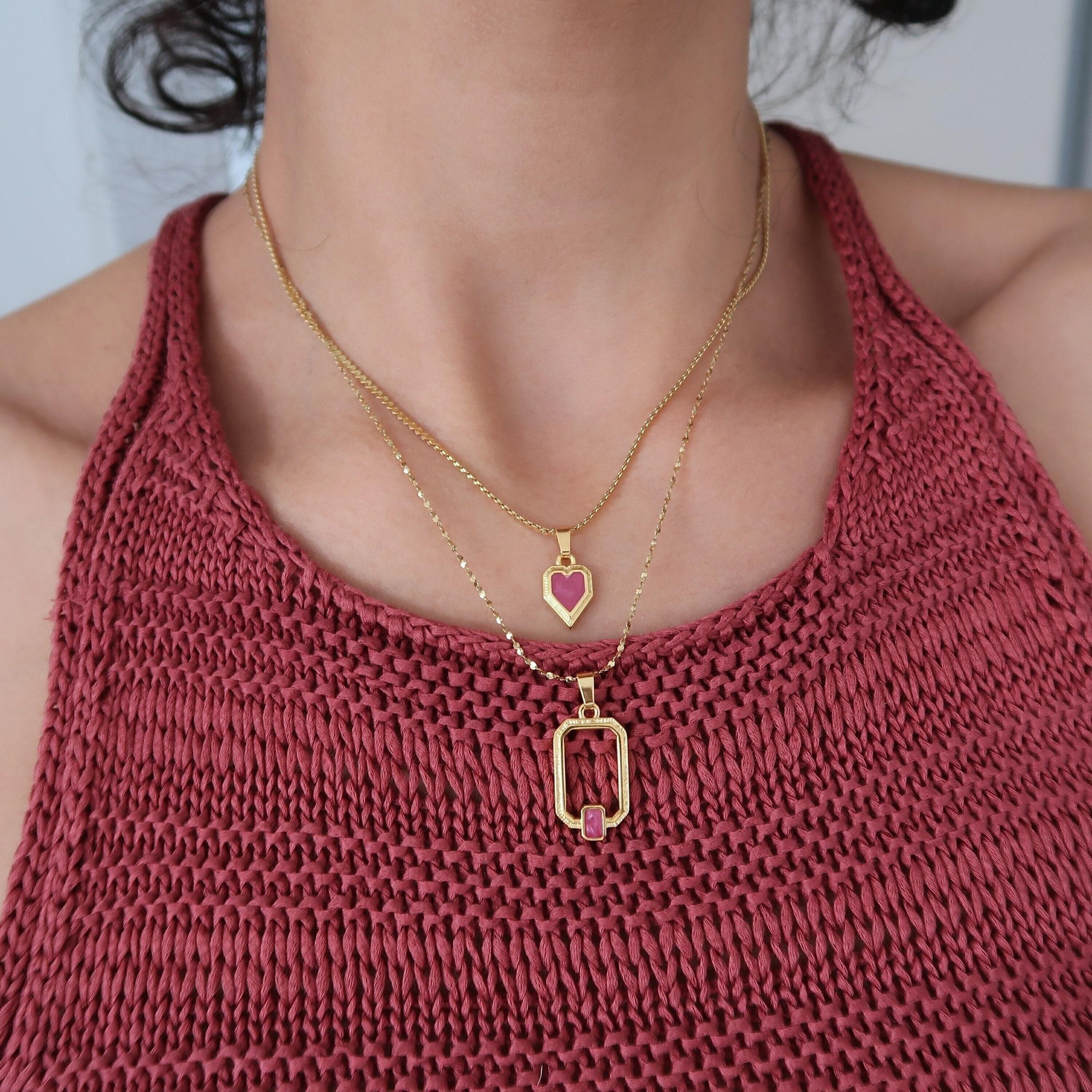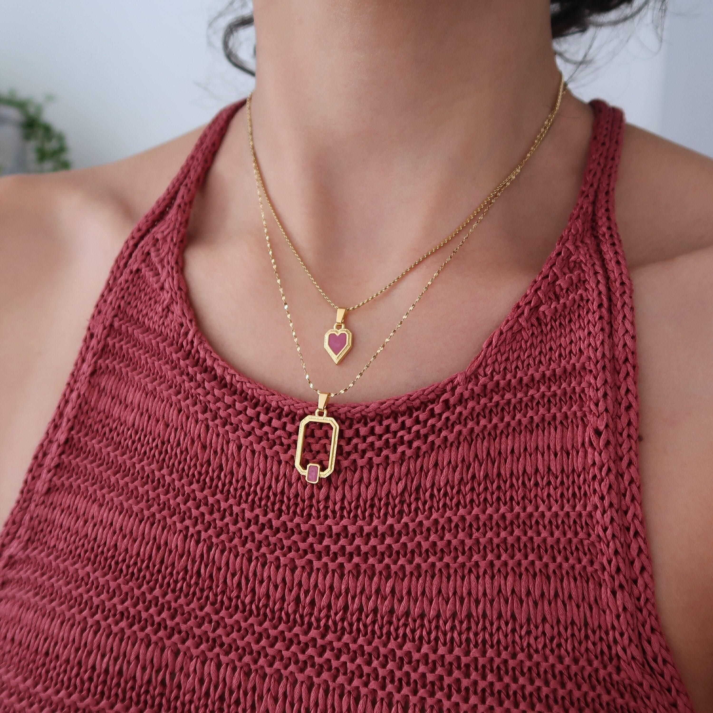 Discover a charming set of two gold enamel necklaces that effortlessly elevate your style. One necklace features a sleek rectangle pendant, while the other showcases a delicate tiny heart charm, creating a unique, layered look that is both fresh and modern. Each piece is designed with its own closure, allowing you to mix and match with your favorite necklaces for a personalized touch. Crafted from high-quality materials, these necklaces maintain their beauty and luster over time.