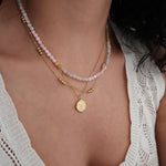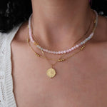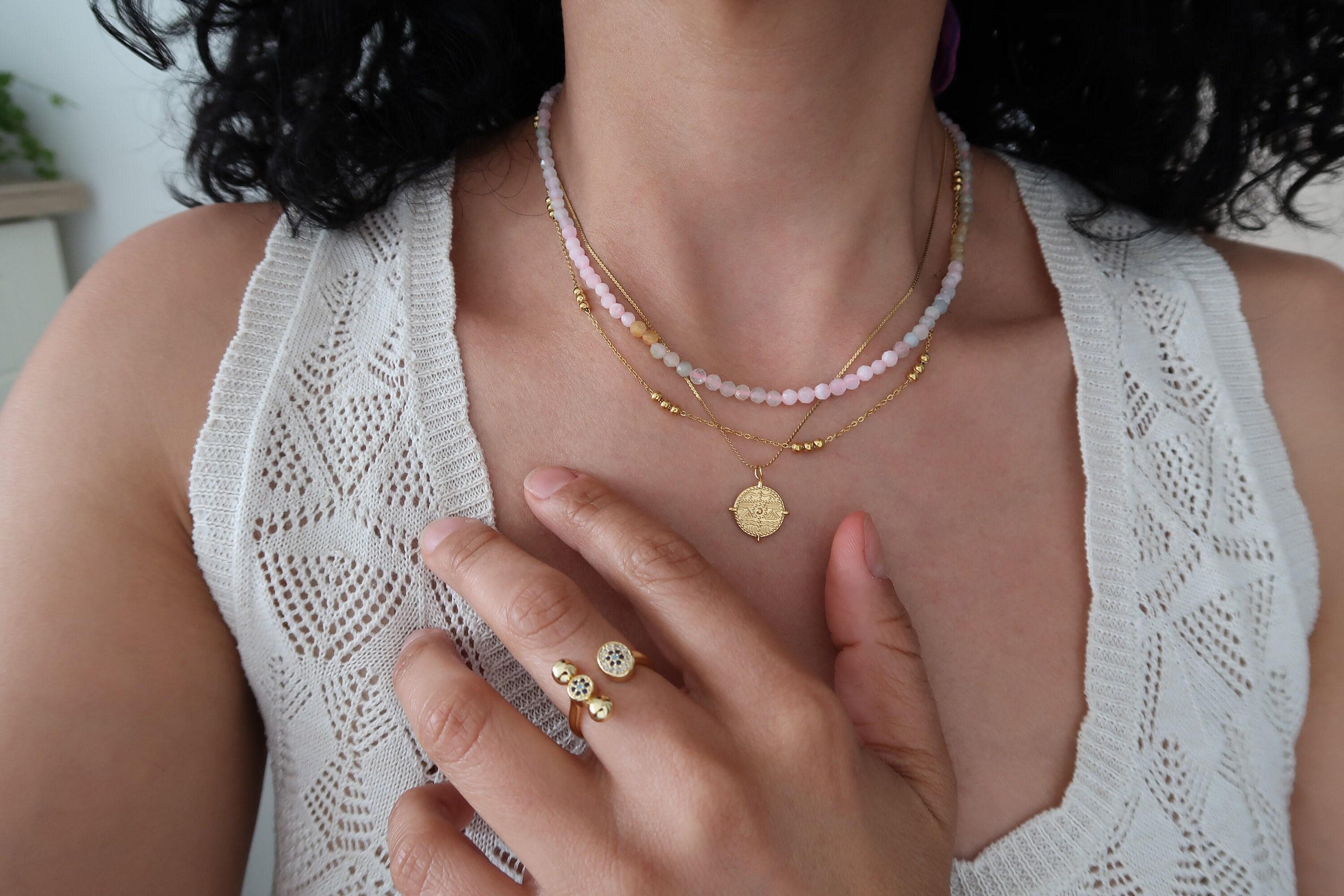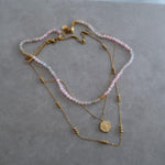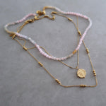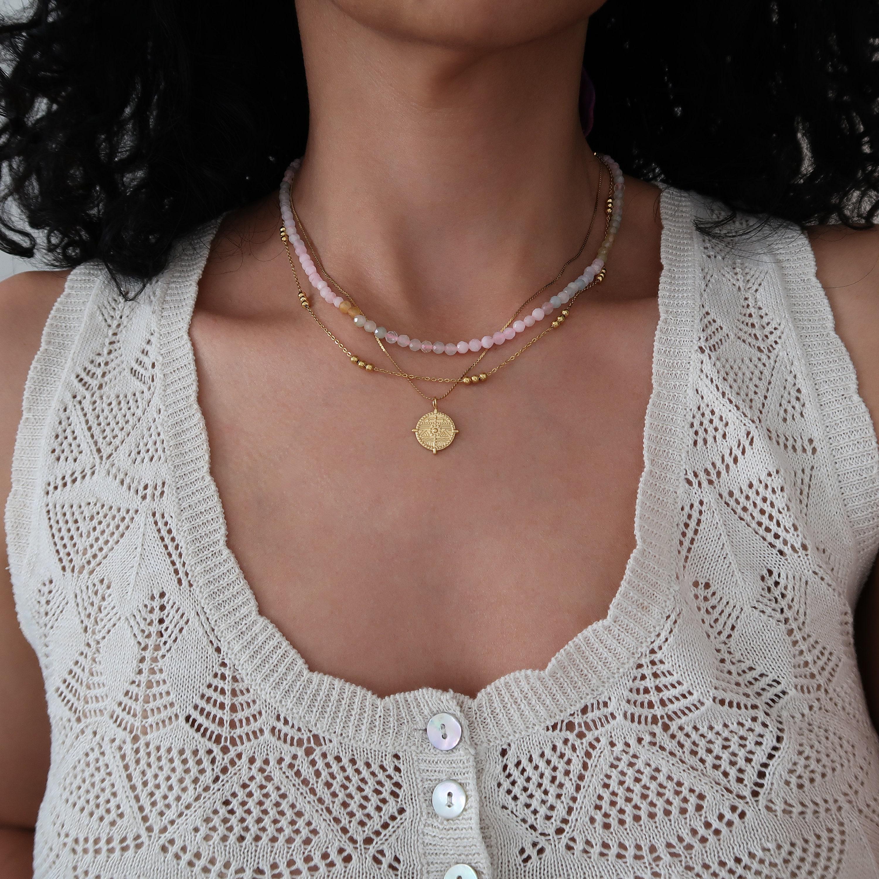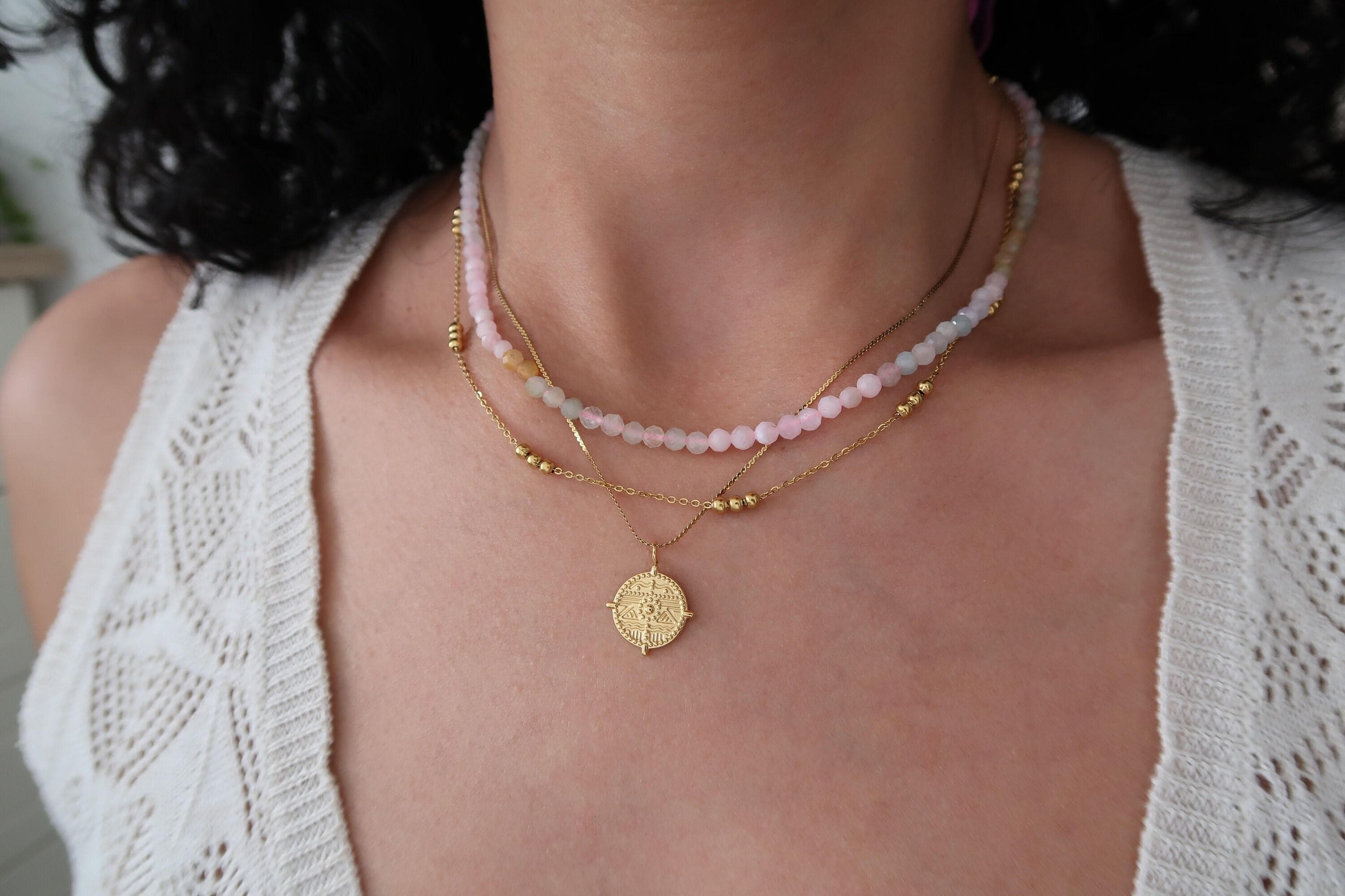 Discover a distinctive collection of three stylish necklaces, featuring specialty chains and a unique cross coin design, along with delicately faceted morganite beads. This set embodies a fresh and modern aesthetic, making it the ideal accessory for various outfits. Each necklace is equipped with its own lobster clasp closure, allowing for effortless mixing and matching with pieces from your personal jewelry collection.