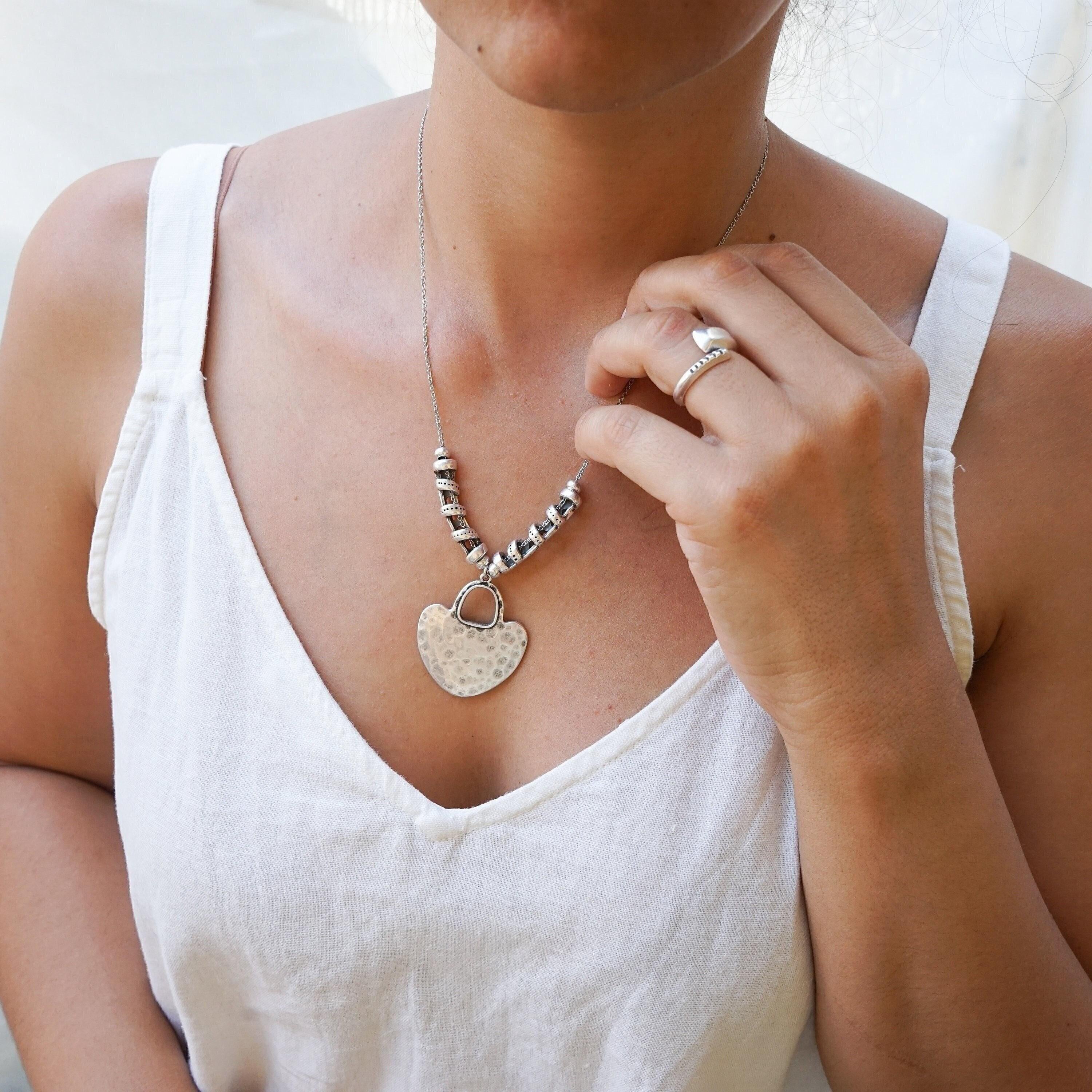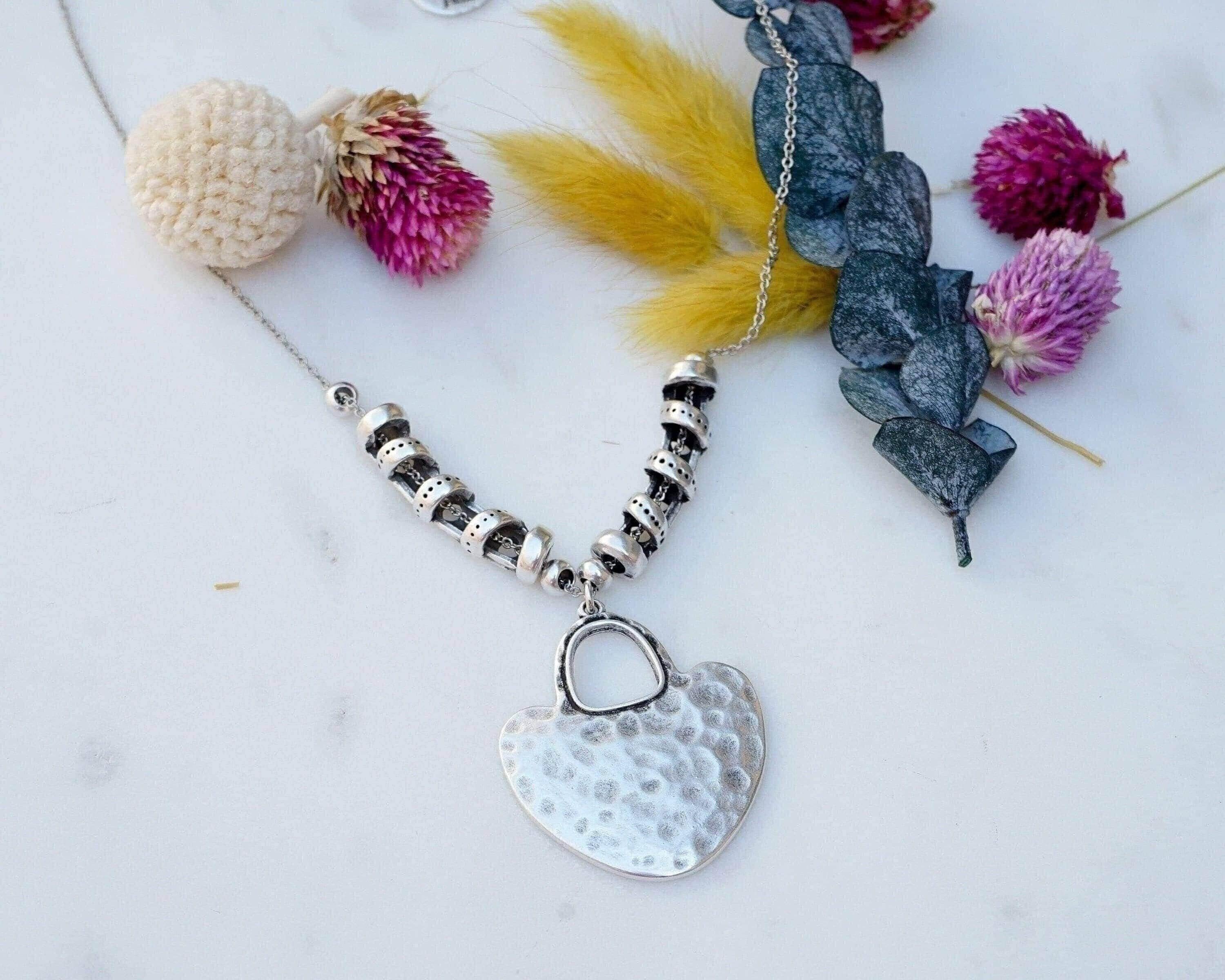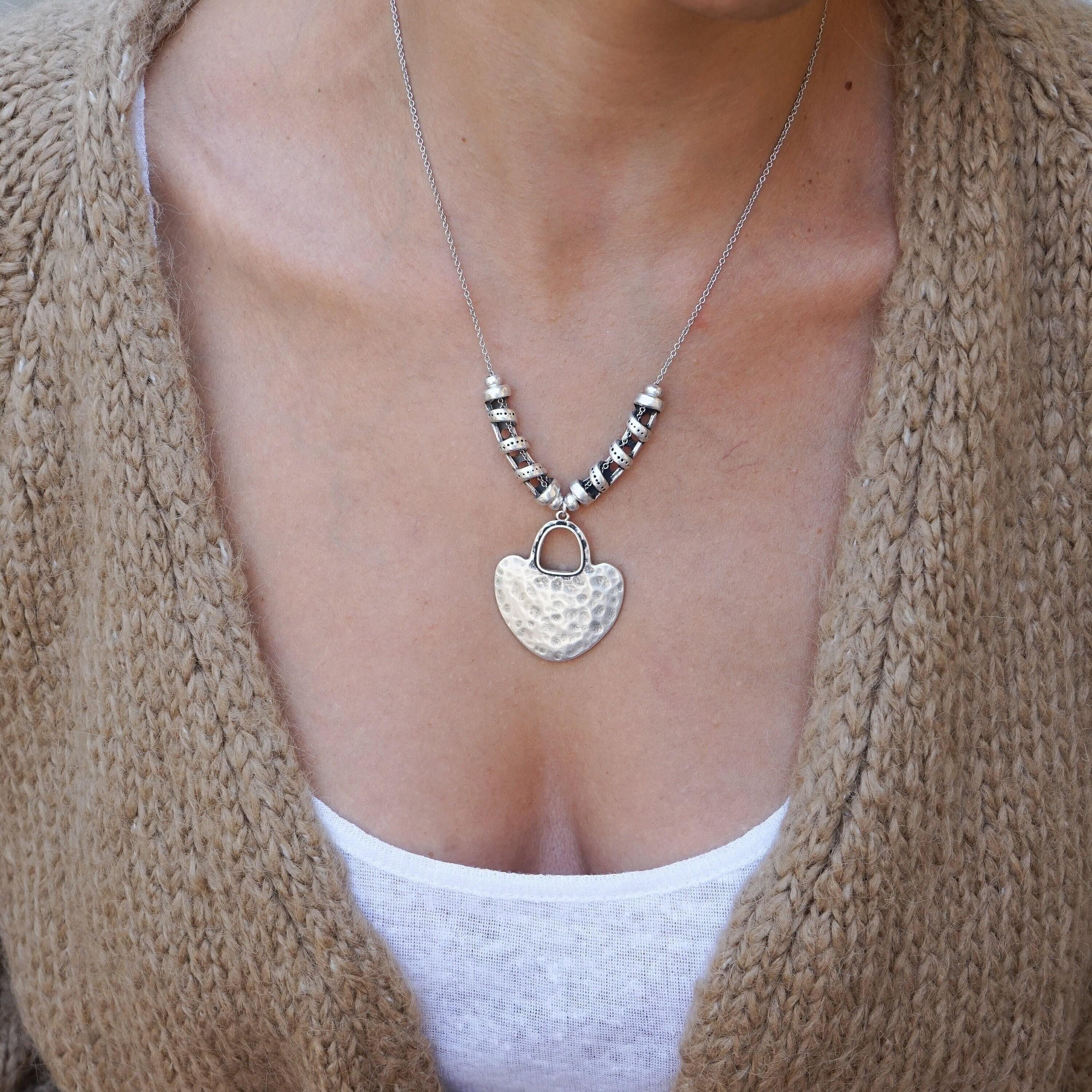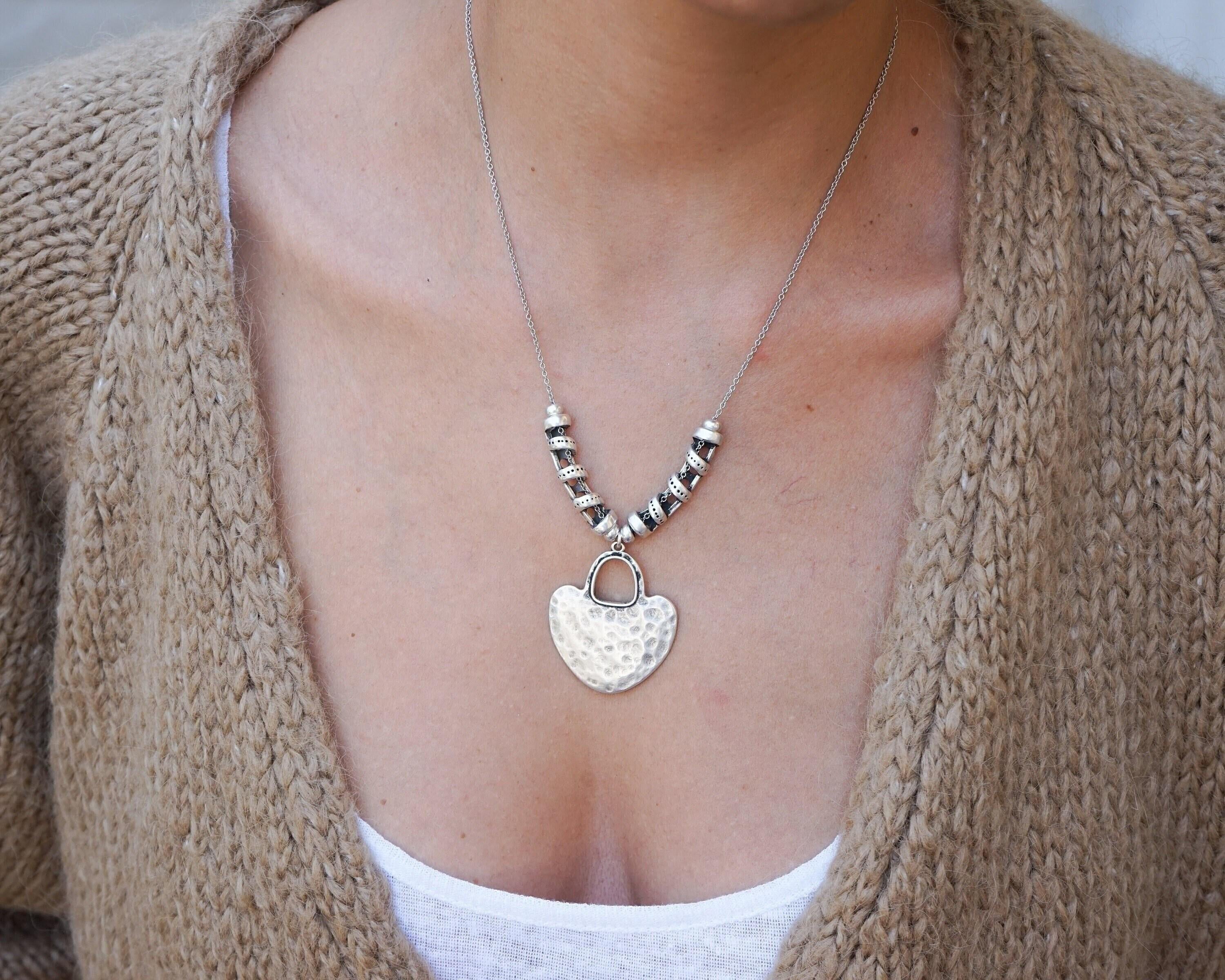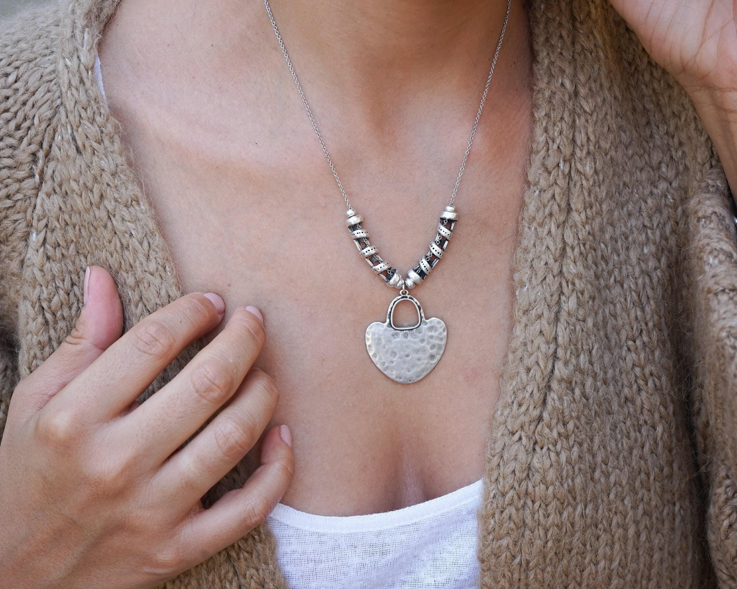 Ένα εντυπωσιακό κολιέ με ρετρό αισθητική, που συνδυάζει παραδοσιακά στοιχεία με σύγχρονο στυλ. Το επάργυρο ζάμακ μενταγιόν σε σχήμα ρόμβου έχει σφυρήλατη υφή και κρεμιέται από λεπτή αλυσίδα με περίτεχνους ασημένιους σωλήνες εκατέρωθεν. Ένα κομμάτι που ξεχωρίζει, ιδανικό για να συμπληρώσει τόσο καθημερινές όσο και πιο κομψές εμφανίσεις.