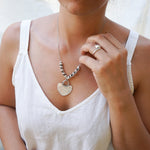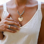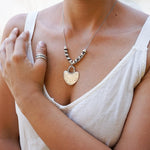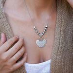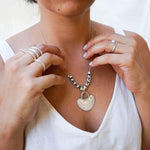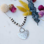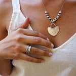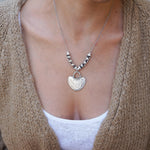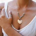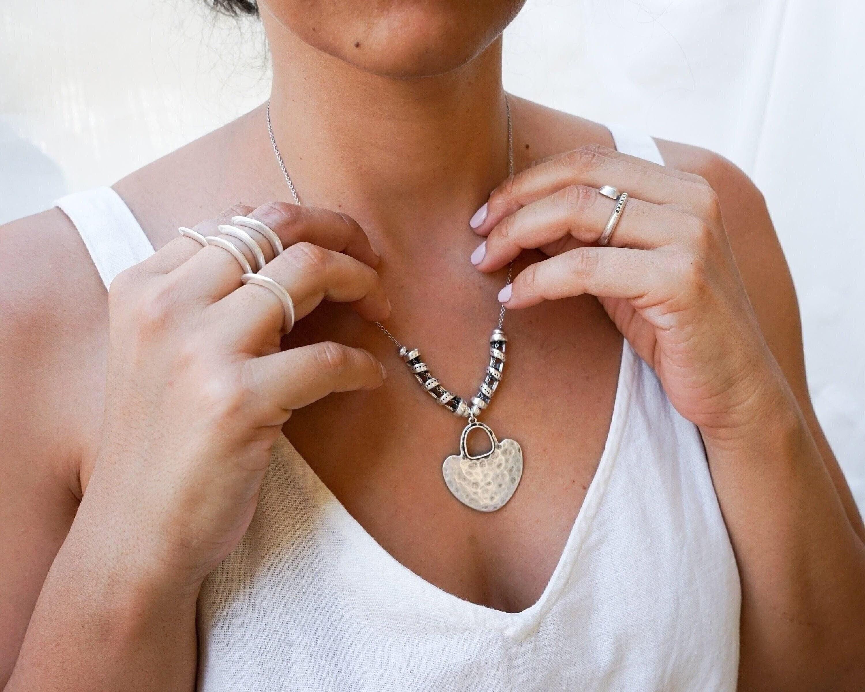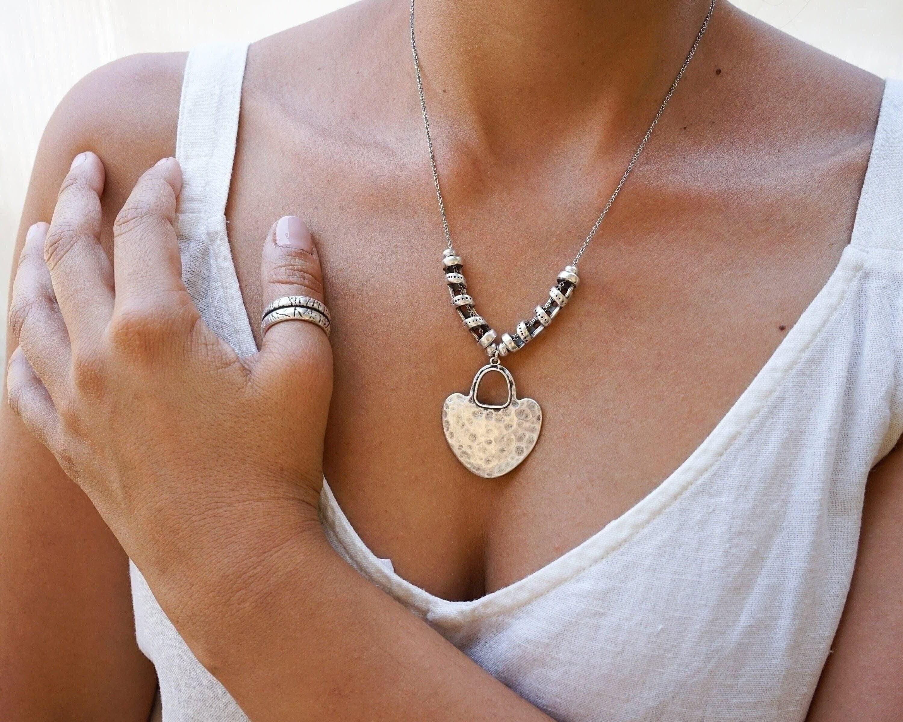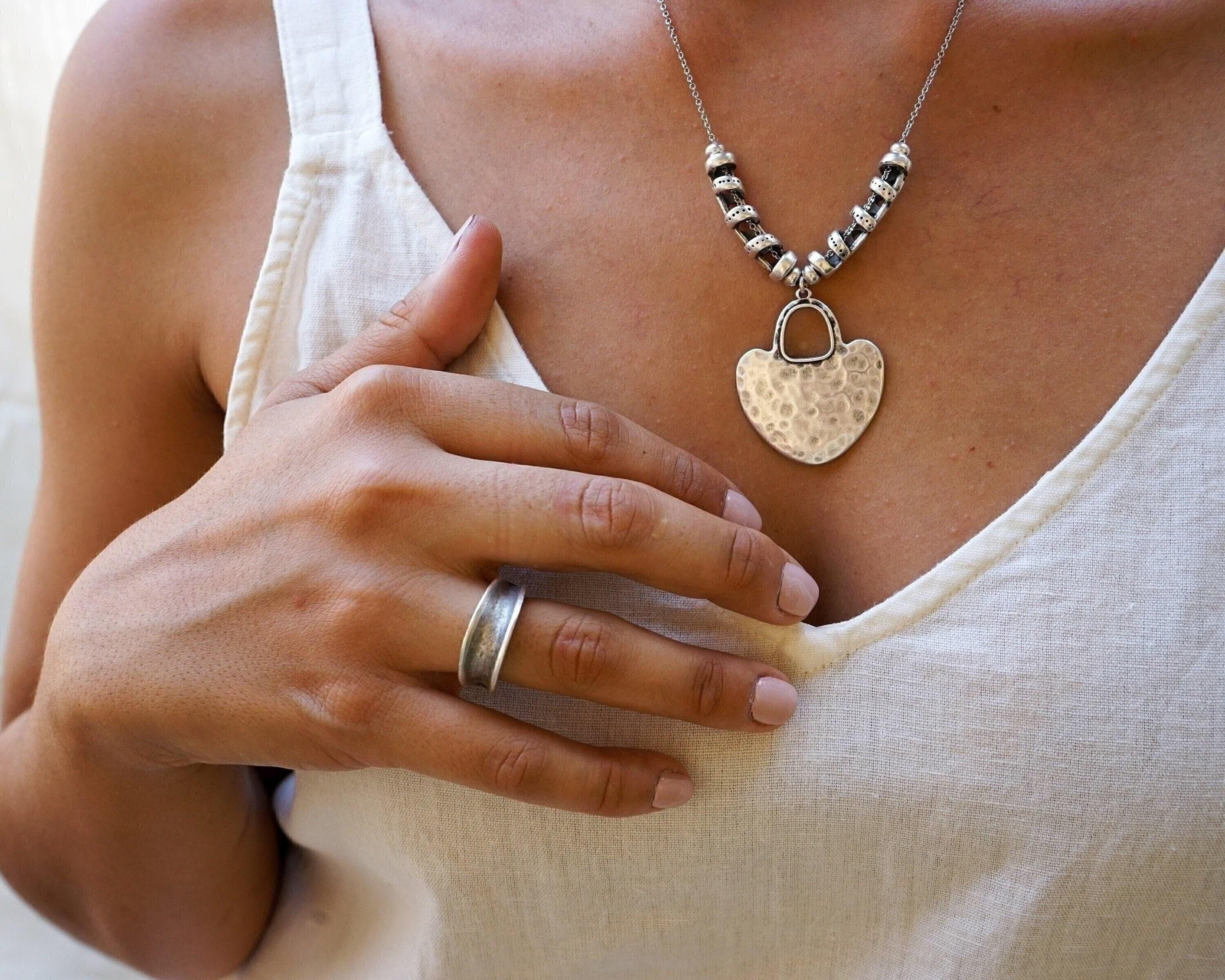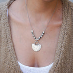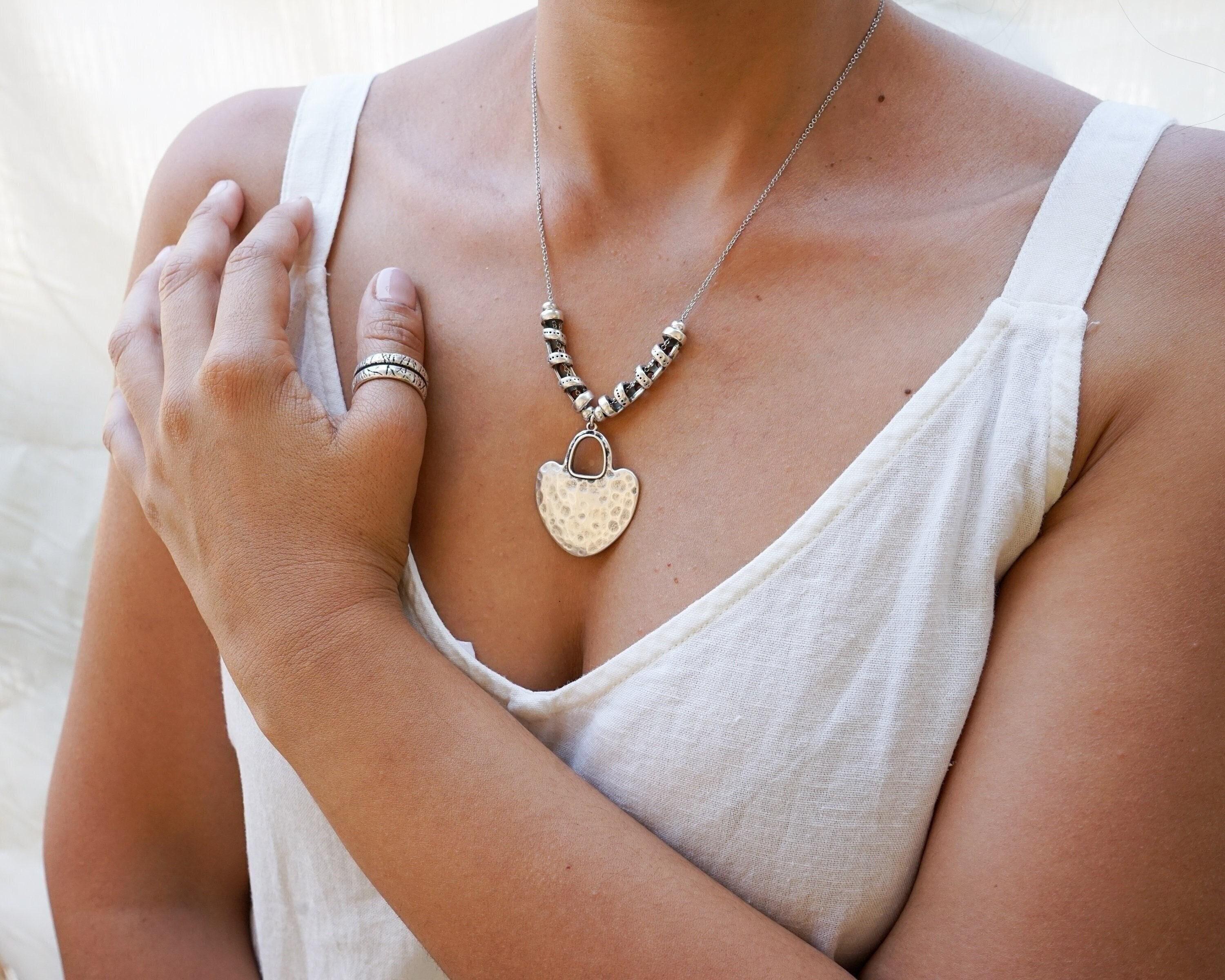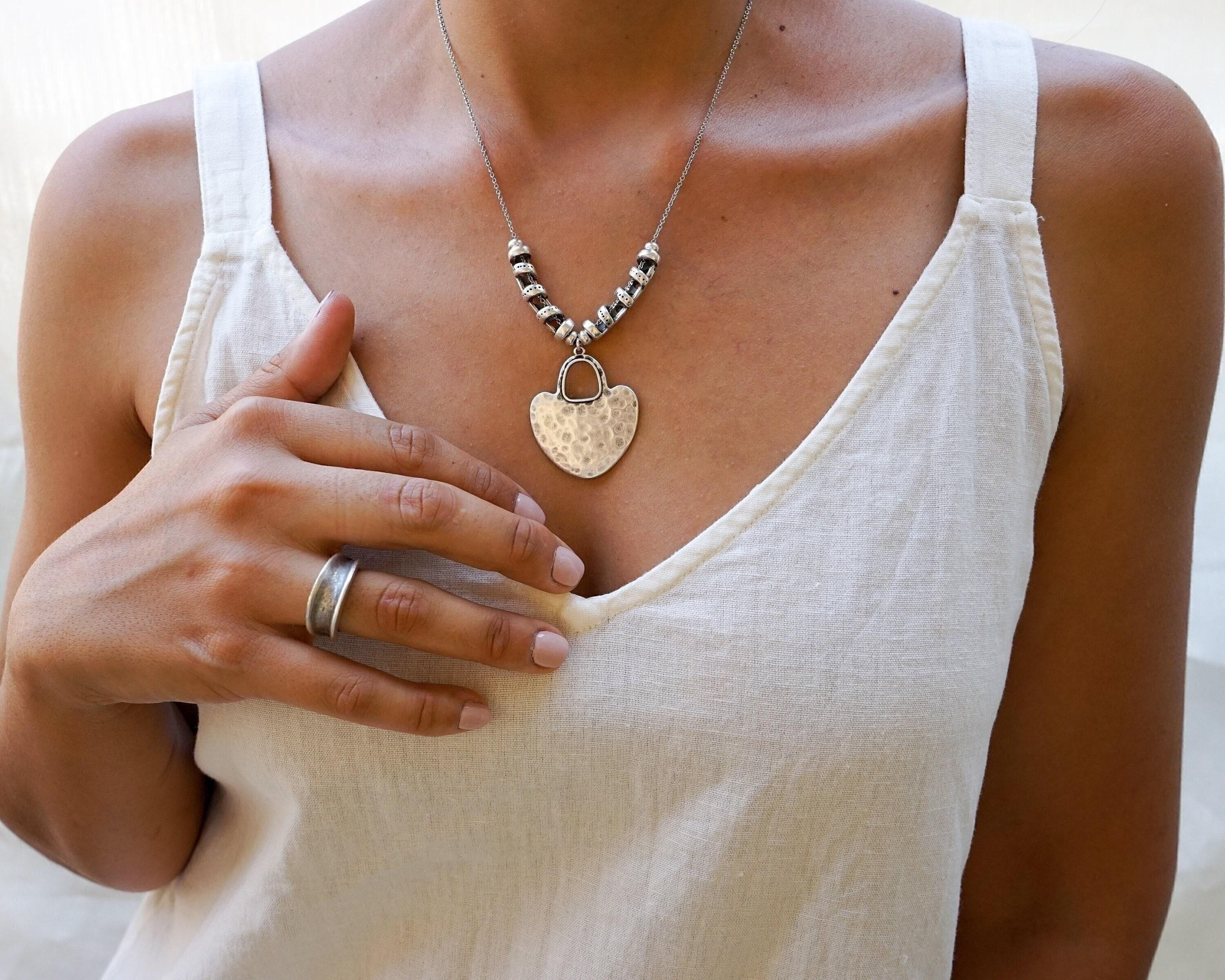 Ένα εντυπωσιακό κολιέ με ρετρό αισθητική, που συνδυάζει παραδοσιακά στοιχεία με σύγχρονο στυλ. Το επάργυρο ζάμακ μενταγιόν σε σχήμα ρόμβου έχει σφυρήλατη υφή και κρεμιέται από λεπτή αλυσίδα με περίτεχνους ασημένιους σωλήνες εκατέρωθεν. Ένα κομμάτι που ξεχωρίζει, ιδανικό για να συμπληρώσει τόσο καθημερινές όσο και πιο κομψές εμφανίσεις.
