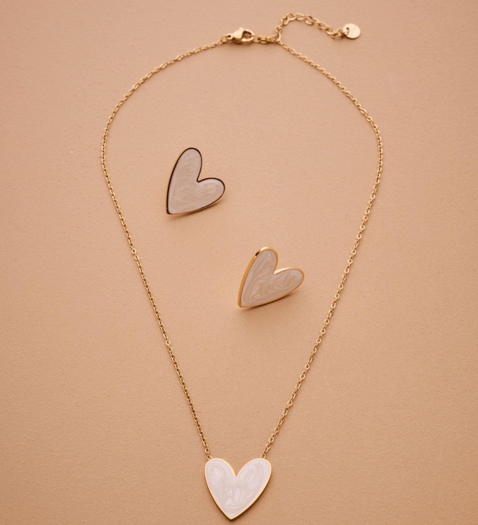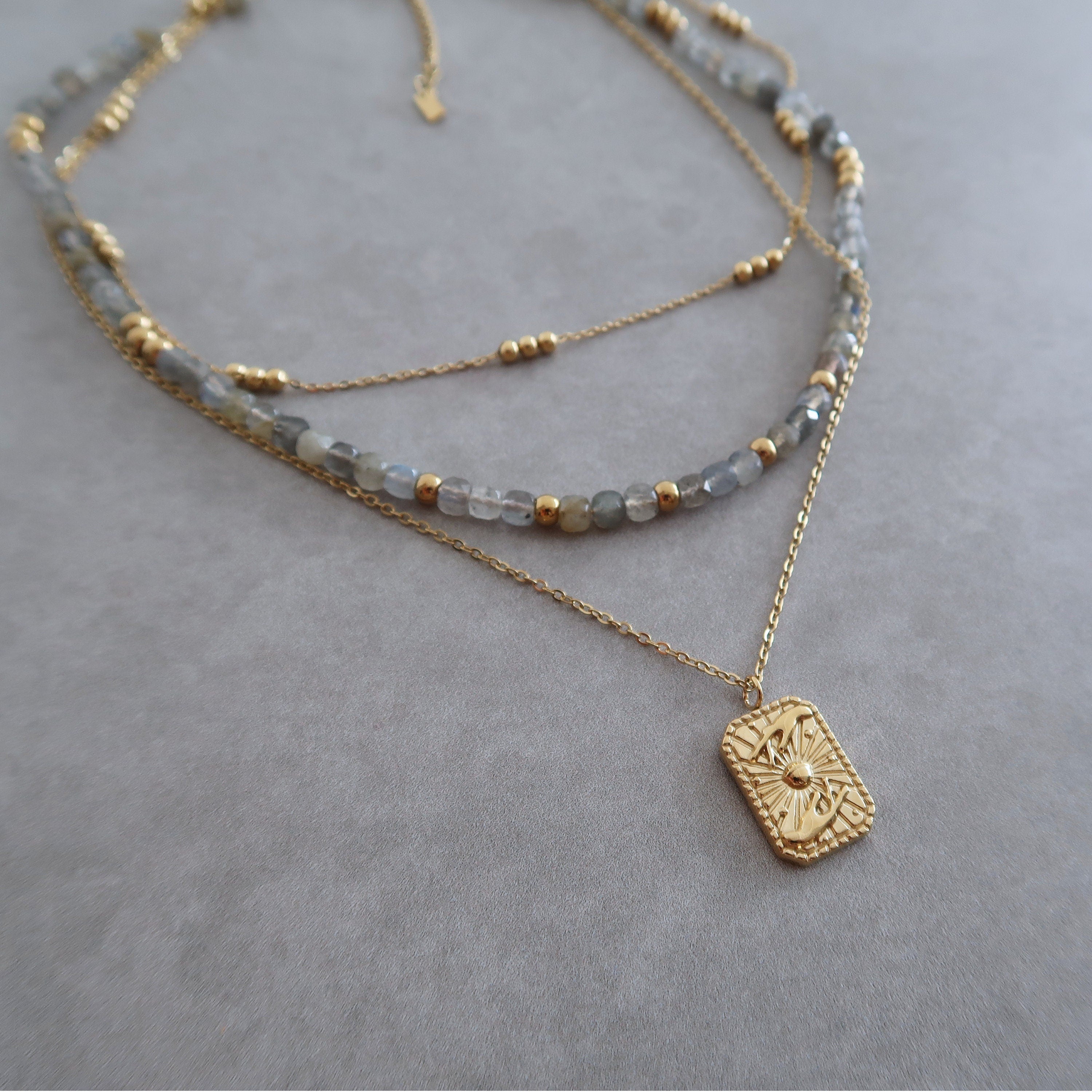 Gold Stainless Steel Necklace Set - 3 Layered Chains with HANDS Pendant and Labradorite Beads