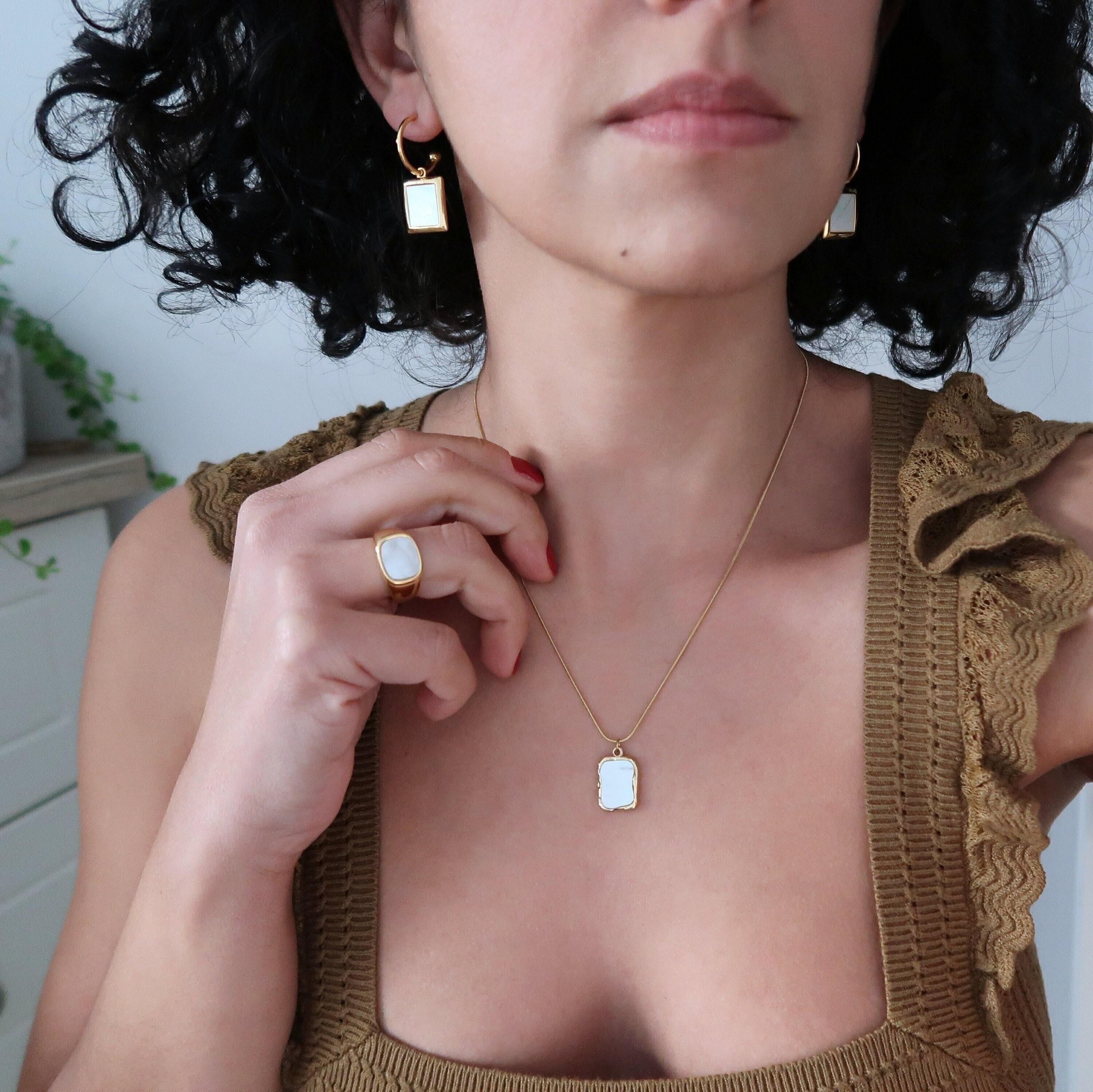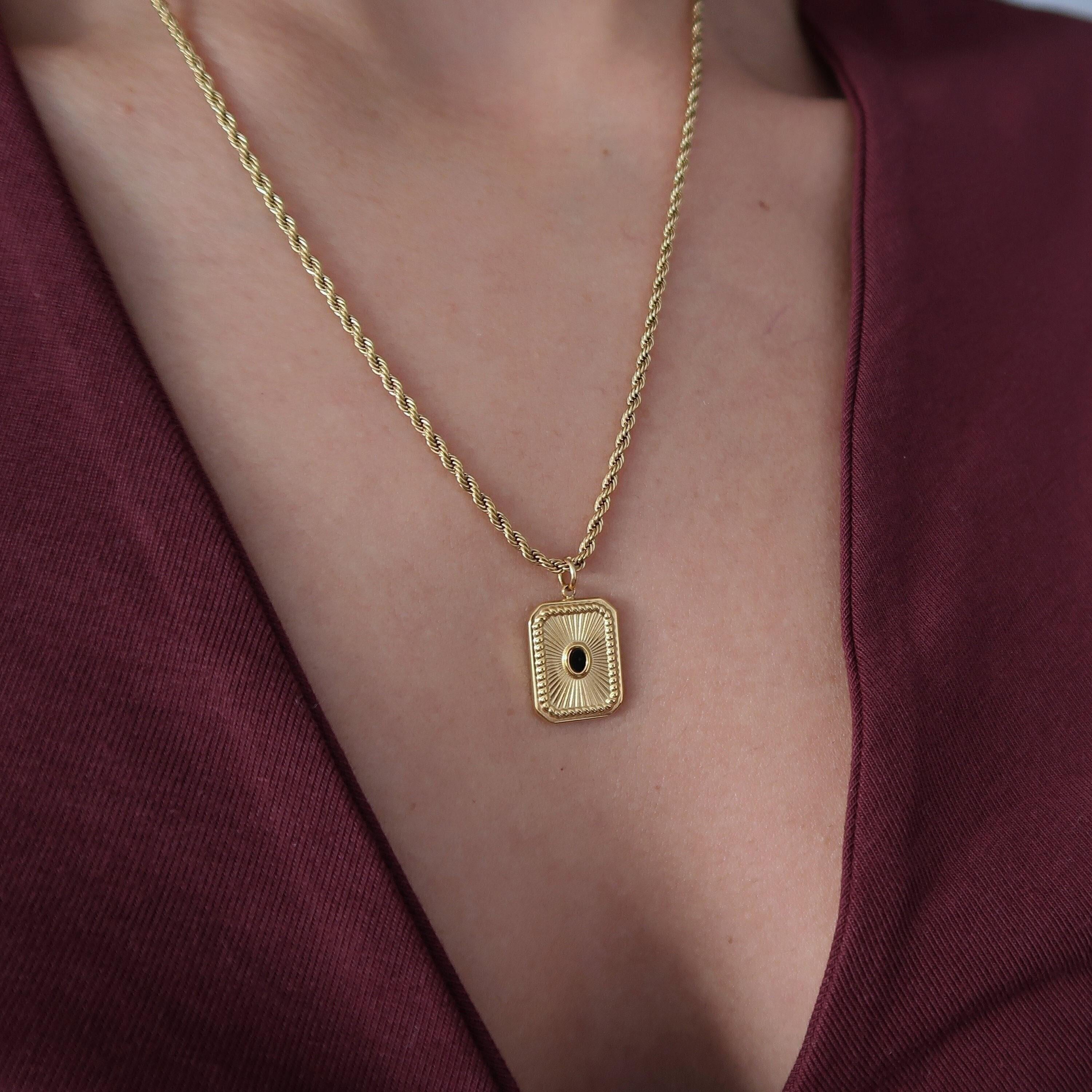 Gold Stainless Steel Rectangle Black Enamel Pendant Necklace