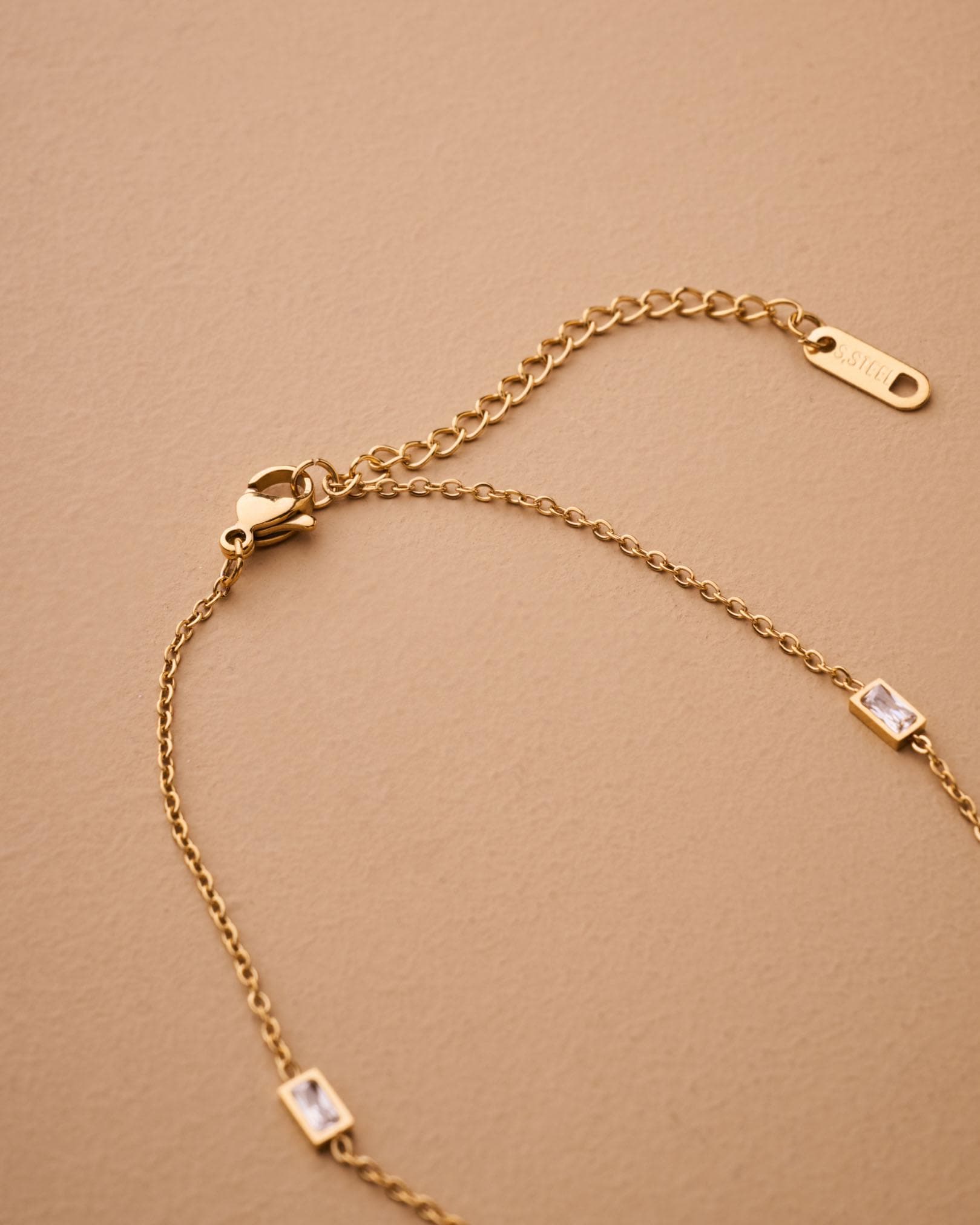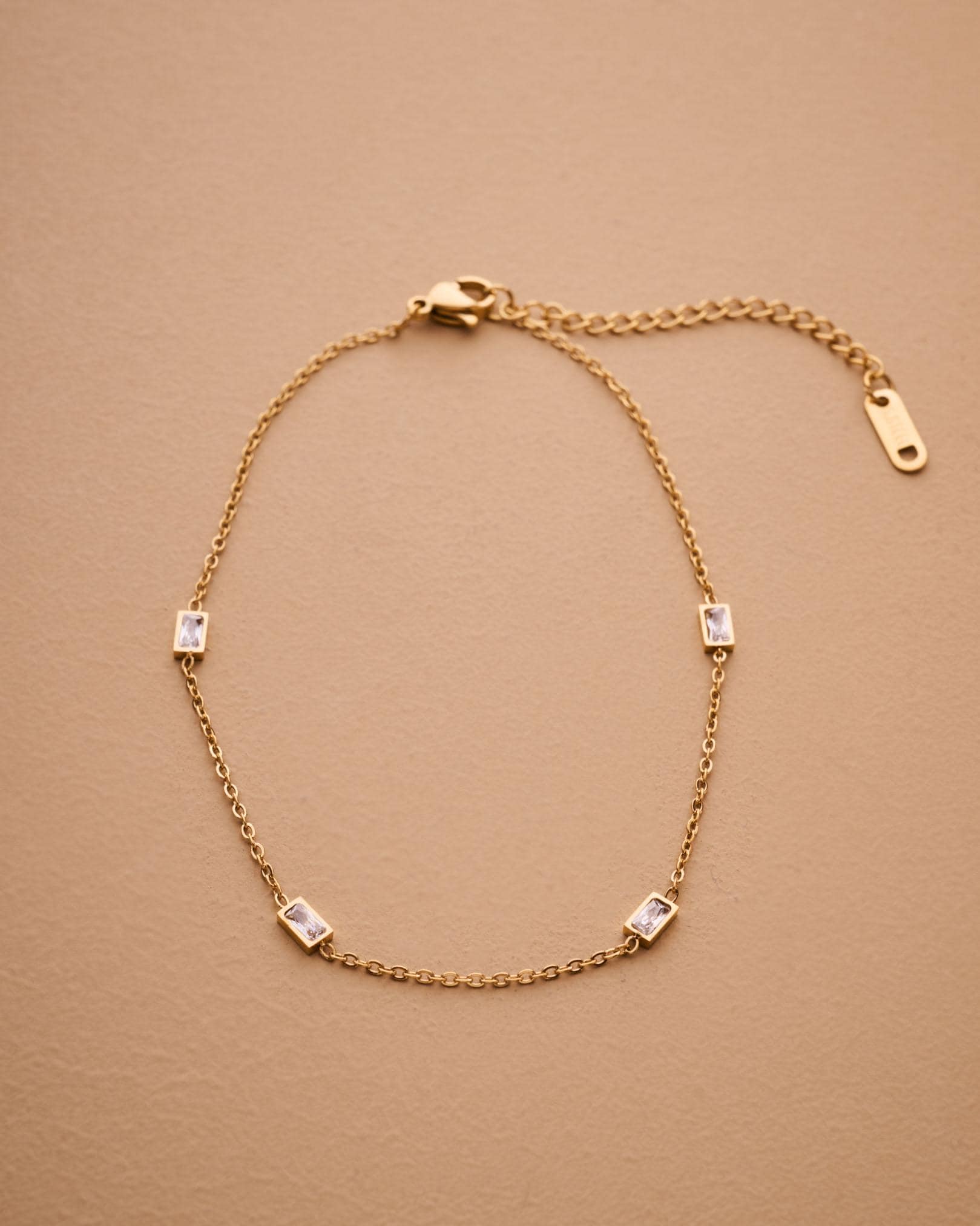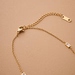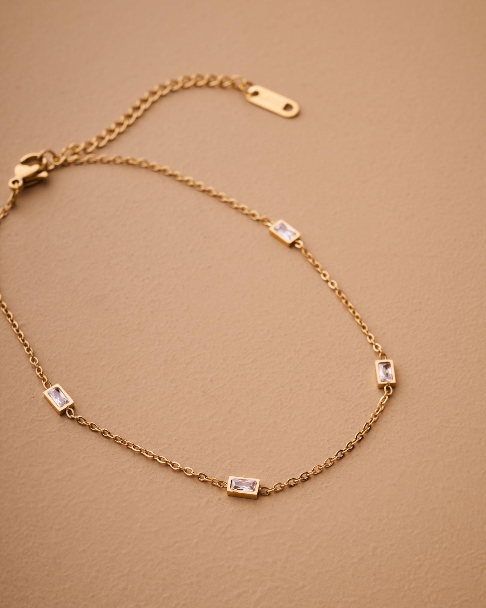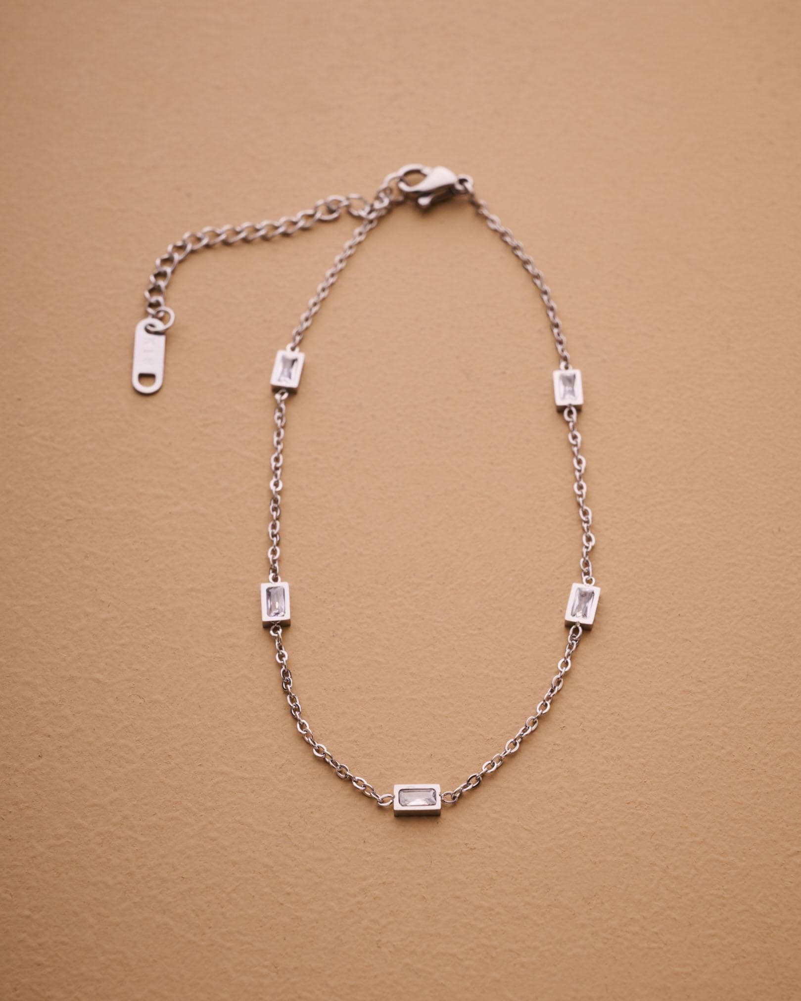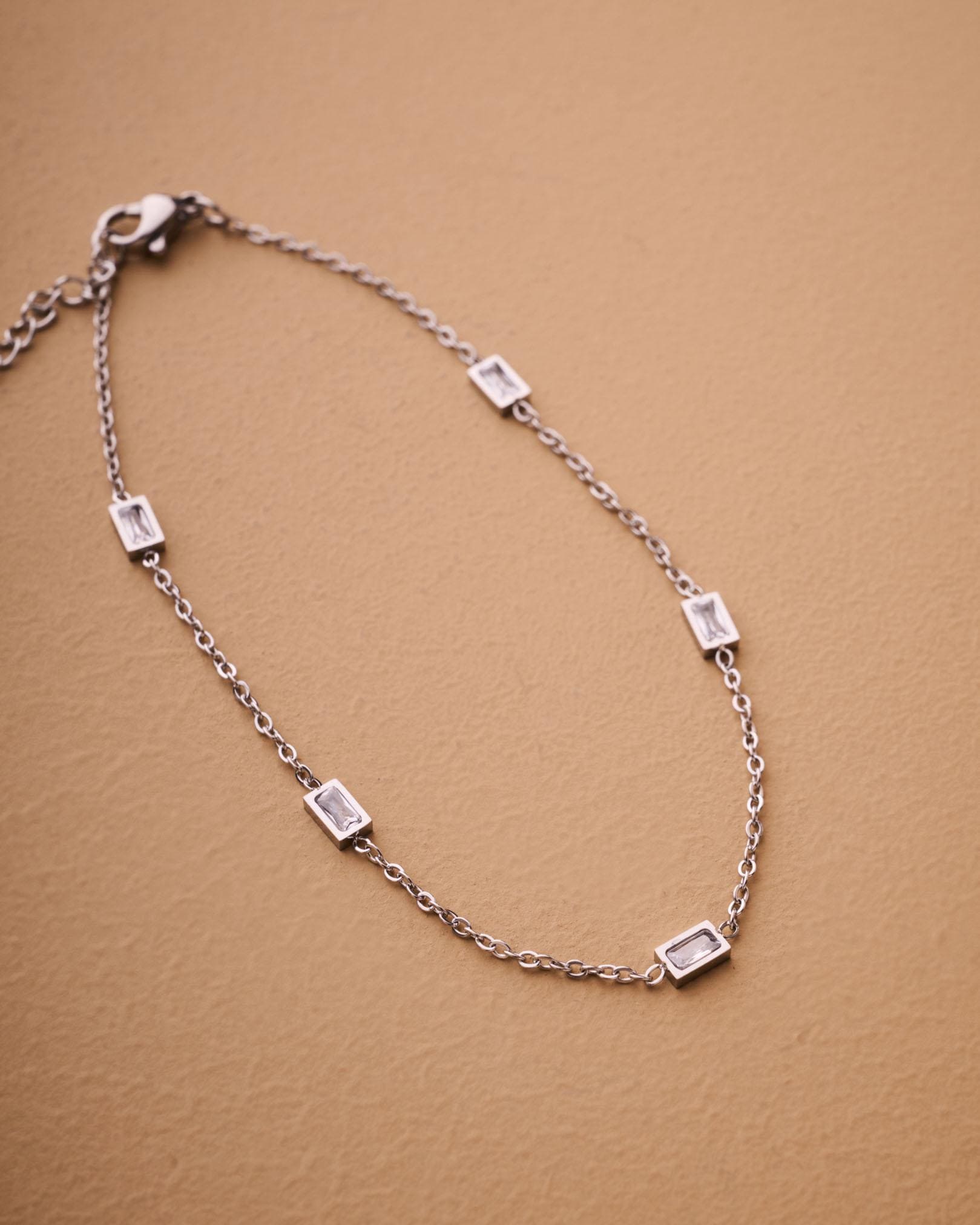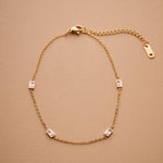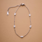 A modern classic, this baguette station anklet is the perfect balance of simplicity and sparkle. With five bezel-set rectangular crystals built into a slim stainless steel chain, this anklet adds effortless shine to your ankle. Choose silver for a cool glow or gold for warm elegance. It’s waterproof, tarnish-resistant, and designed for daily wear—even on the sand.
