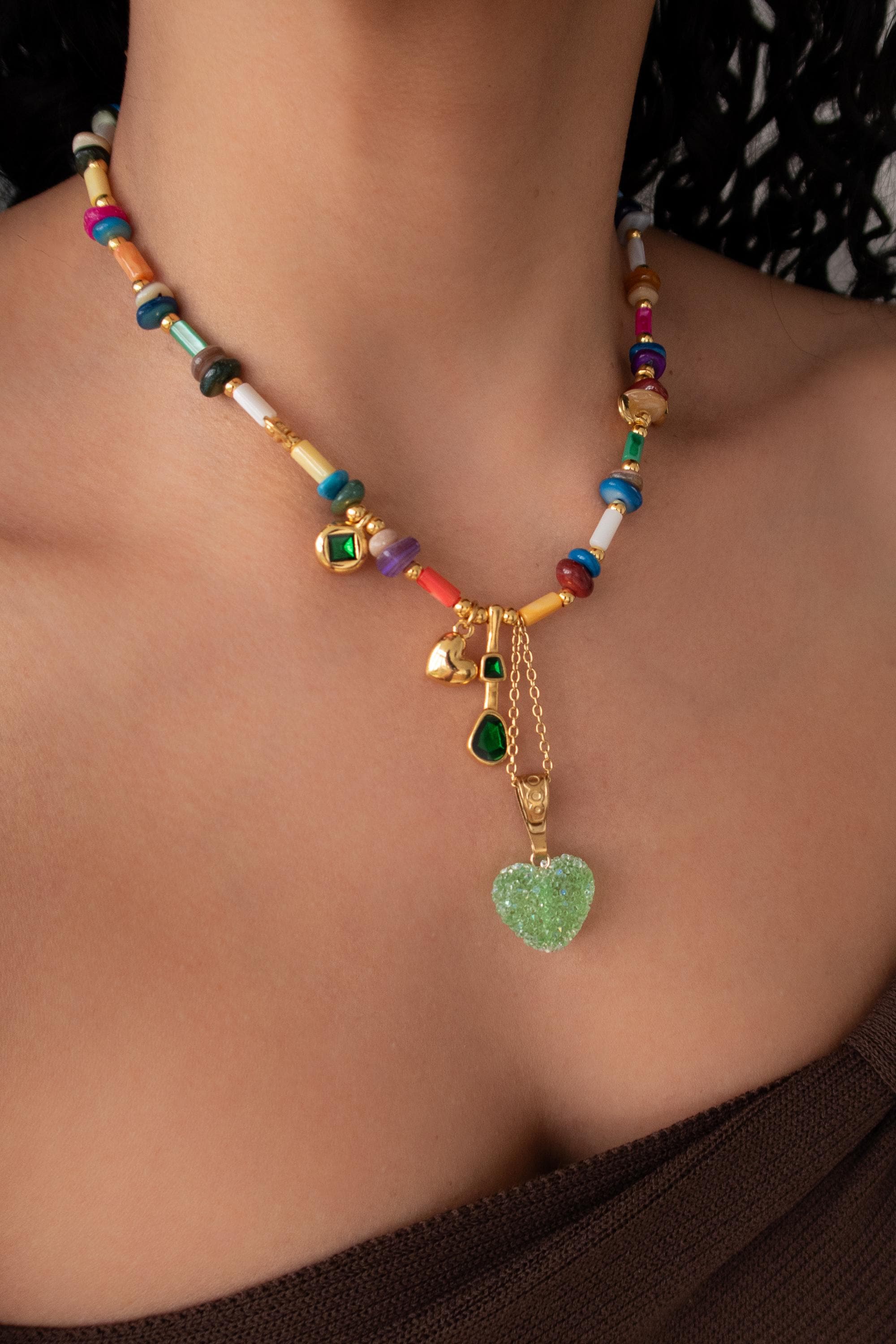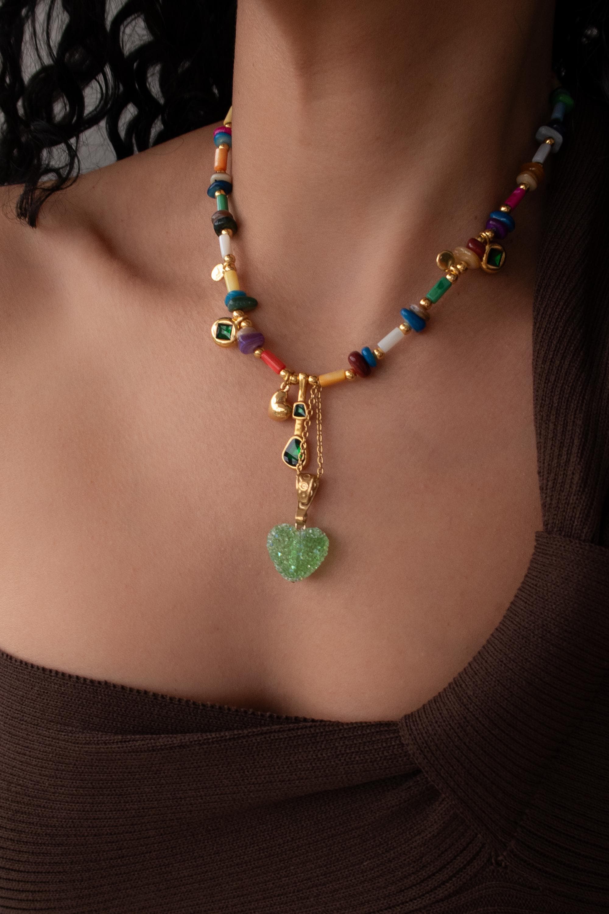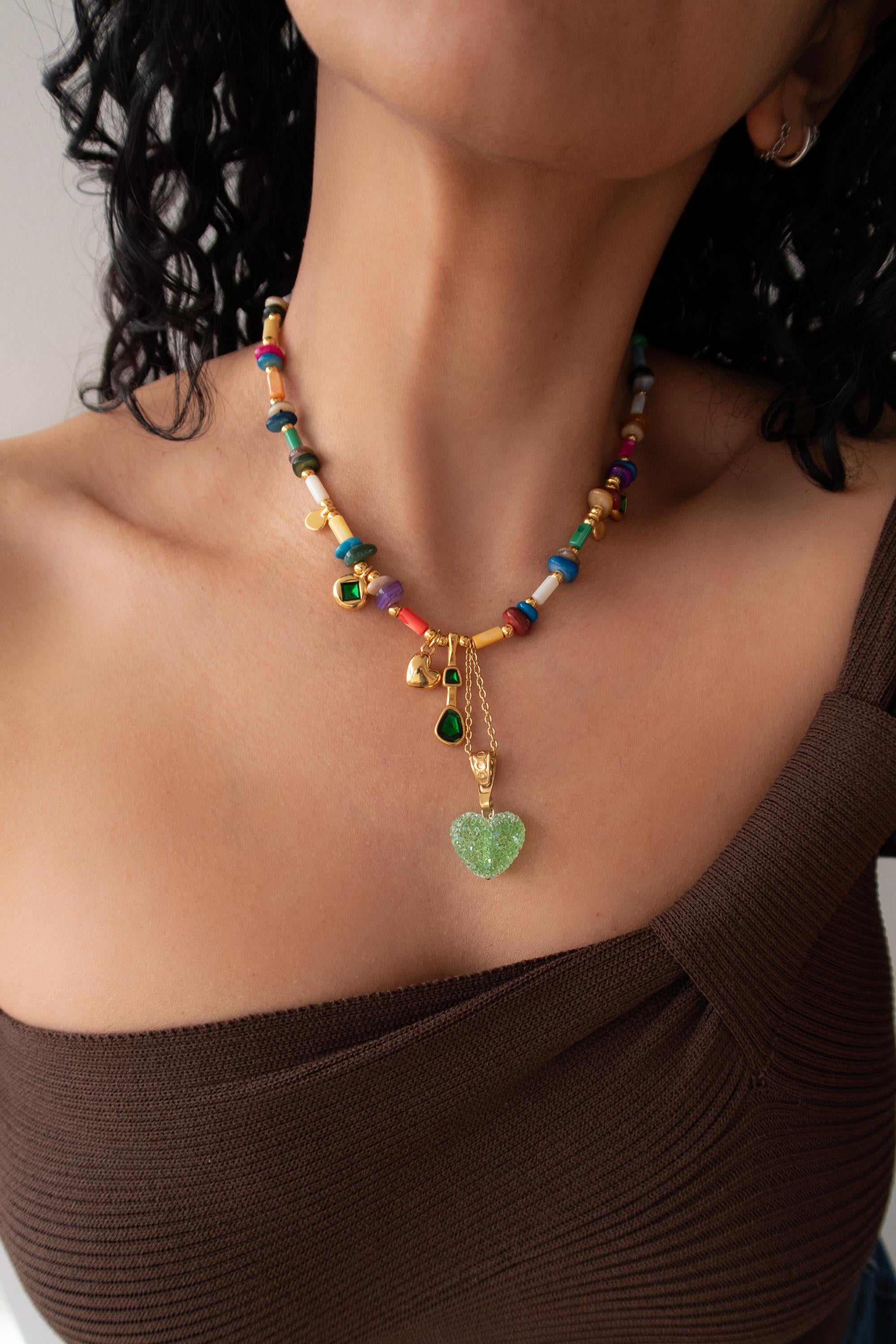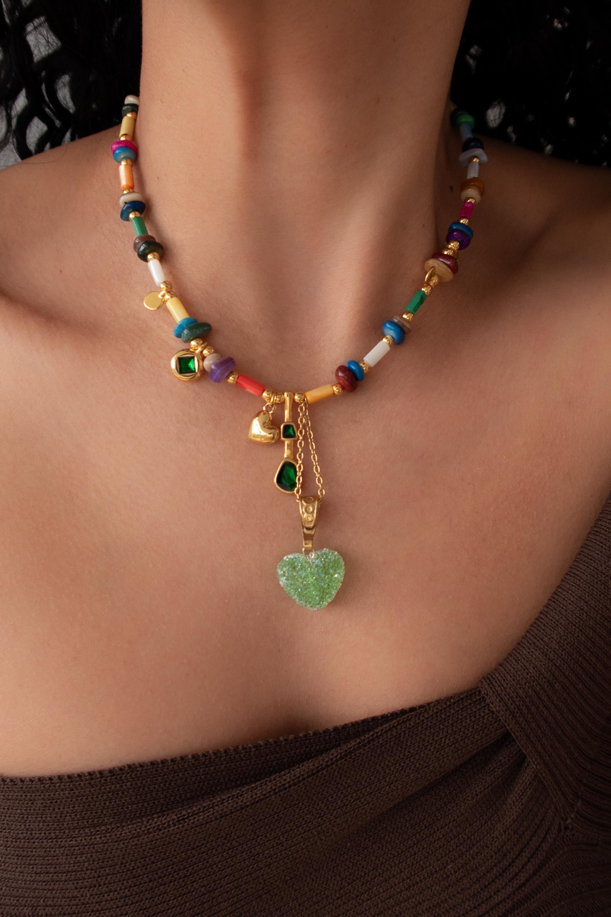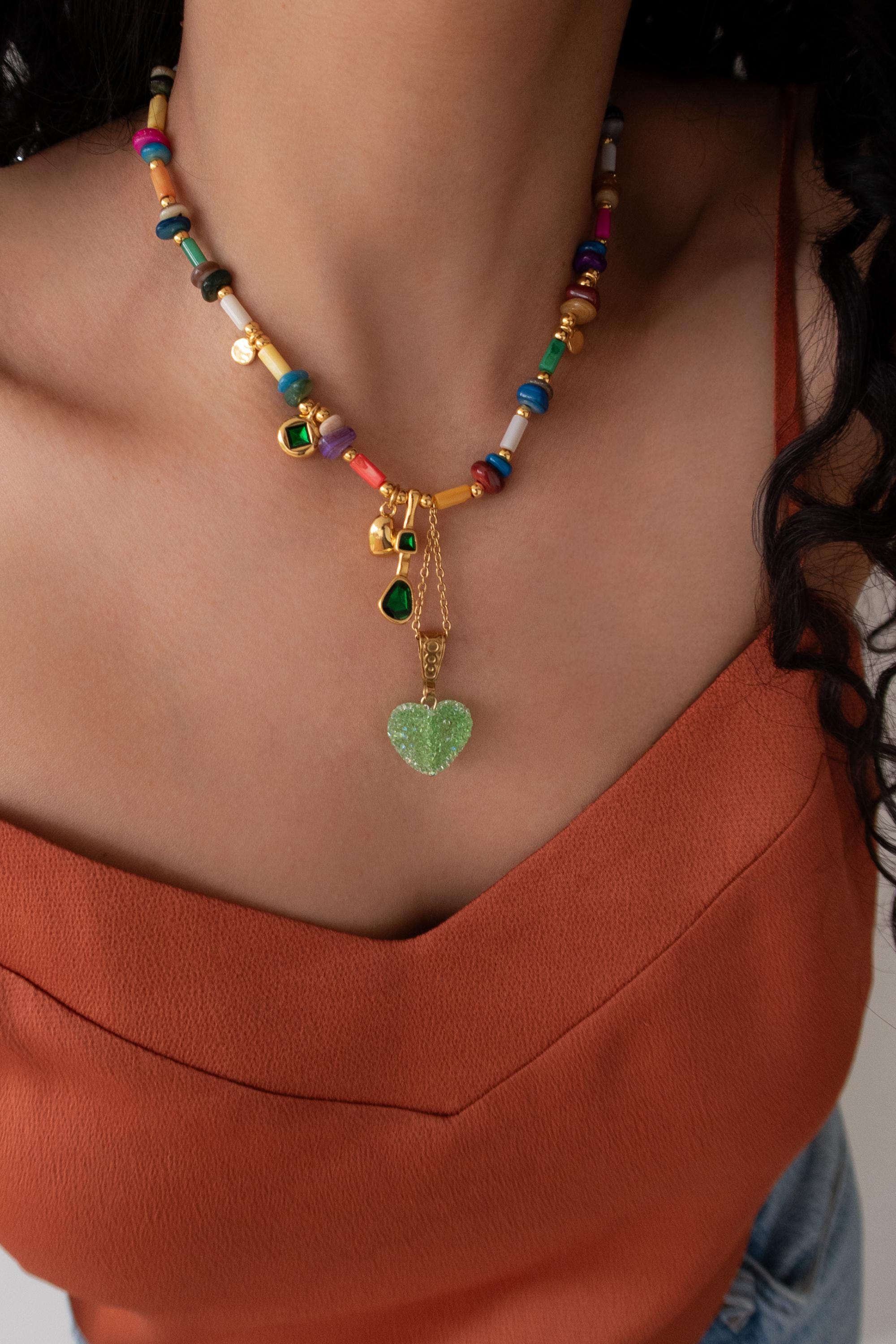 Οι χάντρες κοχυλιού προσθέτουν οργανική υφή, ενώ η πράσινη καρδιά λειτουργεί ως κεντρικό σημείο αναφοράς. Φοριέται μόνο του ως βασικό κομμάτι ή συνδυάζεται εύκολα με χρυσές αλυσίδες για layering.