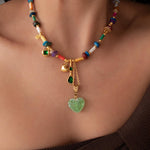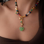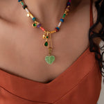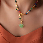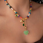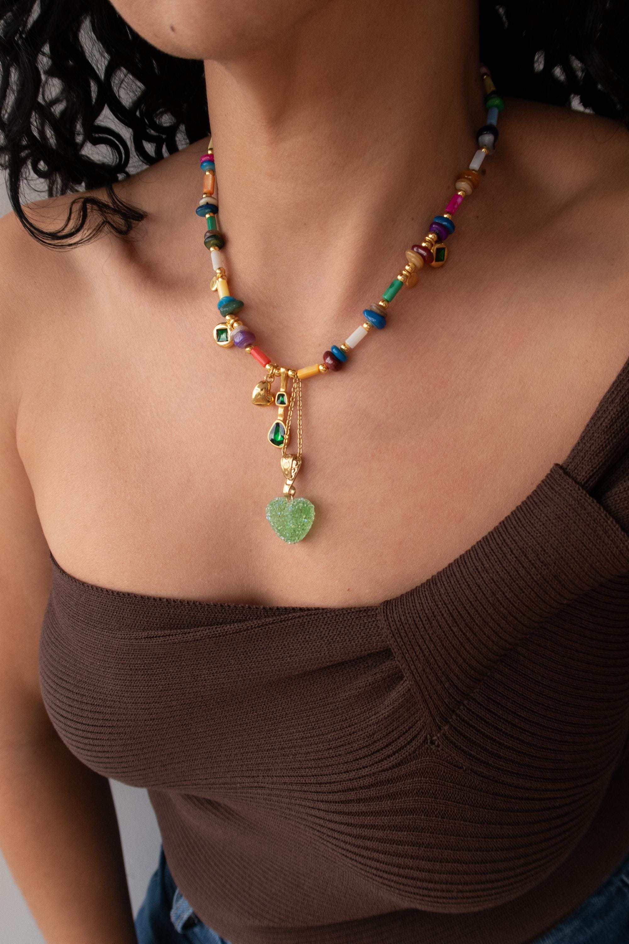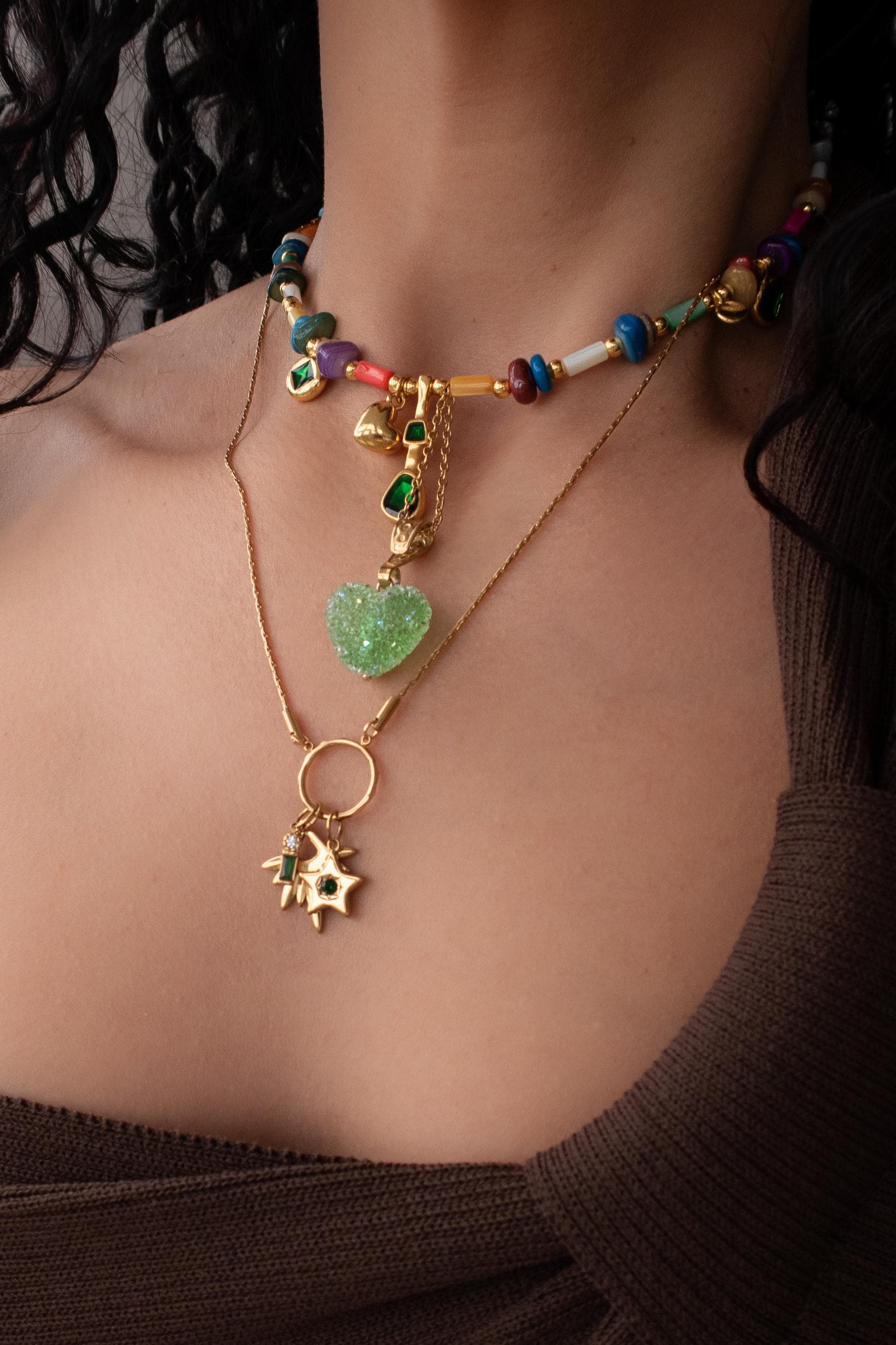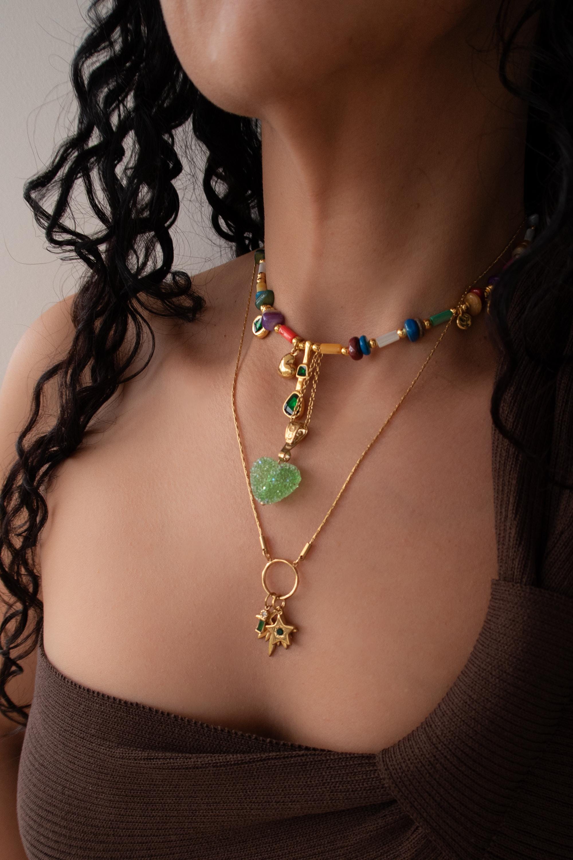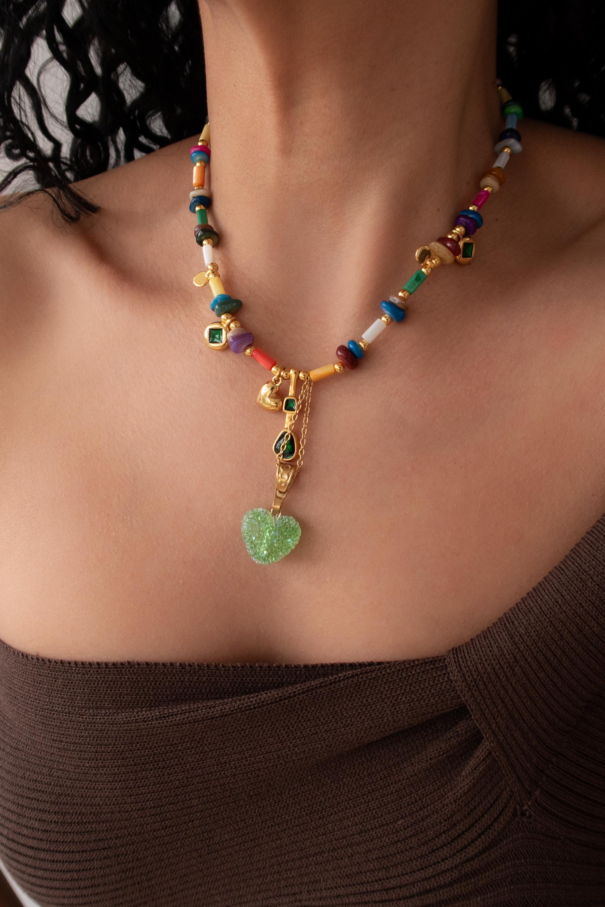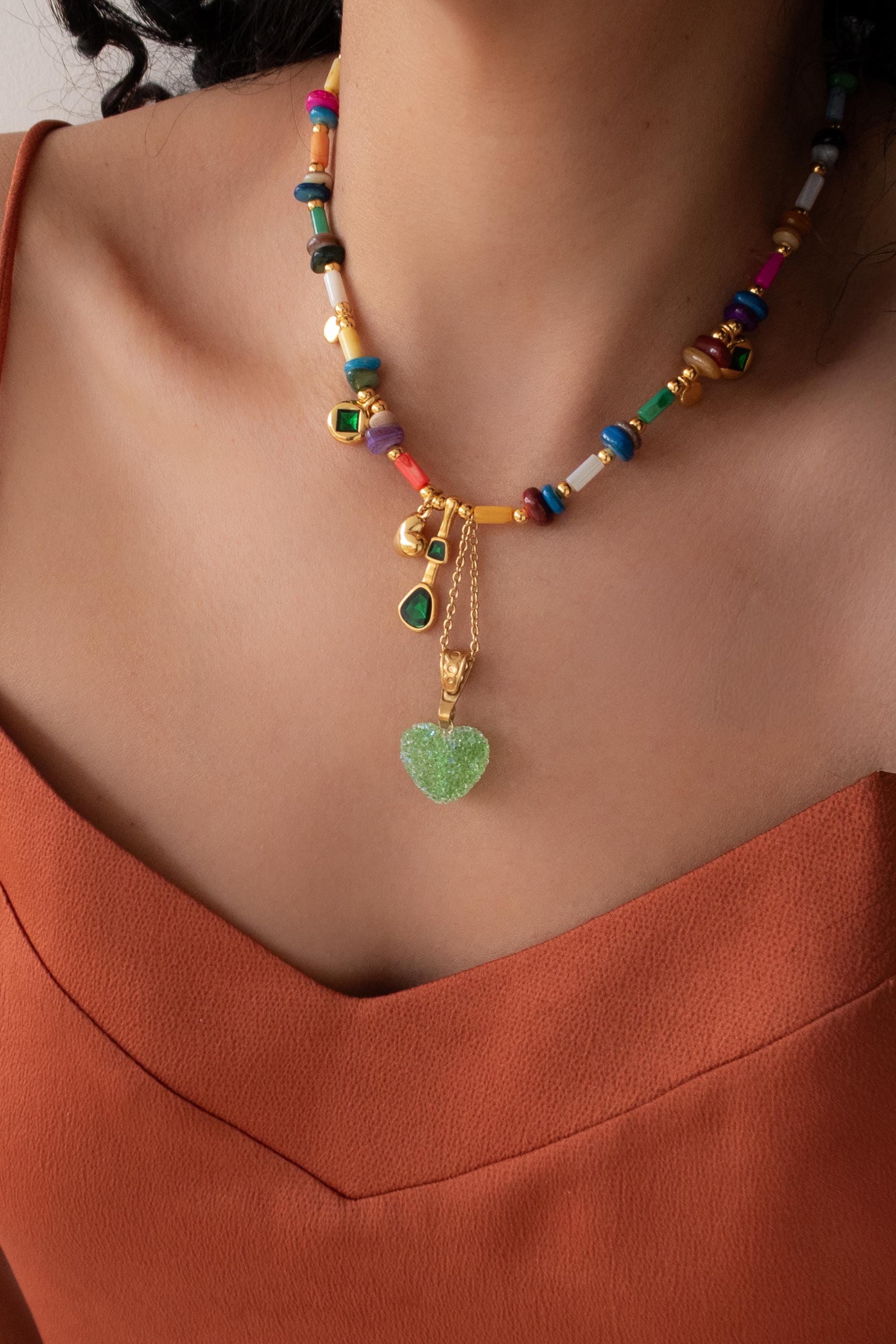 Οι χάντρες κοχυλιού προσθέτουν οργανική υφή, ενώ η πράσινη καρδιά λειτουργεί ως κεντρικό σημείο αναφοράς. Φοριέται μόνο του ως βασικό κομμάτι ή συνδυάζεται εύκολα με χρυσές αλυσίδες για layering.
