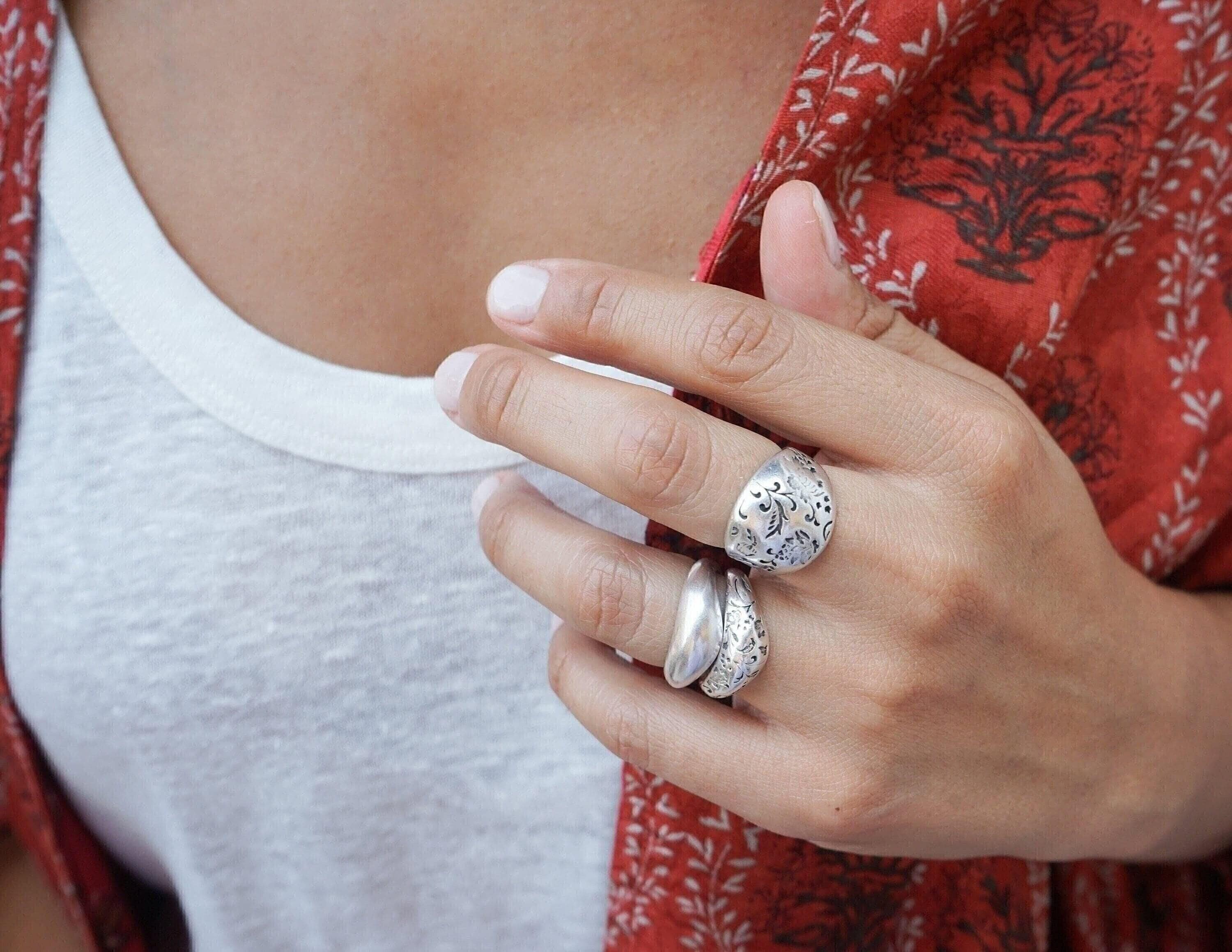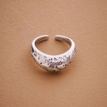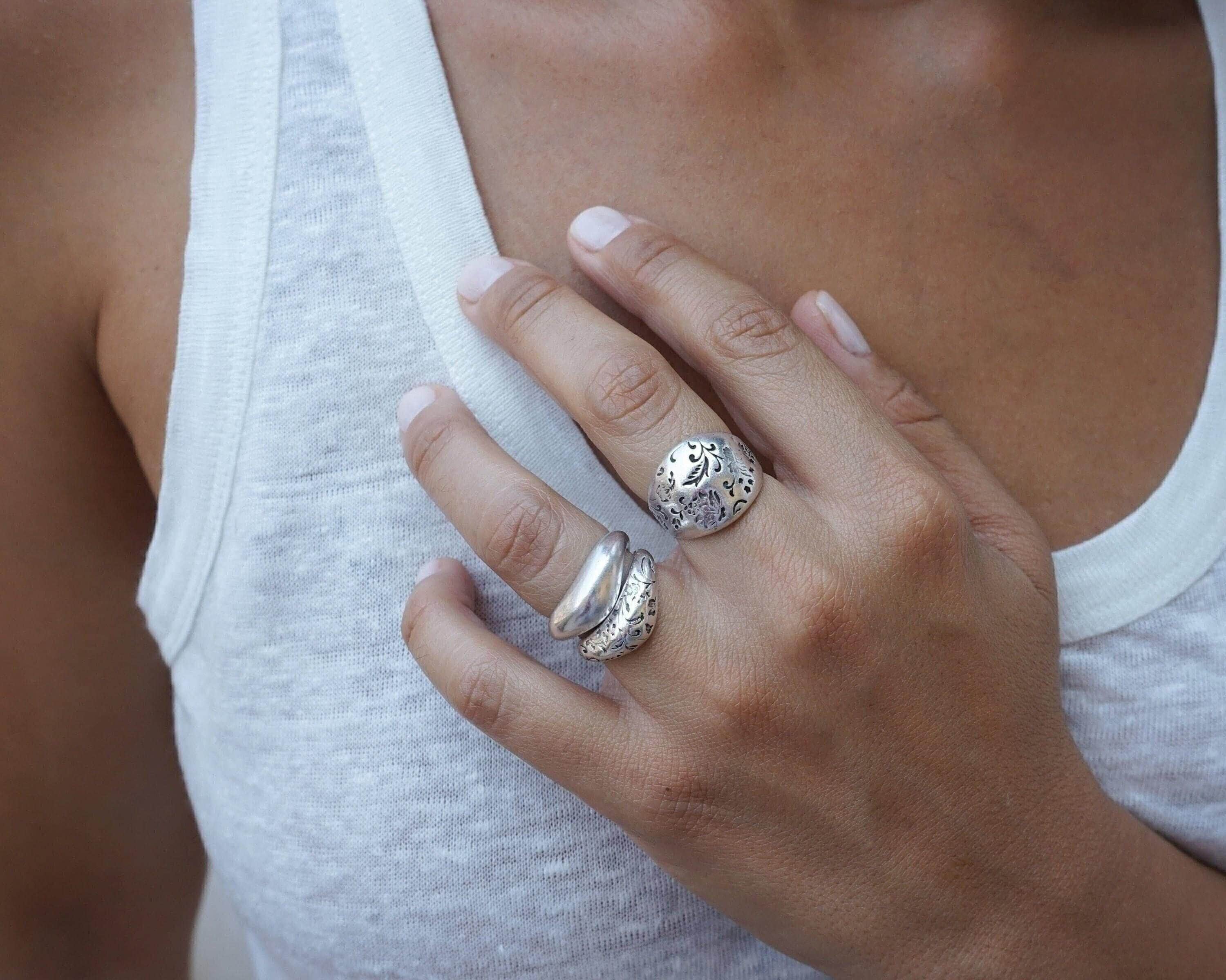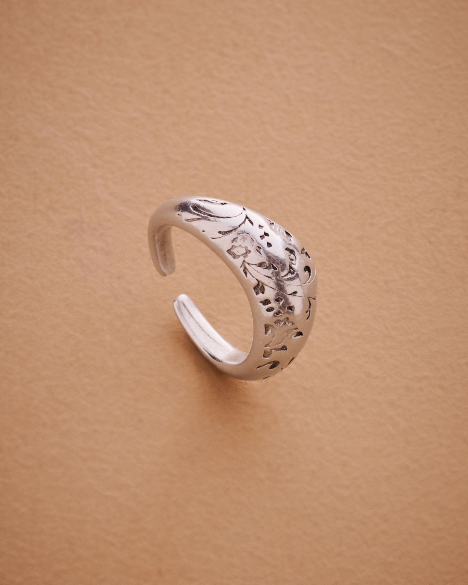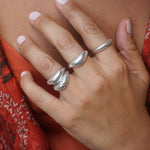 Discover the charm of our Silver Soft Curve Floral Ring, featuring a distinctive thick open band that is perfect for wearing alone or stacking with other rings. Its unique irregular shape adds a bold touch, making it a statement piece you'll cherish for years to come. Inspired by the flowing forms found in nature and the human body, the ring showcases minimalistic, graceful curves that enhance its organic design.
