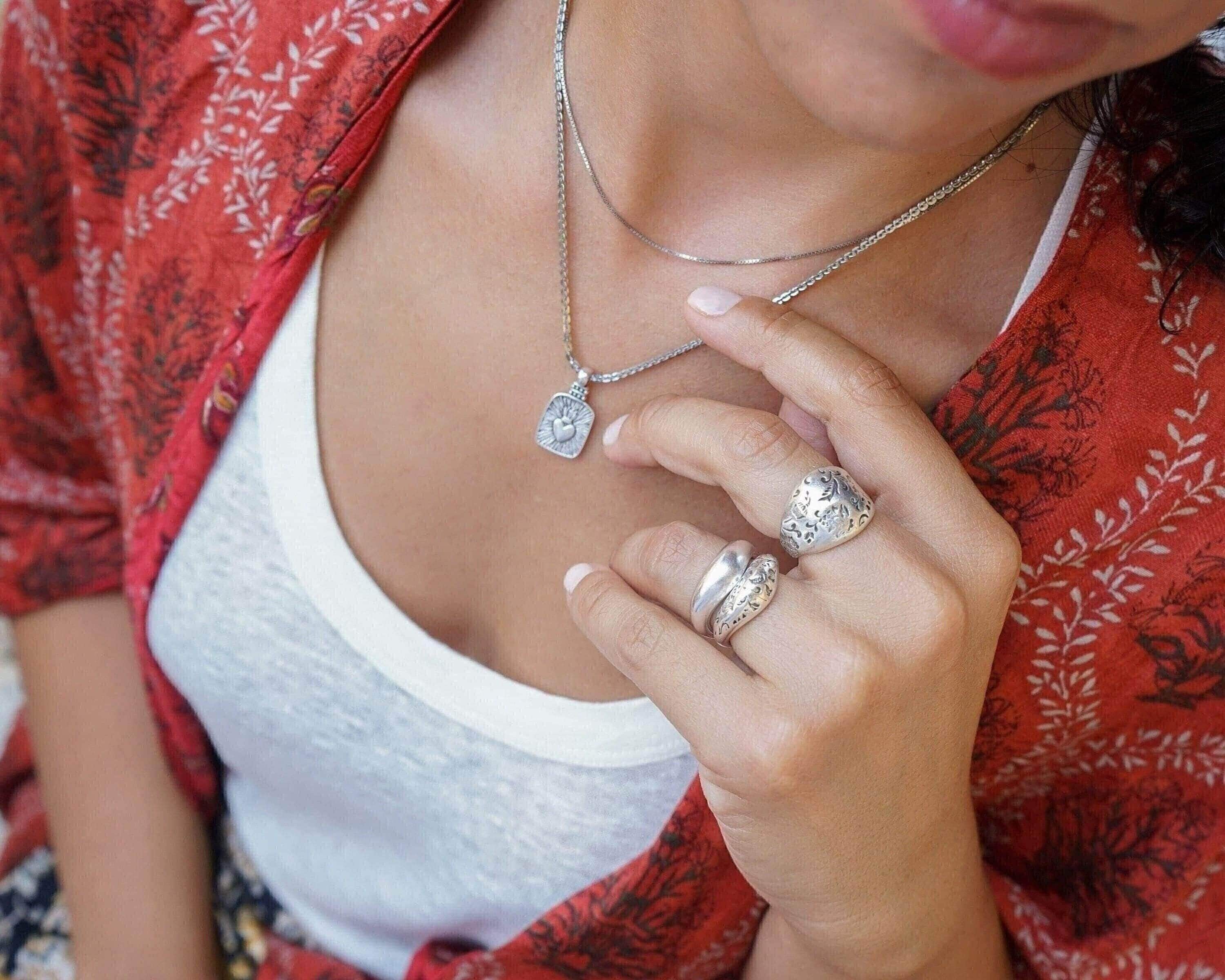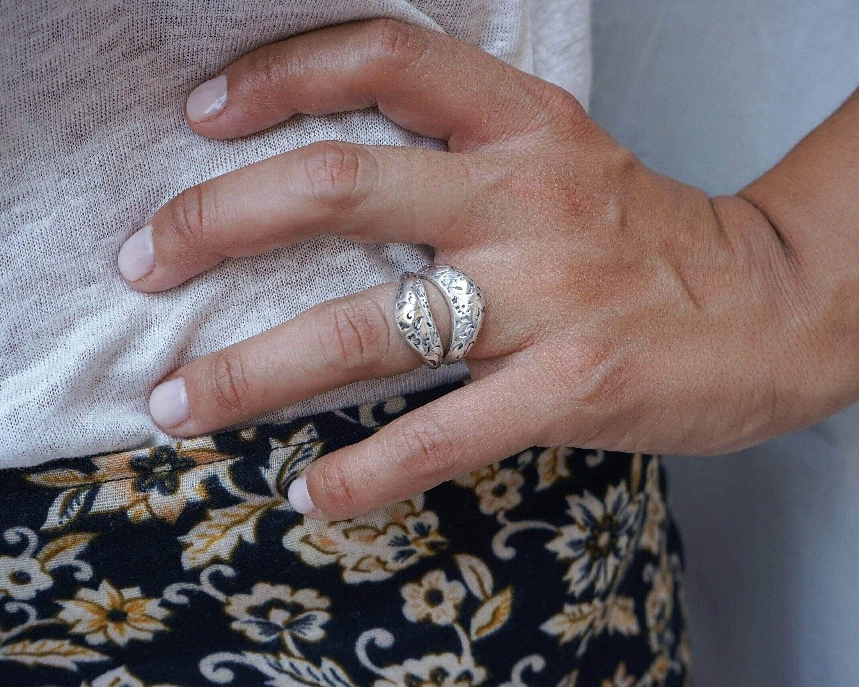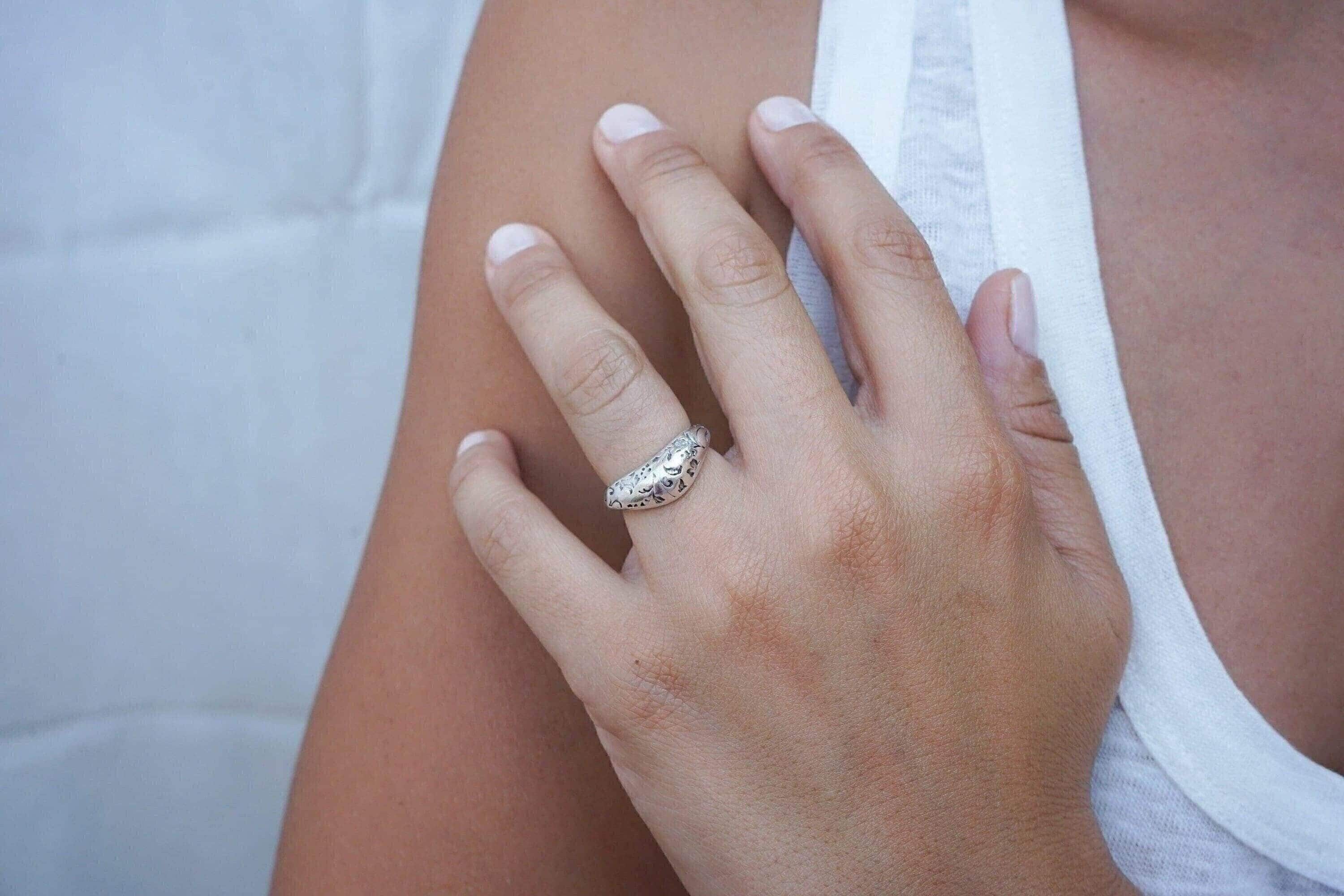 Discover the charm of our Silver Soft Curve Floral Ring, featuring a distinctive thick open band that is perfect for wearing alone or stacking with other rings. Its unique irregular shape adds a bold touch, making it a statement piece you'll cherish for years to come. Inspired by the flowing forms found in nature and the human body, the ring showcases minimalistic, graceful curves that enhance its organic design.