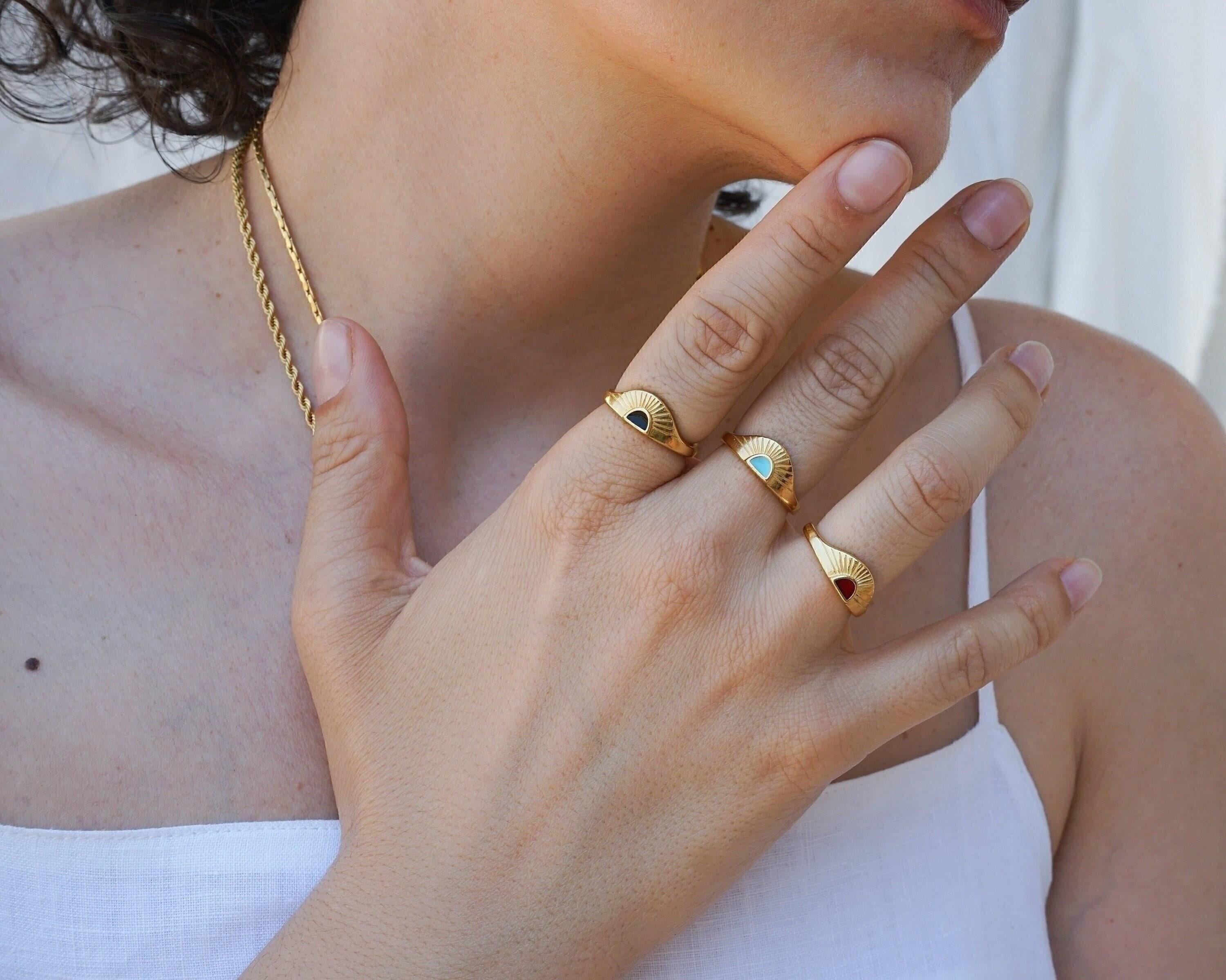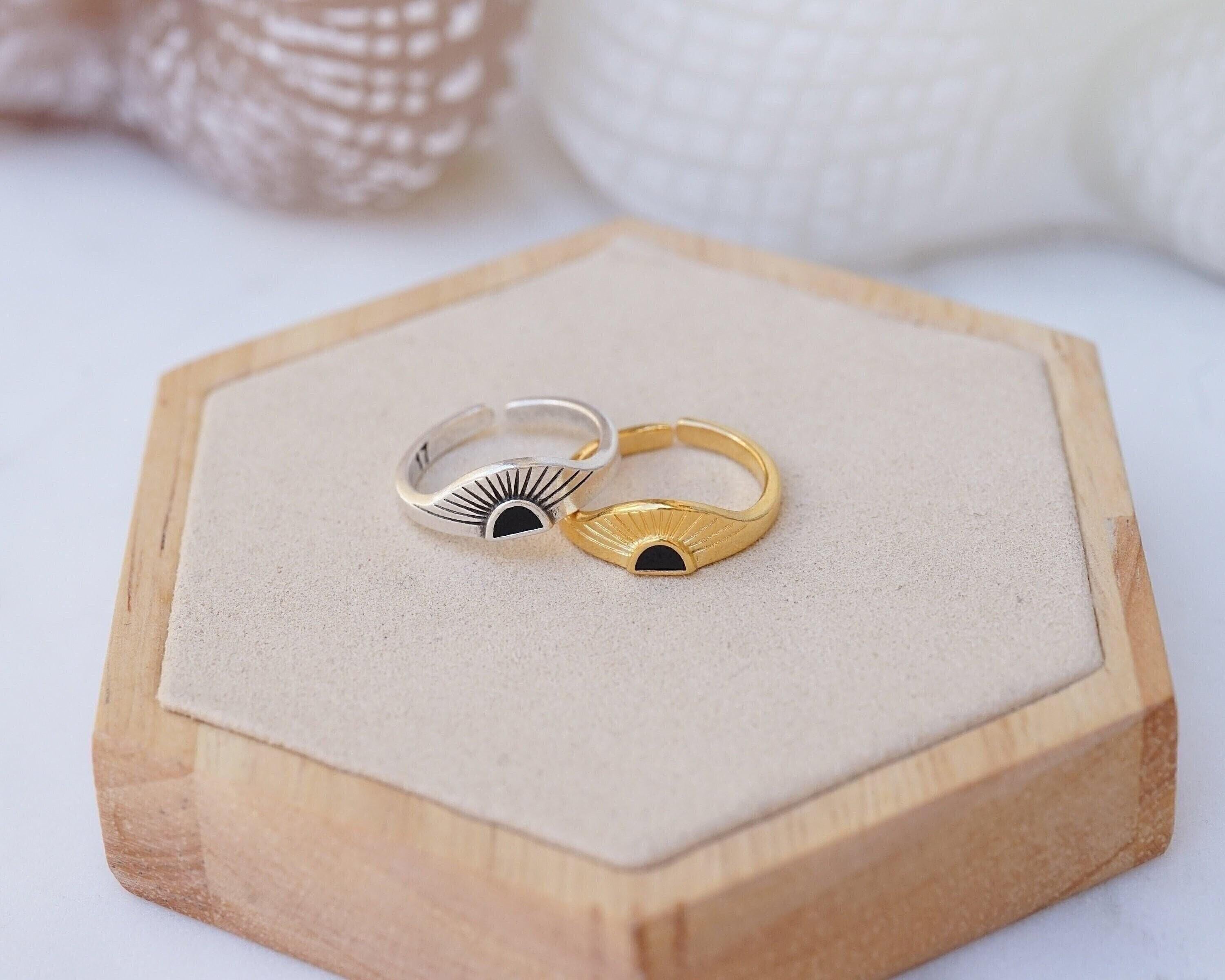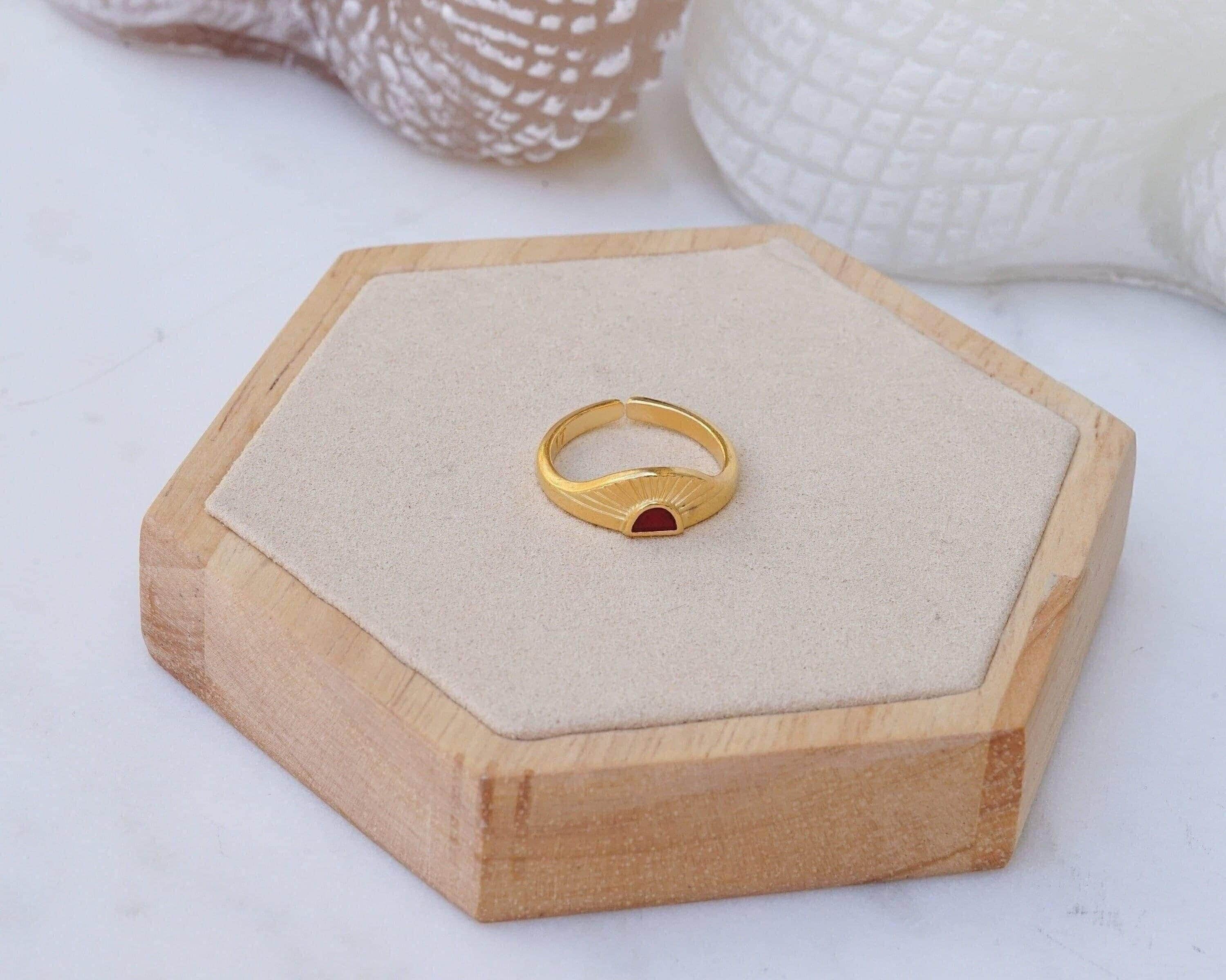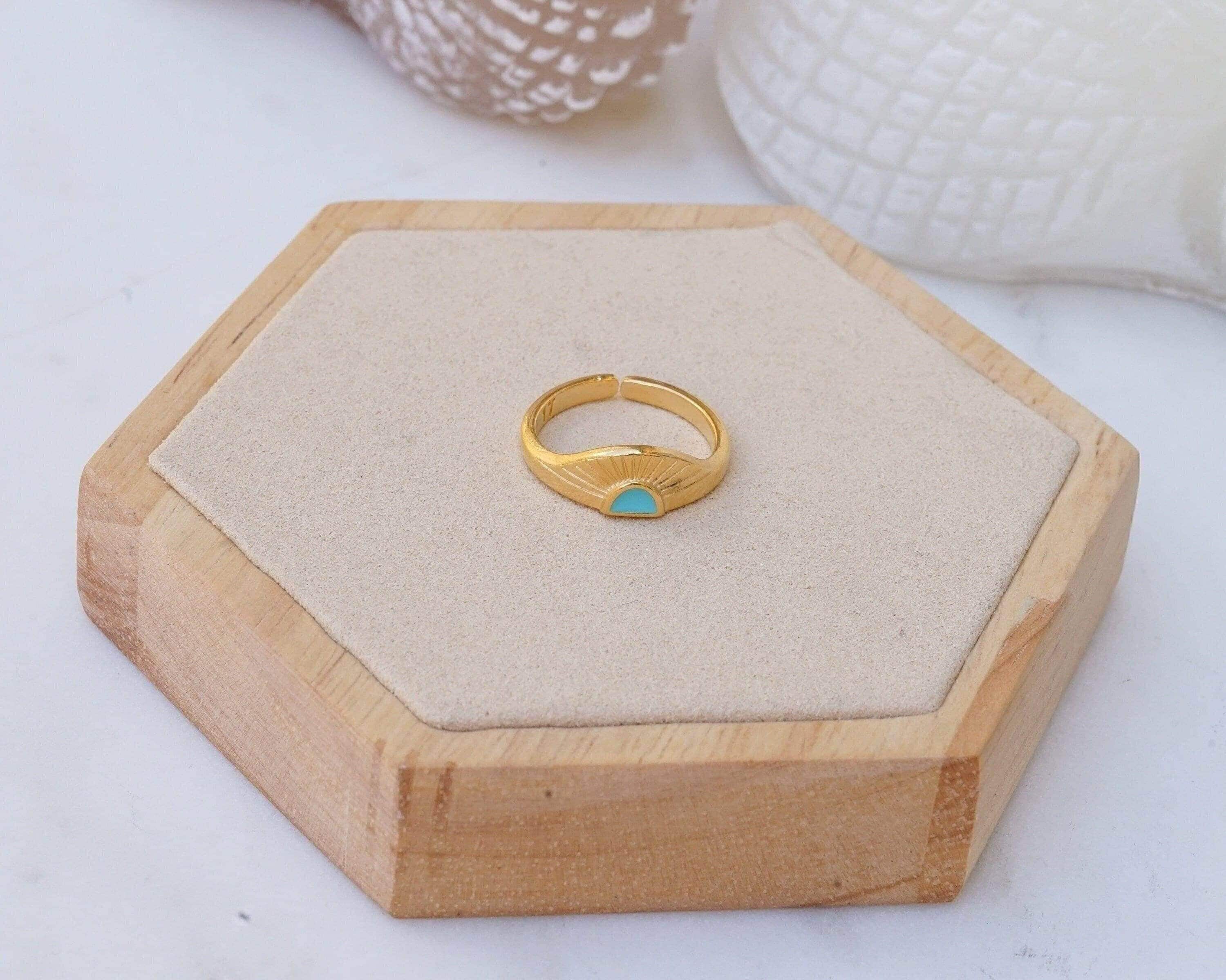 Discover a stylish and elegant rising sun ring featuring an eye-catching enamel setting in black, turquoise, and burgundy. This unique piece effortlessly enhances any outfit, making it a perfect addition to your jewelry collection.
