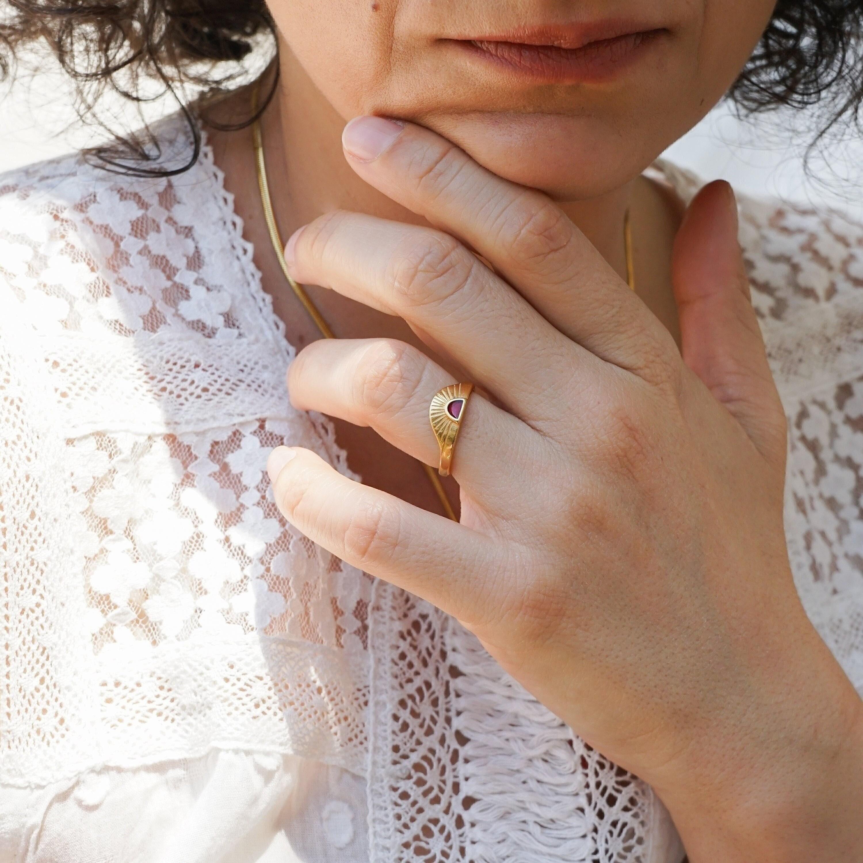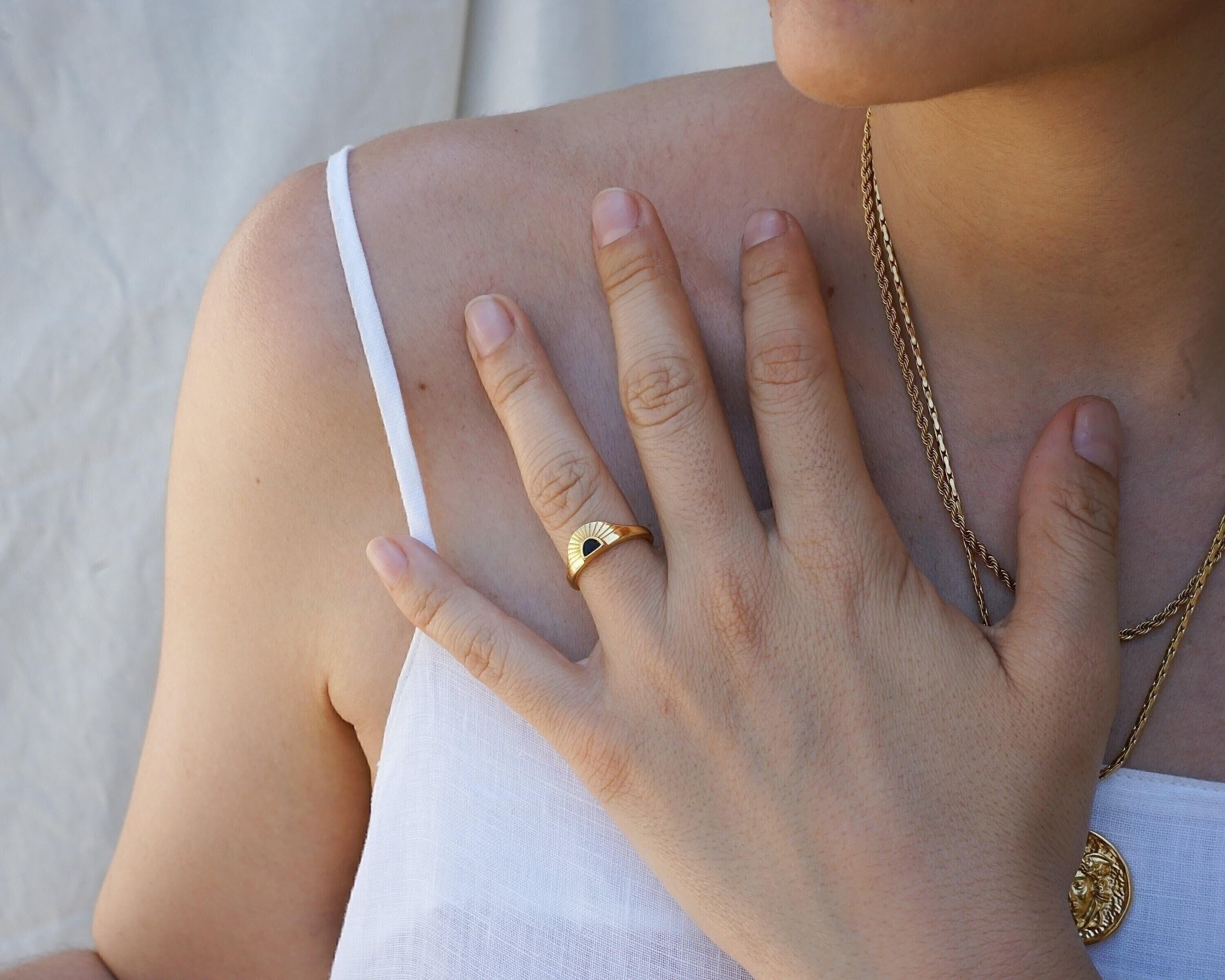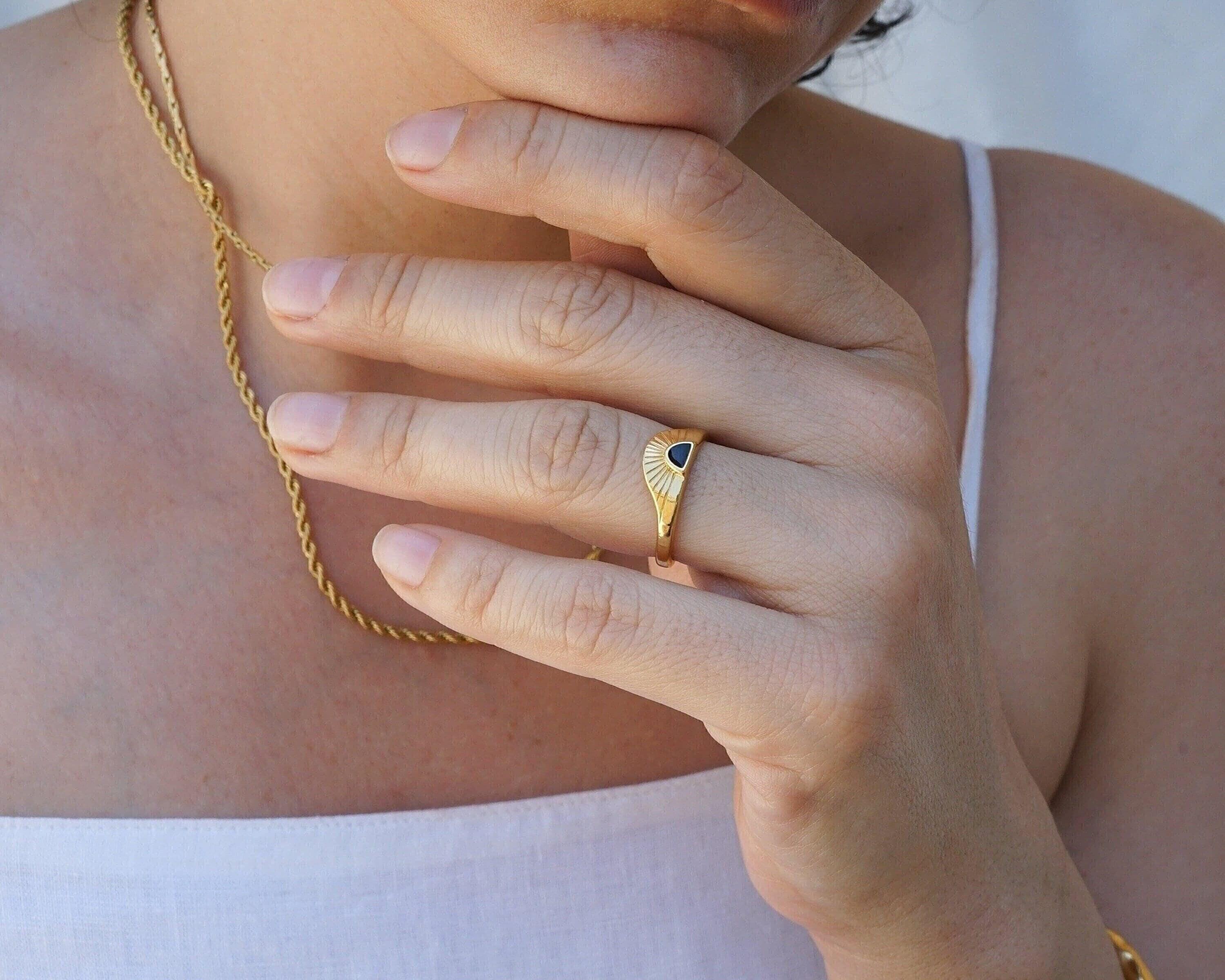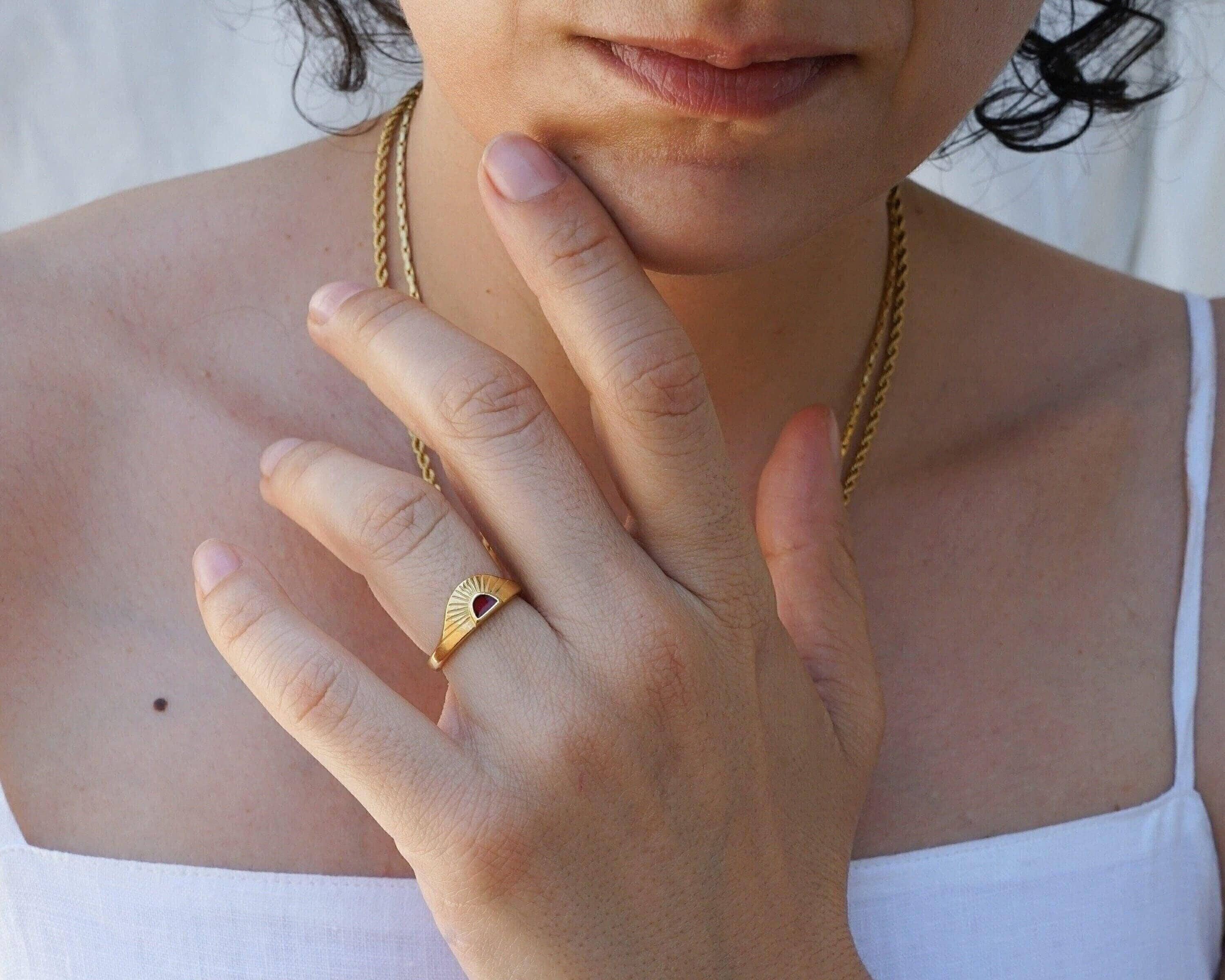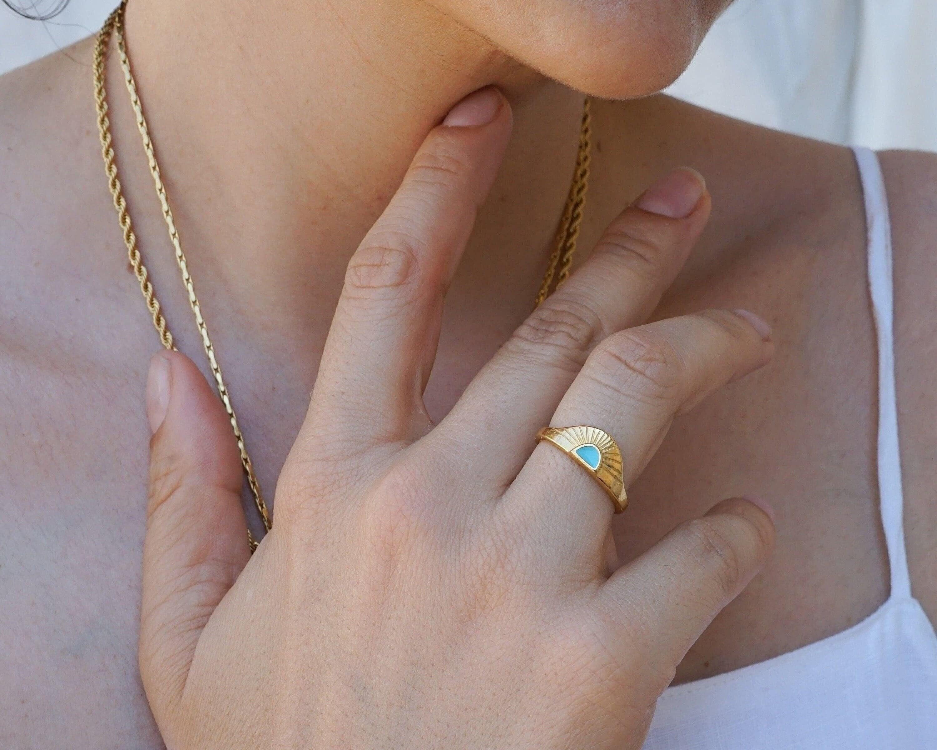 Discover a stylish and elegant rising sun ring featuring an eye-catching enamel setting in black, turquoise, and burgundy. This unique piece effortlessly enhances any outfit, making it a perfect addition to your jewelry collection.