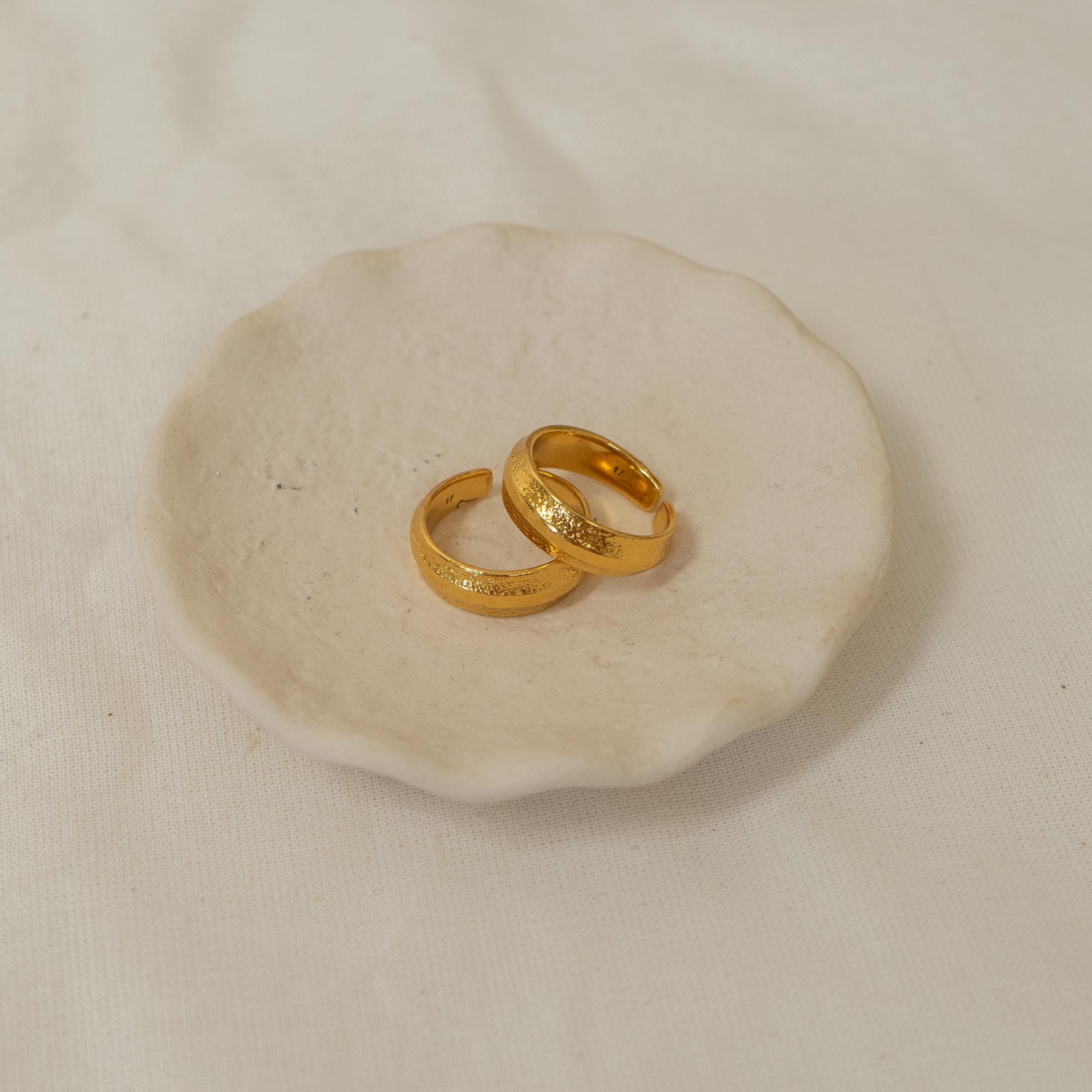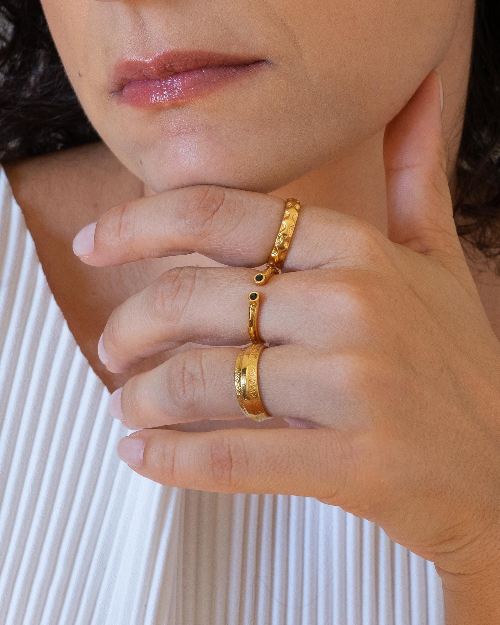 This stunning statement band ring features a 24k gold plating with a beautifully brushed texture, adding a unique touch to your jewelry collection. Its distinctive irregular shape ensures that it stands out, making it a versatile piece that you can wear for years to come.