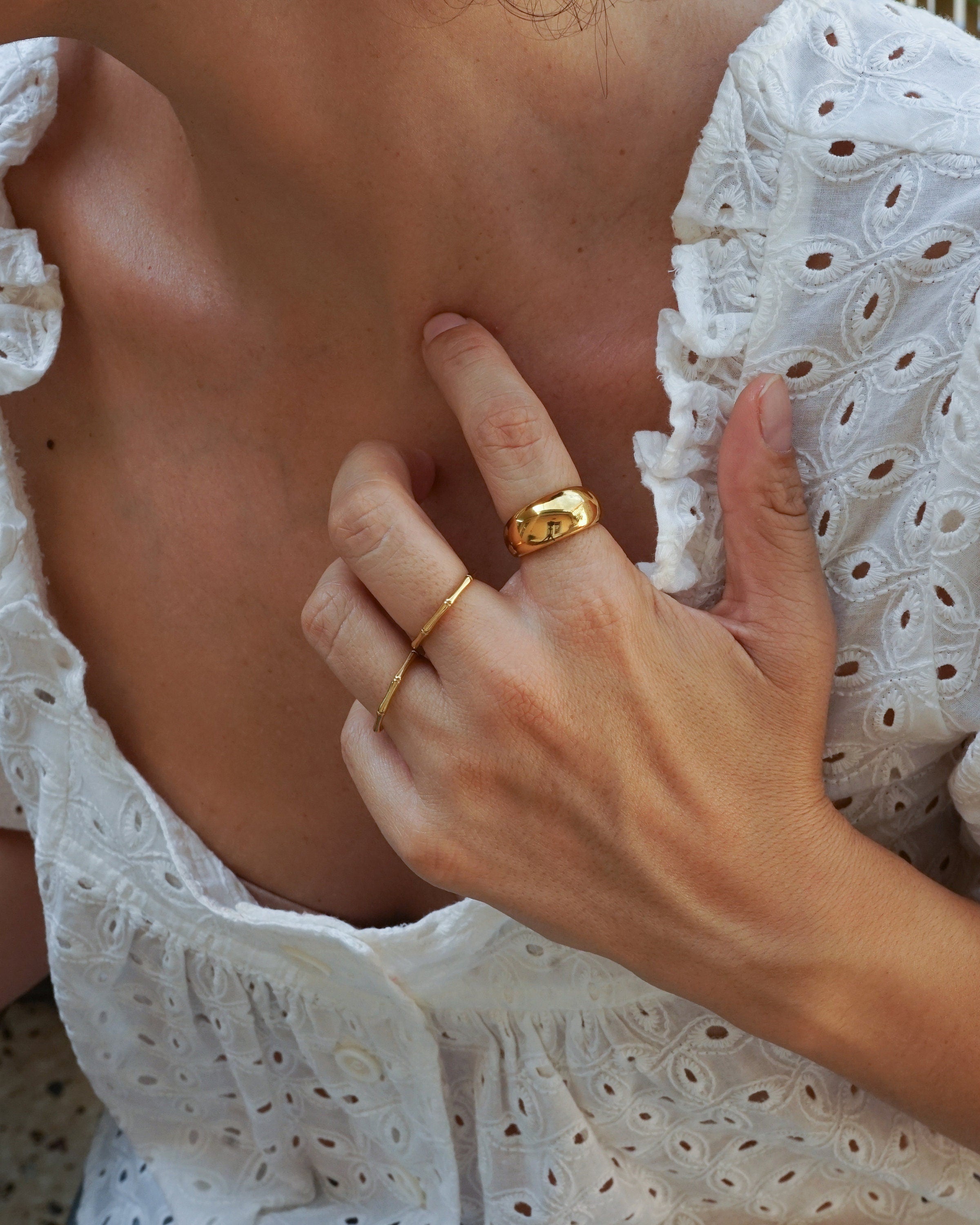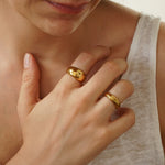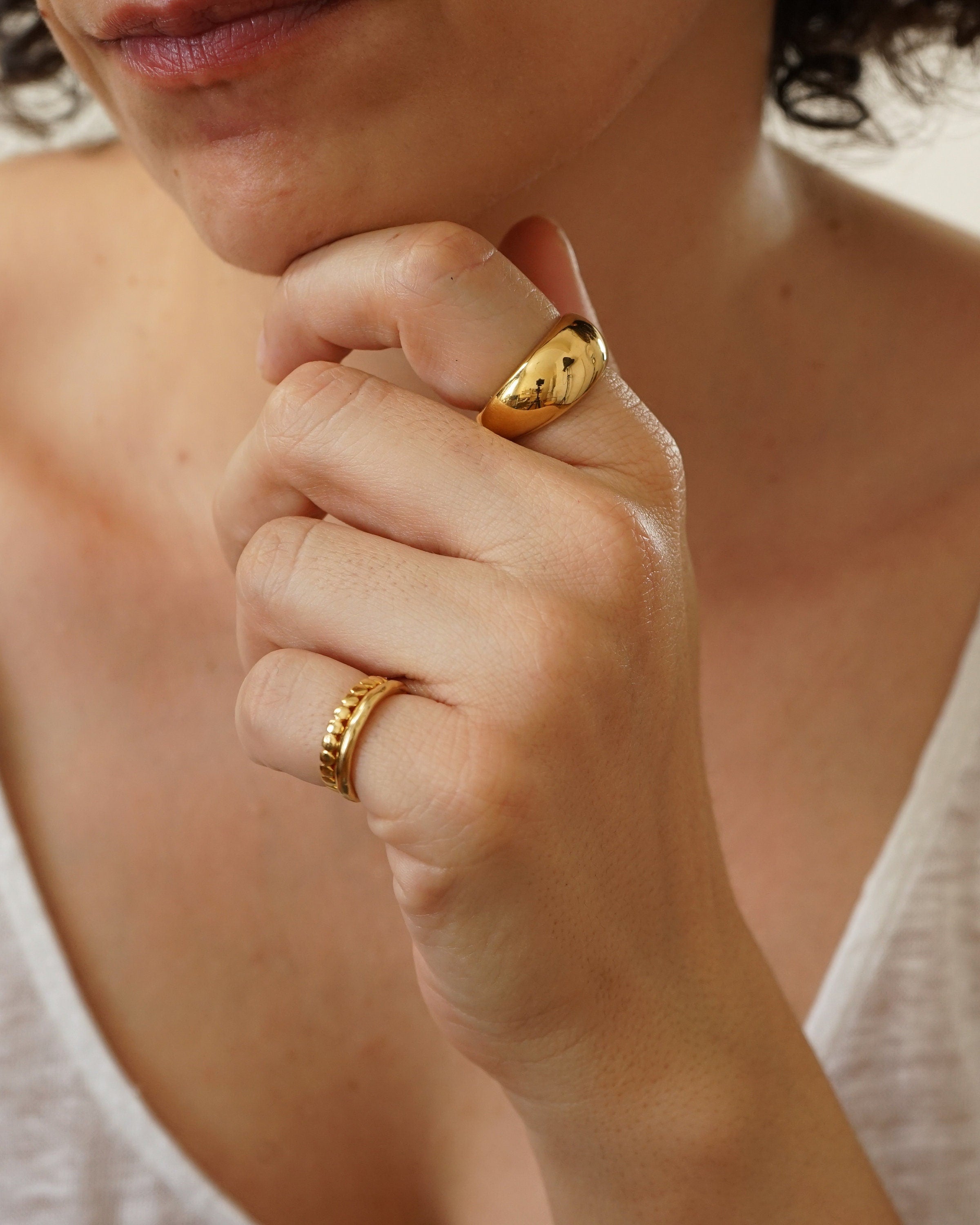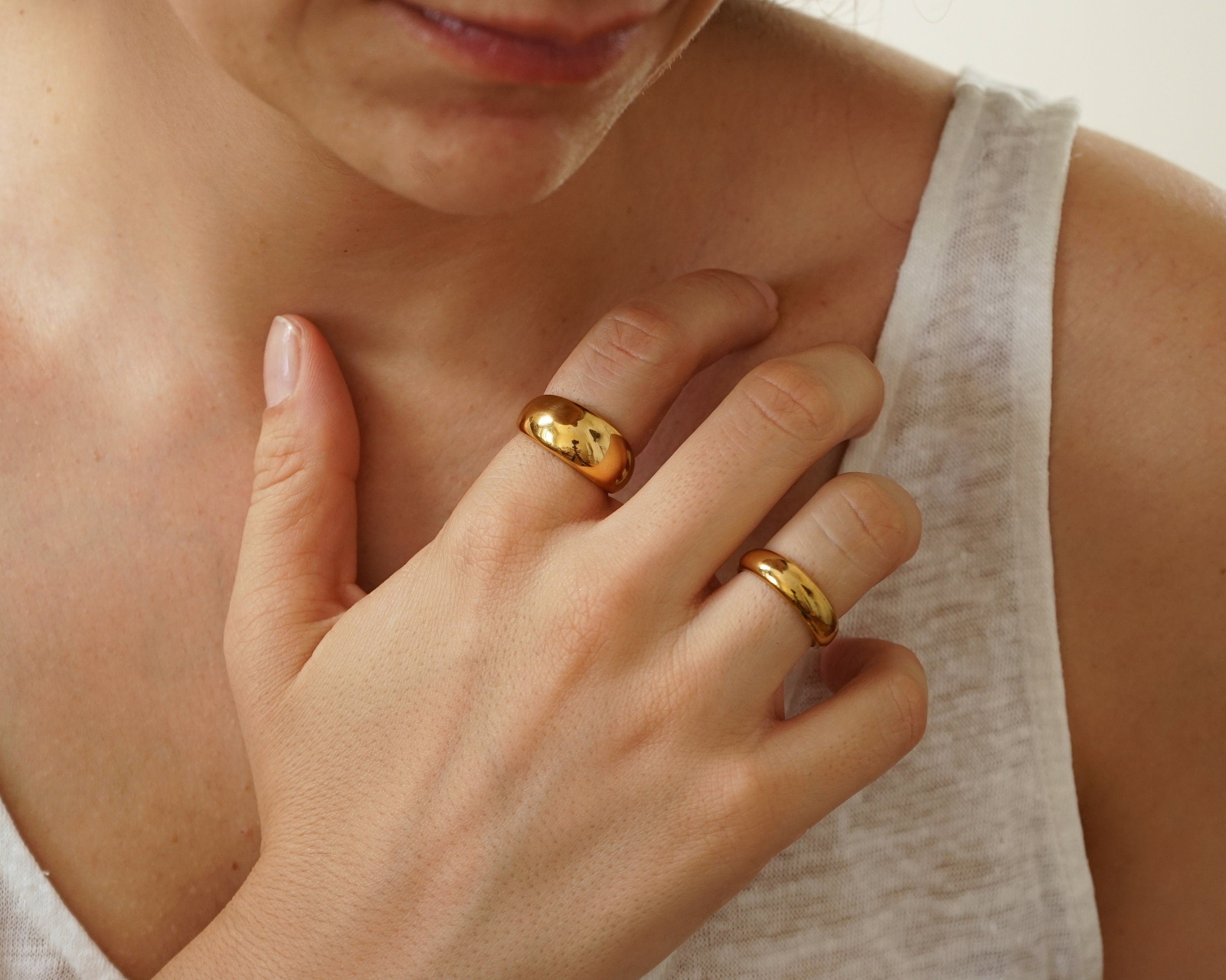 Looking for a ring that adds a touch of flair to your style? Meet our fabulous 18K gold-plated stainless steel DOME ring! With its unique design, this ring is not just an accessory; it's a bold statement piece that’s sure to turn heads. Available in two chic styles, it effortlessly blends classic charm with modern appeal, making it perfect for any occasion.