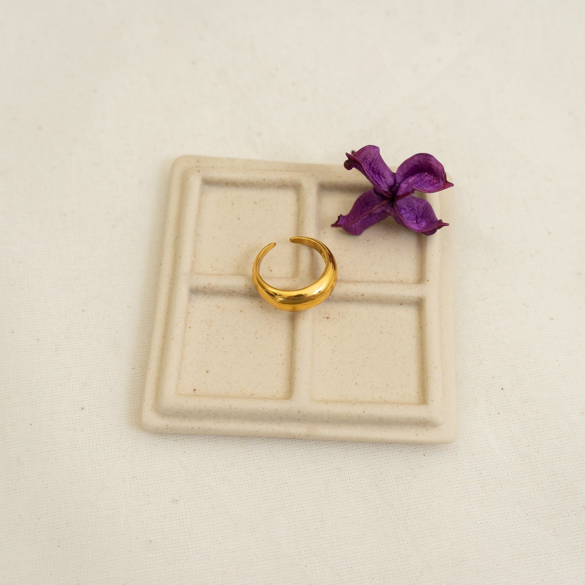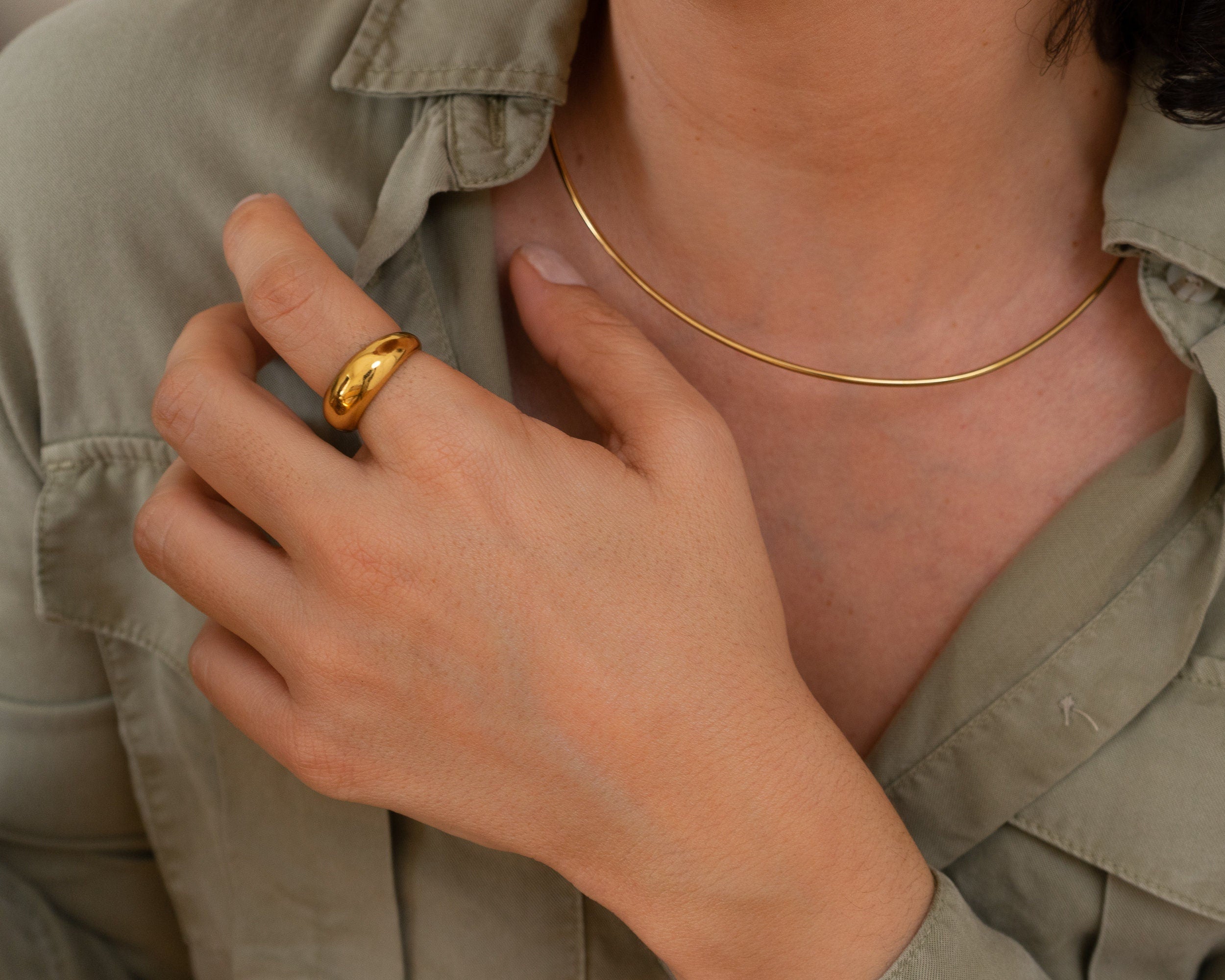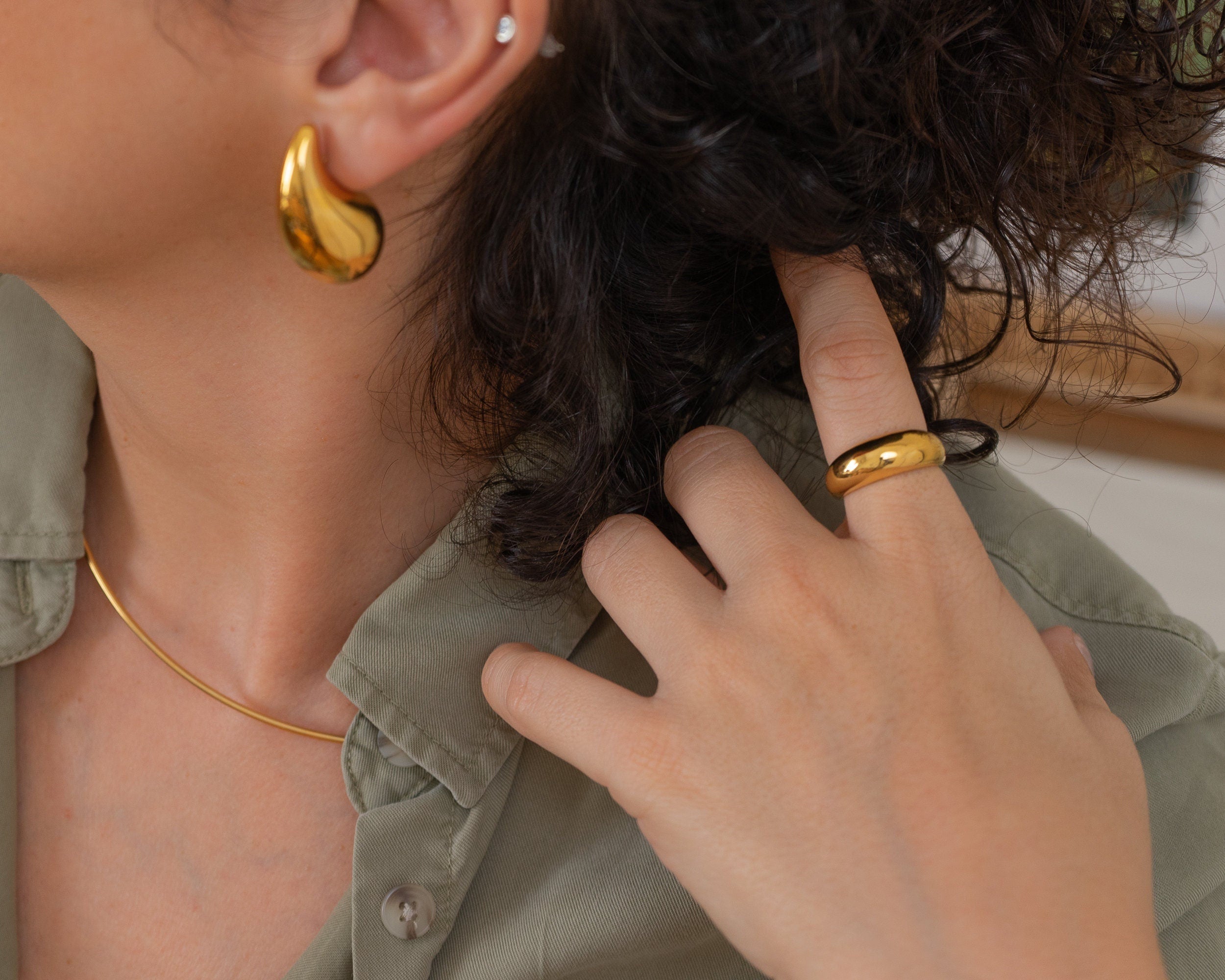 A unique 18K gold-plated stainless steel statement DOME ring. This is a classic design and a timeless piece. It can be worn on the index, middle, or ring finger. It can be worn alone or in combination with other rings. Its unique shape makes it a statement piece that you will wear for years to come.