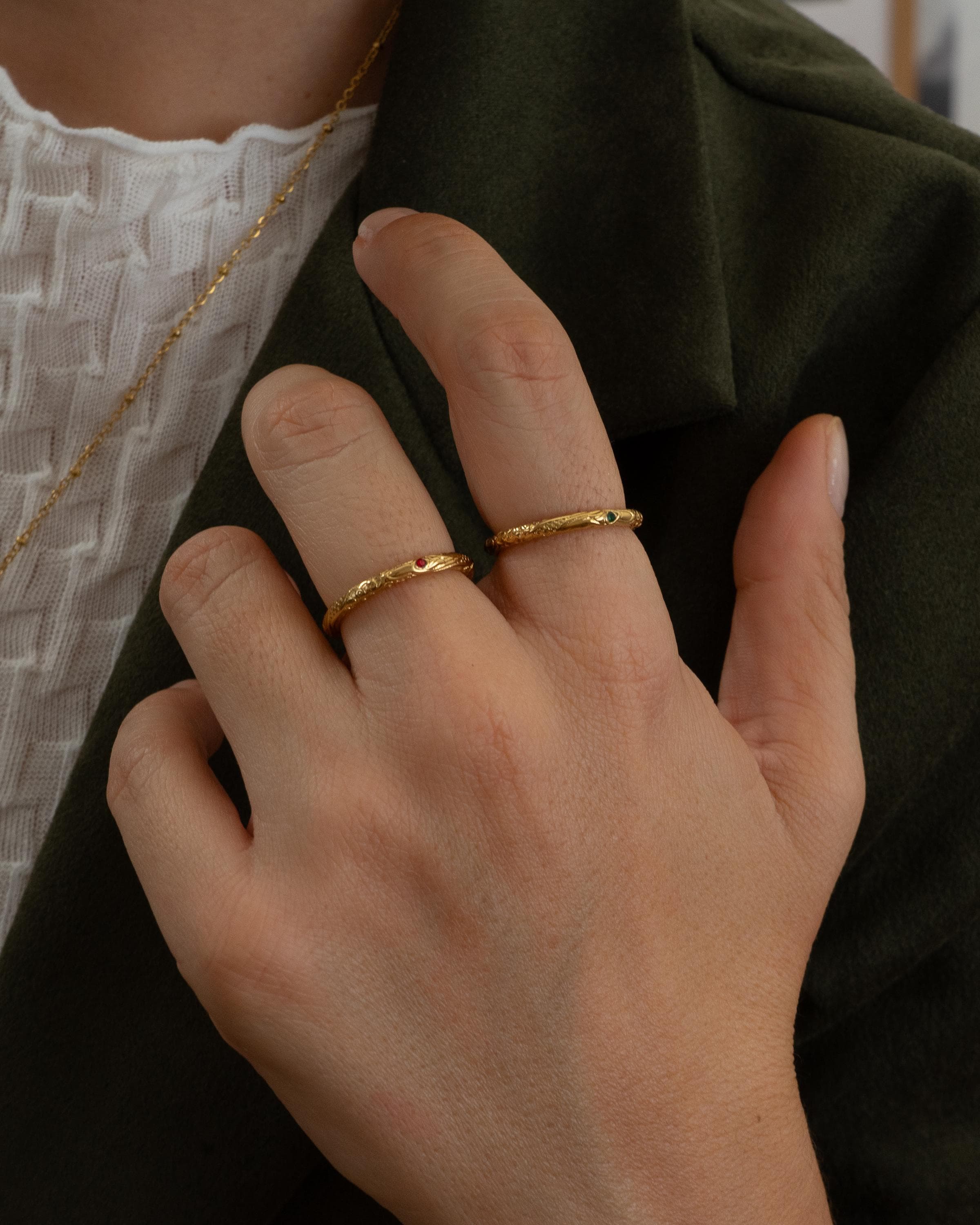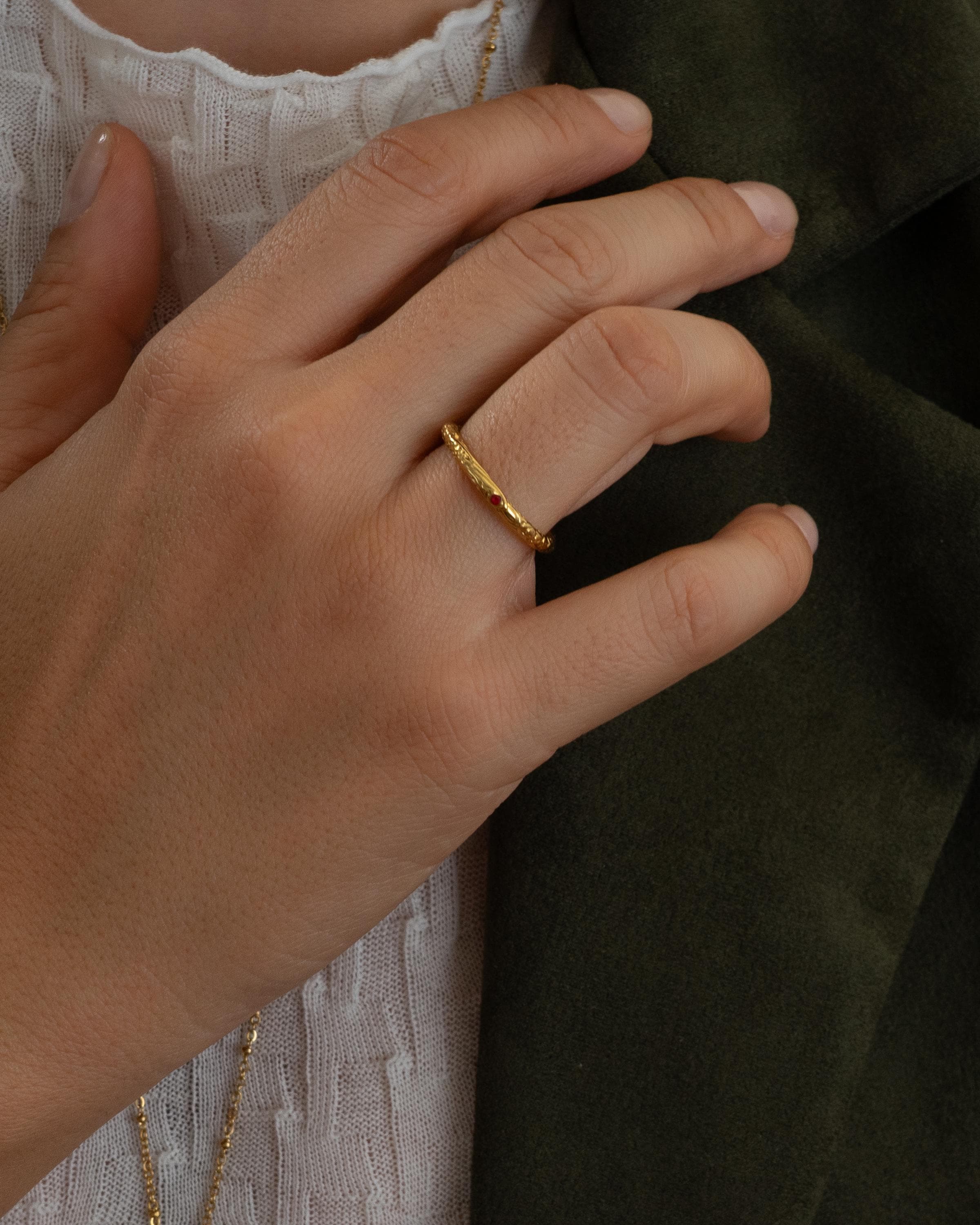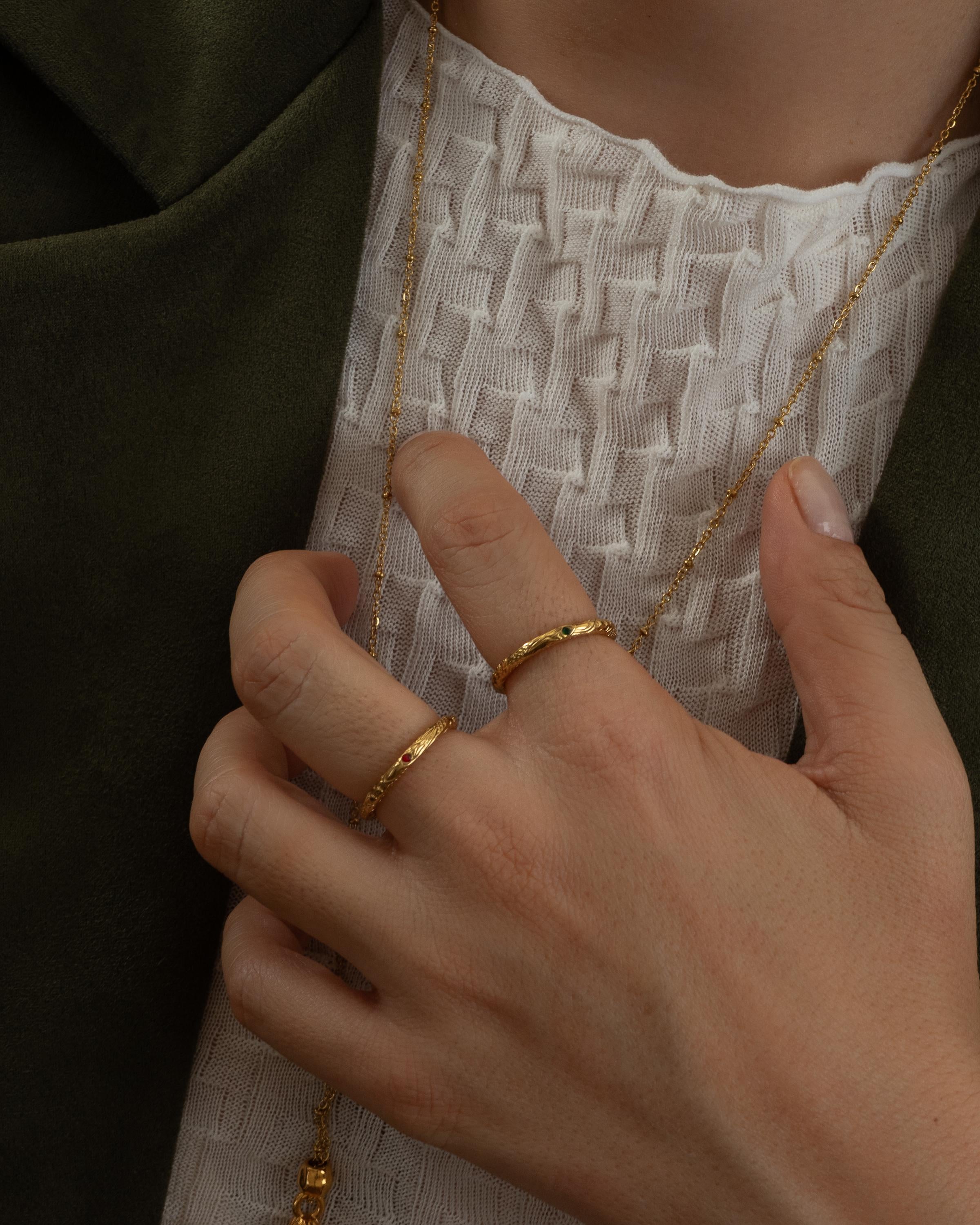 This engraved gold stainless steel ring is the perfect addition to your minimalist jewelry collection. Featuring a slim 2.5mm band with intricate textural engraving and a single zircon accent stone, it delivers effortless style with subtle detail.