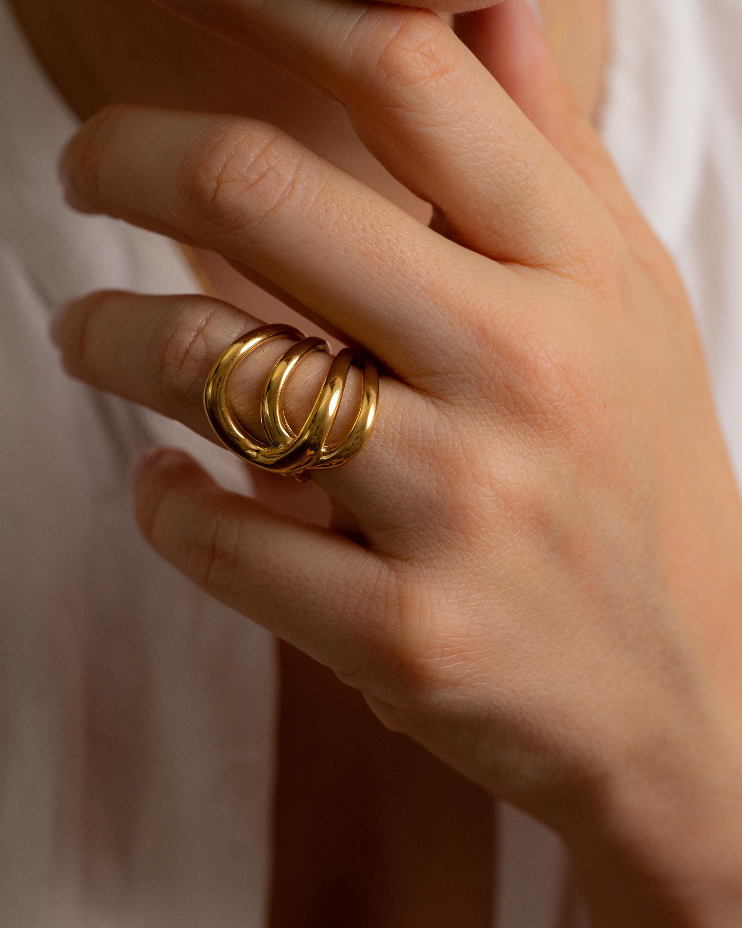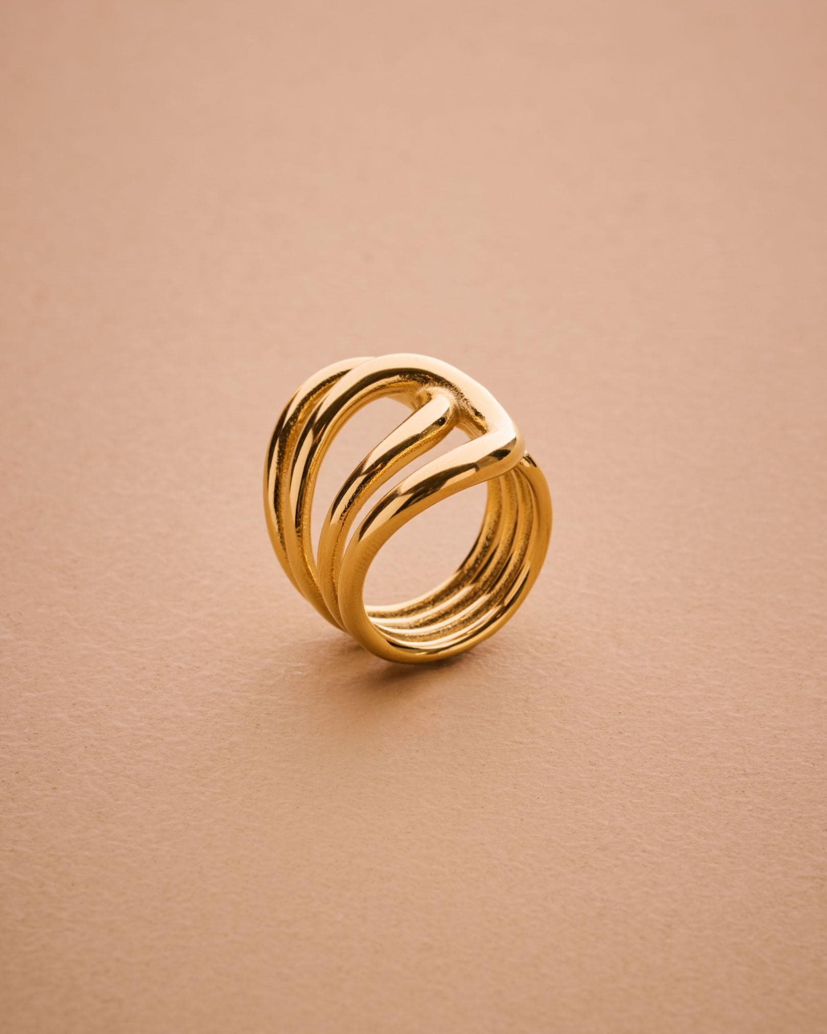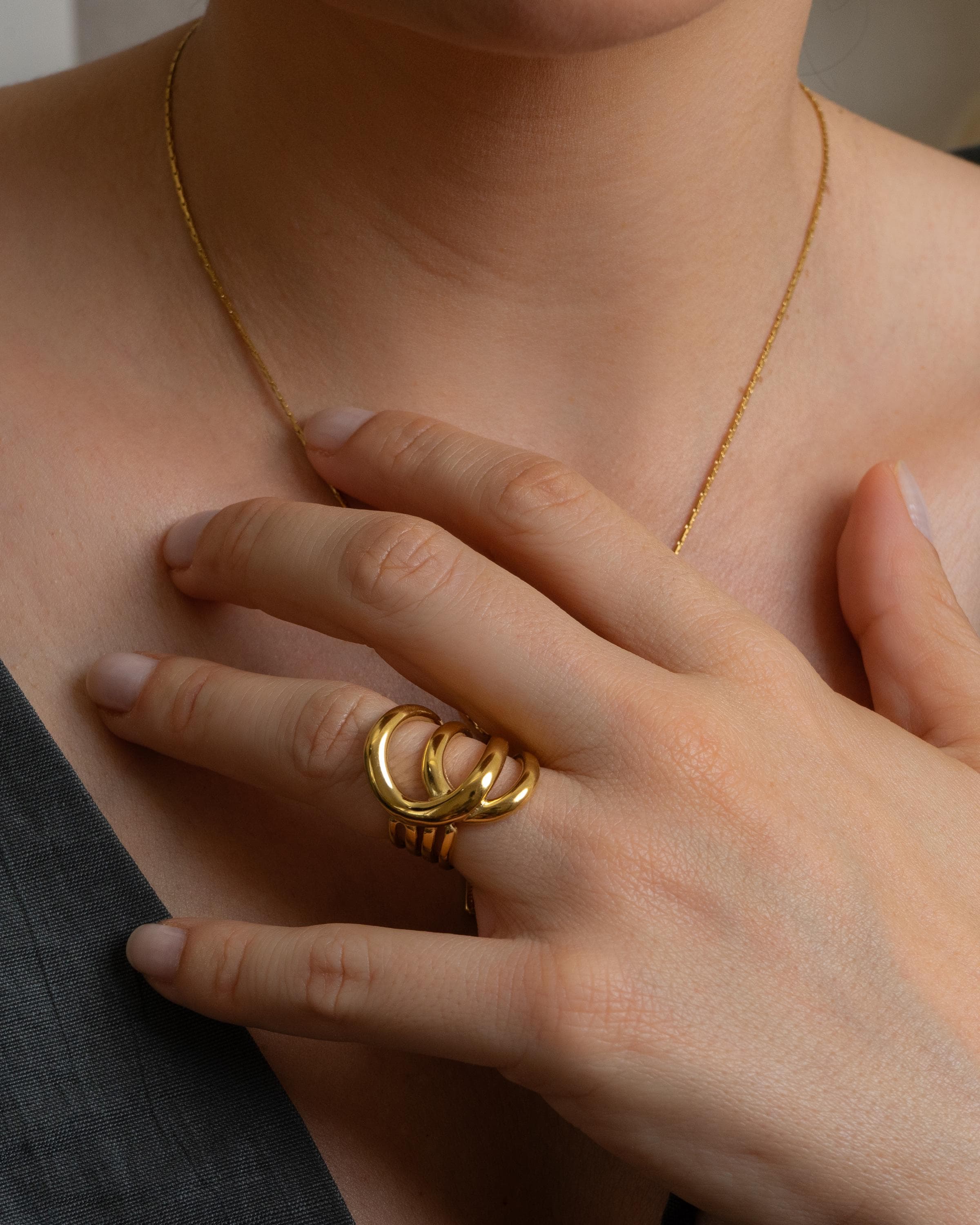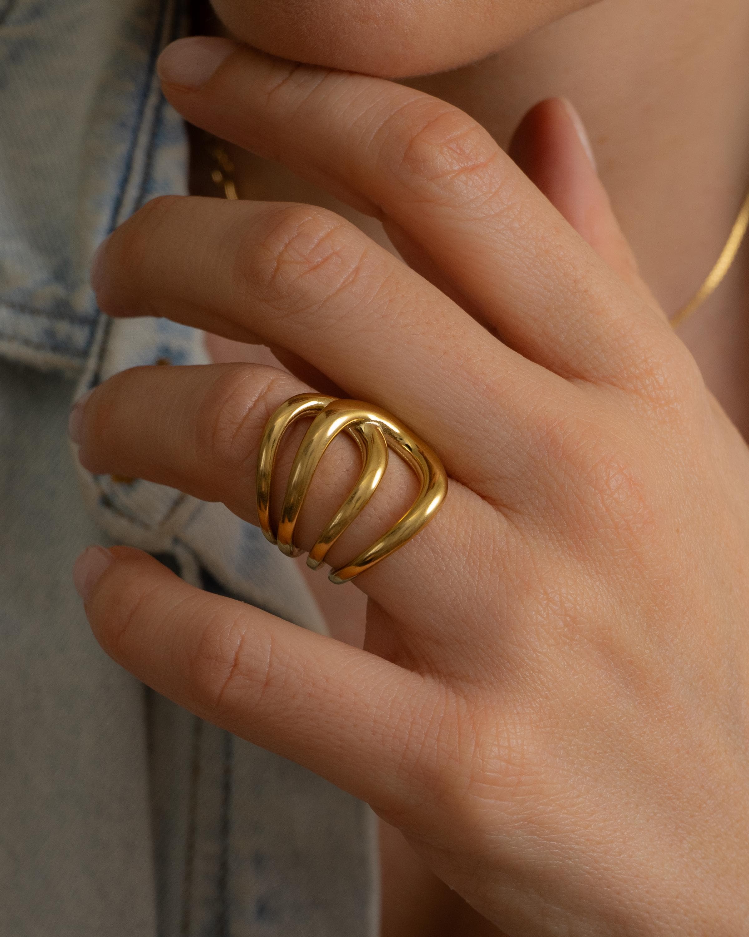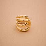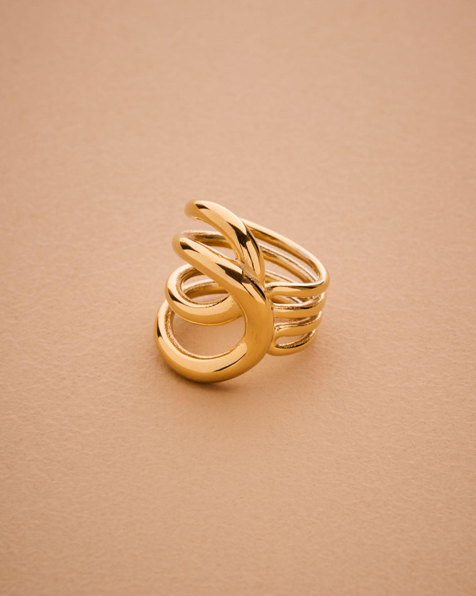 This gold stainless steel sculptural ring features a modern open design with smooth curves. Elegant yet bold, it’s the perfect statement piece for everyday wear. Waterproof, hypoallergenic, and available in sizes 7 and 8.