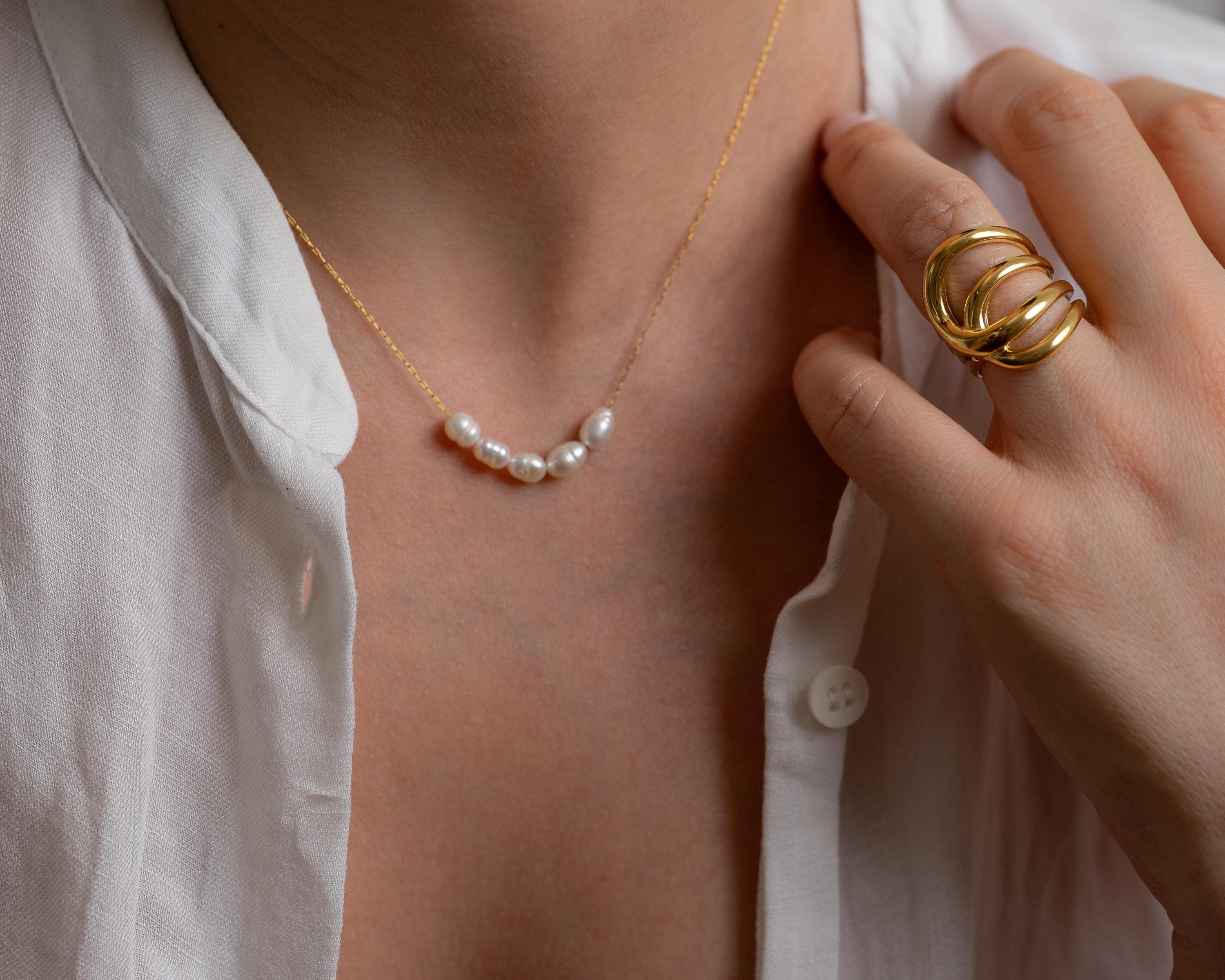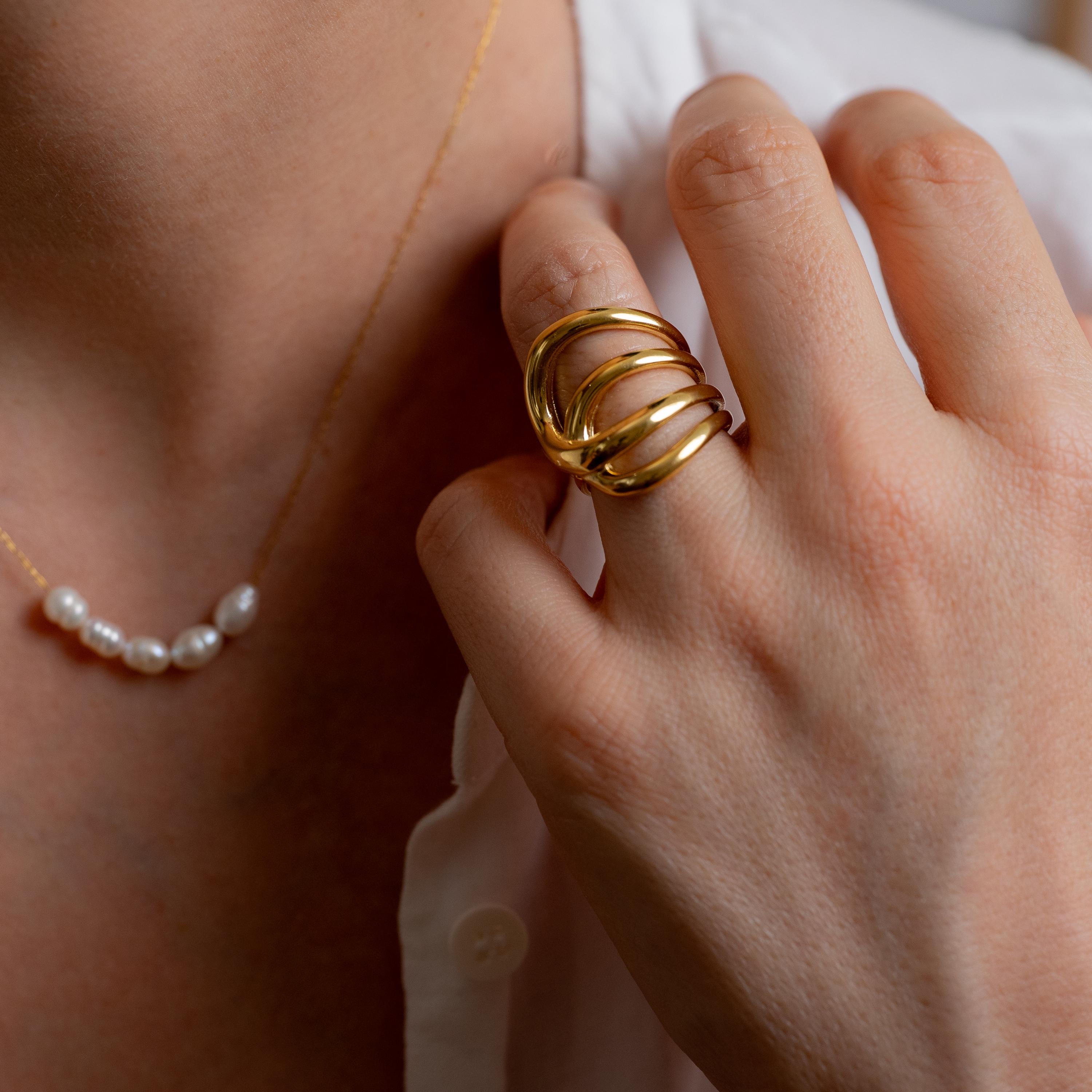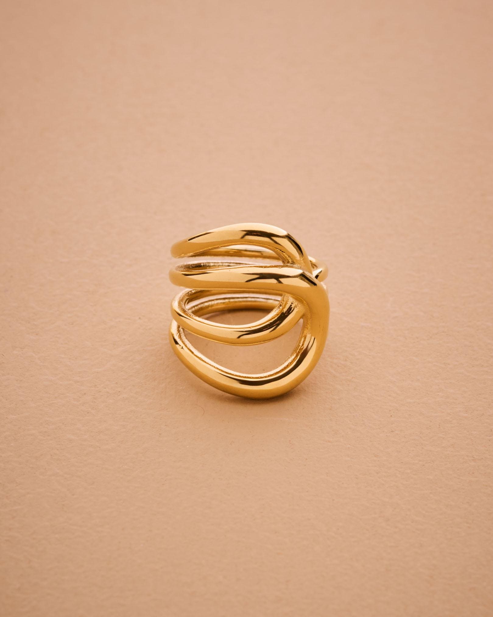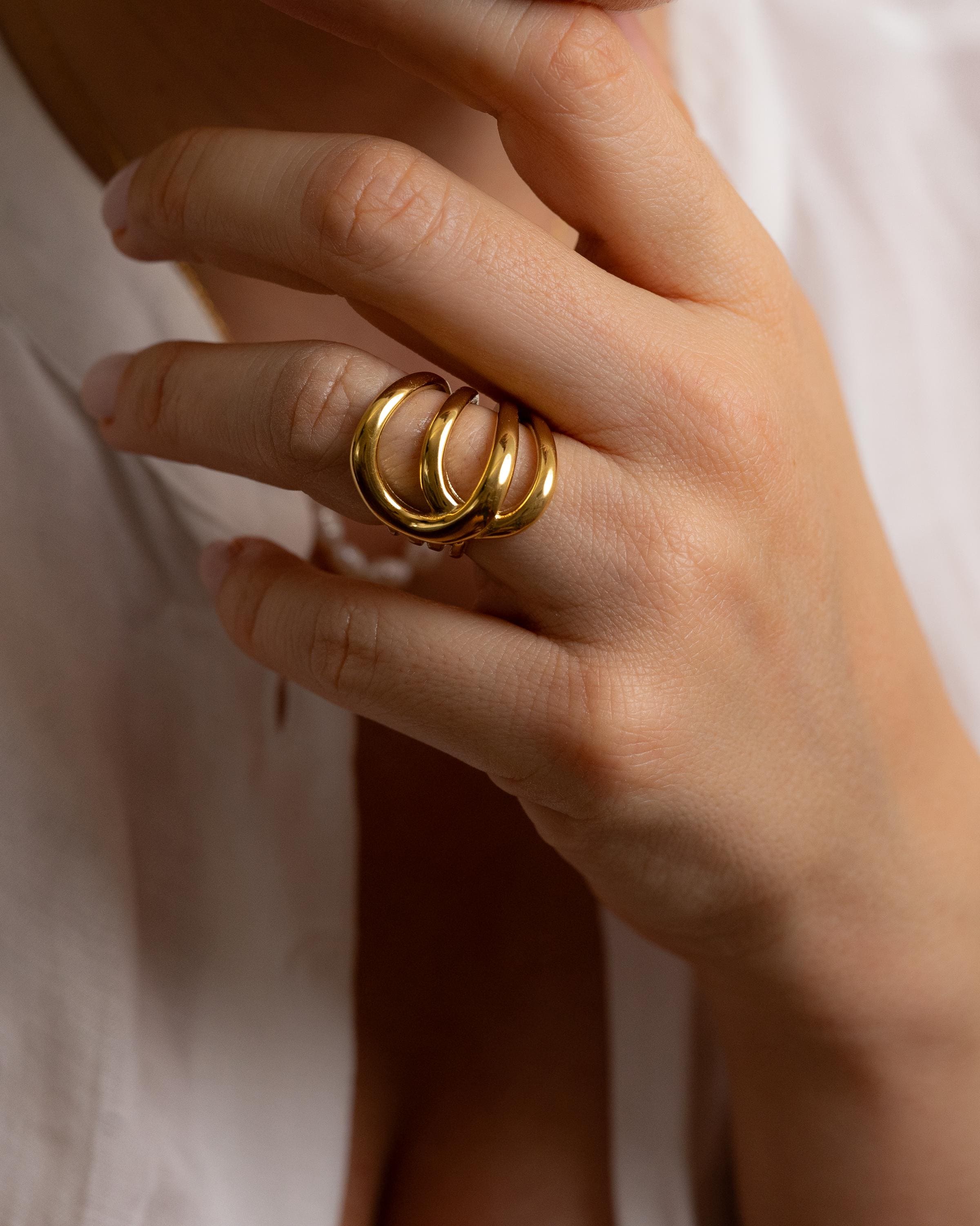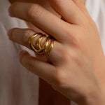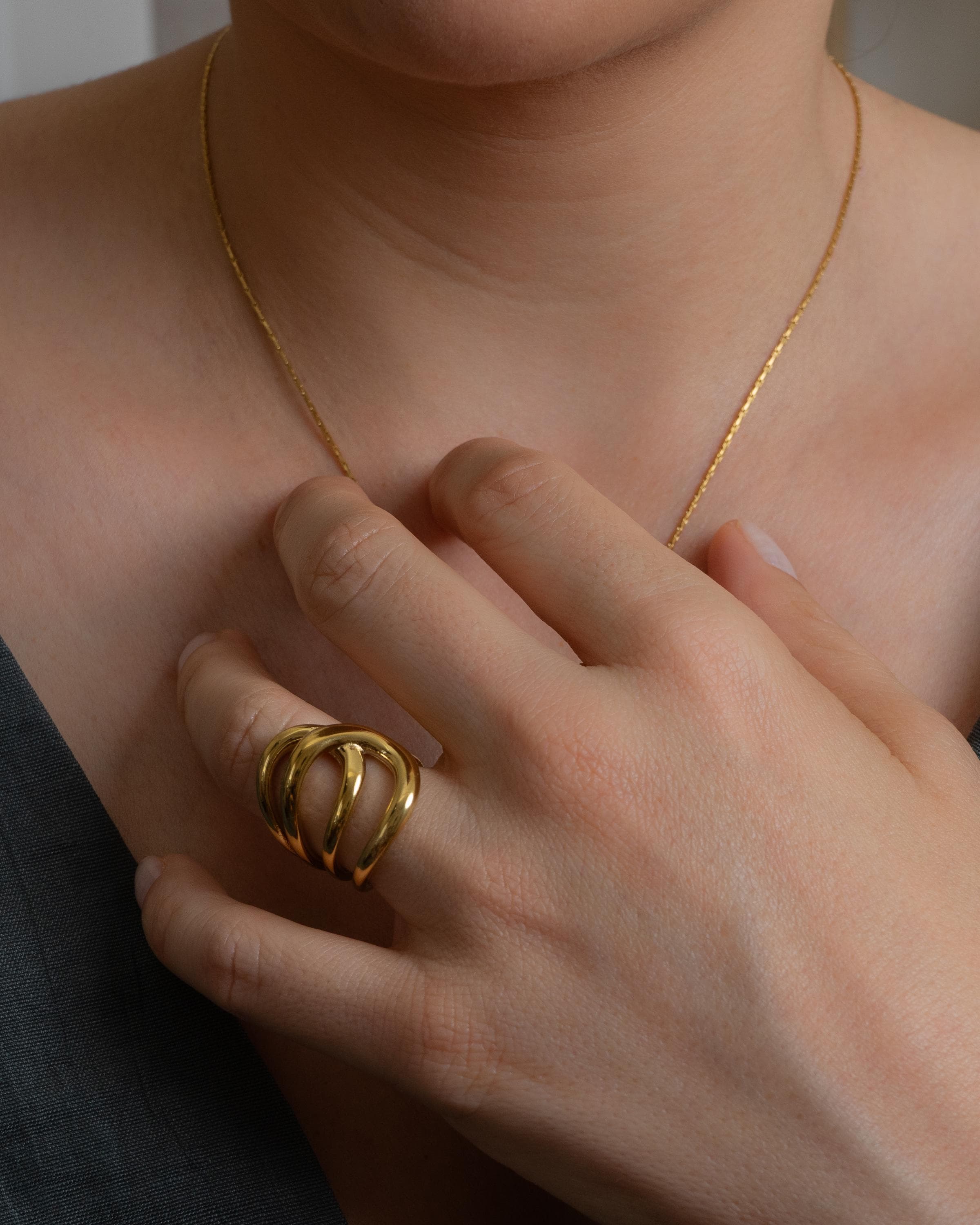 This gold stainless steel sculptural ring features a modern open design with smooth curves. Elegant yet bold, it’s the perfect statement piece for everyday wear. Waterproof, hypoallergenic, and available in sizes 7 and 8.
