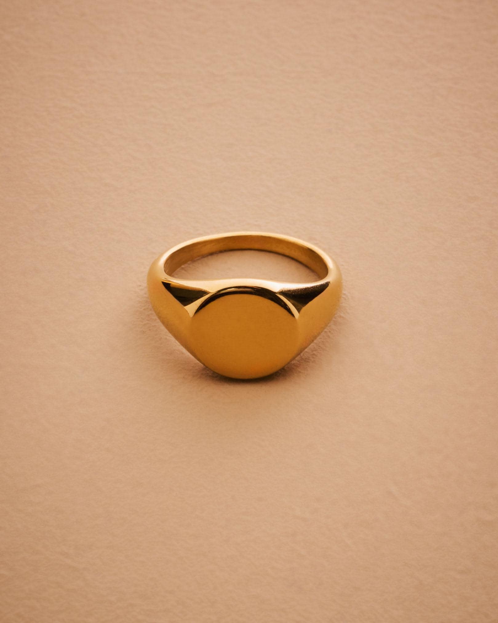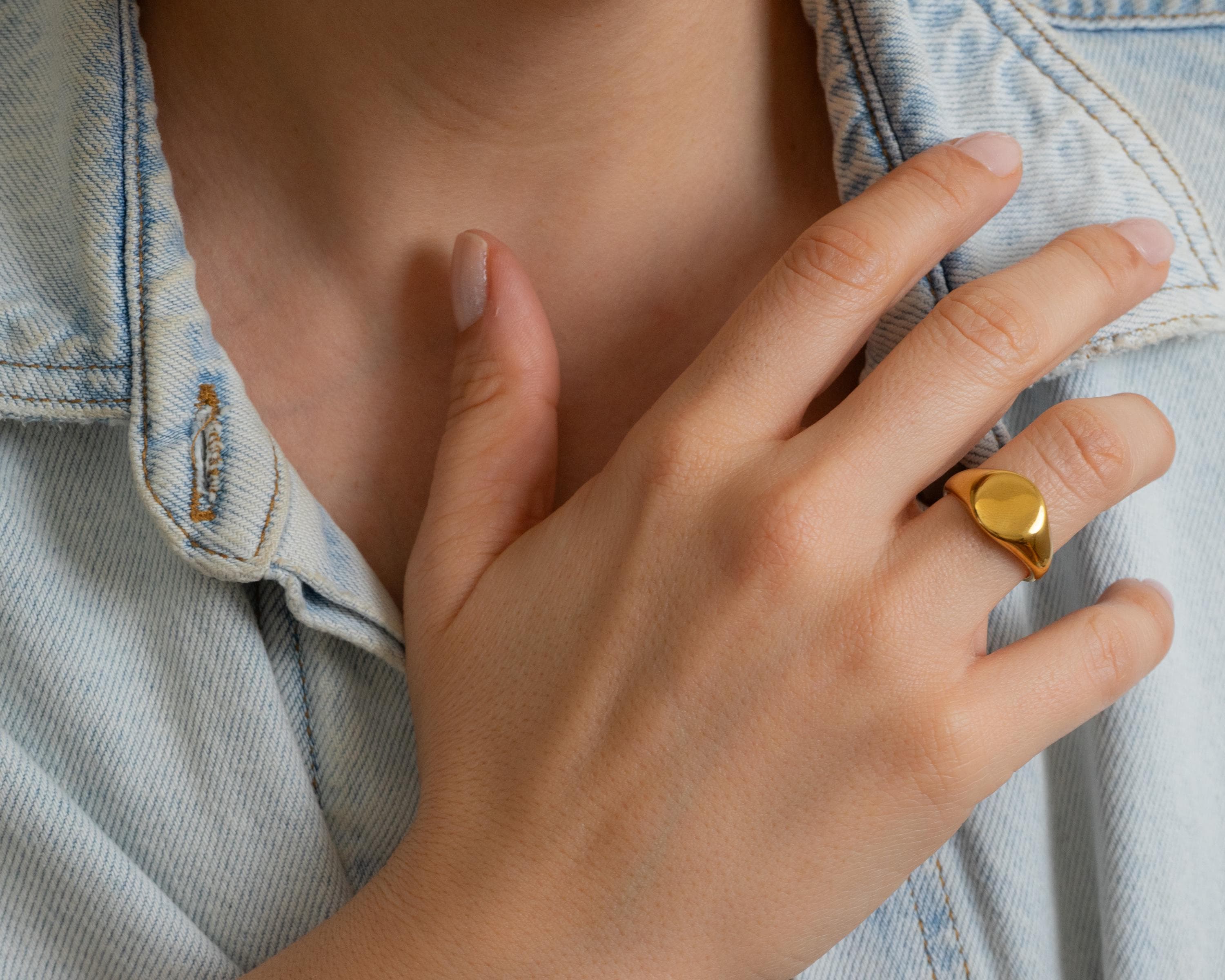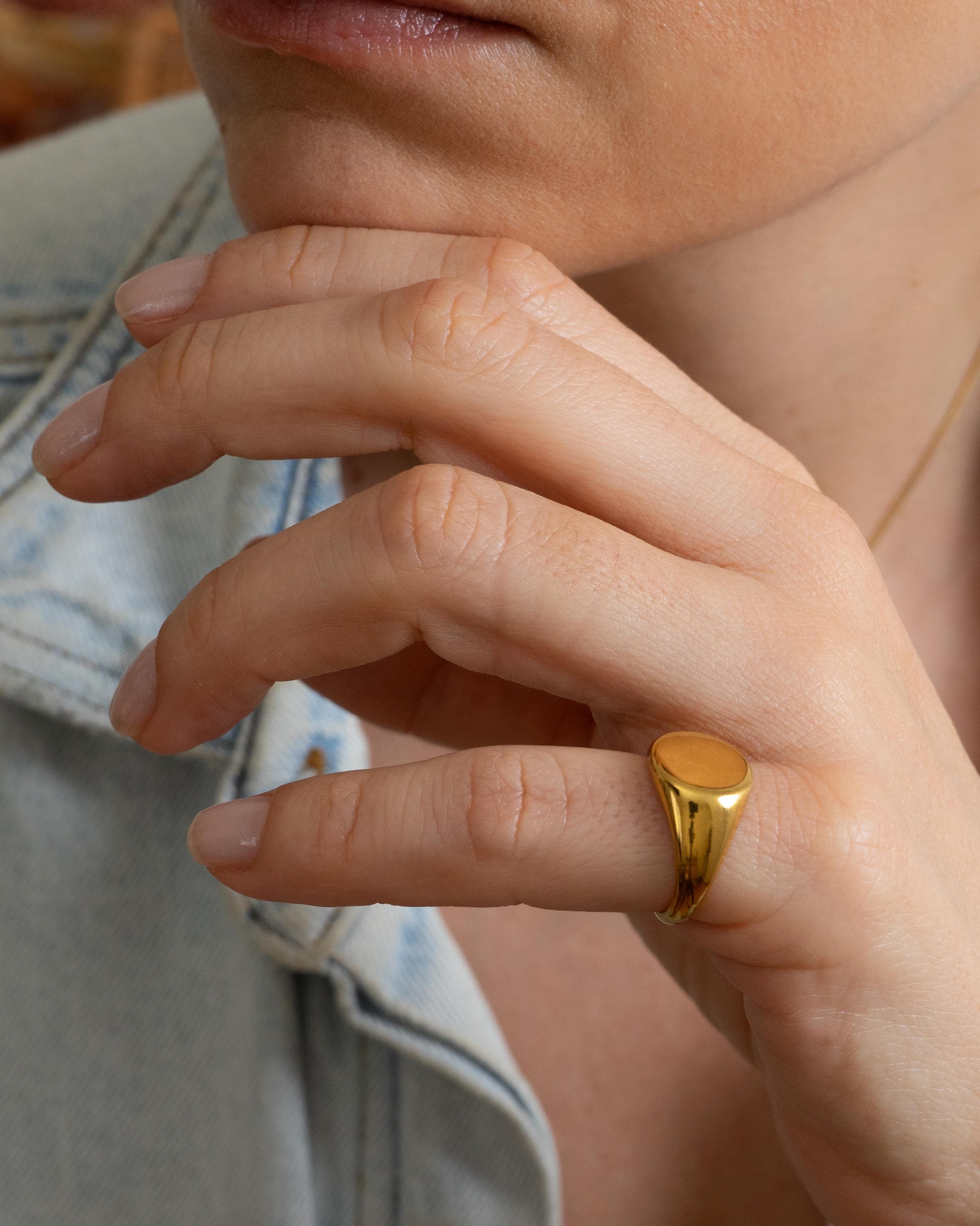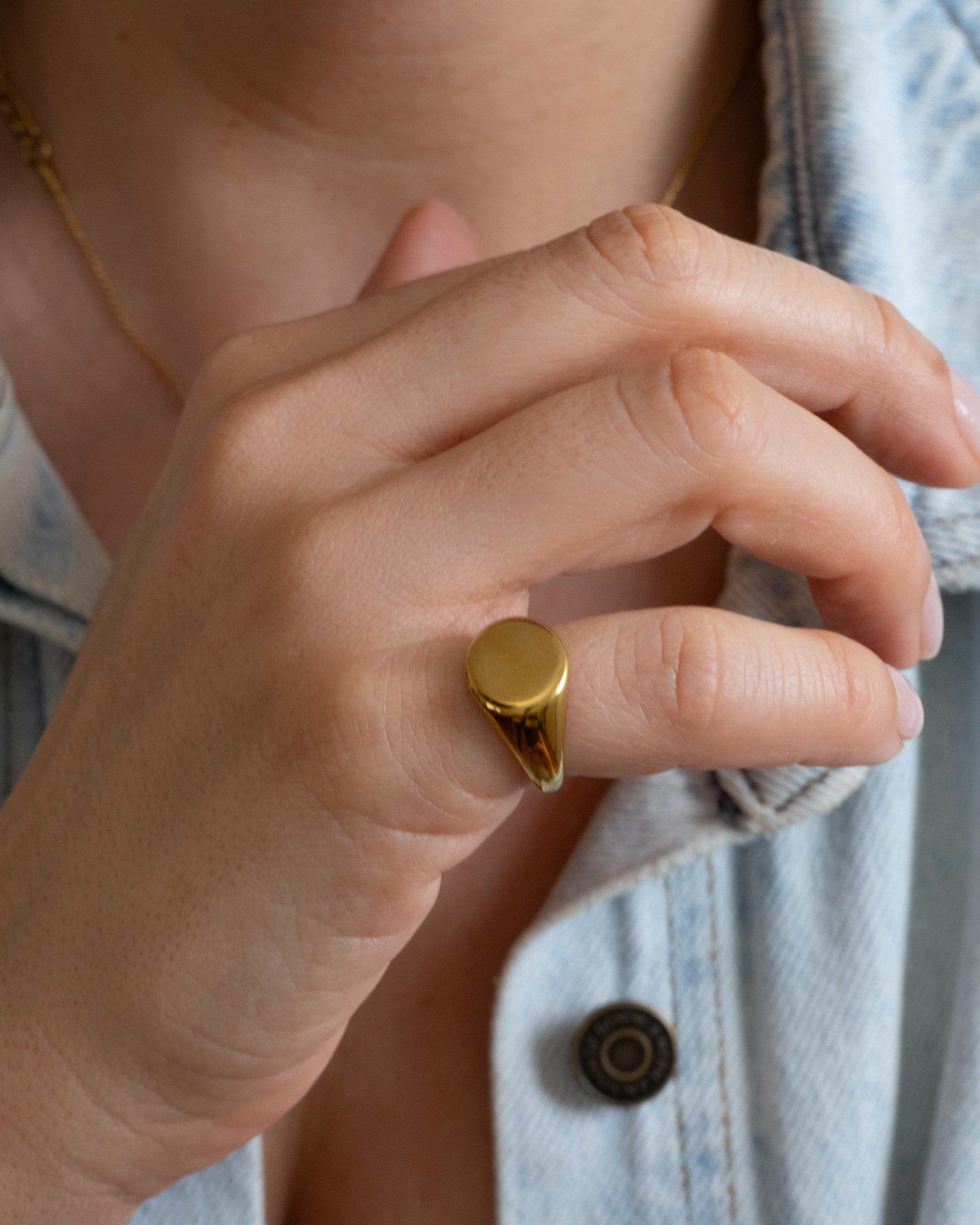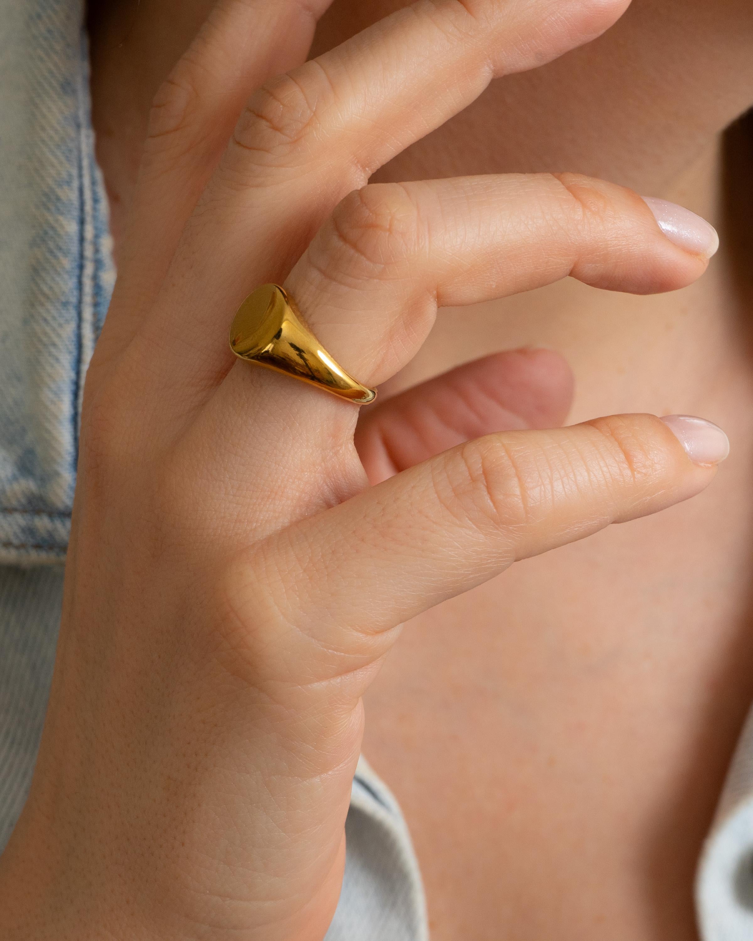 A modern take on the classic signet ring, reimagined in polished gold stainless steel. Clean, minimal, and perfectly balanced, this piece is designed to be worn every day — alone for a subtle statement or stacked for a bolder look.