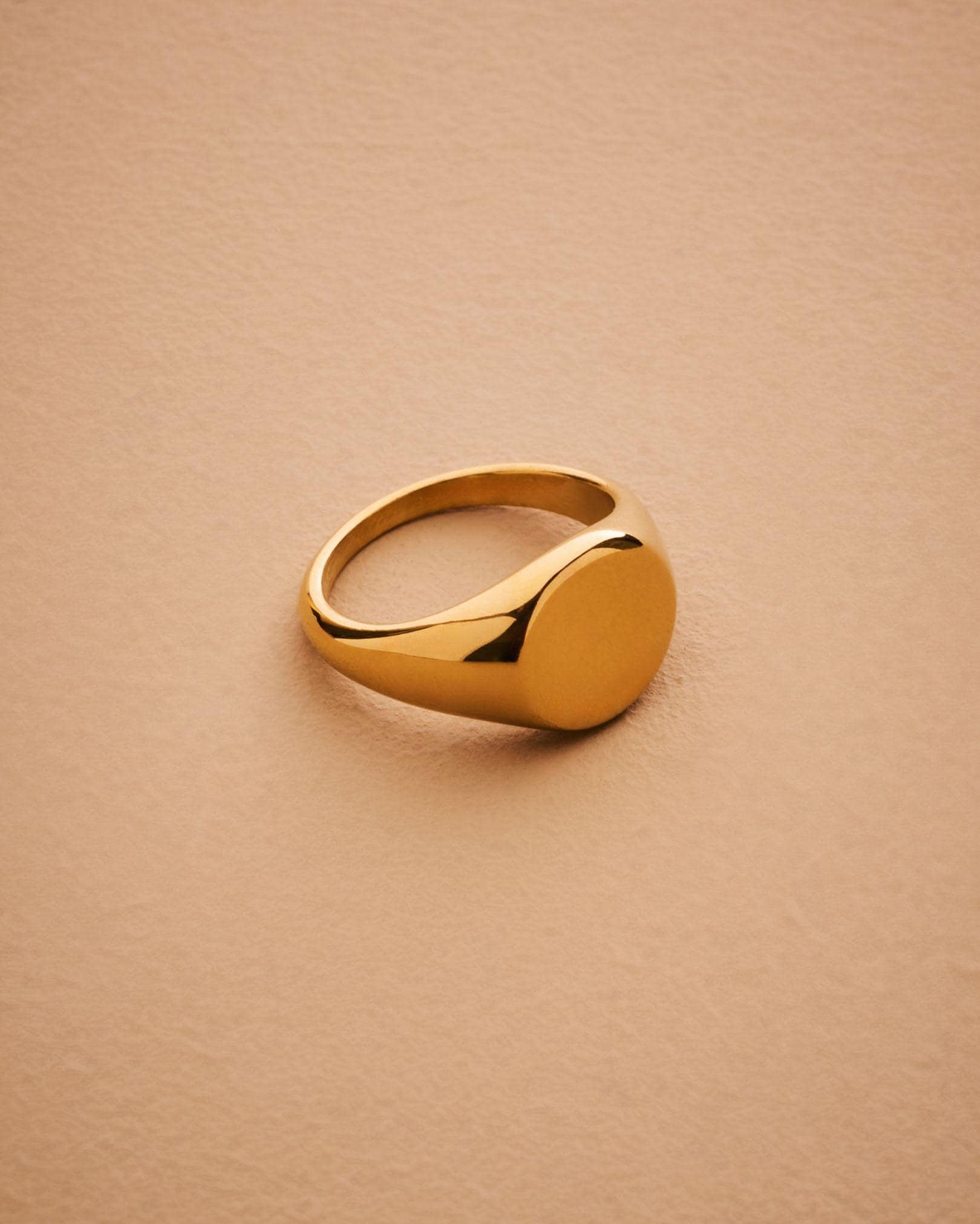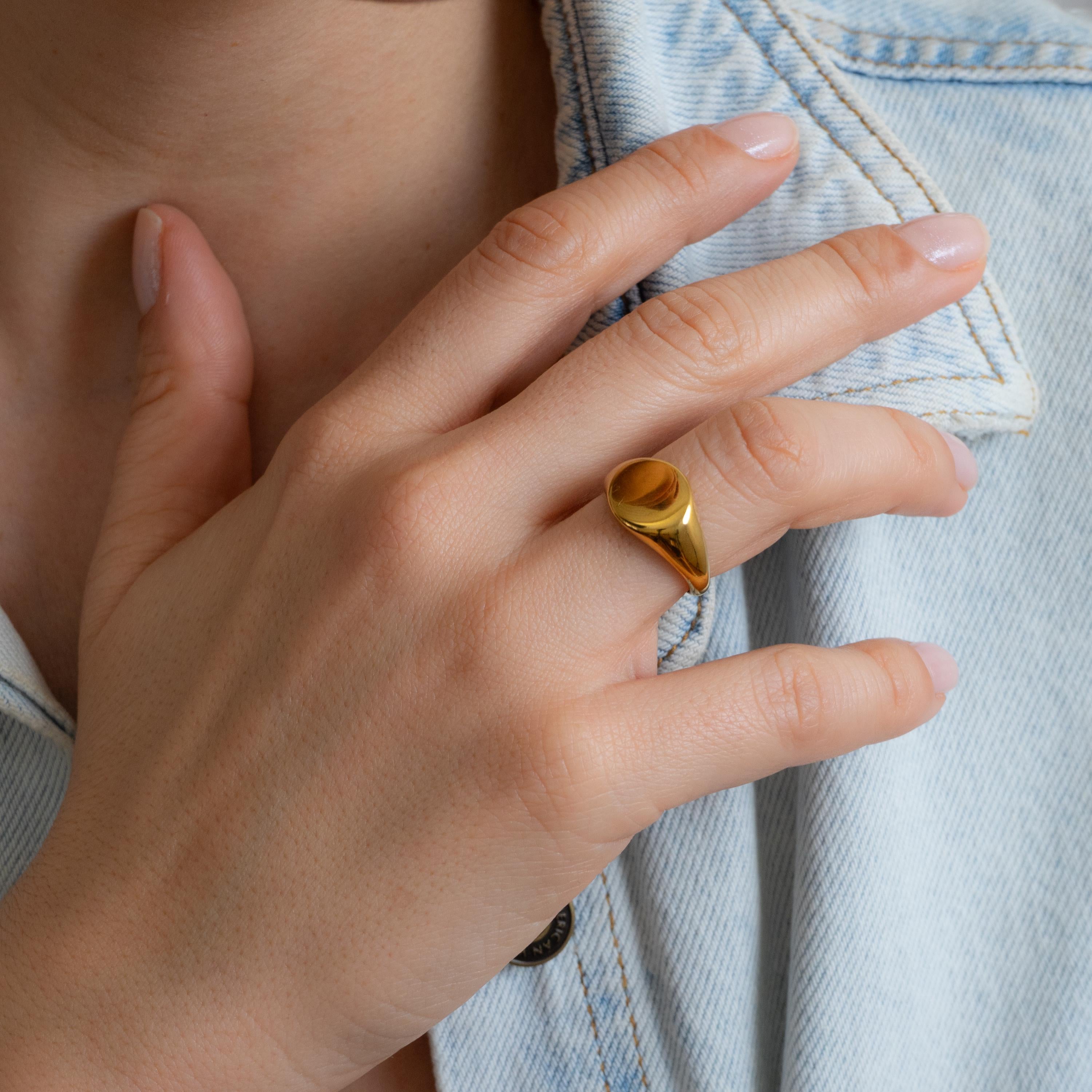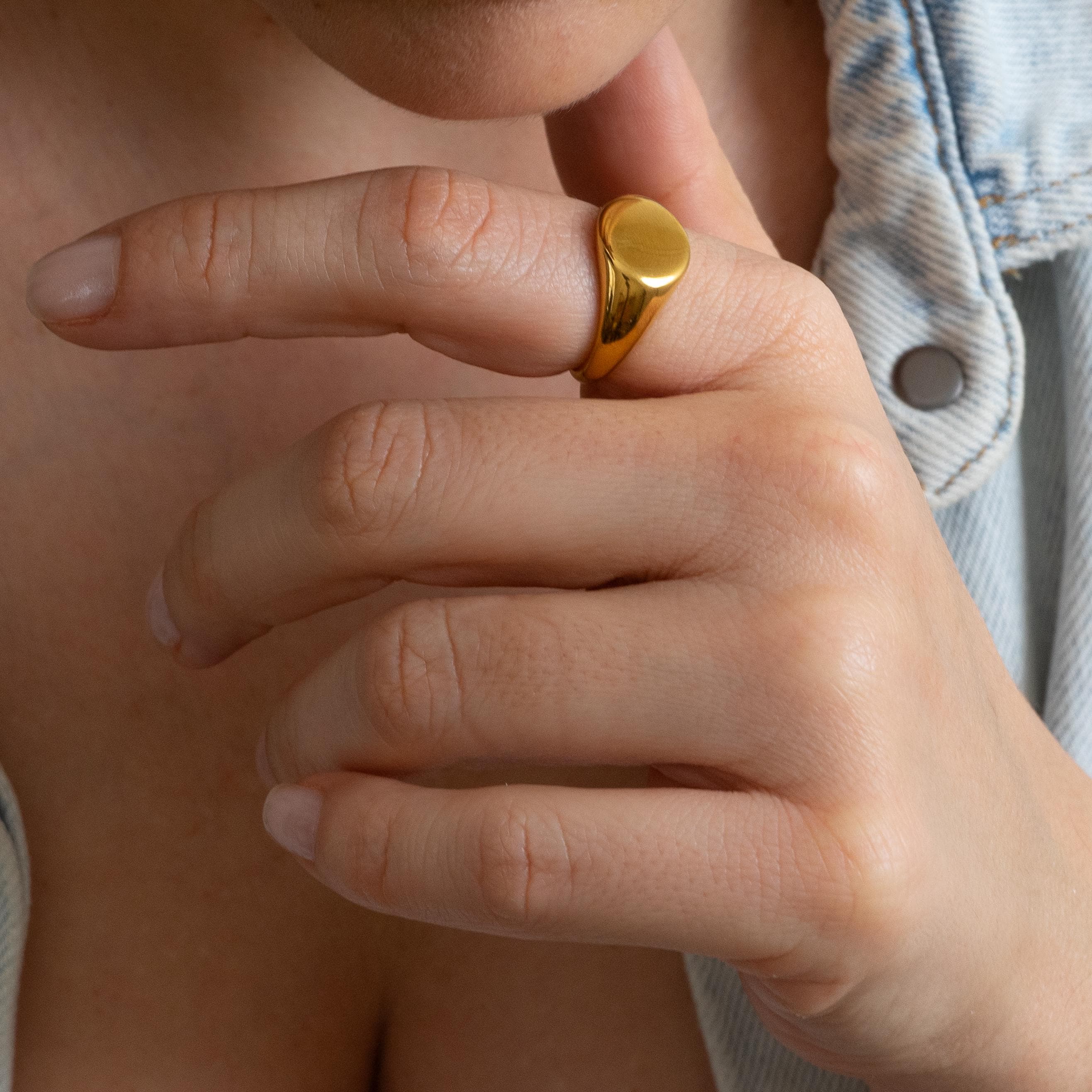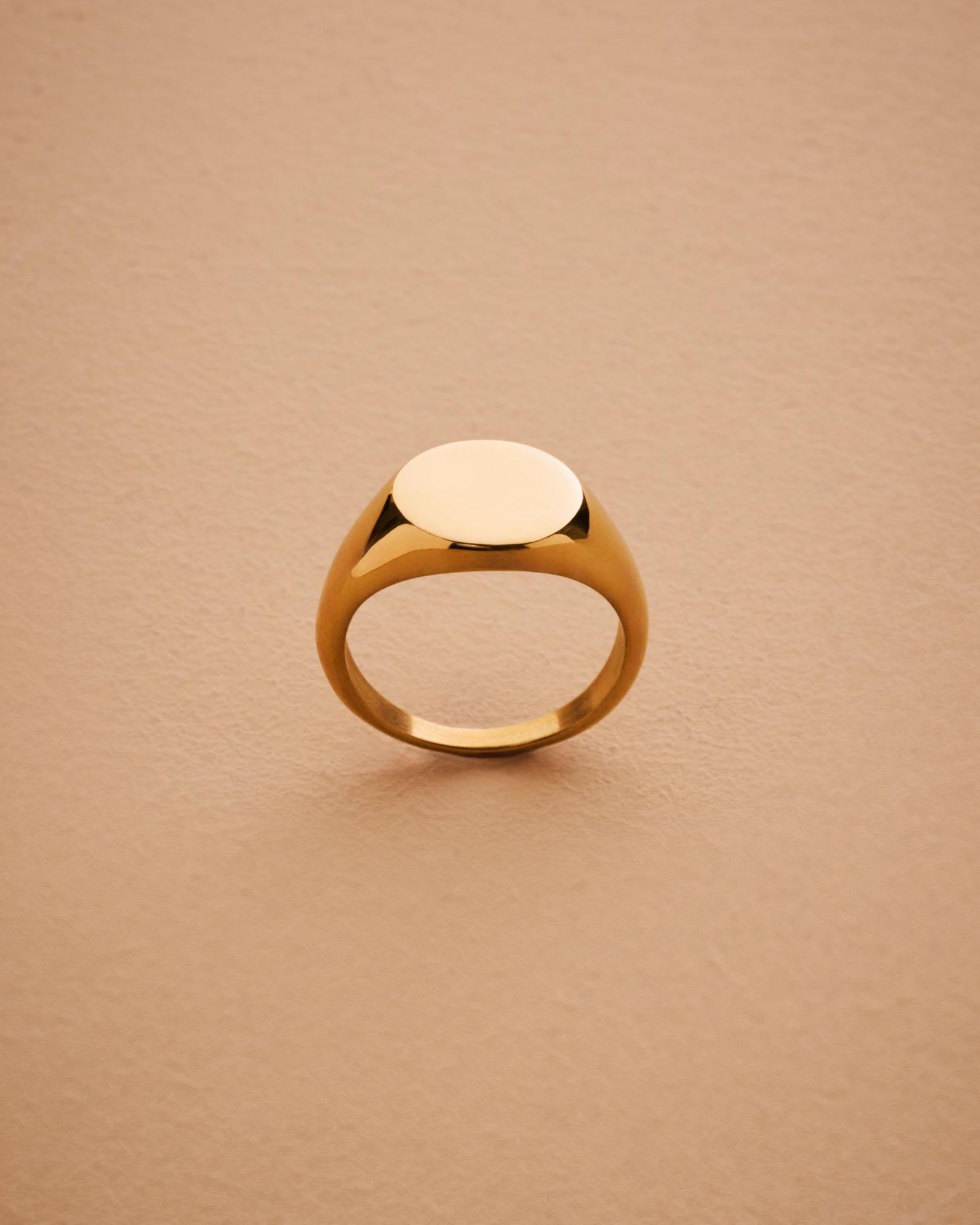 A modern take on the classic signet ring, reimagined in polished gold stainless steel. Clean, minimal, and perfectly balanced, this piece is designed to be worn every day — alone for a subtle statement or stacked for a bolder look.