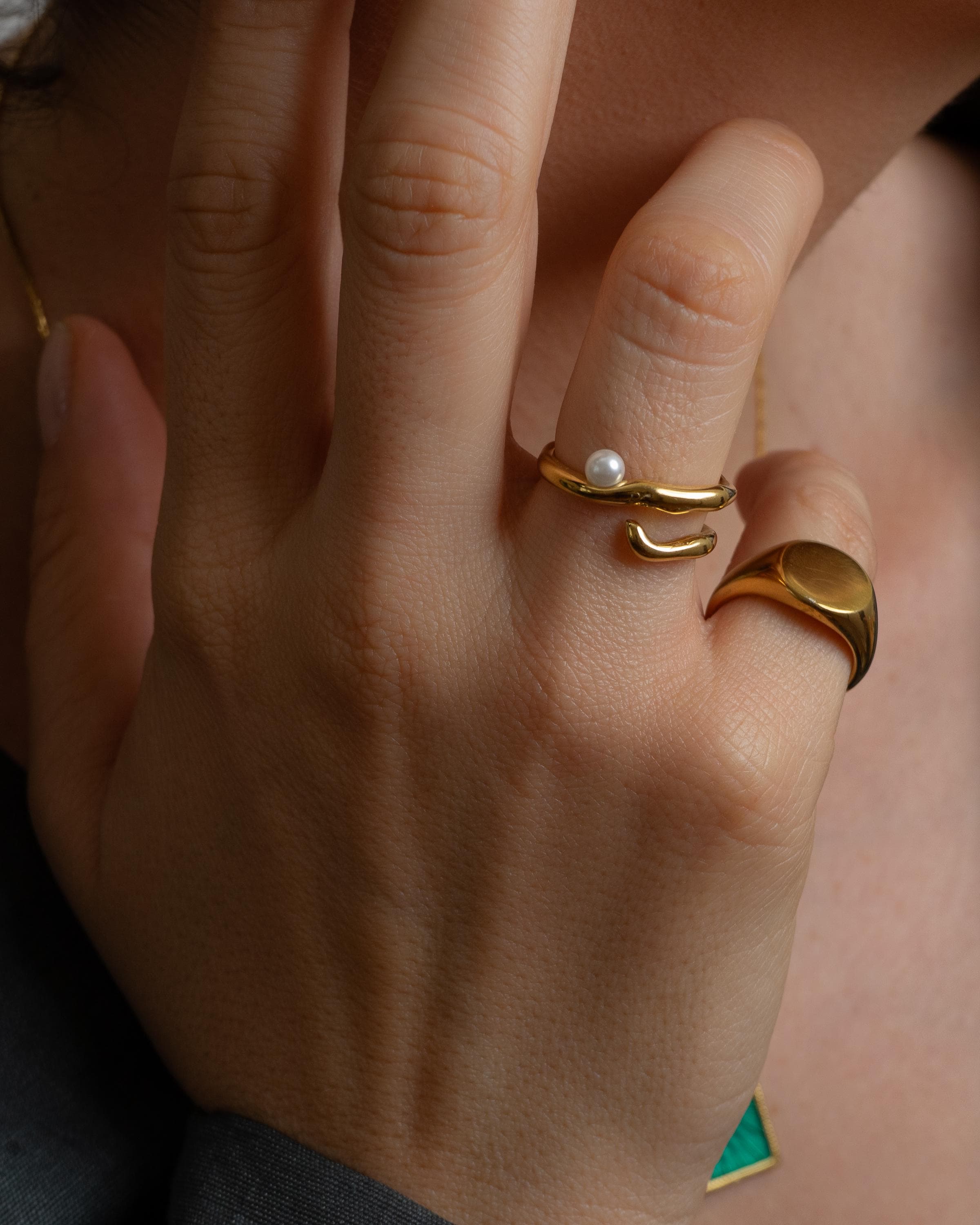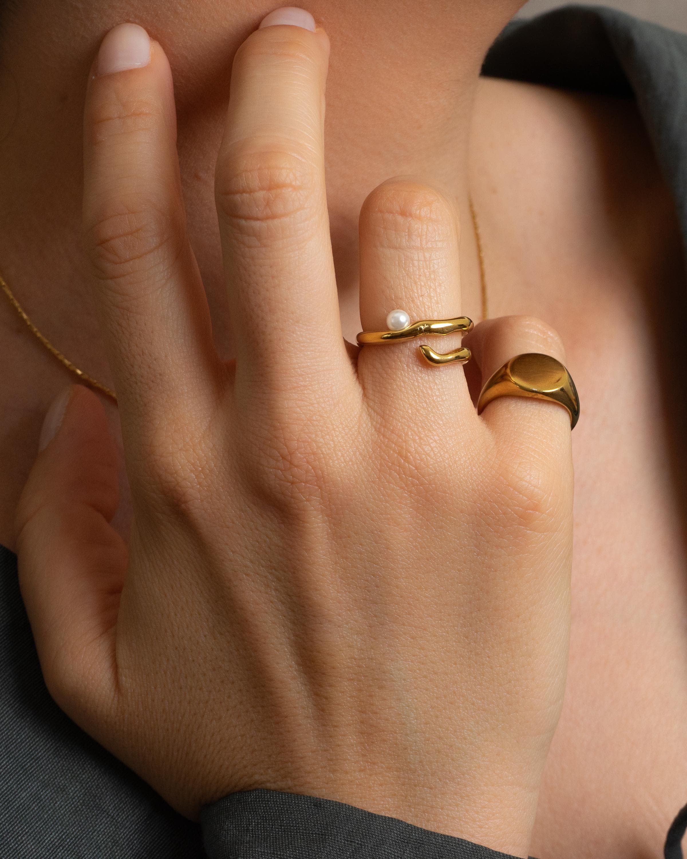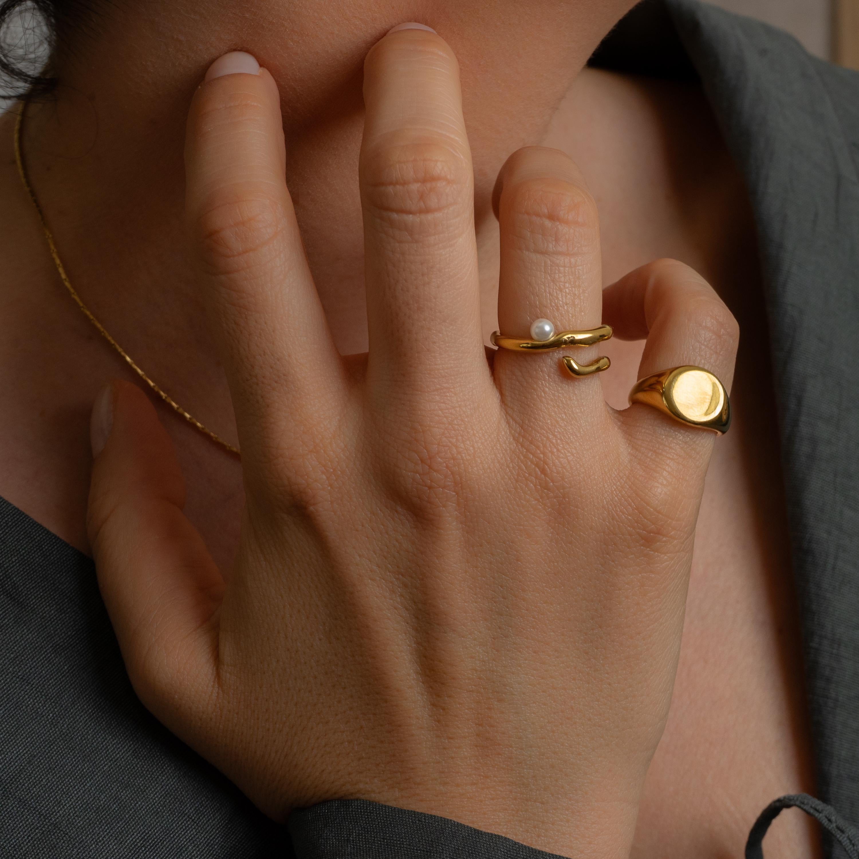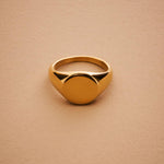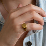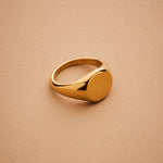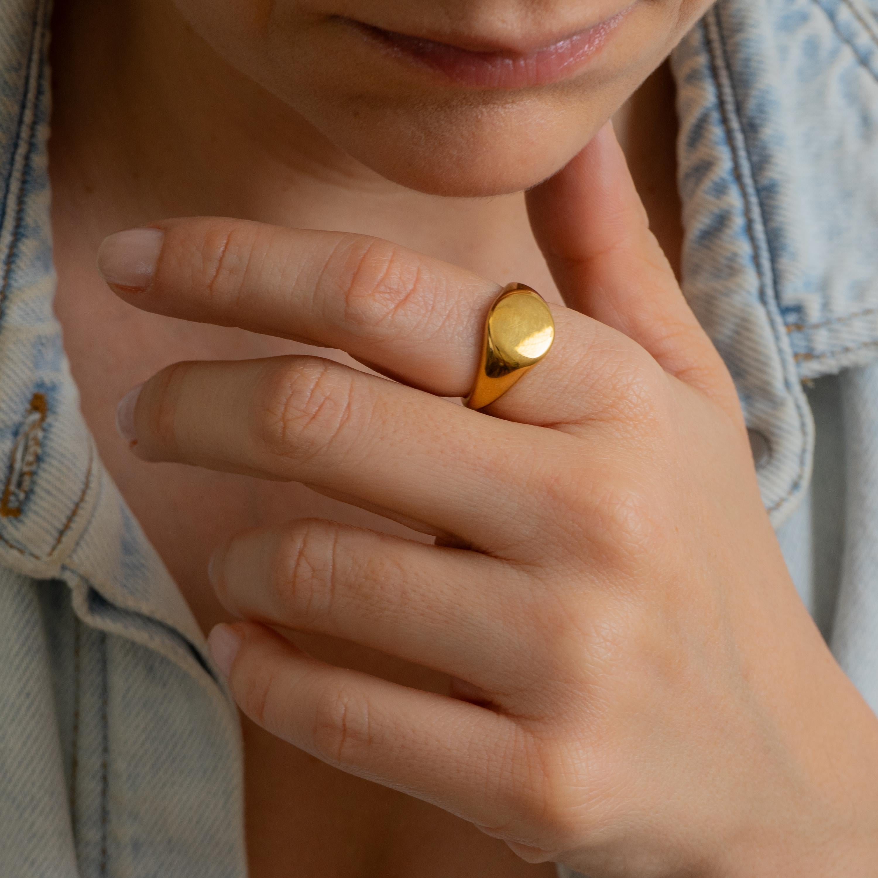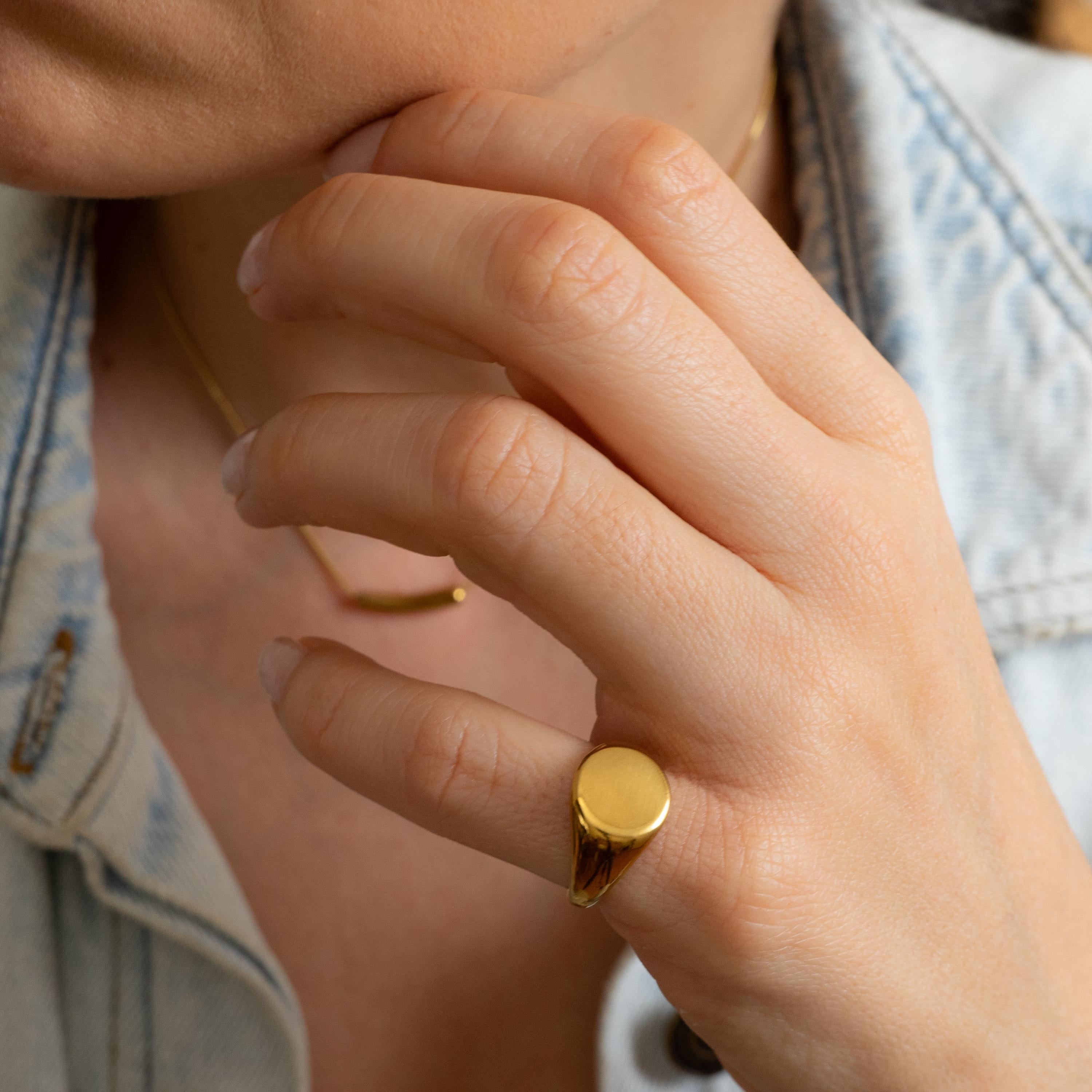 A modern take on the classic signet ring, reimagined in polished gold stainless steel. Clean, minimal, and perfectly balanced, this piece is designed to be worn every day — alone for a subtle statement or stacked for a bolder look.