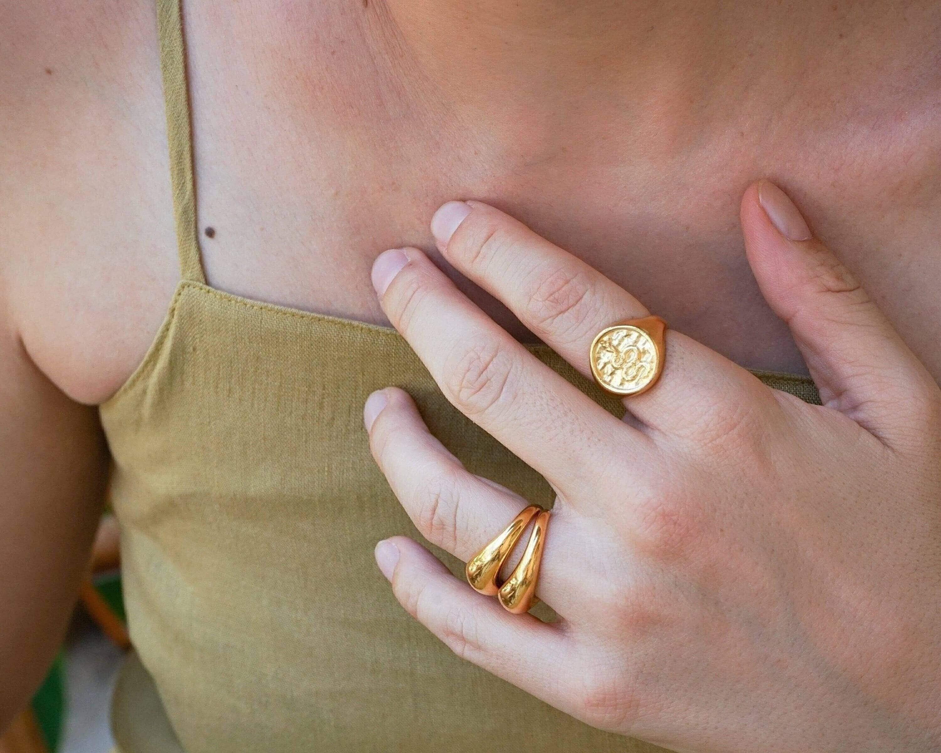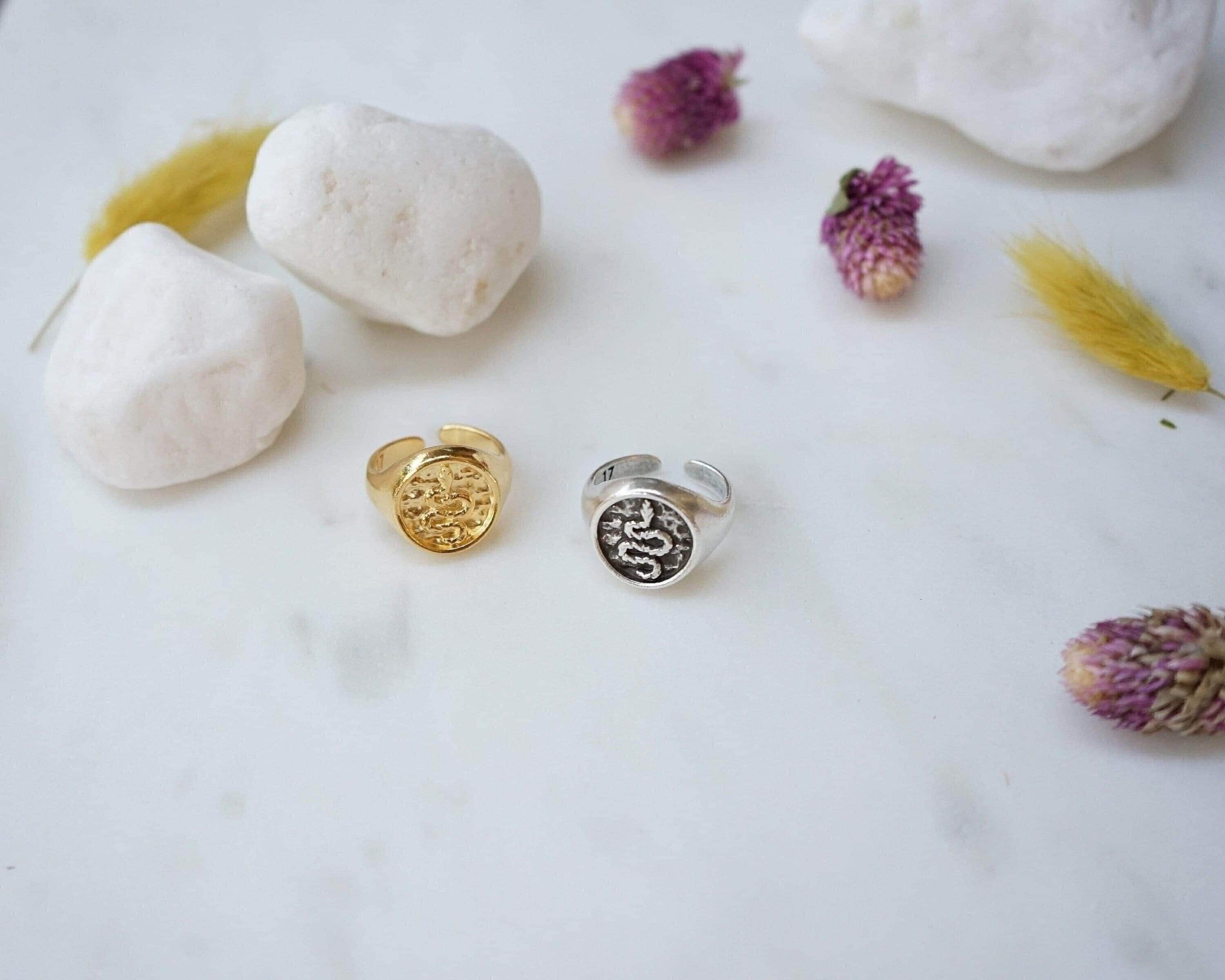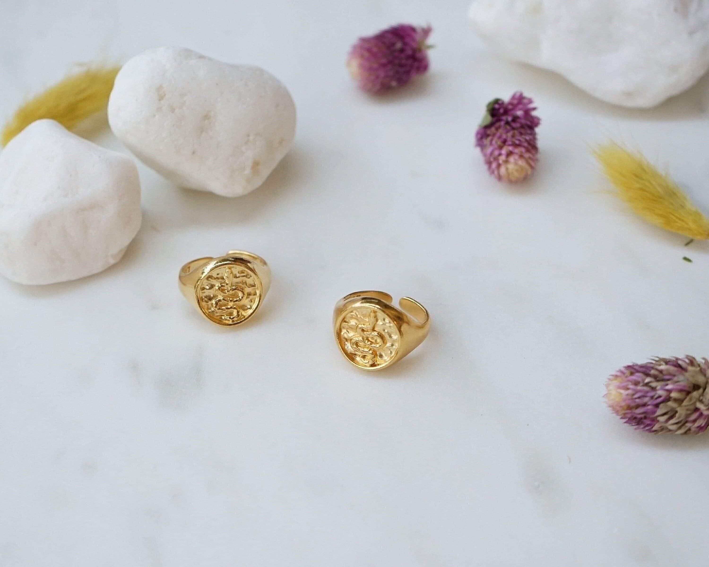Made from 24K gold plated zamak, this SNAKE STAMP signet chevalier ring is the most powerful of a creative life force. Never mind their bad reputation. Snakes were actually symbols of rebirth, transformation, immortality and healing in Ancient Greece and Egypt. The Greek god Asclepius wielded a serpent-entwined rod. And they do make a kickass styling accessory!od luck, harmony, creativity, and bliss but also hard work and productivity. Most importantly, these magnificent creatures symbolize community, brightness and personal power.