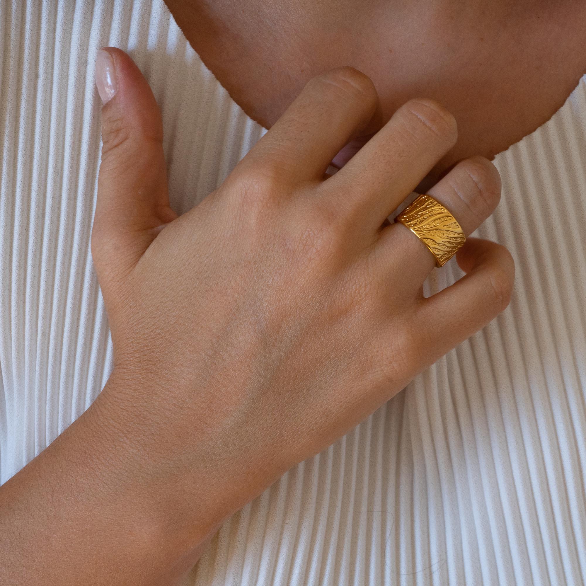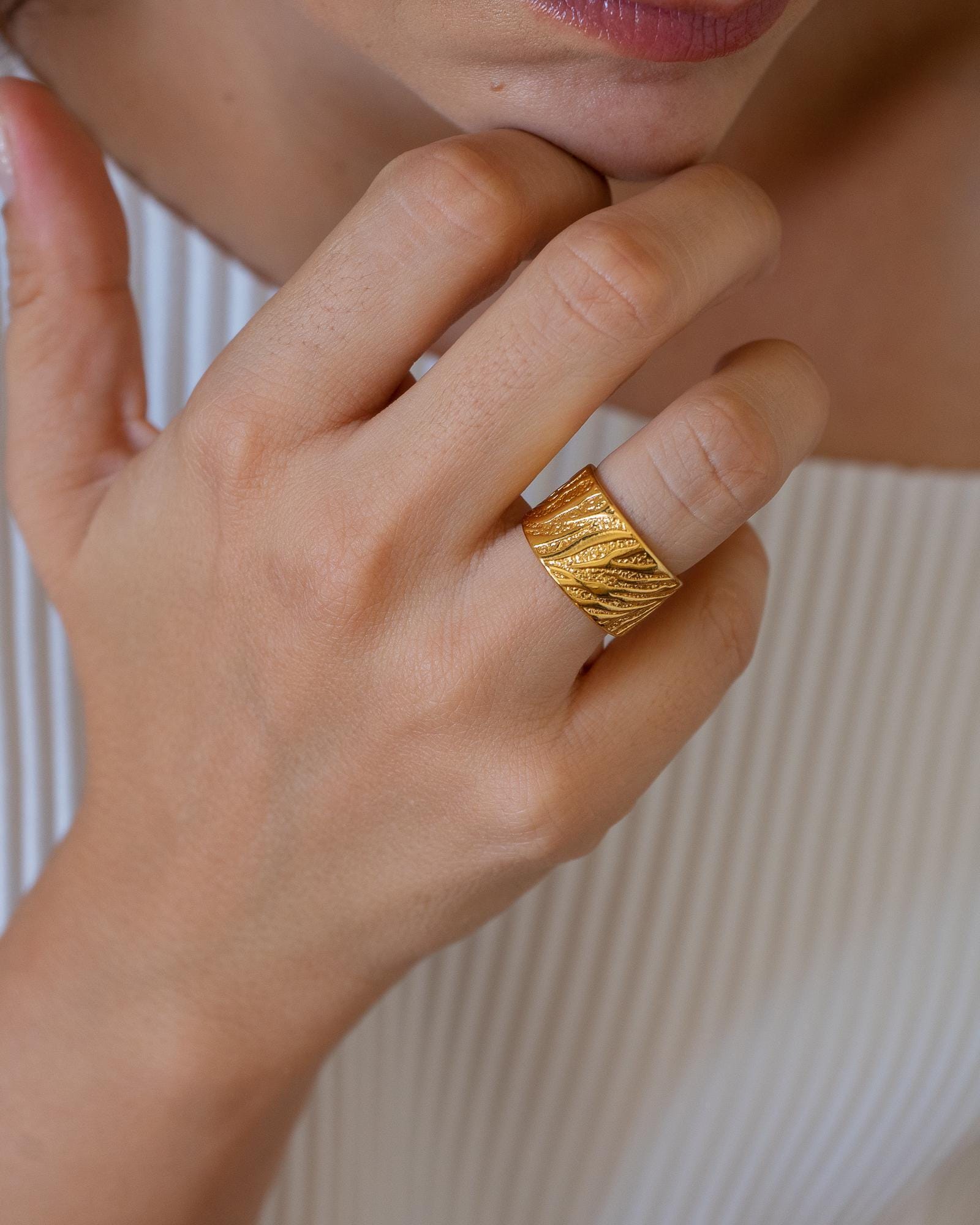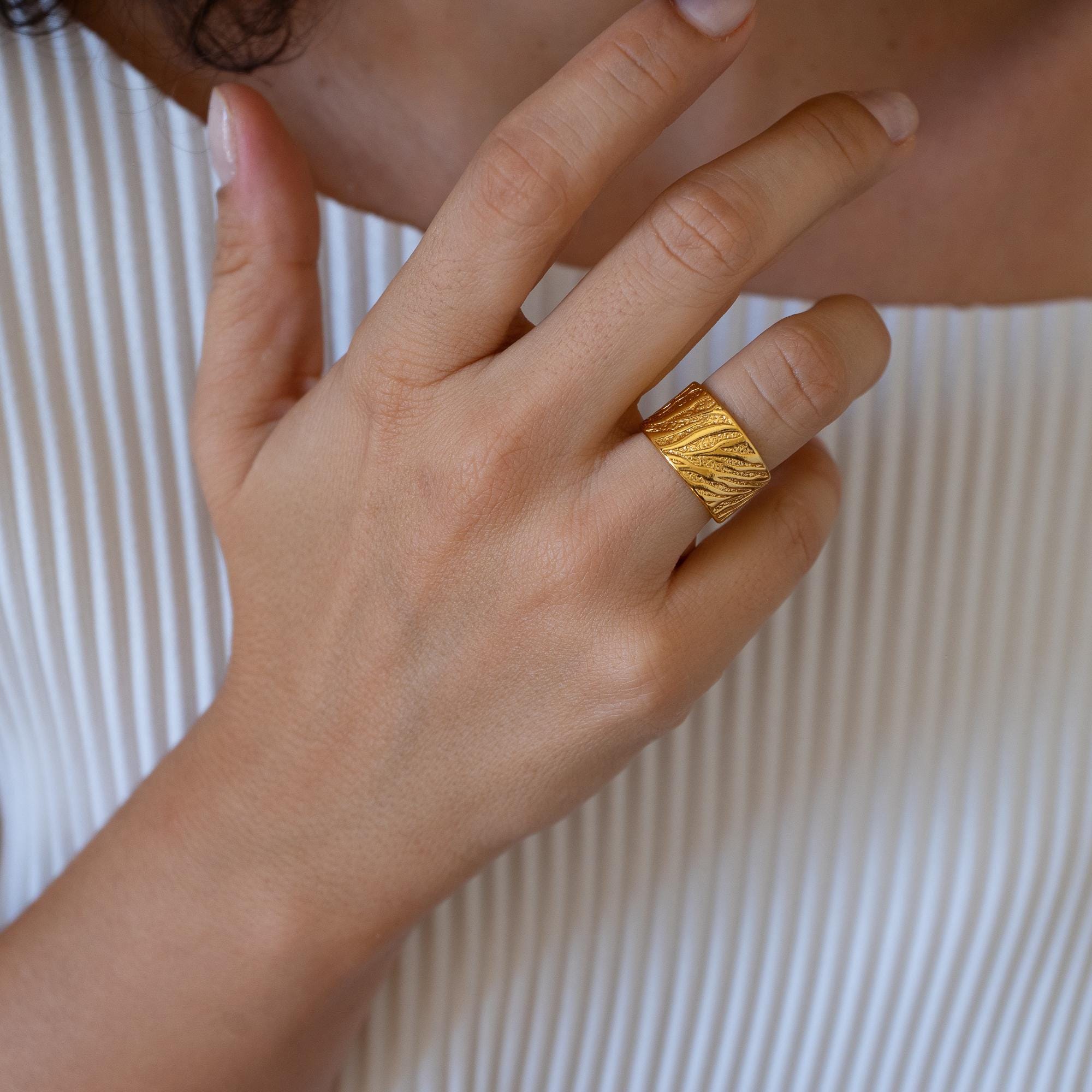 Crafted from high-quality 24k gold plating, this statement band ring features a striking zebra animal print pattern that adds a touch of wild elegance to your jewelry collection. Its unique, irregular shape makes it an eye-catching piece that can be worn confidently for years to come. Suitable for wear on the index, middle, or ring finger, this versatile ring can be styled on its own or layered with other rings for a more personalized look.