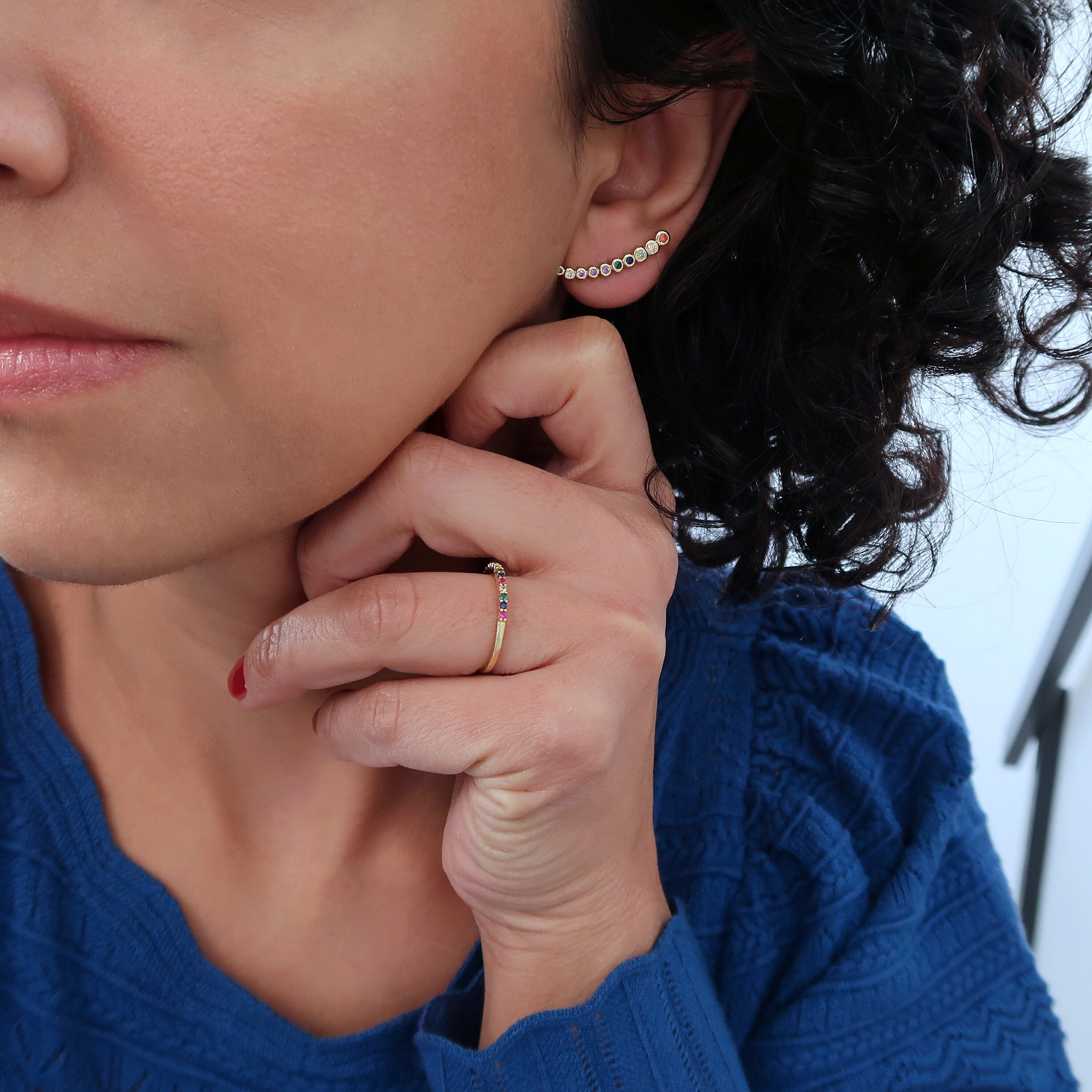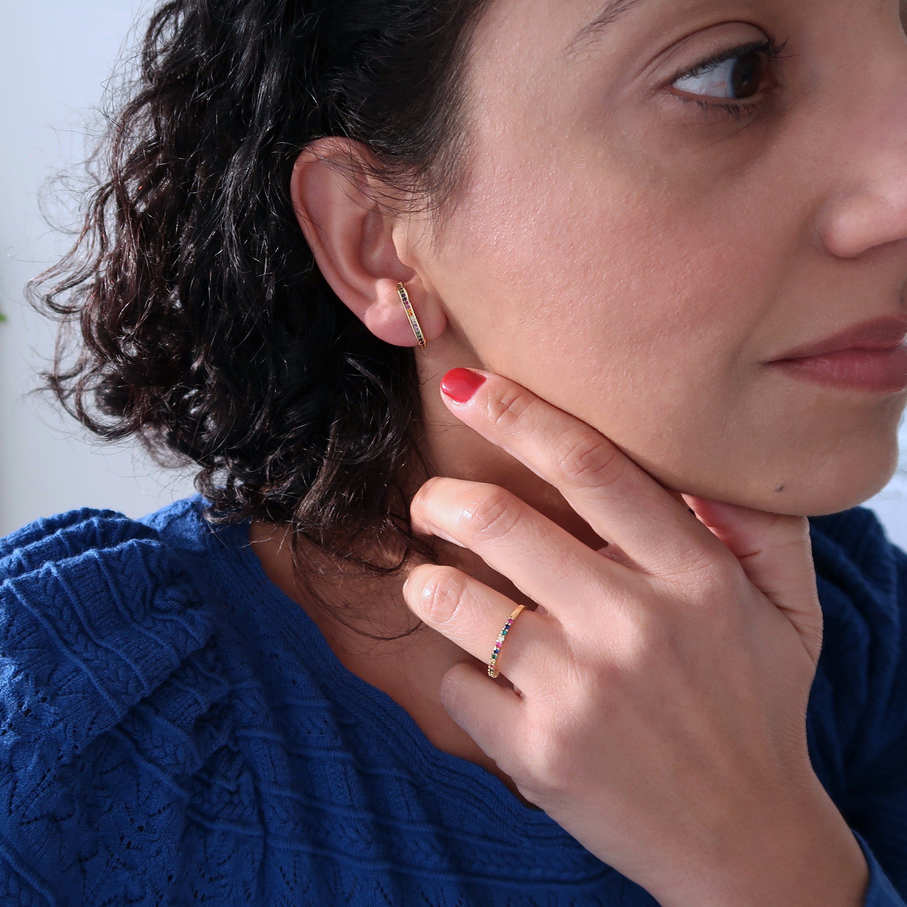 Elevate your accessory game with the vibrant rainbow zircon band ring. This stylish piece is designed to capture the essence of a colorful rainbow, bringing a playful yet sophisticated touch to any outfit. The ring can be worn on your index, middle, or ring finger, allowing for versatile styling options. Whether you choose to wear it solo for a minimalist look or stack it with other rings to create a unique combination, this piece is sure to enhance your personal style.