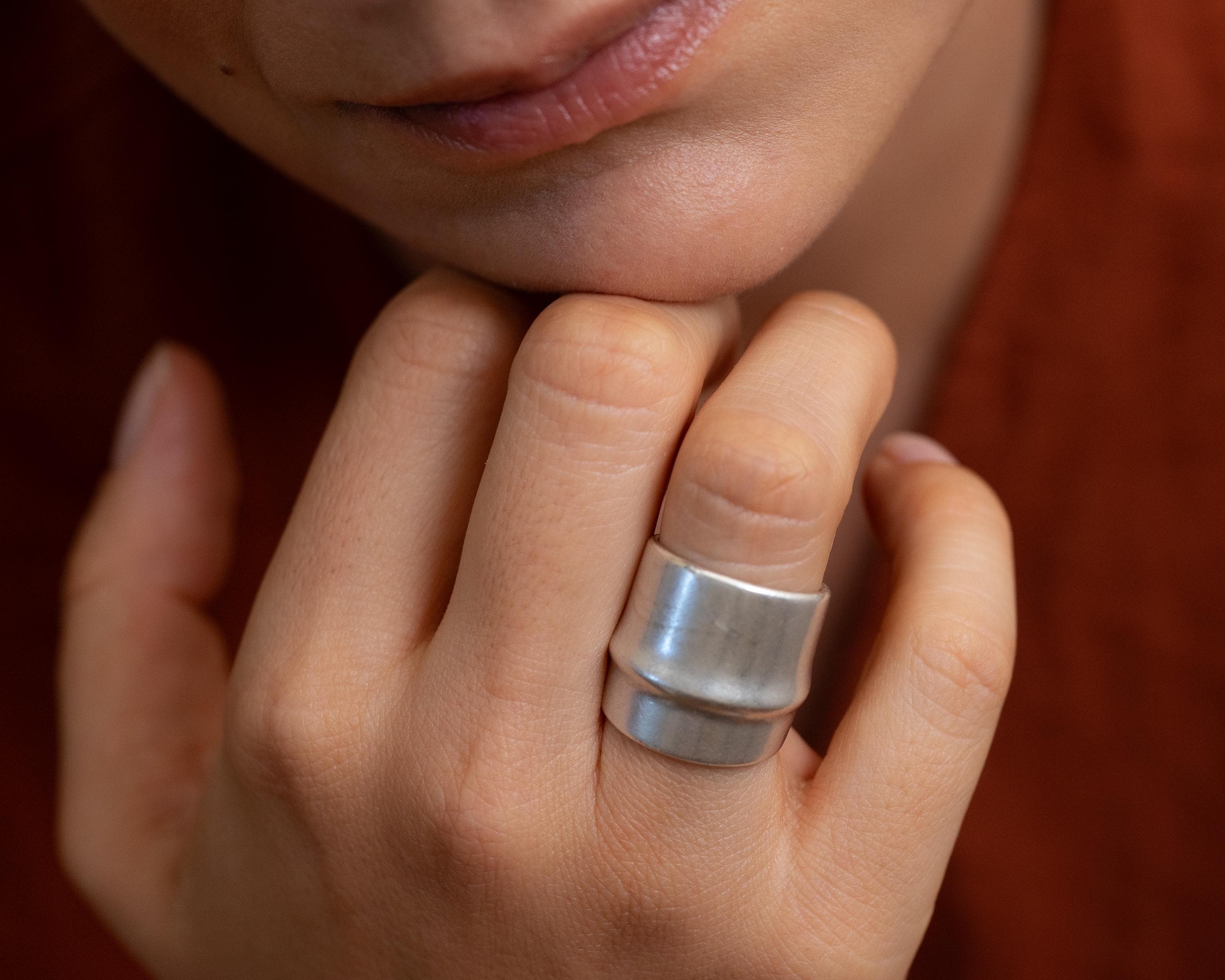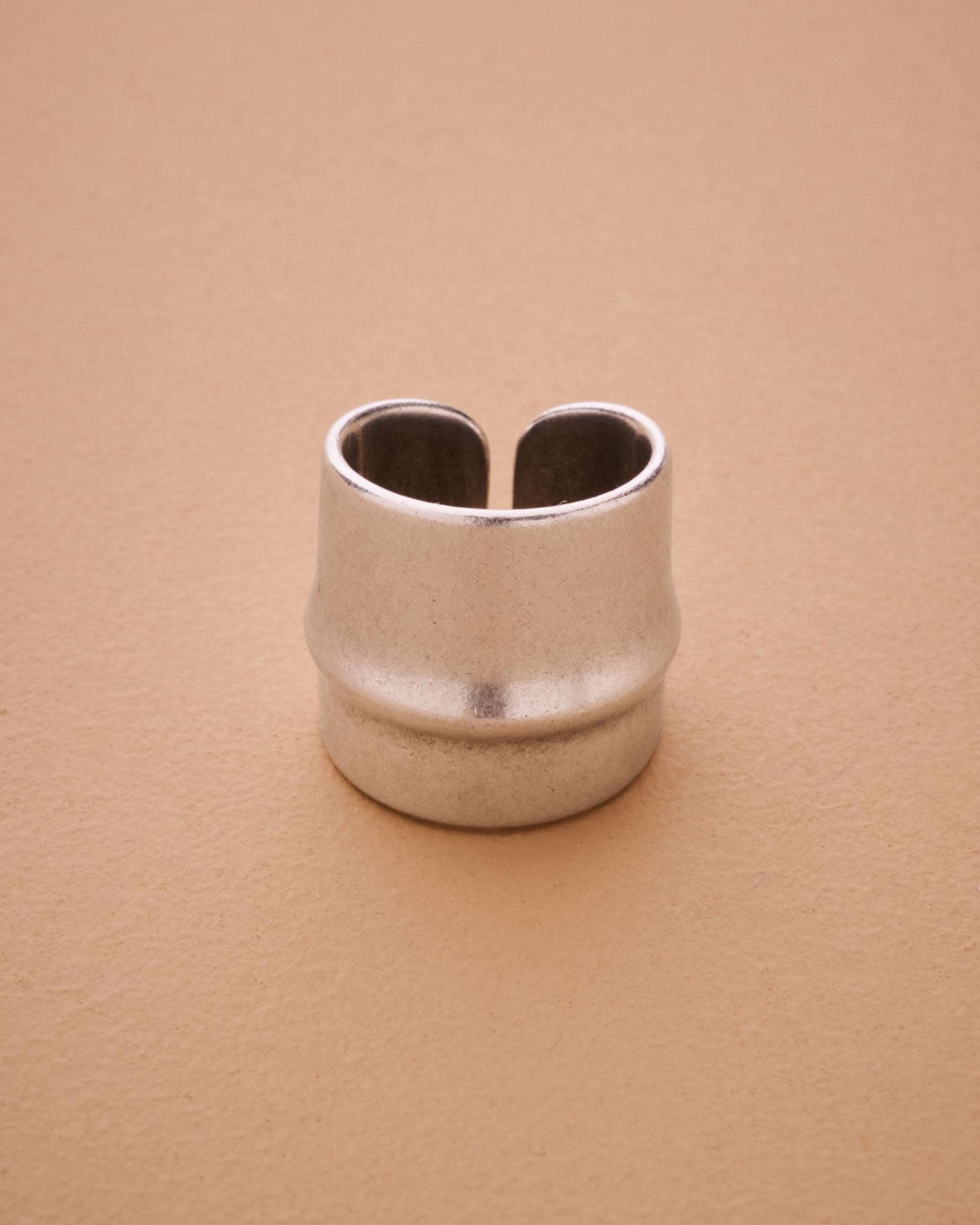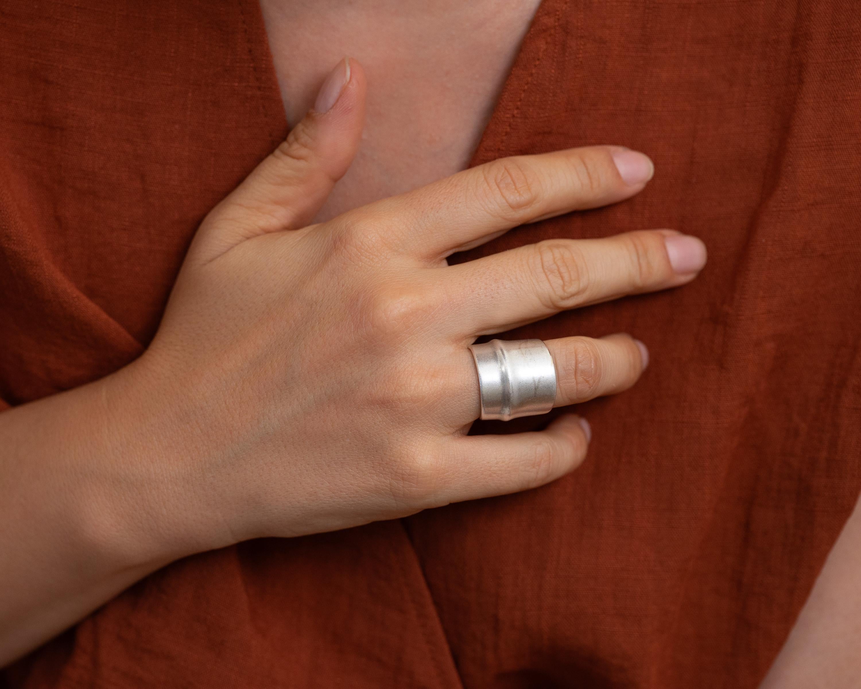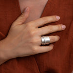 Sleek, bold, and architectural—this wide silver ring brings modern structure to your everyday jewelry. Its matte silver-plated finish and center line groove make it quietly impactful. Designed with an open back, it fits most sizes comfortably, though due to its thick, rigid form, we recommend letting us pre-adjust it for the perfect fit.