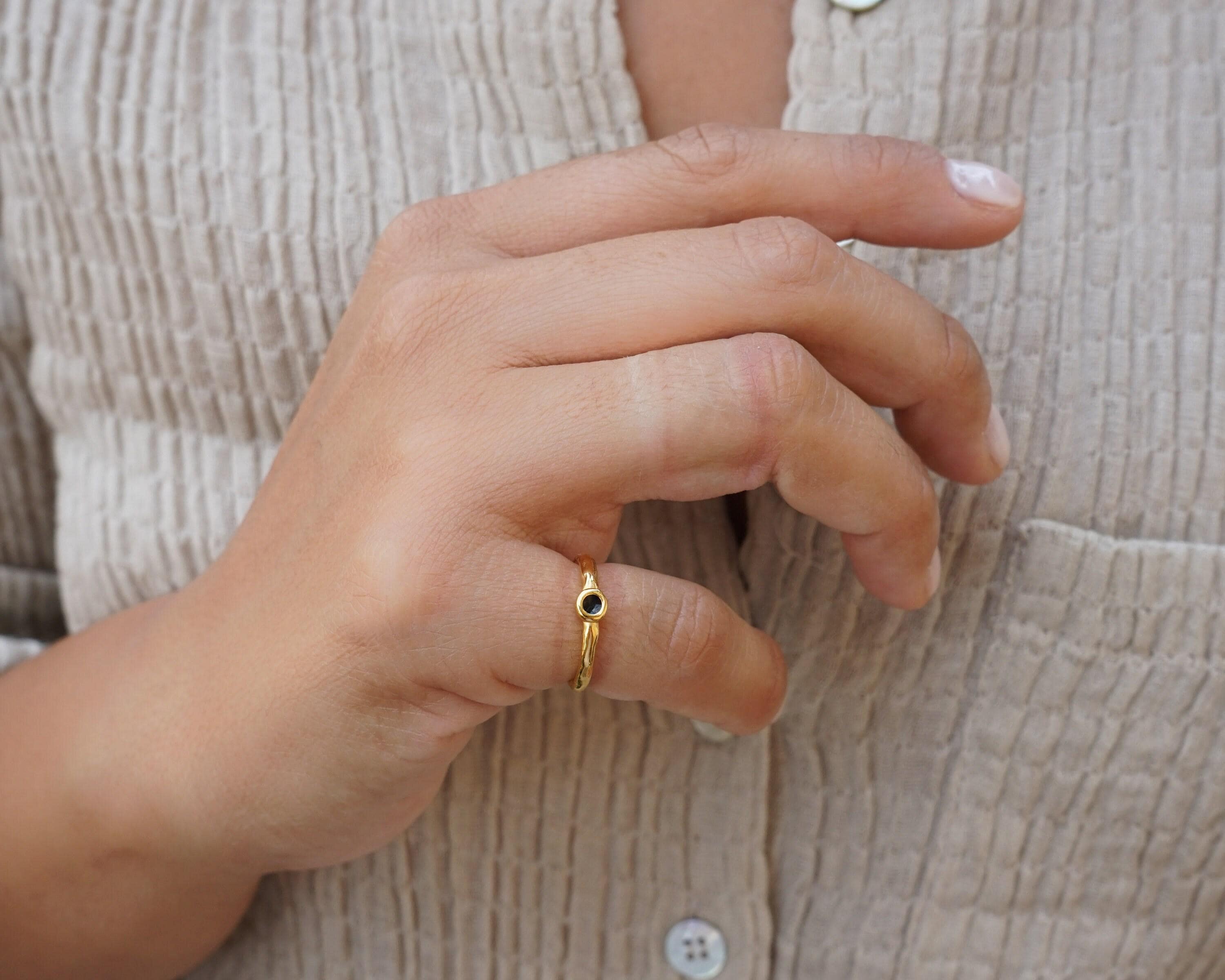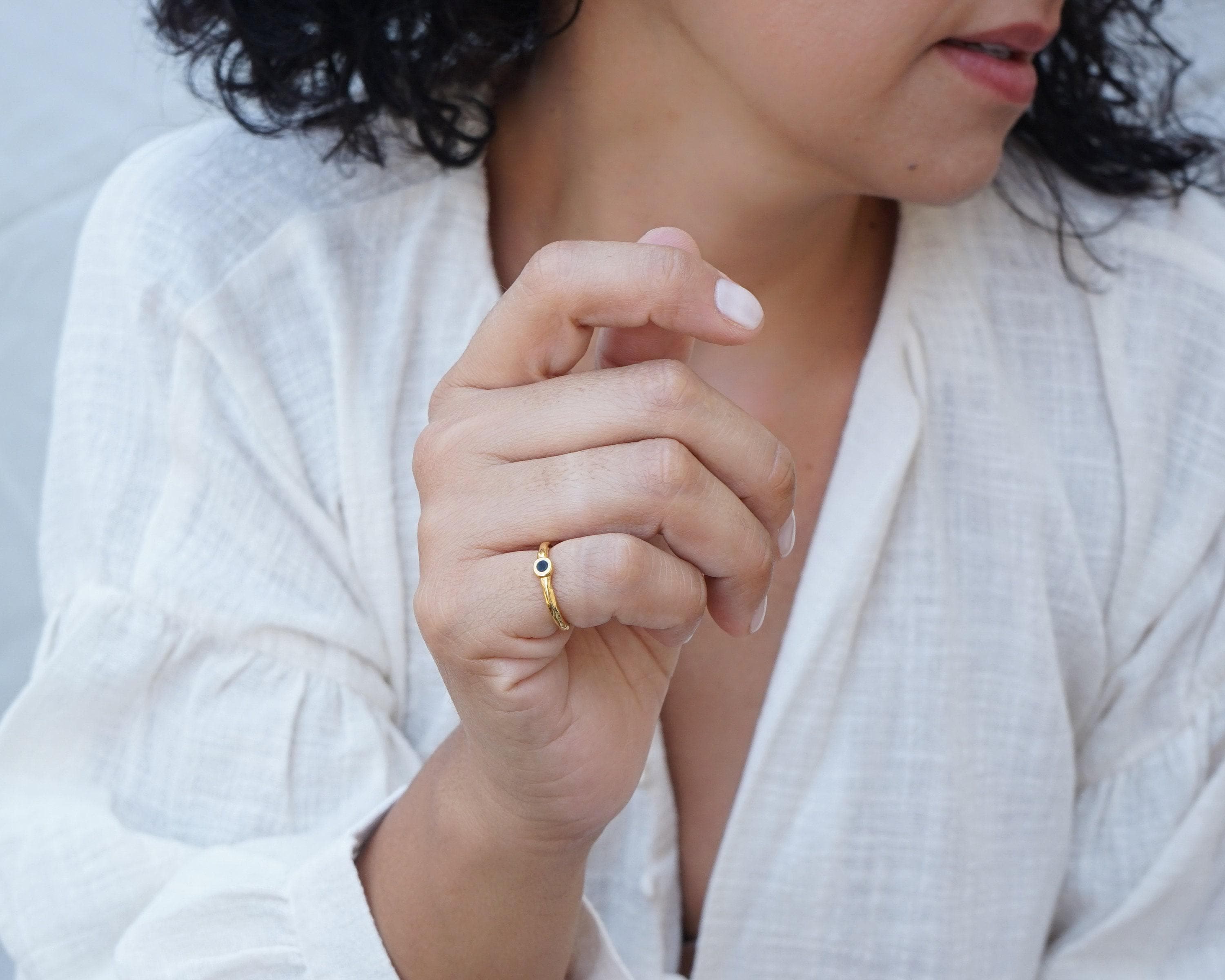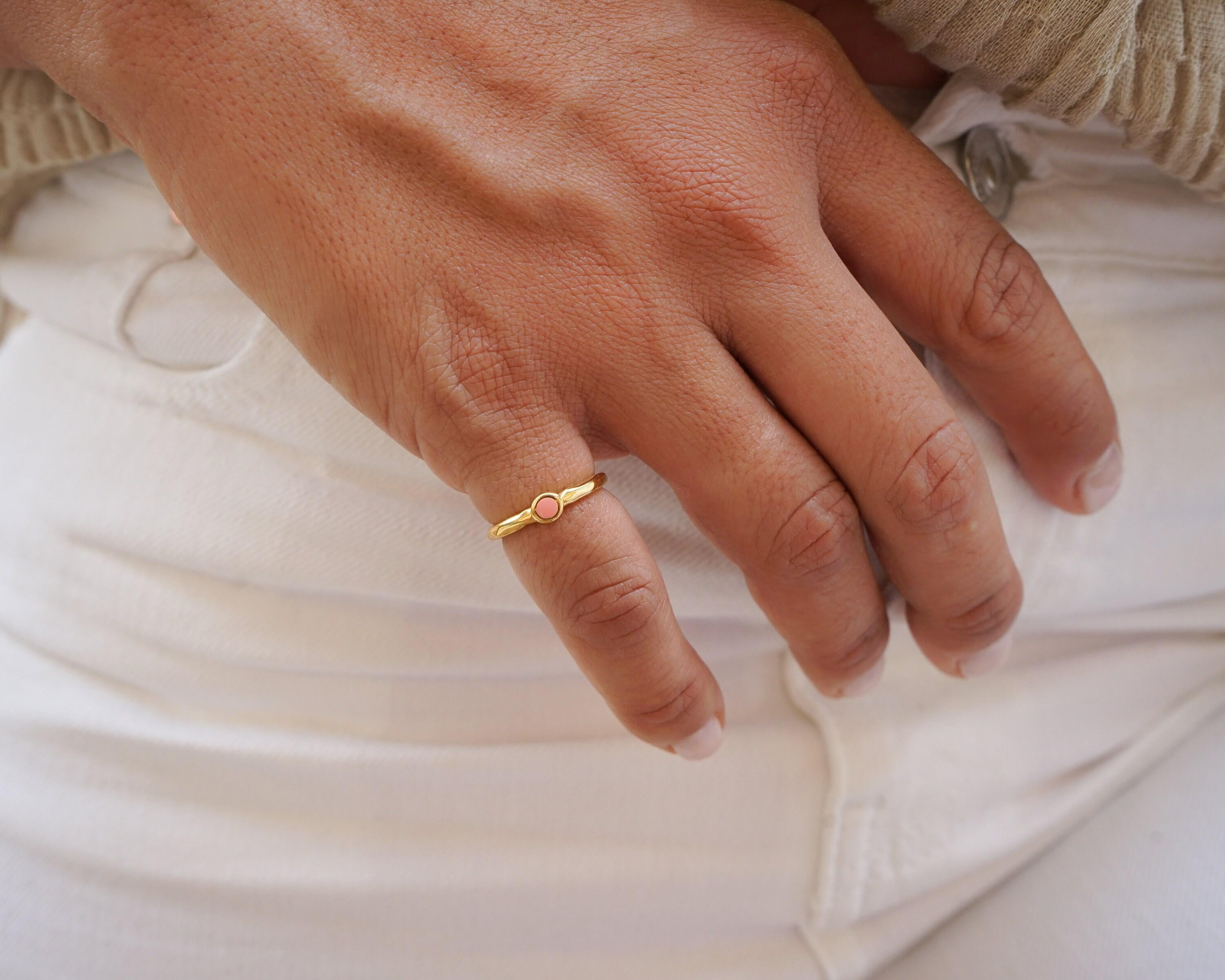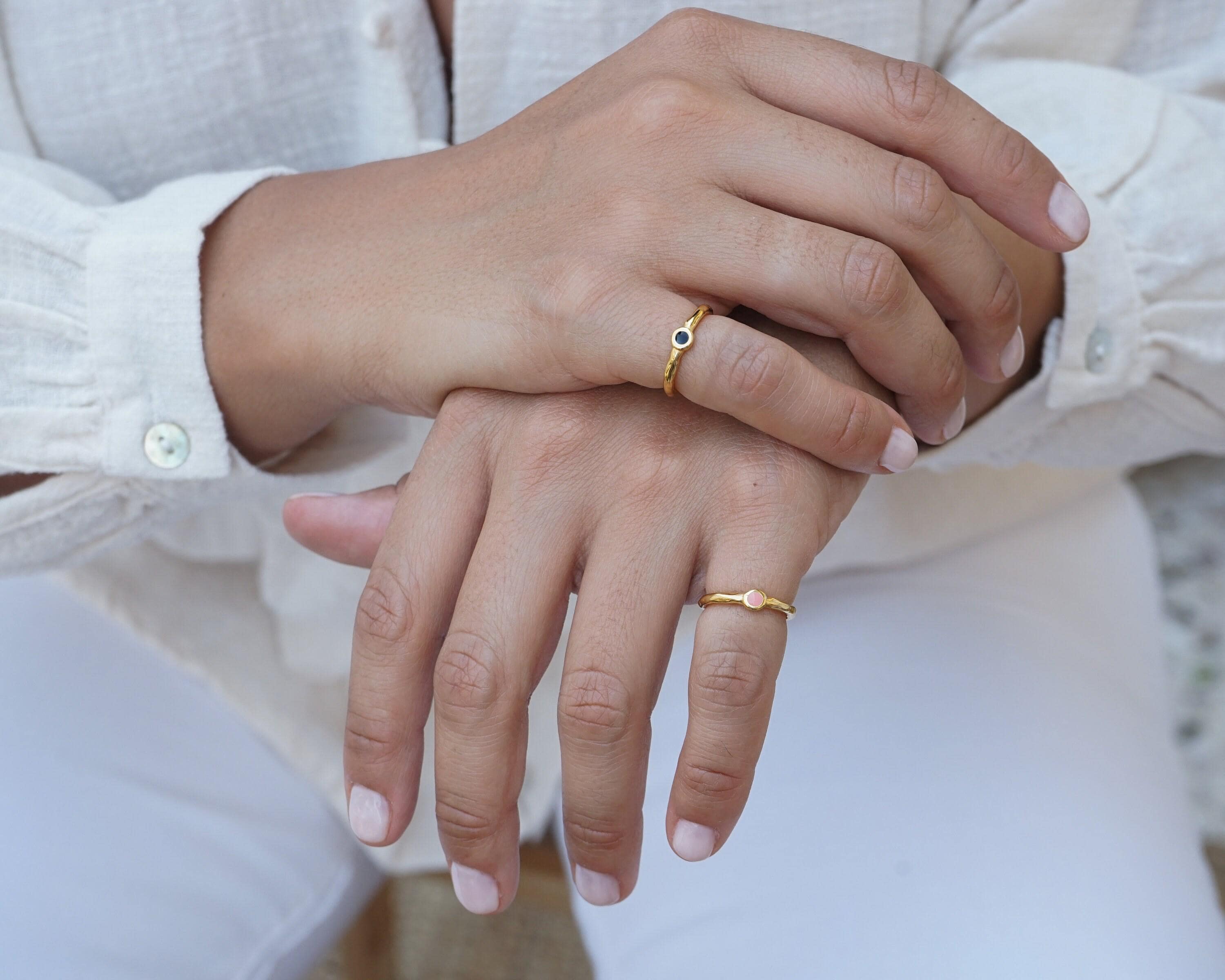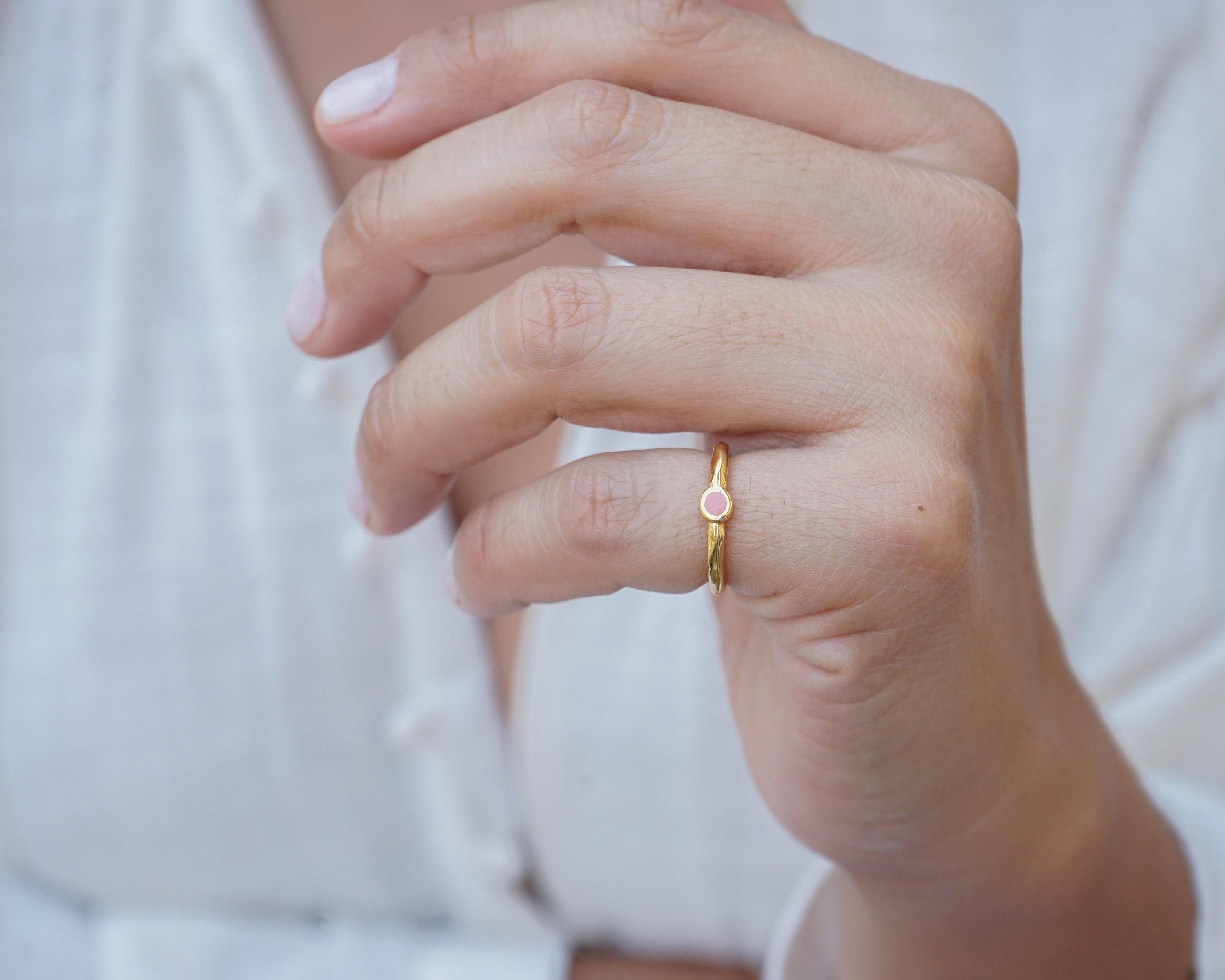 Discover the charm of our minimalist gold circle band pinky ring, featuring a stunning enamel setting available in either black or coral. This elegant yet understated piece showcases a unique hammered band that adds texture and depth, making it a versatile addition to your jewelry collection. Perfectly designed to be worn as a pinky ring or as a midi ring, this piece effortlessly enhances any outfit.